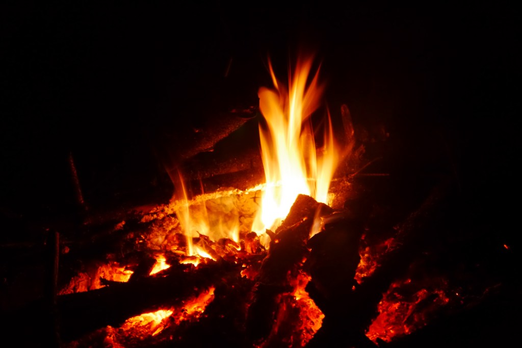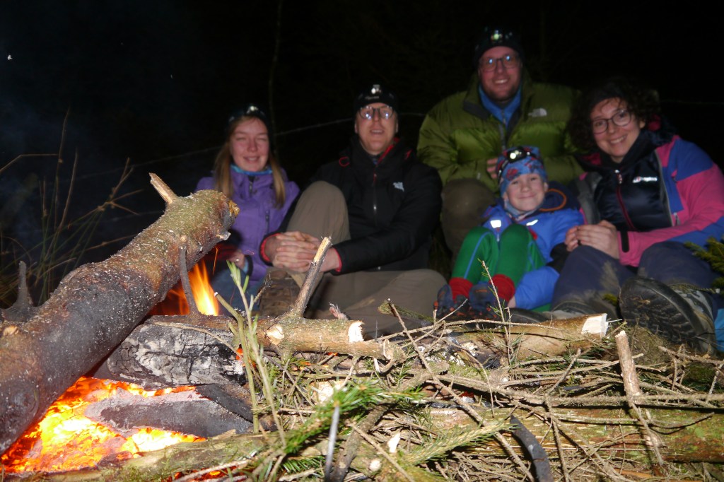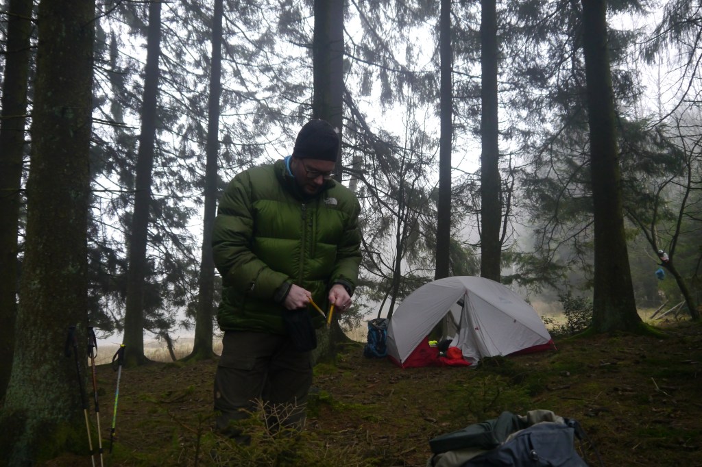 Het begint te schemeren. Eens we een grasveld passeren beginnen we op zoek te gaan naar een bivakplek. We moeten helemaal naar de bovenzijde van de heuvel om dat uiteindelijk na wat afwegingen over een hobbelige ondergrond en de hellingsgraad onze tent in een naaldbos te zetten. Benji heeft een goede plek gespot en het blijkt een goede zet. Louis is blij want het is genoeg geweest voor vandaag. 11km stappen op toch wel een stevig tempo… doe het maar eens als 6-jarige. Gelukkig is hij al wat gewoon en doen we regelmatig langere wandelingen op zijn tempo. Eens de tentjes opstaan begin ik hout te sprokkelen en maakt Benji het kampvuur aan in het weiland. Het is drassige ondergrond dus echt veel gevaar betekent het niet. We kunnen met een aangename warmte eten. Louis wil bij zijn held van de dag Benji zitten. Plots voelt Benji zich niet goed en laat de Real Turmat een tweede keer passeren. Hij blijft opgewekt en we zitten nog een hele tijd aan het vuur. We kruipen rond 21u30 de tent in. Ik val niet veel later in slaap en ook Louis is snel naar dromenland. Cynthia glijdt een beetje naar beneden maar al bij al ligt ze goed en knus tegen Louis aan. En Louis ligt tegen mij… Ik heb dus geen kou gehad :).