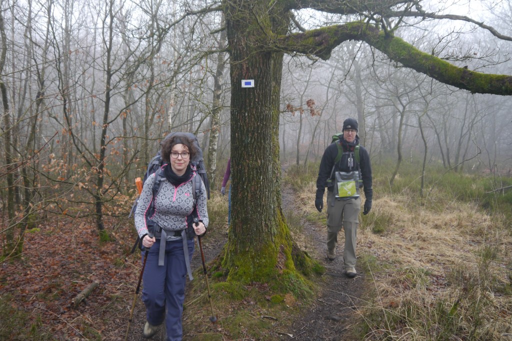 We wandelen eerst over een half verhard karrenspoor maar geleidelijk aan gaat het over in een drassig pad met diarreekleur zo blijkt als Marjolein haar schoenen toont… Wat een zicht. Louis probeert me te overhalen om ook eens in zo’n plas modder te gaan staan maar ik pas toch maar even. We verlaten nu de GR 5 en pikken Promenade du Pouhon de Ruy op.