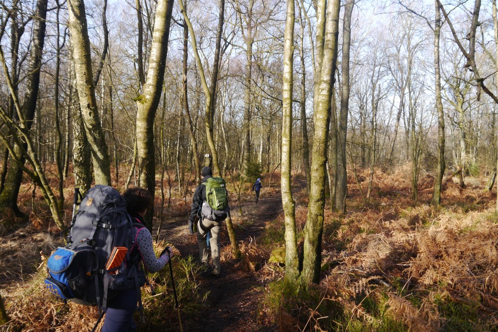 We komen nu langs het Fagne Colas om dan even langs de weg naar Spa te lopen. We pikken het pad la Vecquée op om zo door een mooi bos te slingeren. Great minds think alike zou je kunnen zeggen. Niemand is voorzien op een lunch maar gaat er vanuit dat we op de middag gaan eten in Spa dus zo gezegd zo gedaan. We houden er een goed tempo in en stappen vlijtig door bossen, brandlanen, over beekjes, door modderpoelen en over vlonderpaadjes.