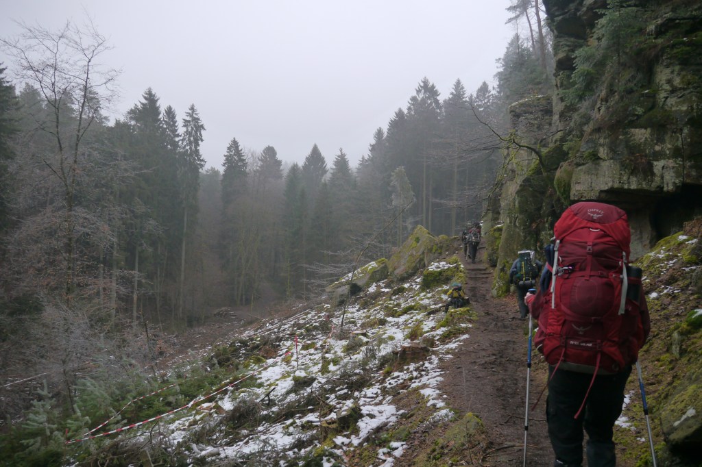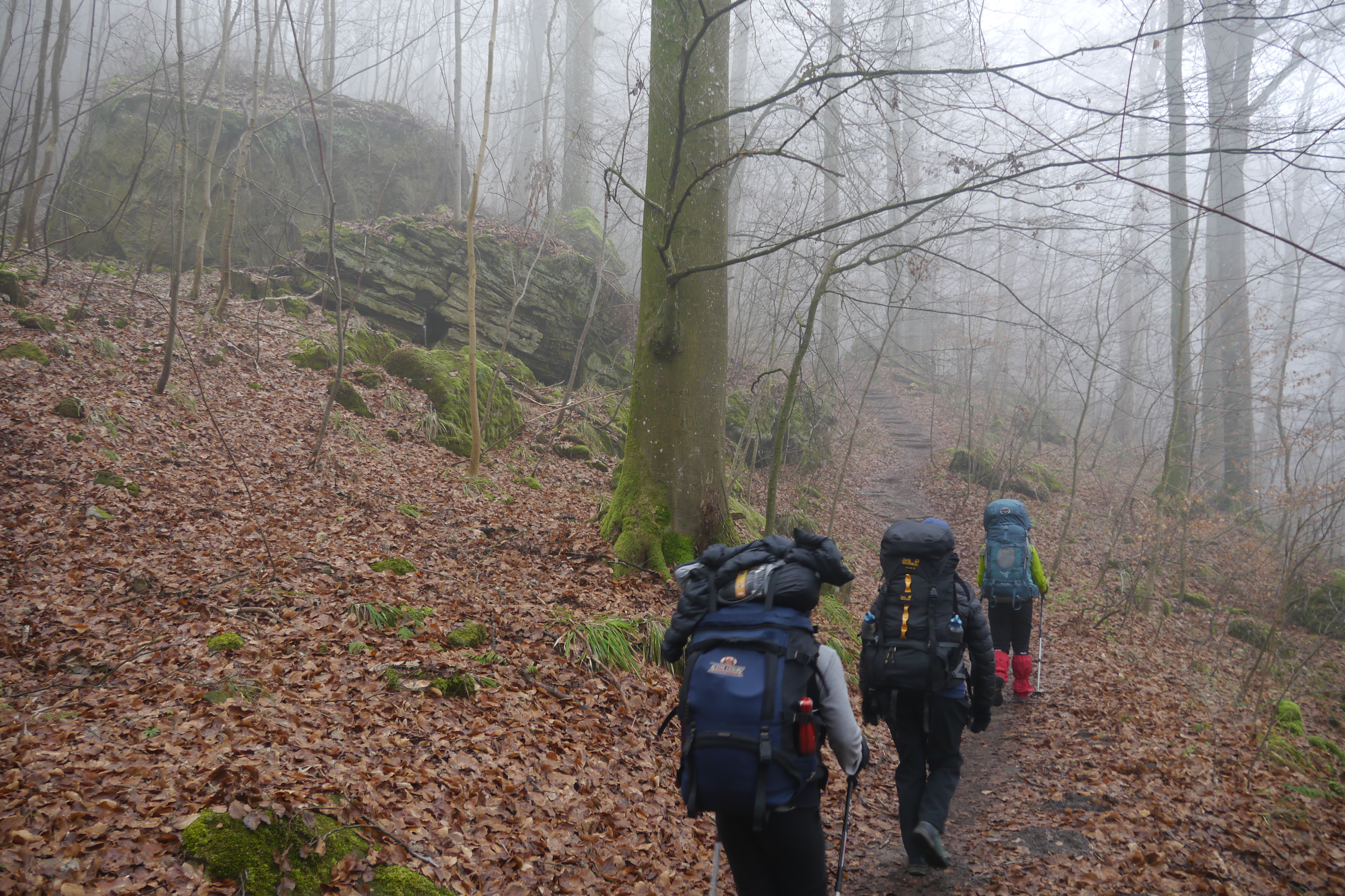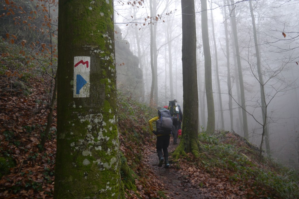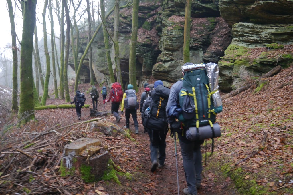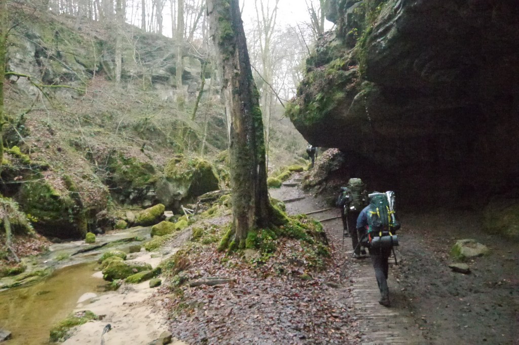 Het is een koude maar droge zaterdagochtend als we uit de wagen stappen. We zijn 5 dames en 4 heren die een nieuw Hiking Advisor avontuur tegemoet gaan. Na een korte briefing en het herstellen van een rugzakgesp gaan we op pad. We duiken meteen het bos in op de flanken van de Aesbech (riviertje). We gaan door de mist door een woonwijk om zo via enkele velden af te dalen tot de echte Mullerthaltrail. We pikken deze op ter hoogte van de Laaschbaach (riviertje). We zien de eerste mooie rotspartijen. Net voor we het dorpje Mullerthal naderen draait onze route weg van de officiële trail en volgen we een pad richting Consdorf. We eten onze lunch op een mooie plek langs de klaterende Dosbaach. Boterhammen met kaas, wraps met spek, soep, een warme vriesdroogmaaltijd… het passeert allemaal de revue.
