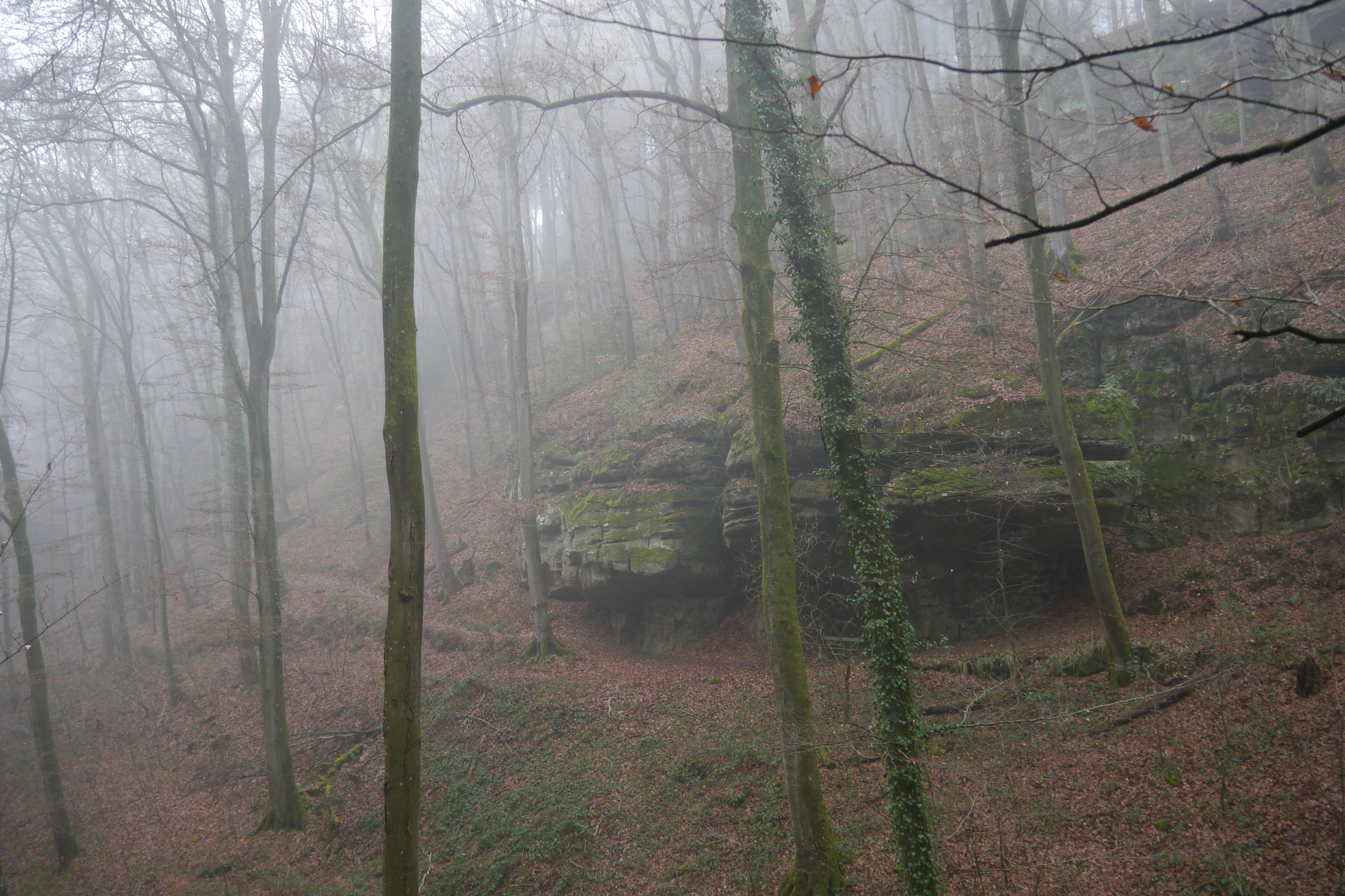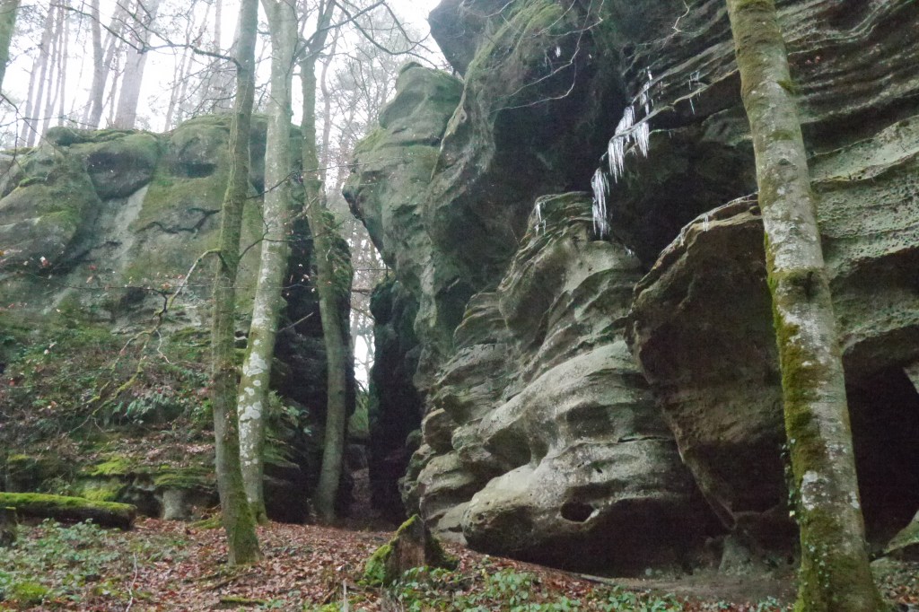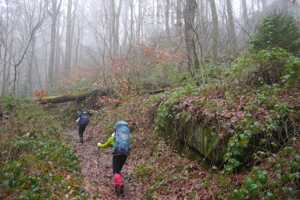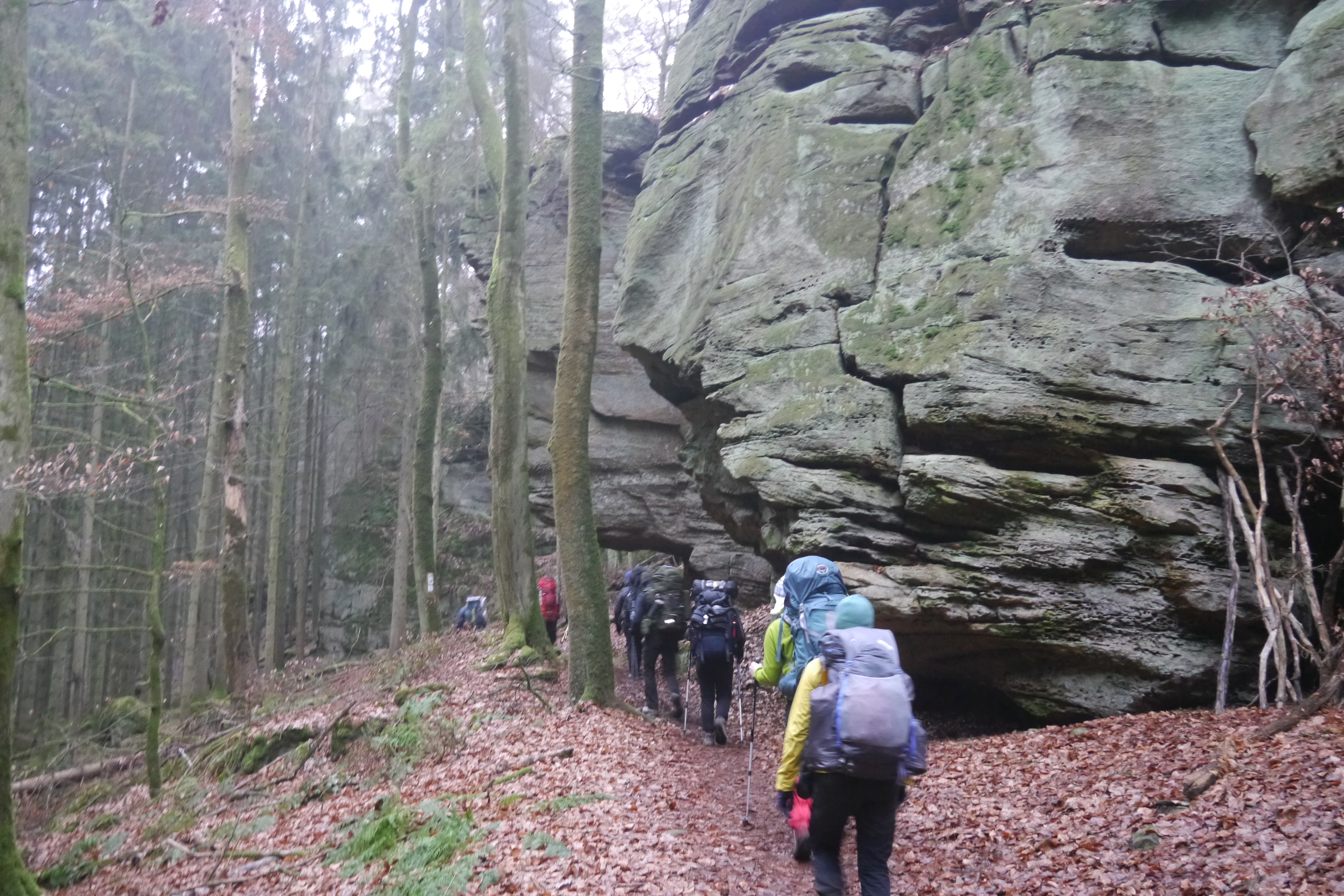 Het is een koude maar droge zaterdagochtend als we uit de wagen stappen. We zijn 5 dames en 4 heren die een nieuw Hiking Advisor avontuur tegemoet gaan. Na een korte briefing en het herstellen van een rugzakgesp gaan we op pad. We duiken meteen het bos in op de flanken van de Aesbech (riviertje). We gaan door de mist door een woonwijk om zo via enkele velden af te dalen tot de echte Mullerthaltrail. We pikken deze op ter hoogte van de Laaschbaach (riviertje). We zien de eerste mooie rotspartijen. Net voor we het dorpje Mullerthal naderen draait onze route weg van de officiële trail en volgen we een pad richting Consdorf. We eten onze lunch op een mooie plek langs de klaterende Dosbaach. Boterhammen met kaas, wraps met spek, soep, een warme vriesdroogmaaltijd… het passeert allemaal de revue.