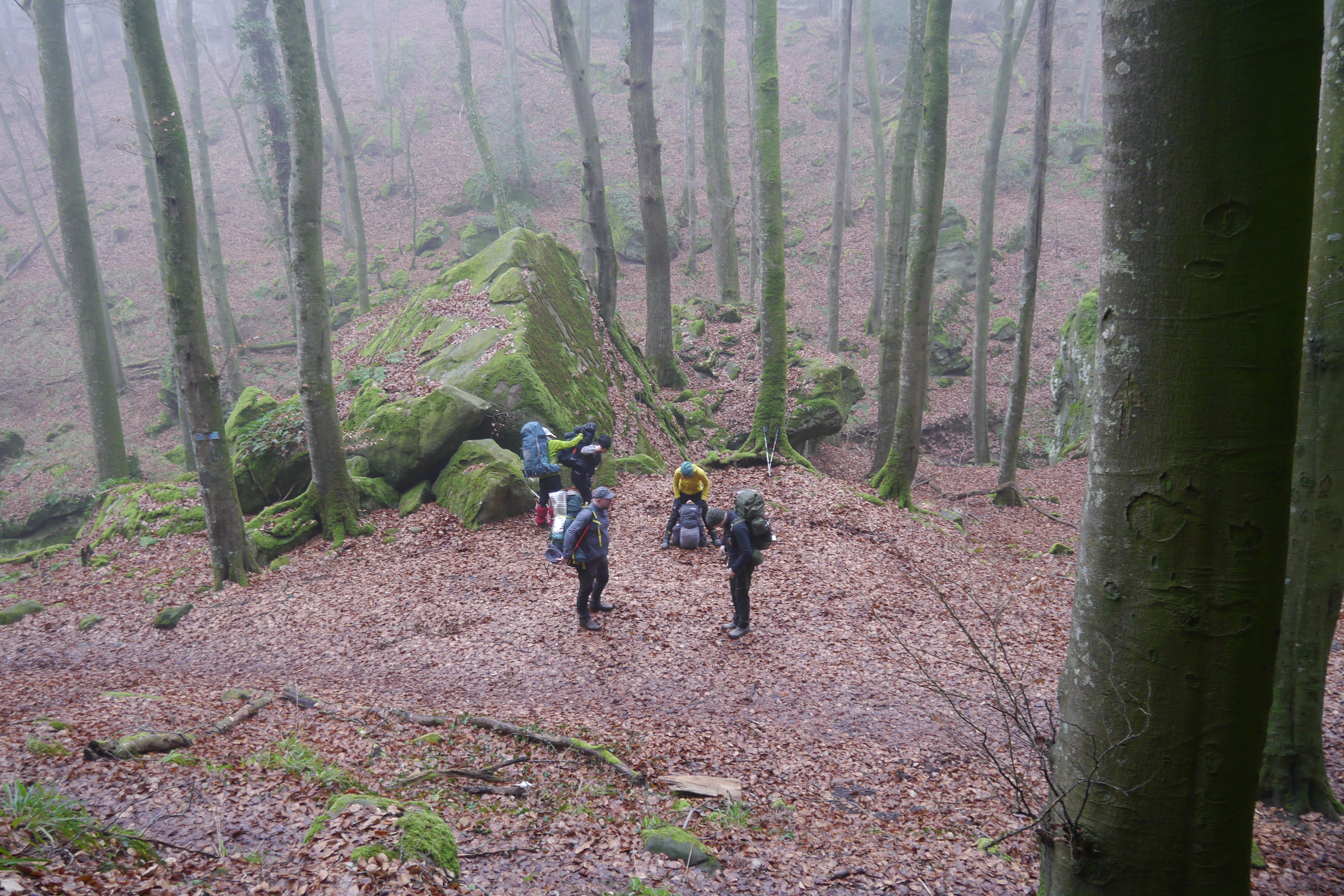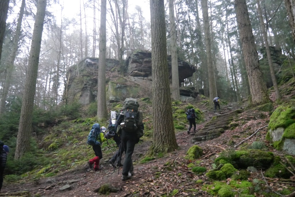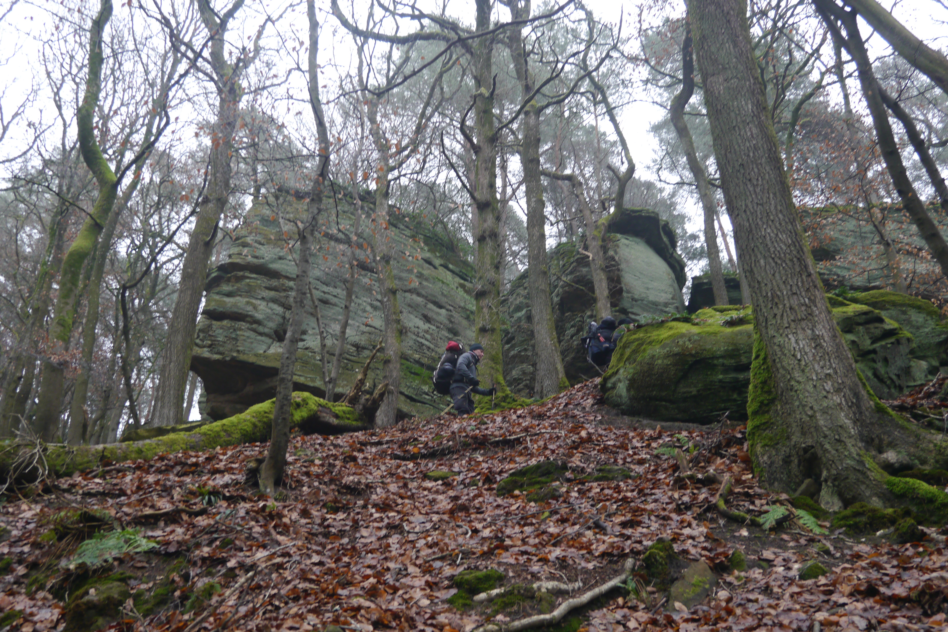 We volgen de Birkbaach en stijgen wat later tot aan Kimmerchen. Nu lopen we op de rand van het plateau, boven de rotsen. Het pad duikt plots naar Grundhof. Dirk en ik delen fijne verhalen over het liften naar Parijs of van Frankrijk naar huis. Om iedereen wakker te krijgen op deze opnieuw grijze dag stijgen we steil naar Kaasselt waar we, net onder de top, een pauze houden. We stappen flink verder en passeren de Rammelee om dan te lunchen onder een prachtig massief. Mijn gasflesje is bijna leeg dus het duurt even voor mijn water voor mijn maaltijd kookt. Net op tijd ben ik klaar om het richttijdstip van vertrek te halen. We gaan weer verder langs grote massieven, prachtig bemoste boulders en smalle paadjes. We stijgen naar de Geilerslee en buigen af in Westelijke richting. We stappen tot aan de Perekop waar we een laatste snackpauze houden.