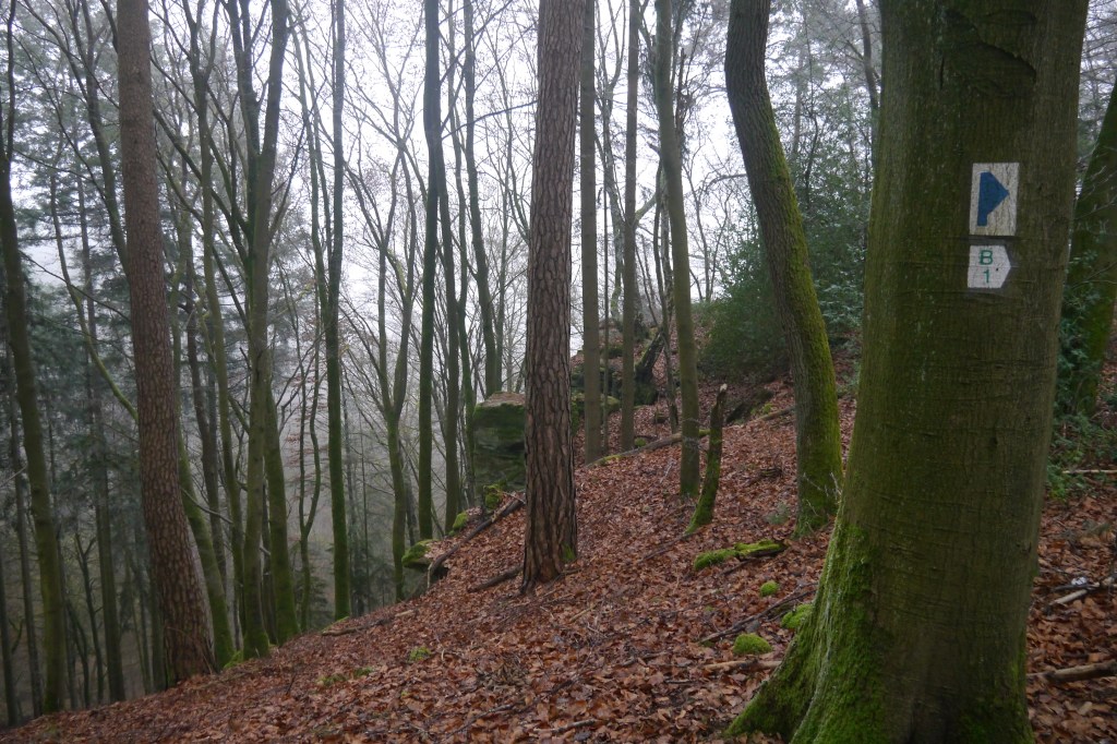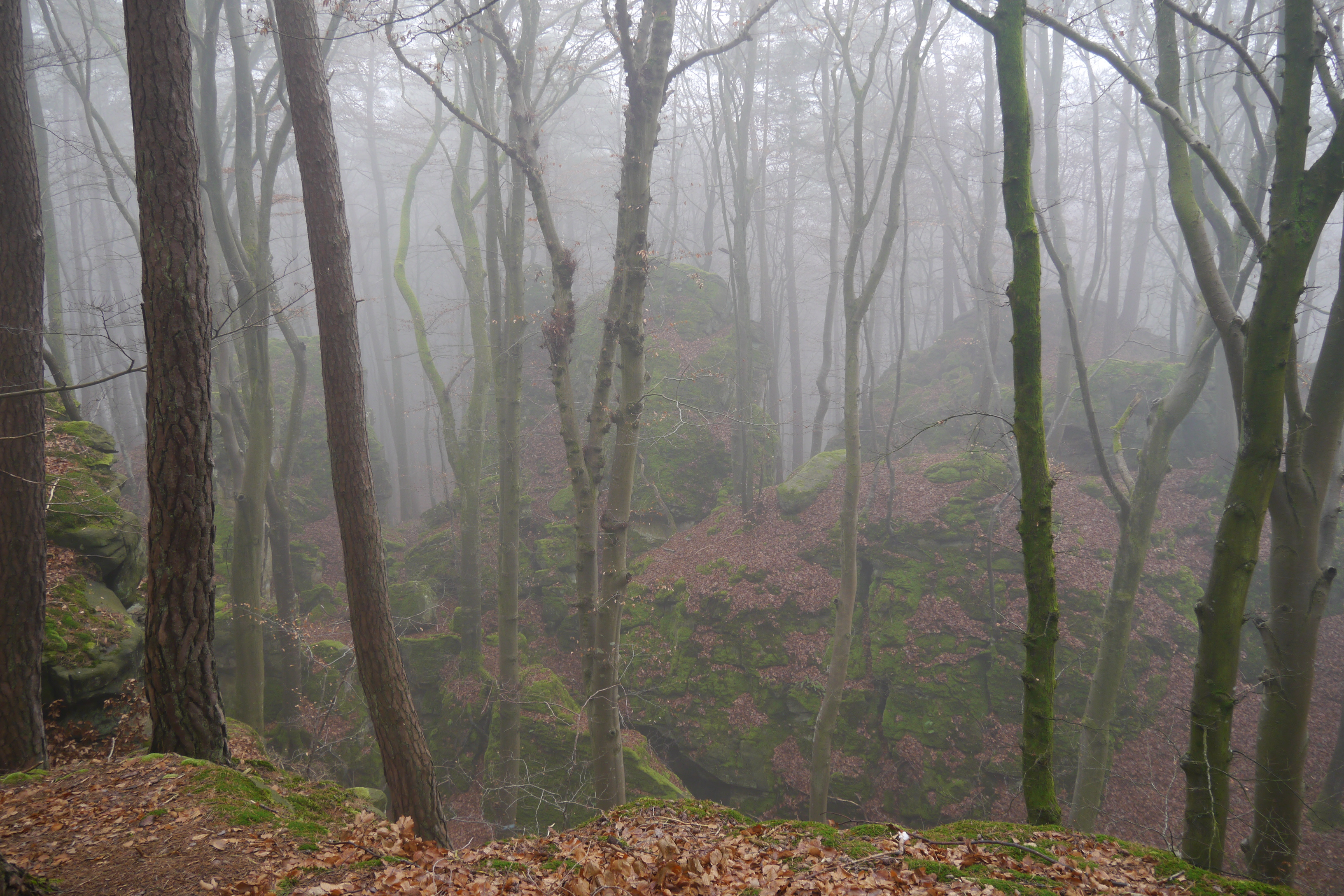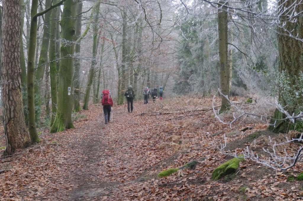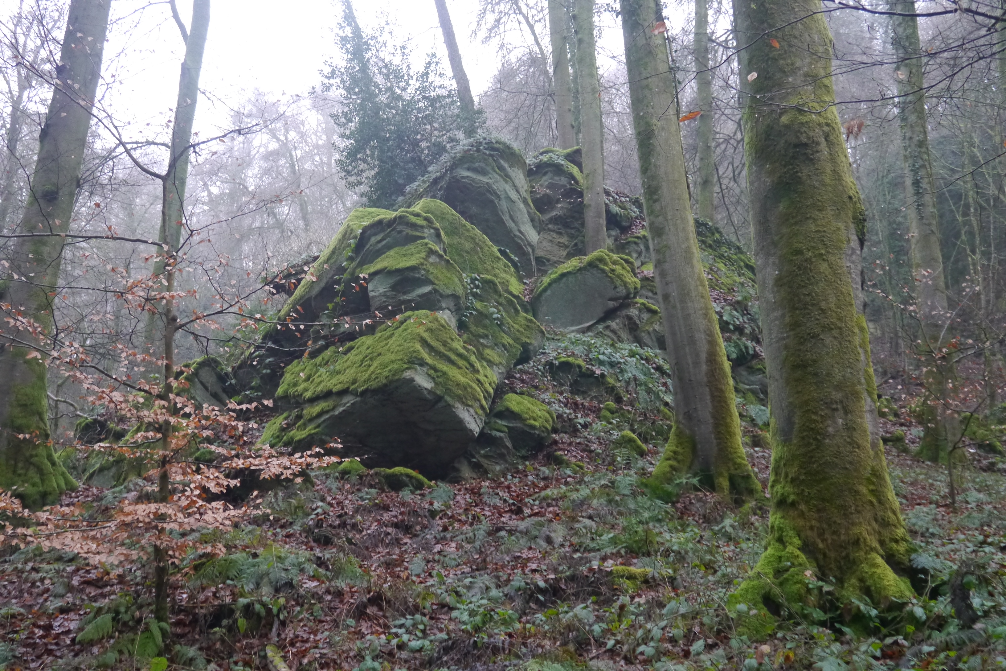 We volgen de Birkbaach en stijgen wat later tot aan Kimmerchen. Nu lopen we op de rand van het plateau, boven de rotsen. Het pad duikt plots naar Grundhof. Dirk en ik delen fijne verhalen over het liften naar Parijs of van Frankrijk naar huis. Om iedereen wakker te krijgen op deze opnieuw grijze dag stijgen we steil naar Kaasselt waar we, net onder de top, een pauze houden. We stappen flink verder en passeren de Rammelee om dan te lunchen onder een prachtig massief. Mijn gasflesje is bijna leeg dus het duurt even voor mijn water voor mijn maaltijd kookt. Net op tijd ben ik klaar om het richttijdstip van vertrek te halen. We gaan weer verder langs grote massieven, prachtig bemoste boulders en smalle paadjes. We stijgen naar de Geilerslee en buigen af in Westelijke richting. We stappen tot aan de Perekop waar we een laatste snackpauze houden.
