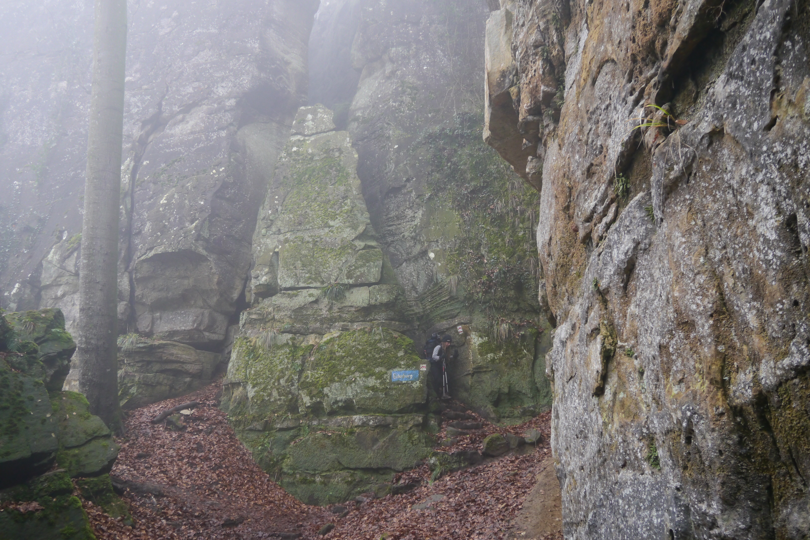 Na de verkwikkende pauze met wat thee gaan we verder op pad. Nu slingeren we regelmatig tussen de rotsen door en komen zo nabij de Constrëfermillen. Het pad slingert wat op hoogte en duikt dan naar een parking aan de rand van Consdorf. We stappen vlot verder onder leiding van Linda. Zij pikt de Mullerthaltrail op en leidt ons tot aan de Goldkaul. Katerina huppelt heen en weer om foto’s te nemen. Het lijkt een ware fotoshoot! We stappen verder tot de Eileburg waar we even een kijkje nemen op het uitkijkpunt. Het is nog steeds mistig dus veel valt er niet te zien, al zijn de kloven waartussen we ons bewegen wel heel mooi om zien. We dalen nu naar de bekendste waterval van Luxemburg. De obligatoire foto’s worden genomen en we gaan op hoge tred verder. We stijgen tot aan de kiosk die uitzicht geeft op het dorpje Mullerthal. We pauzeren voor een snackje.