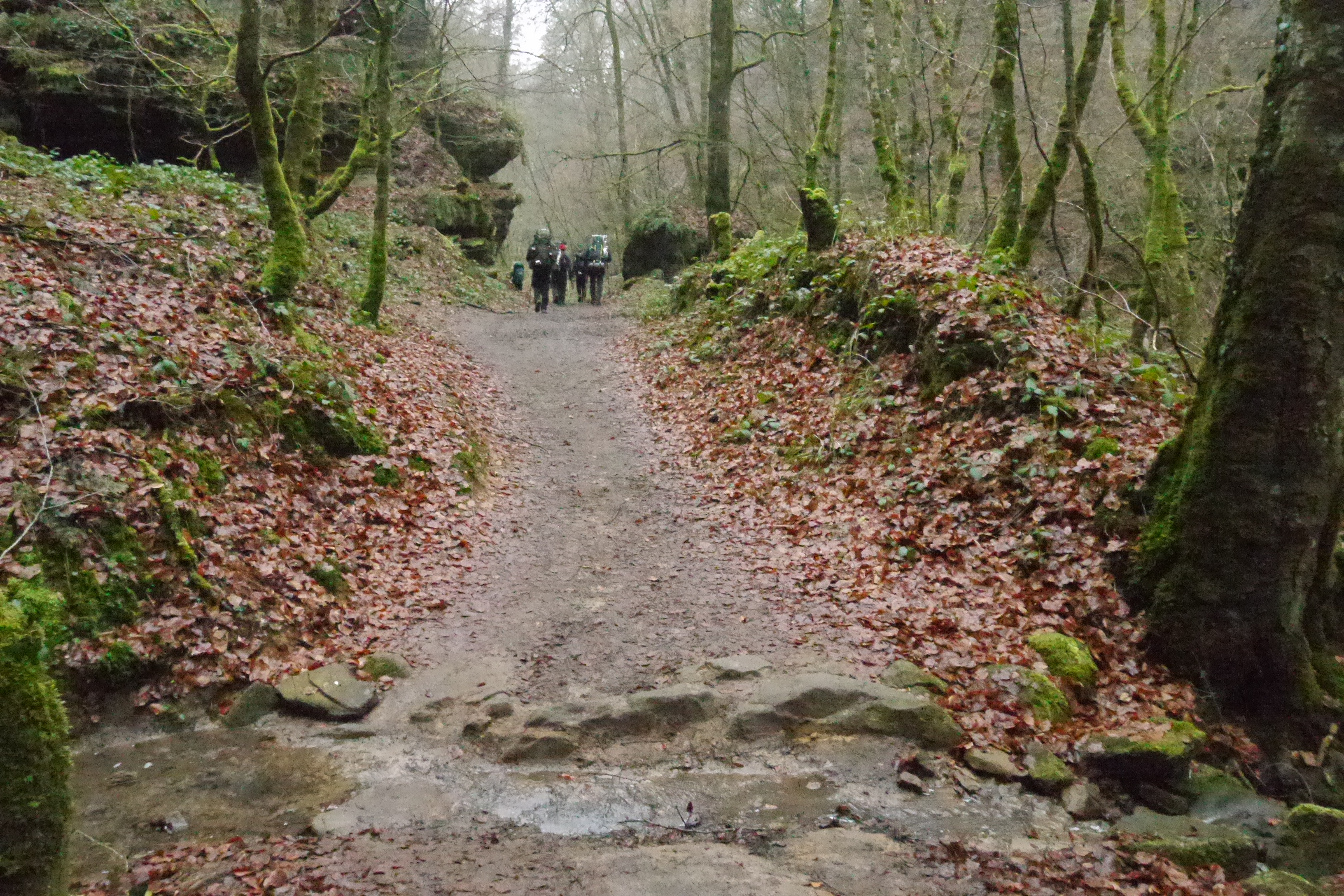 Opnieuw gaan we op pad en na het dorp gaat het over een glibberig karrenspoor langs de velden. Her en der zien we dat de Ernz-Noire met hevige overstromingen de vallei heeft uitgesleten. Net voorbij het kleine stulpje Chateau Grondhaff houden we een laatste pauze. Ik vraag ook om de hoofdlampjes bij de hand te houden want het zal snel beginnen schemeren. Het laatste stuk van de dag verloopt meer in stilte. De tocht is eigenlijk ietsje te lang omdat we nogal laat vertrokken zijn. Ik had het vertrekuur maar beter op 9u gezet ipv 10u. Ach ja, dat is weer een ervaring rijker zeggen enkelen. We slingeren mee met de Haierbaach en volgen een korte omleiding.