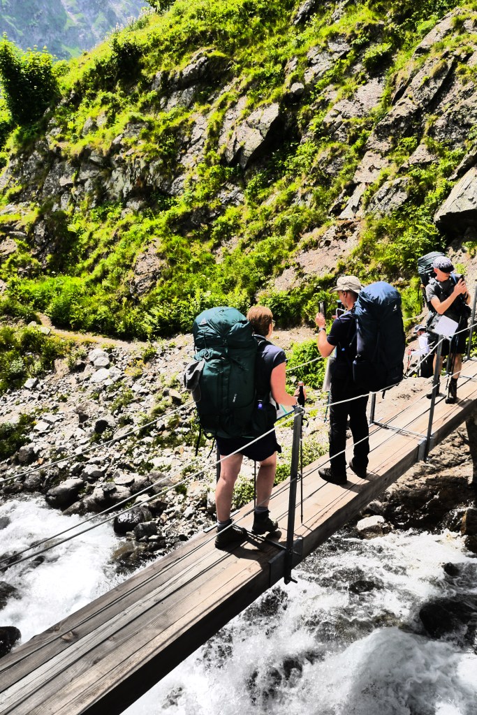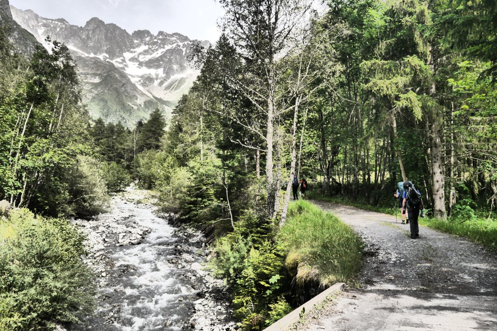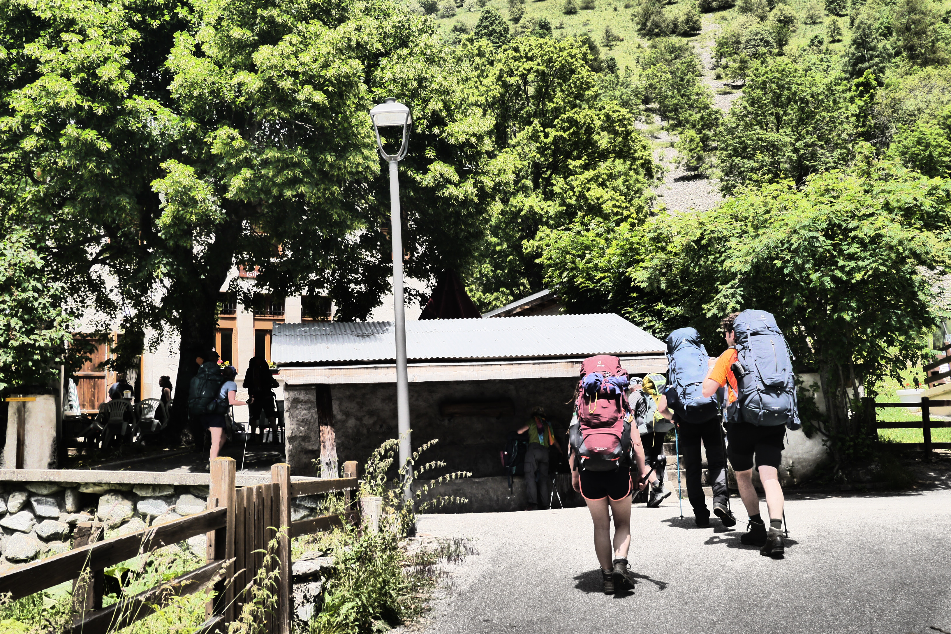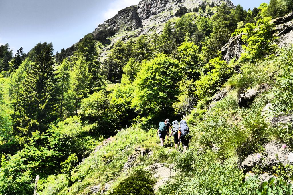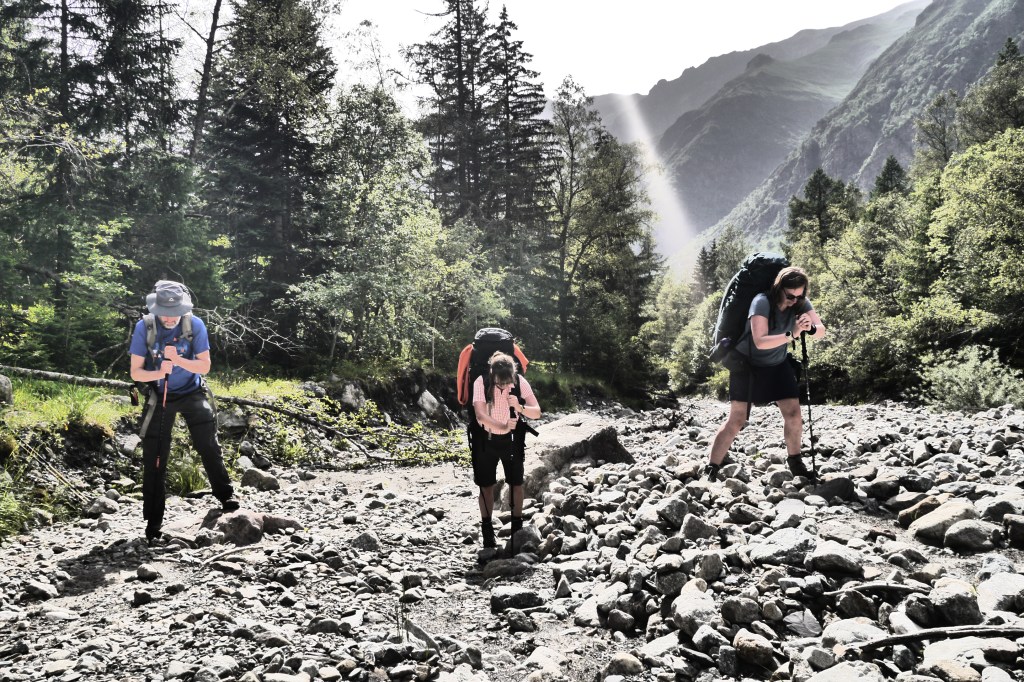 Na de pauze is het Eva die de groep leidt. Vlot dalen we af. Aan de grens van het National Parc Des Ecrins verduidelijk ik nog wat meer over de historiek en rol van het nationaal park. Vervolgens leidt Ute ons naar het terras van de Gite in Valsénestre. Niet veel later bestel ik er een topdessert. In het eerste rondje is iedereen nog bescheiden in het bestellen van desserts. Een tweede ronde scoort duidelijk meer suikers. We genieten van het terras in de schaduw en vullen er na een hele poos aan de bron onze drinkwatervoorraad aan. We trekken door het dorp en installeren ons in de rivierbedding voor wat doorwadingstechnieken. Vervolgens installeren we ons op de bivakplek in het bos en eten we wat. Bij het vallen van de avond geeft de groep me wat me-time en gaan ze het afval weggooien in vuilbakken aan de rand van het dorp en nog wat water en andere geneugden des levens bijtanken in de gite. Ik geniet van de rust door net niet in slaap te vallen op een rots. Wat later houden we een korte briefing over de beklimming naar de Col de la Muzelle en gaan we slapen.