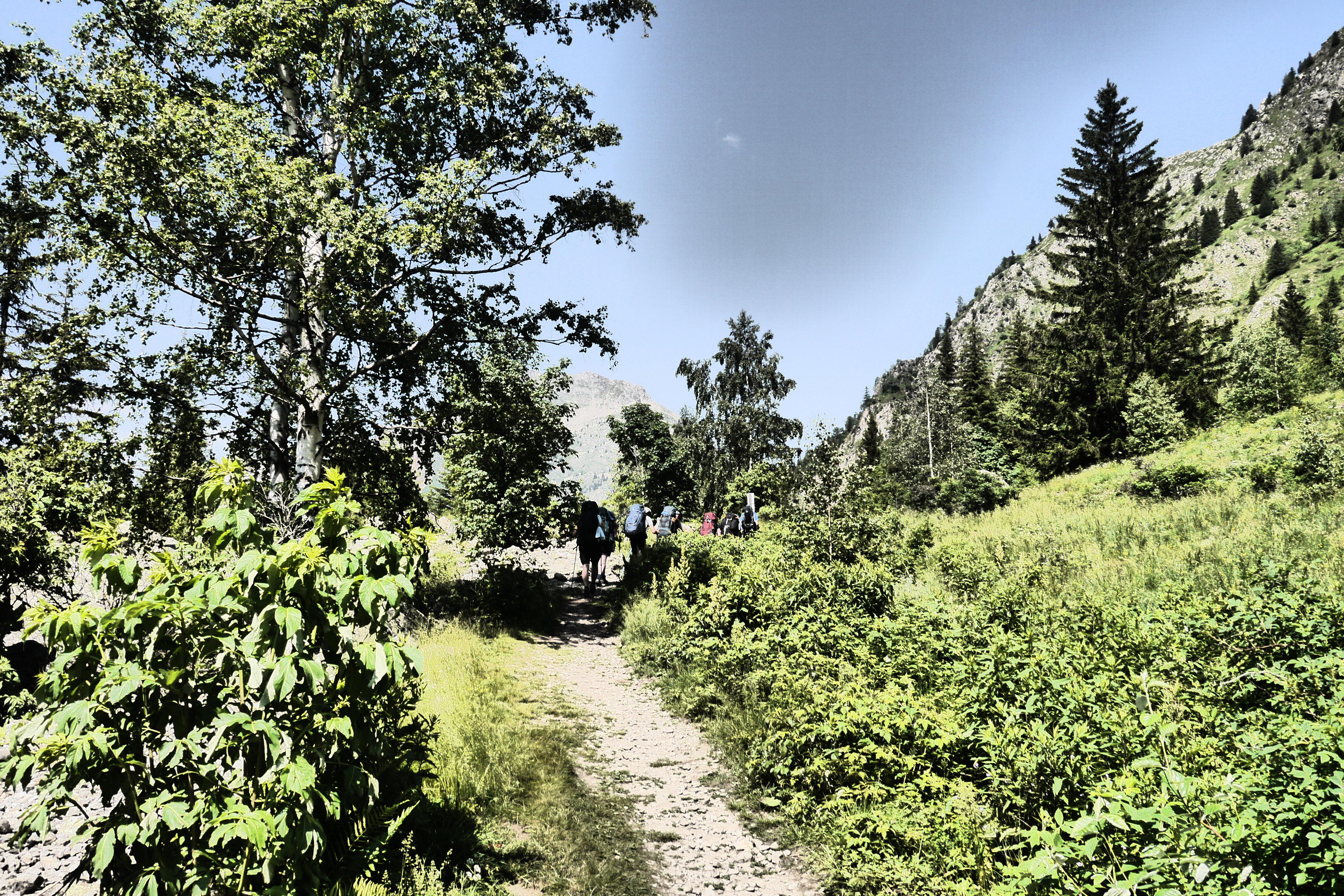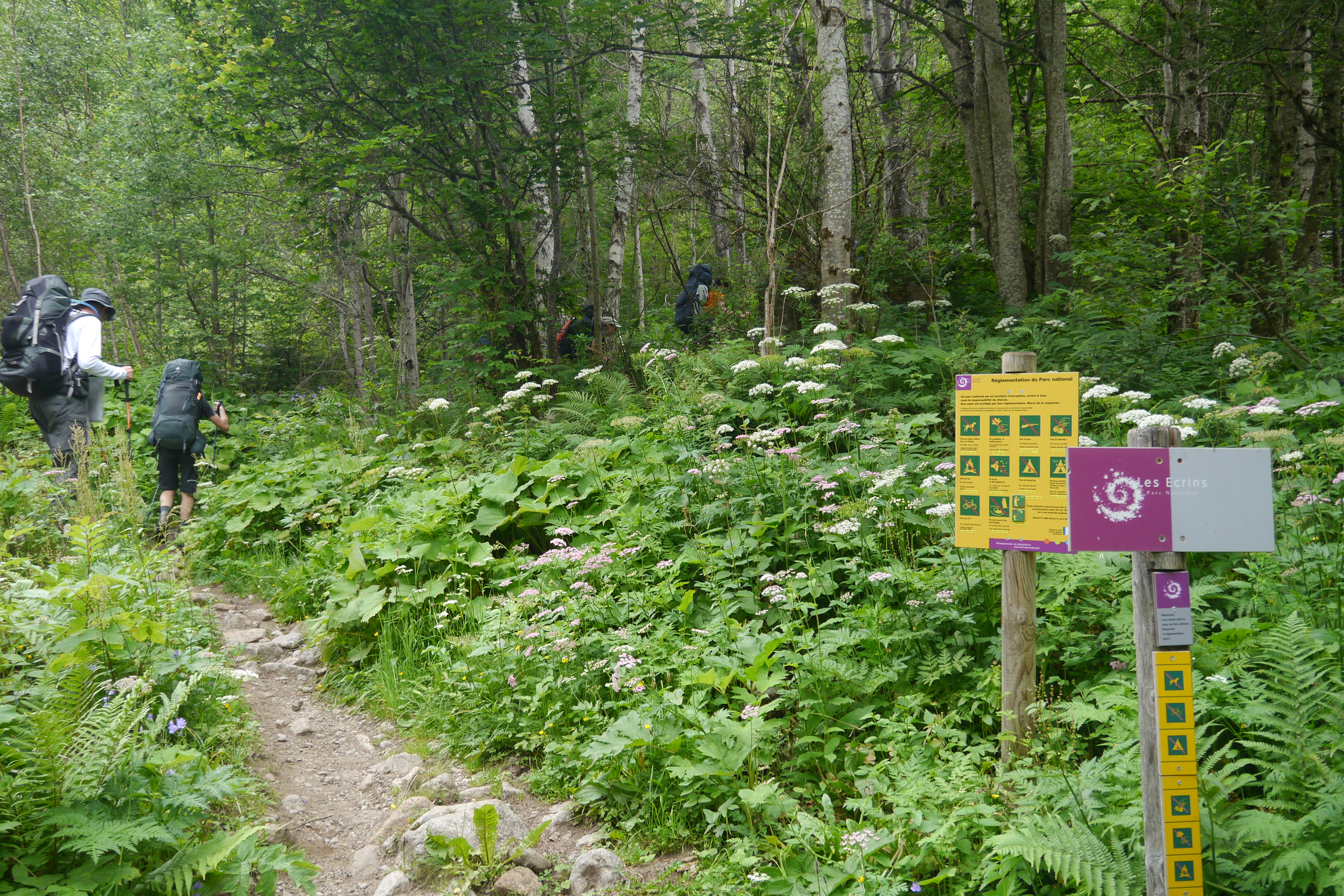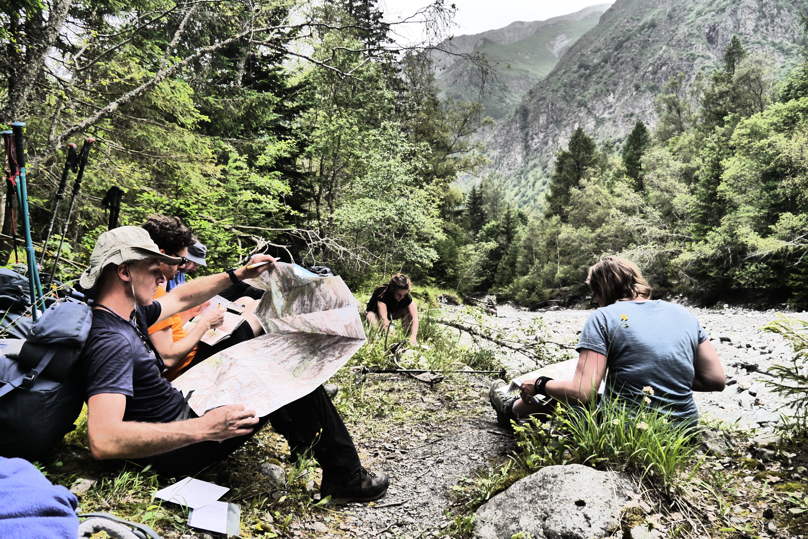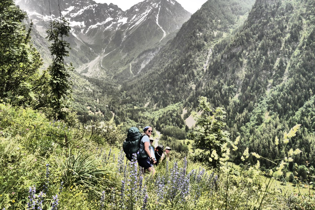 Na de pauze is het Eva die de groep leidt. Vlot dalen we af. Aan de grens van het National Parc Des Ecrins verduidelijk ik nog wat meer over de historiek en rol van het nationaal park. Vervolgens leidt Ute ons naar het terras van de Gite in Valsénestre. Niet veel later bestel ik er een topdessert. In het eerste rondje is iedereen nog bescheiden in het bestellen van desserts. Een tweede ronde scoort duidelijk meer suikers. We genieten van het terras in de schaduw en vullen er na een hele poos aan de bron onze drinkwatervoorraad aan. We trekken door het dorp en installeren ons in de rivierbedding voor wat doorwadingstechnieken. Vervolgens installeren we ons op de bivakplek in het bos en eten we wat. Bij het vallen van de avond geeft de groep me wat me-time en gaan ze het afval weggooien in vuilbakken aan de rand van het dorp en nog wat water en andere geneugden des levens bijtanken in de gite. Ik geniet van de rust door net niet in slaap te vallen op een rots. Wat later houden we een korte briefing over de beklimming naar de Col de la Muzelle en gaan we slapen.