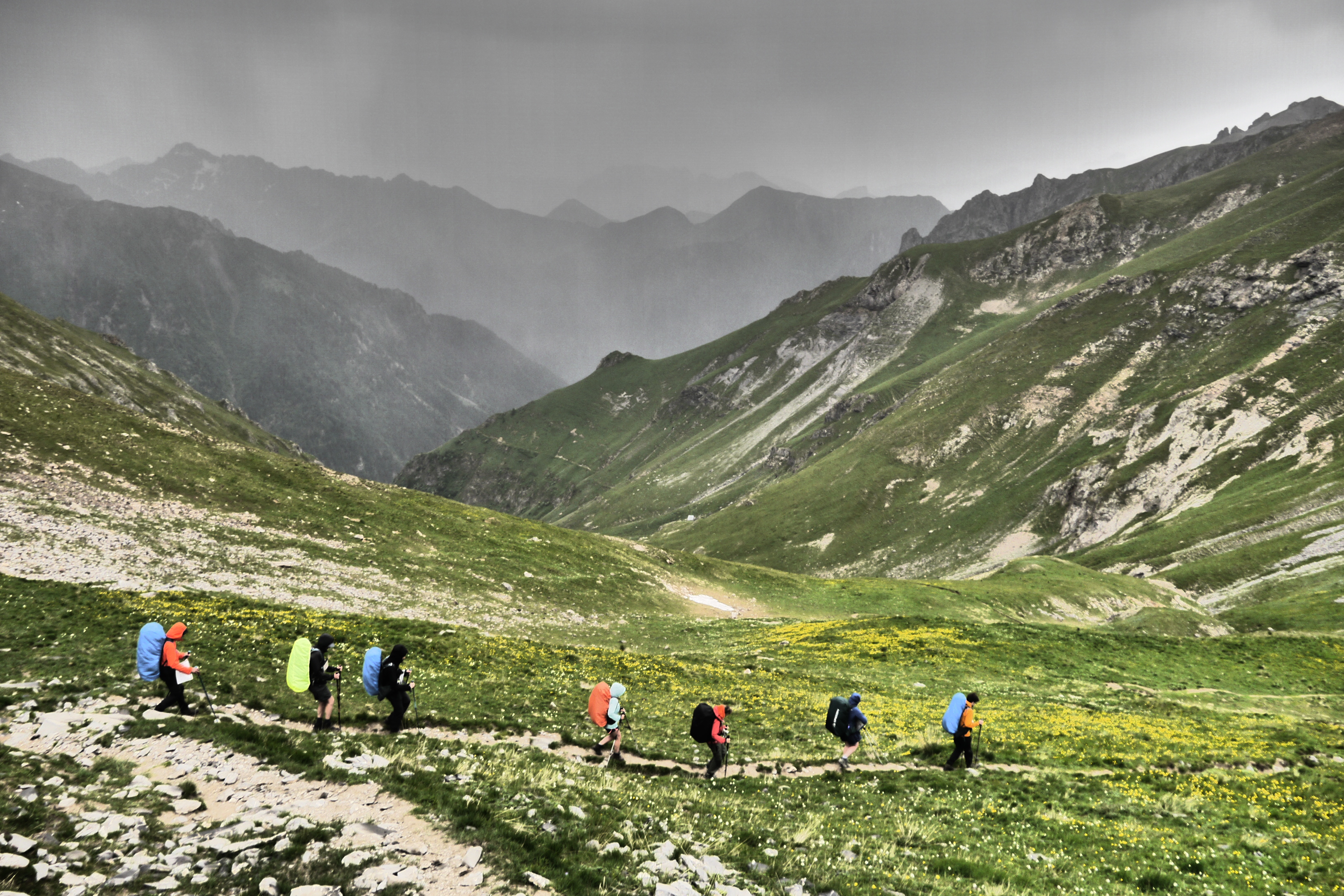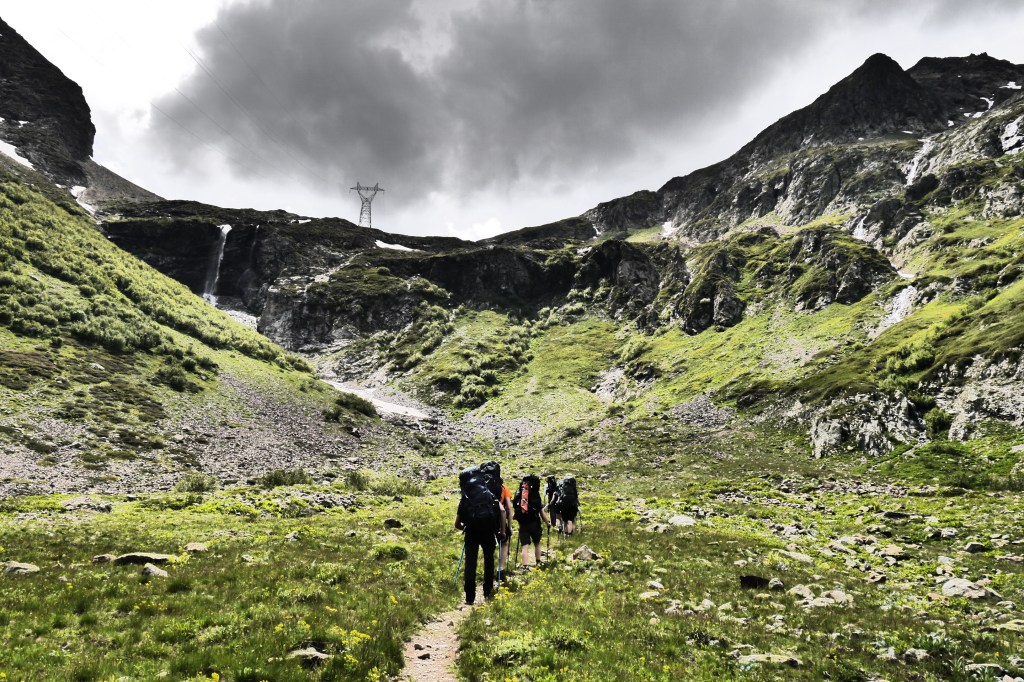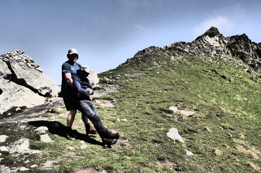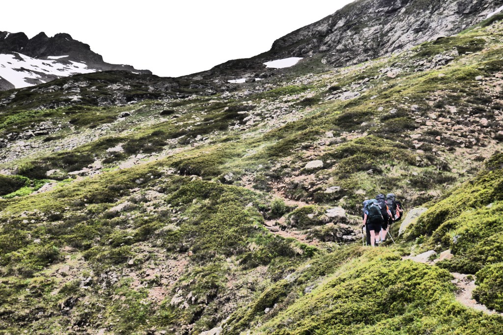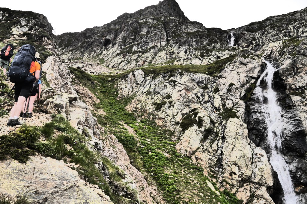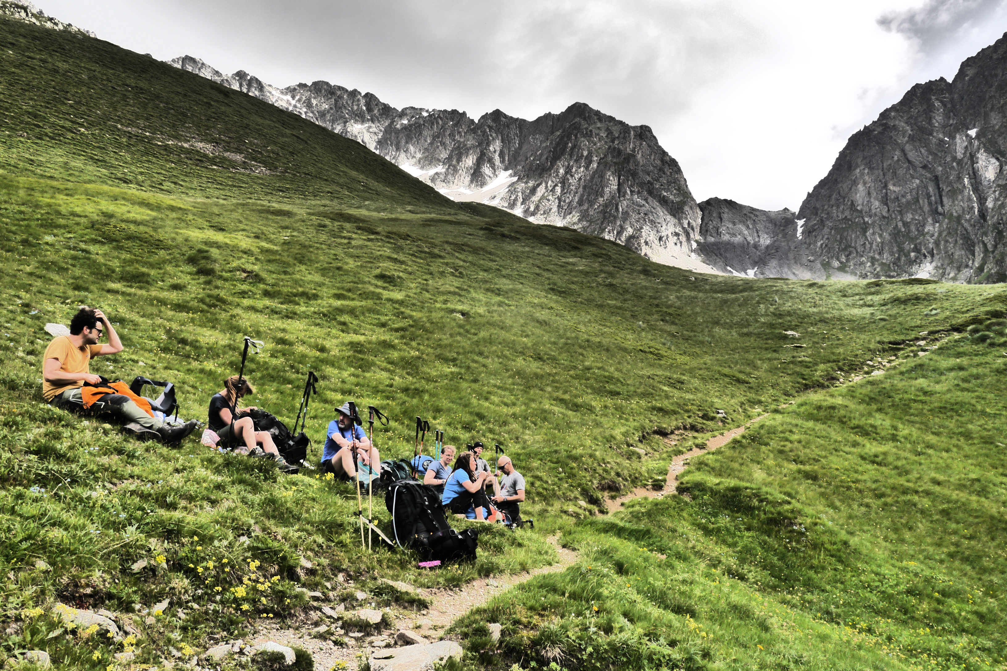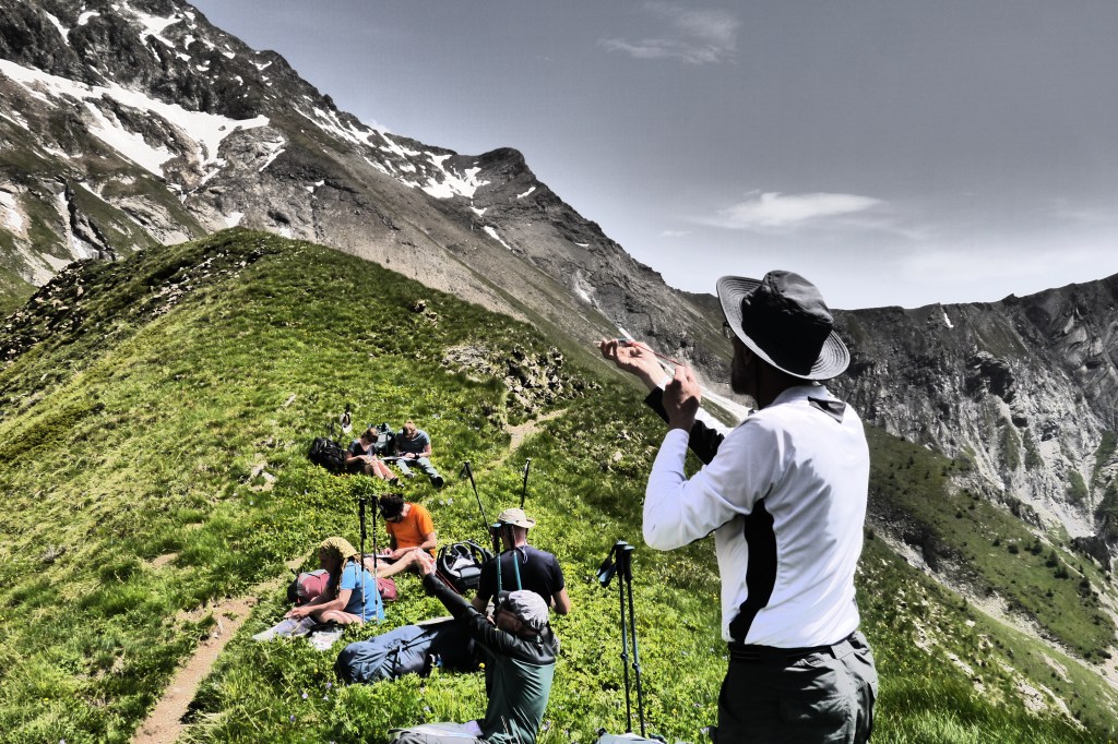 Het is 8u als we vertrekken. Het weerbericht geeft alvast regen en het voelt ook al vochtig aan in het bos want met de ochtend kwamen ook de eerste buien. We wandelen over een breed karrenspoor om dan de GR van de Tour D’Oisans te volgen. We gaan opnieuw door een grasland met heel veel bloemen. Er wordt veel gewisseld aan kop. Ideaal als een groep zelf initiatief neemt. Dan weet je dat je goed zit. Tijdens een droog moment houden we weer een ‘Jos-simulatie’. Deze keer rond uitdroging. We eten een tussendoortje en gaan weer verder. We stijgen tot net voor de steile zigzag. Een laatste toiletbreak en dan omhoog over de flank vol vlijmscherpe leisteen. Het pad is steil en daagt sommige achillespezen uit en zorgt zelfs voor een pijnlijke knie bij één van de deelnemers. We komen helaas op de col de la Muzelle met wind en regen. Ondanks dat slechte weer zetten we ons wat uit de wind en houden we een korte picknick. Het is ten slotte al 13u. Lang zitten we niet op ons gemak. De koude wind giert om ons heen en de nattigheid van de regen maakt het kil.