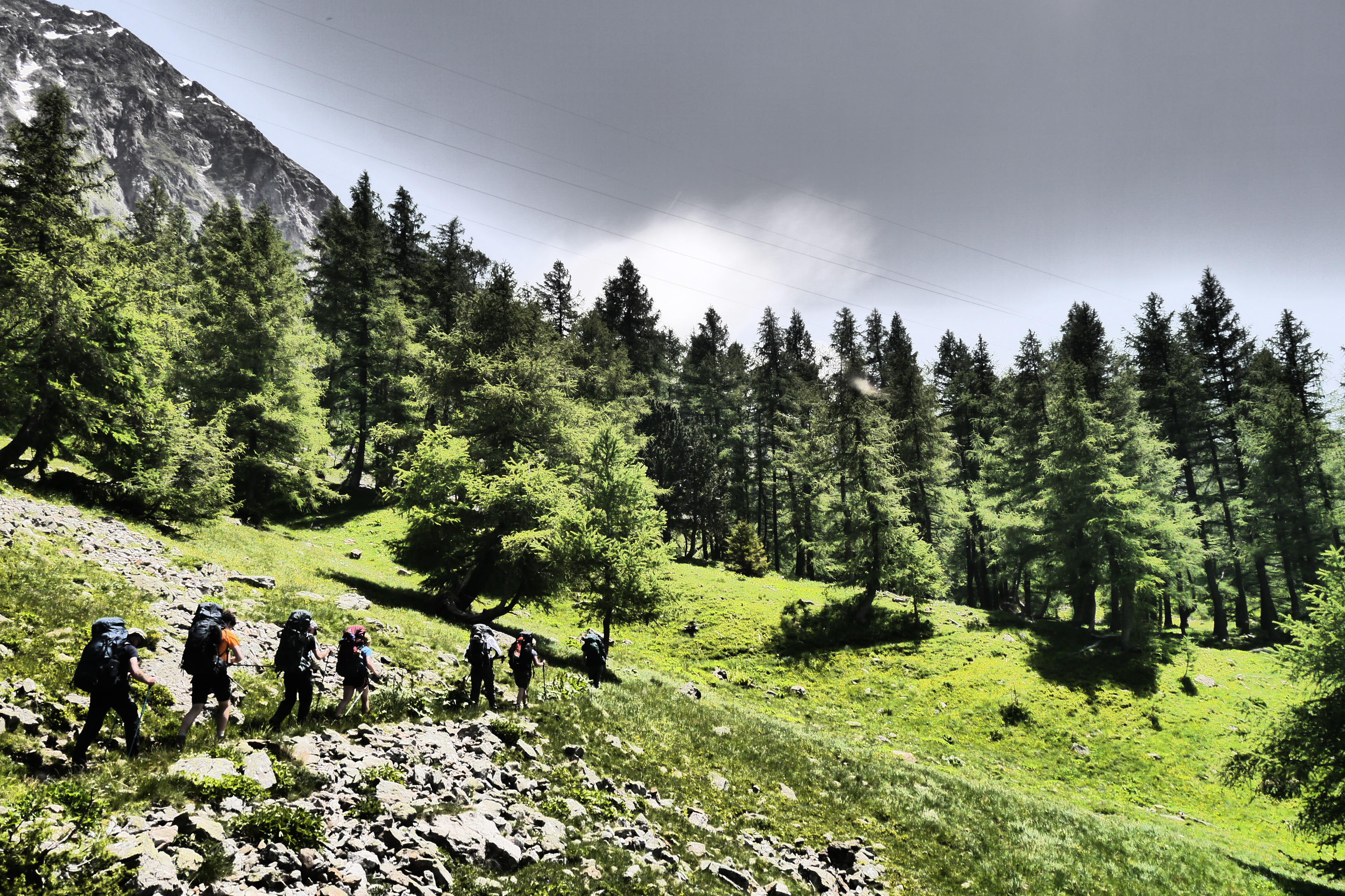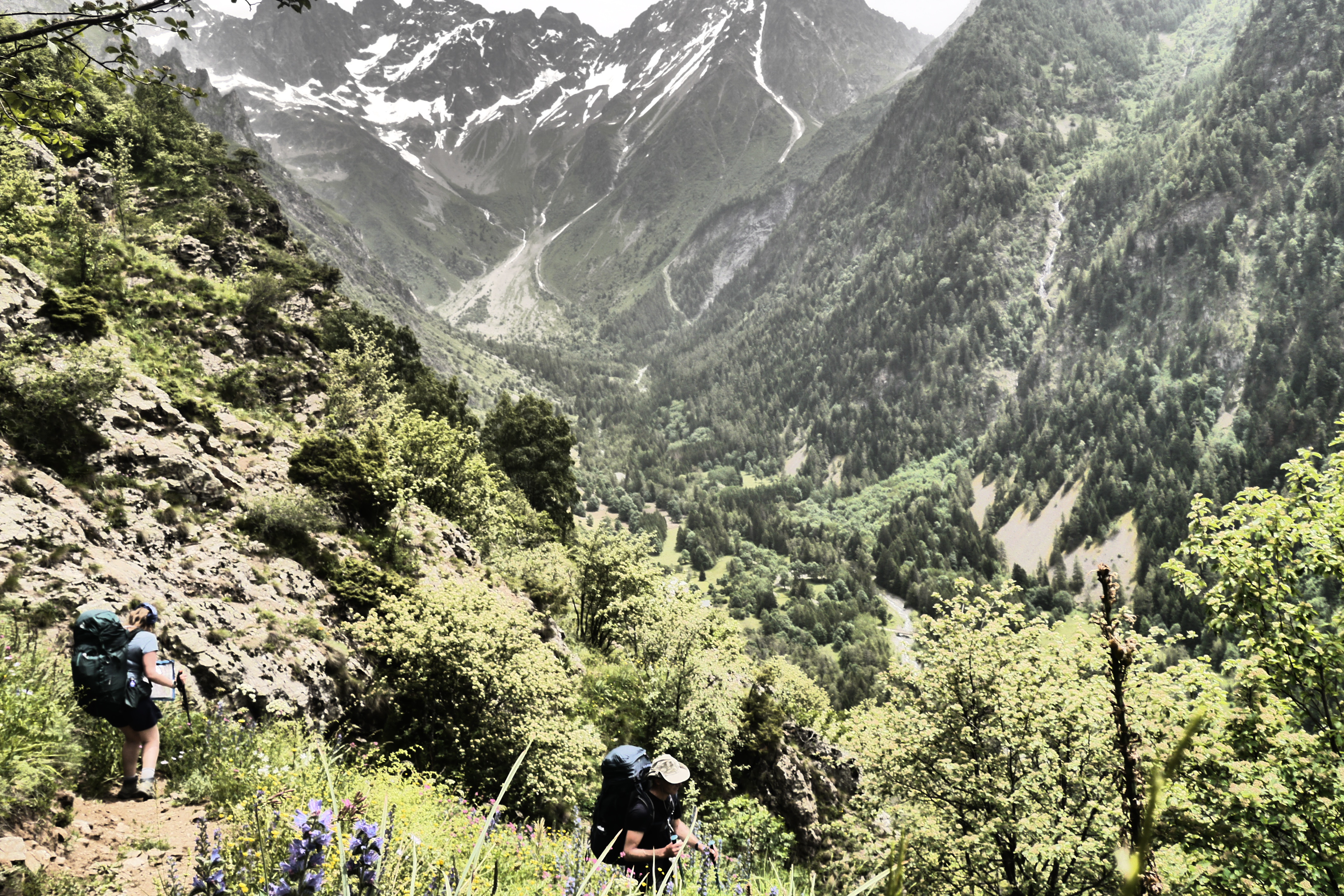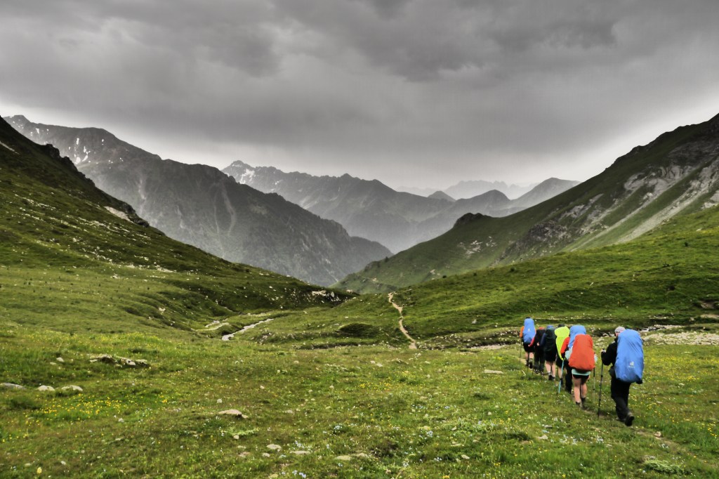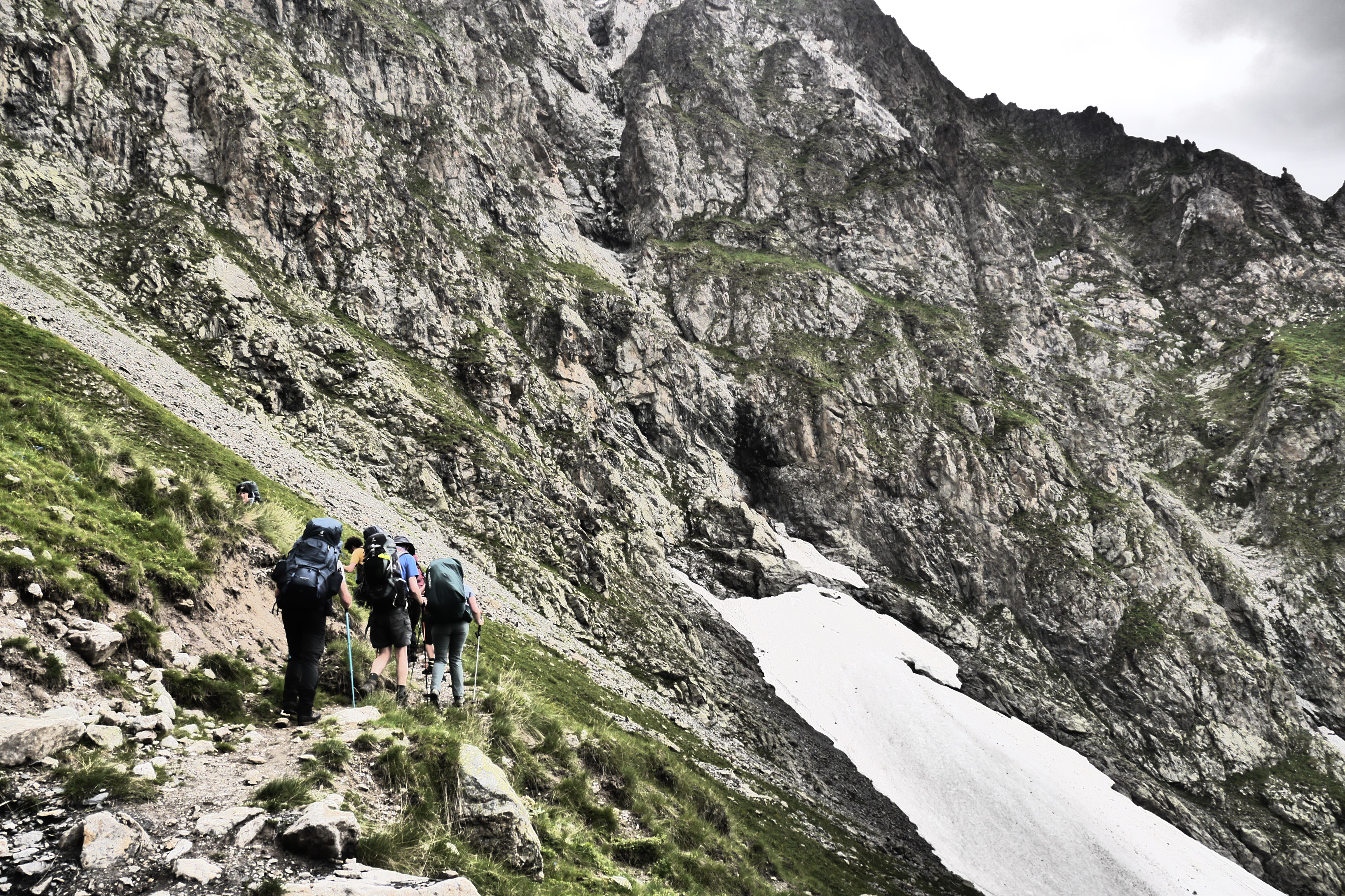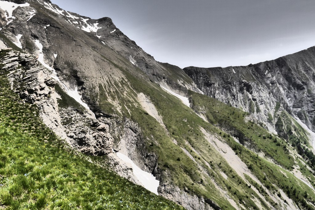 Het is 8u als we vertrekken. Het weerbericht geeft alvast regen en het voelt ook al vochtig aan in het bos want met de ochtend kwamen ook de eerste buien. We wandelen over een breed karrenspoor om dan de GR van de Tour D’Oisans te volgen. We gaan opnieuw door een grasland met heel veel bloemen. Er wordt veel gewisseld aan kop. Ideaal als een groep zelf initiatief neemt. Dan weet je dat je goed zit. Tijdens een droog moment houden we weer een ‘Jos-simulatie’. Deze keer rond uitdroging. We eten een tussendoortje en gaan weer verder. We stijgen tot net voor de steile zigzag. Een laatste toiletbreak en dan omhoog over de flank vol vlijmscherpe leisteen. Het pad is steil en daagt sommige achillespezen uit en zorgt zelfs voor een pijnlijke knie bij één van de deelnemers. We komen helaas op de col de la Muzelle met wind en regen. Ondanks dat slechte weer zetten we ons wat uit de wind en houden we een korte picknick. Het is ten slotte al 13u. Lang zitten we niet op ons gemak. De koude wind giert om ons heen en de nattigheid van de regen maakt het kil.