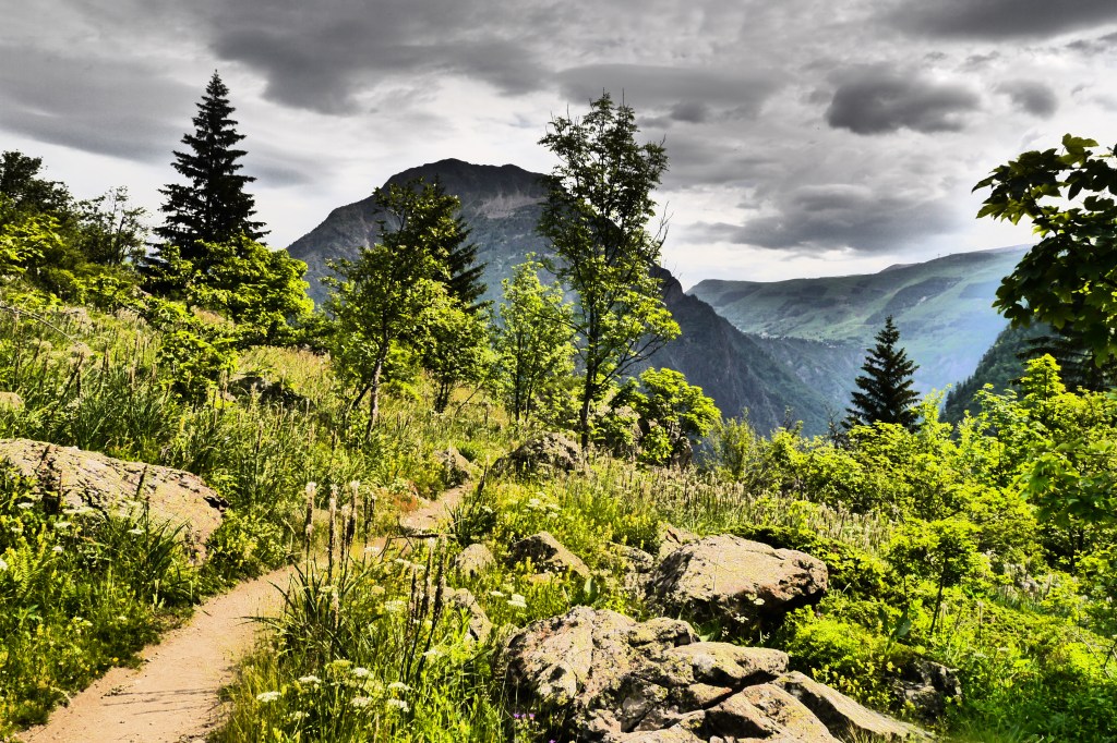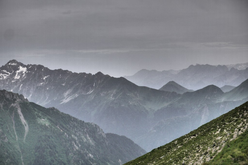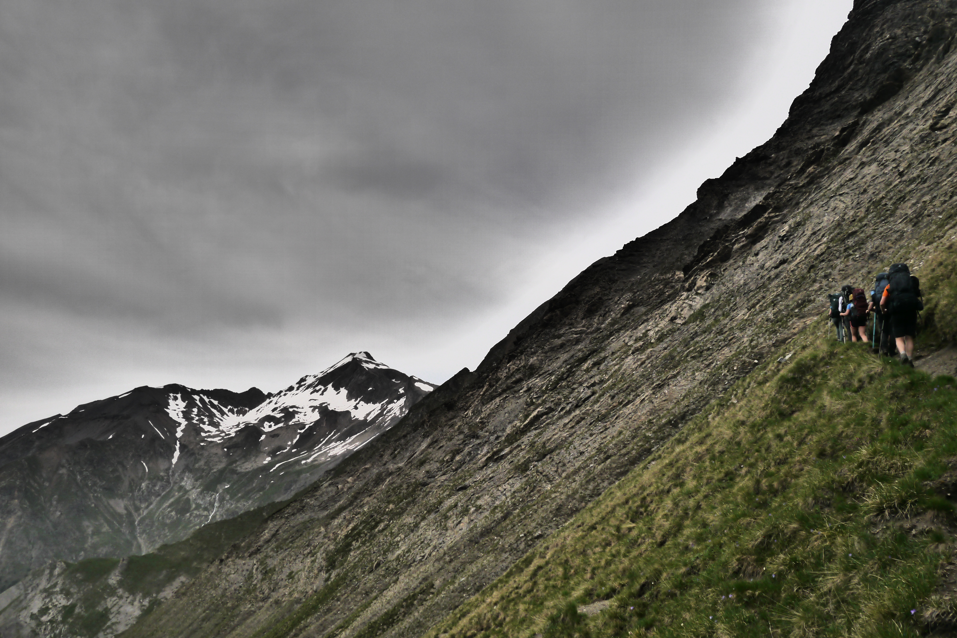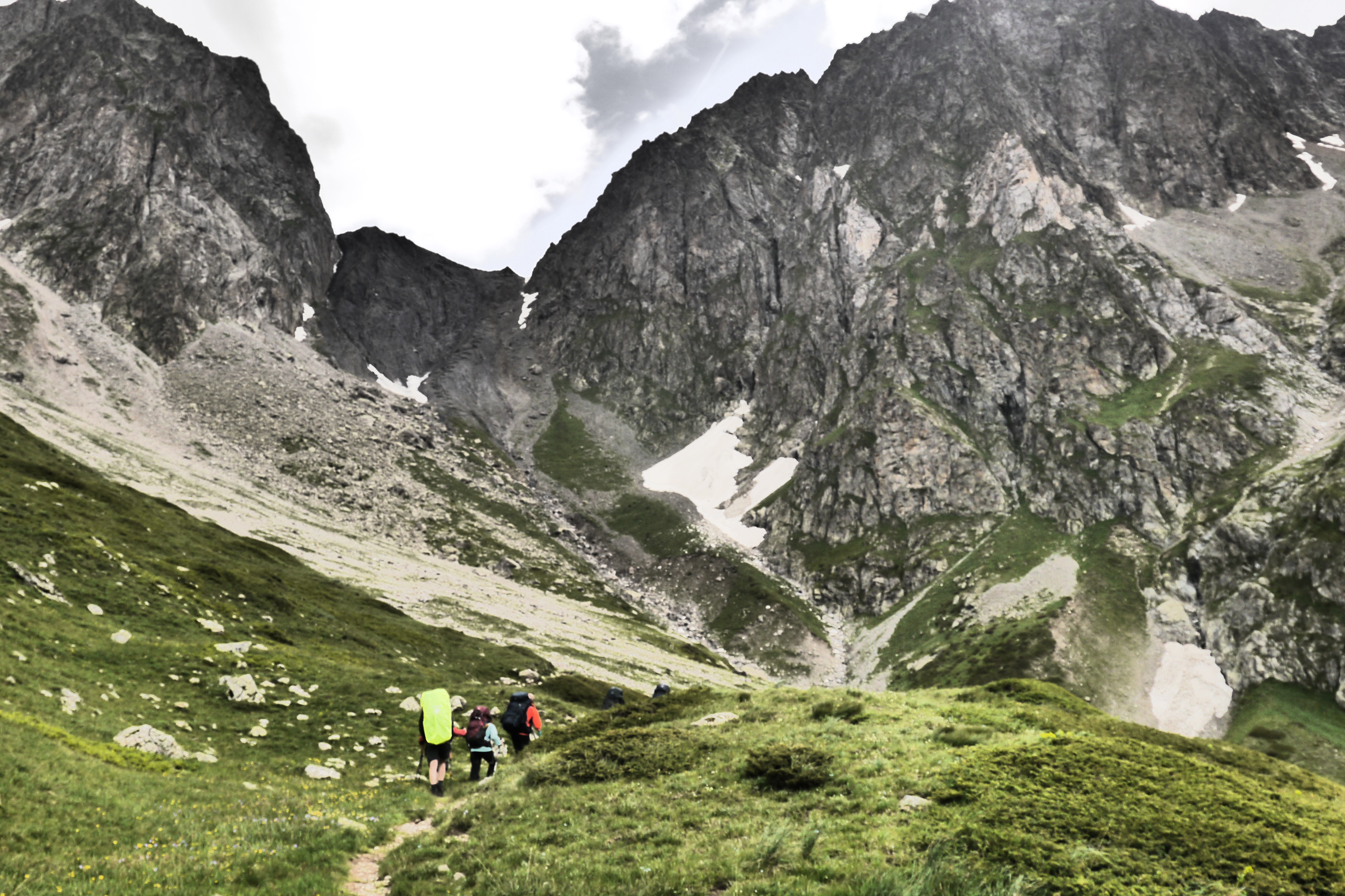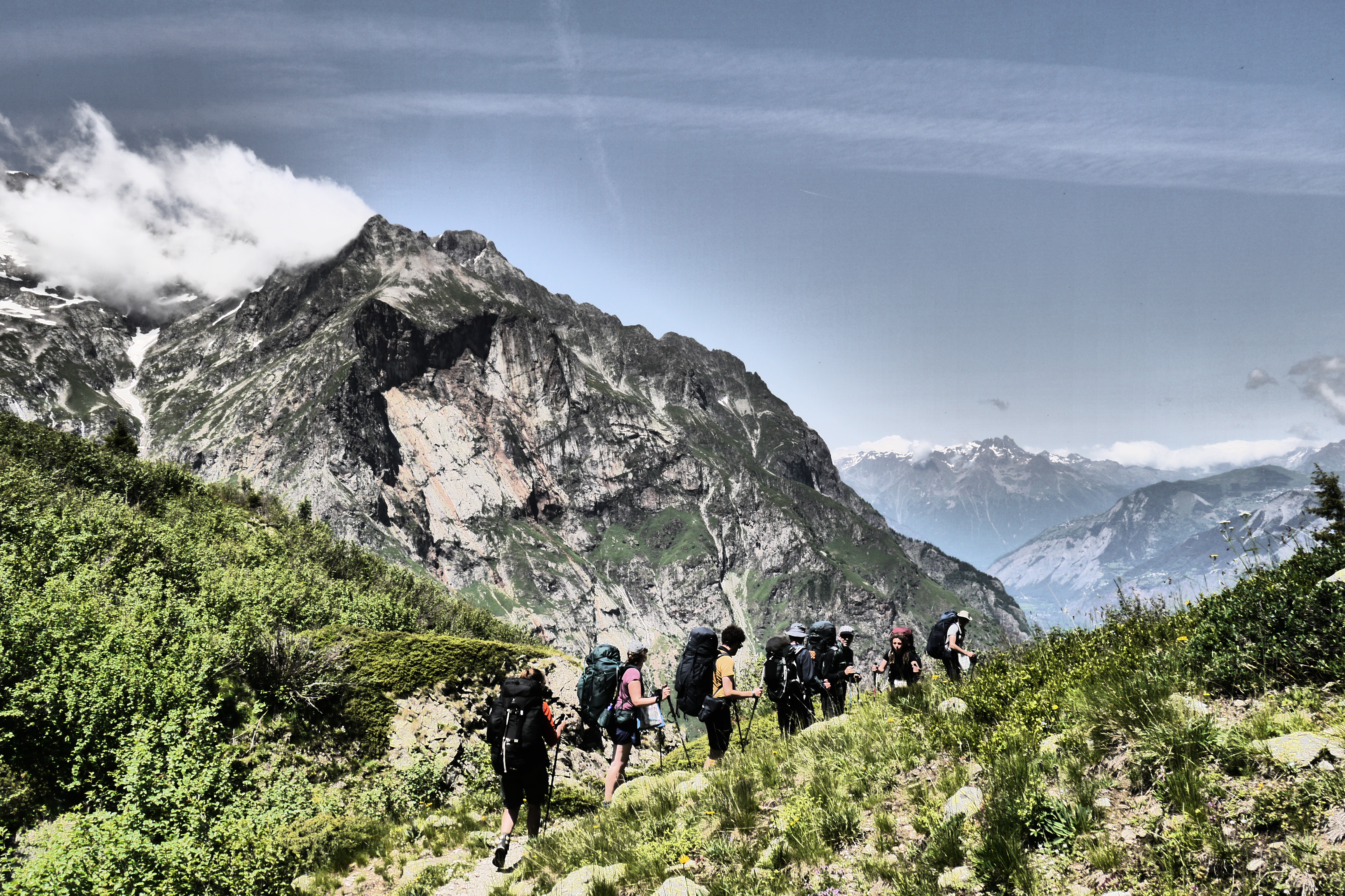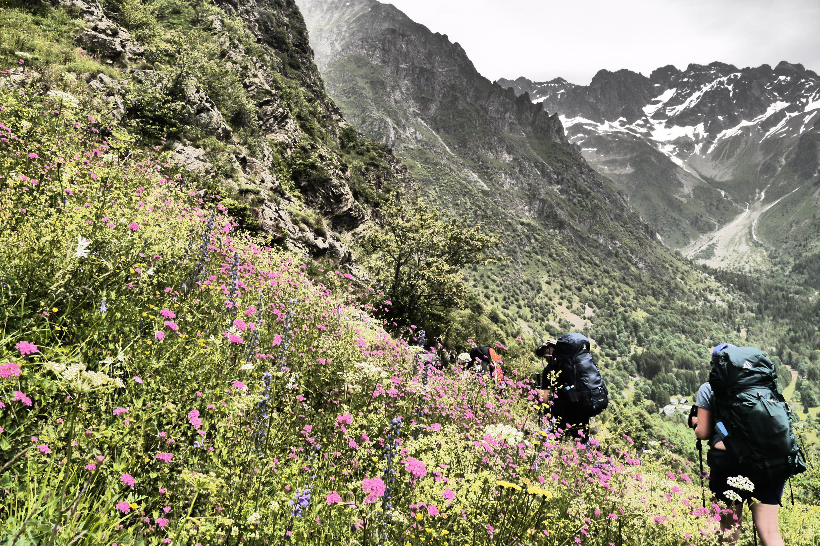 Het is 8u als we vertrekken. Het weerbericht geeft alvast regen en het voelt ook al vochtig aan in het bos want met de ochtend kwamen ook de eerste buien. We wandelen over een breed karrenspoor om dan de GR van de Tour D’Oisans te volgen. We gaan opnieuw door een grasland met heel veel bloemen. Er wordt veel gewisseld aan kop. Ideaal als een groep zelf initiatief neemt. Dan weet je dat je goed zit. Tijdens een droog moment houden we weer een ‘Jos-simulatie’. Deze keer rond uitdroging. We eten een tussendoortje en gaan weer verder. We stijgen tot net voor de steile zigzag. Een laatste toiletbreak en dan omhoog over de flank vol vlijmscherpe leisteen. Het pad is steil en daagt sommige achillespezen uit en zorgt zelfs voor een pijnlijke knie bij één van de deelnemers. We komen helaas op de col de la Muzelle met wind en regen. Ondanks dat slechte weer zetten we ons wat uit de wind en houden we een korte picknick. Het is ten slotte al 13u. Lang zitten we niet op ons gemak. De koude wind giert om ons heen en de nattigheid van de regen maakt het kil.