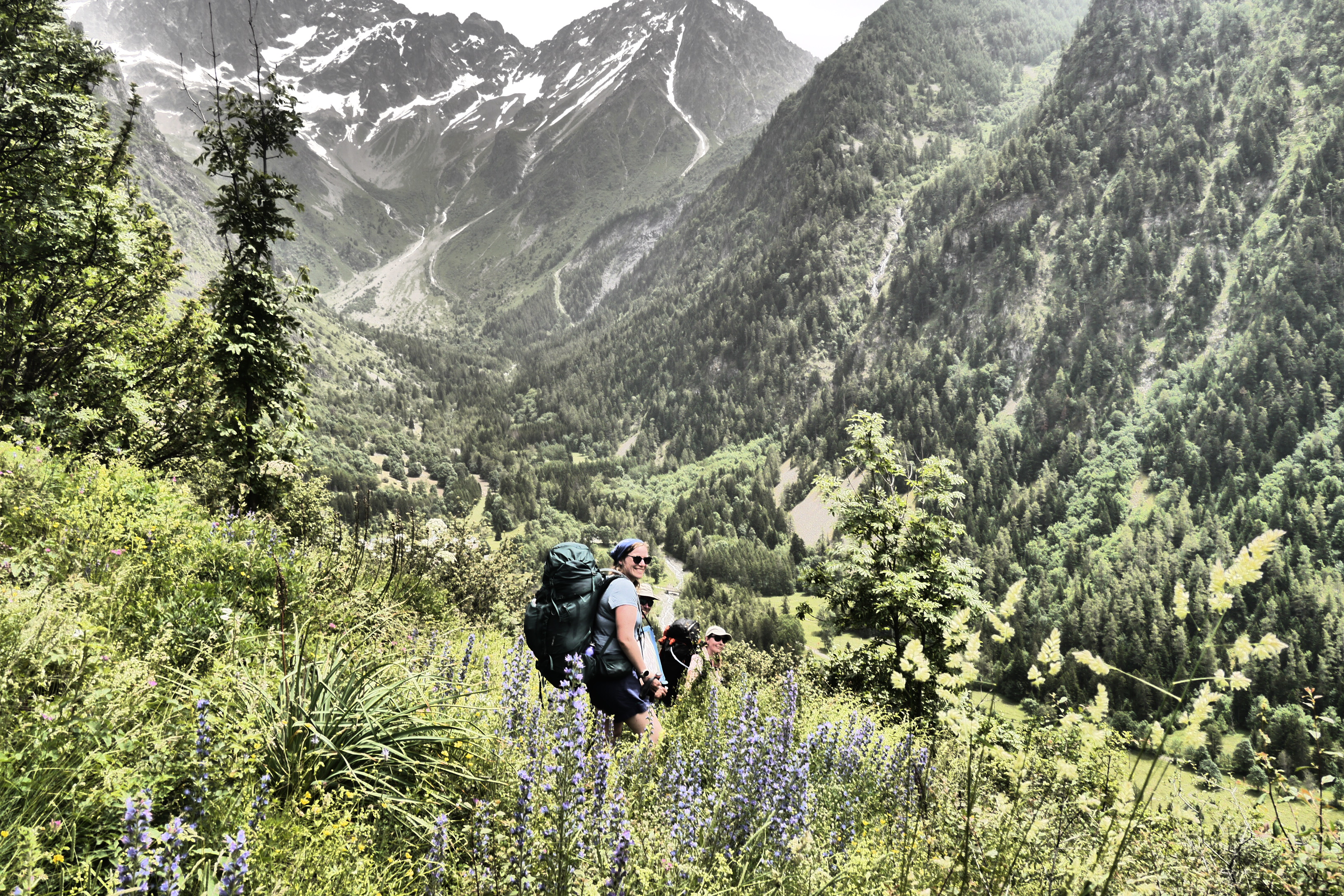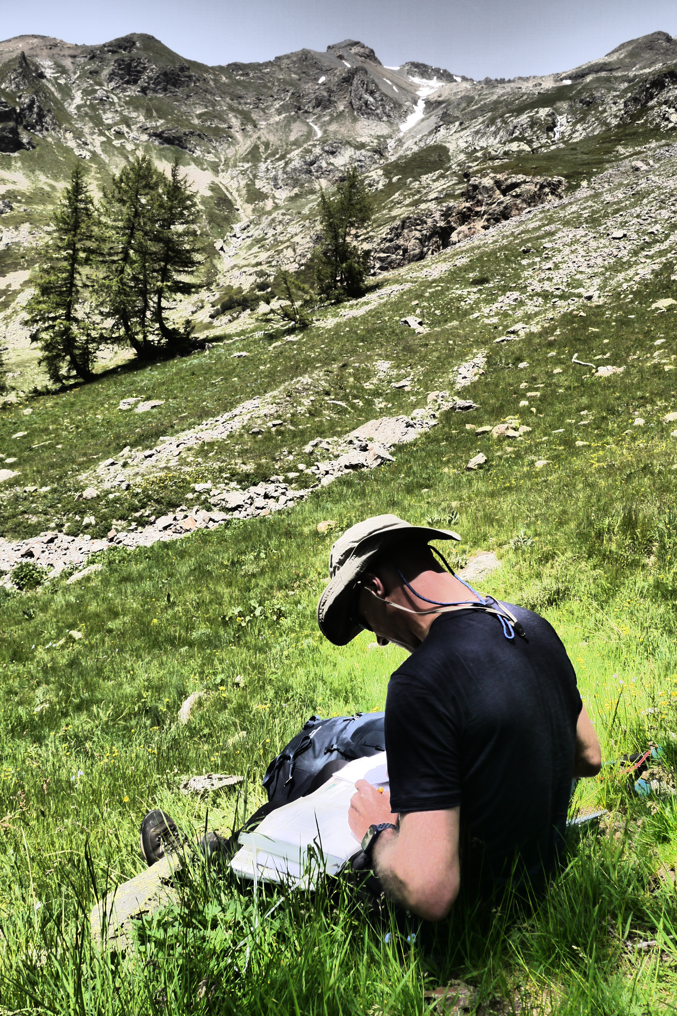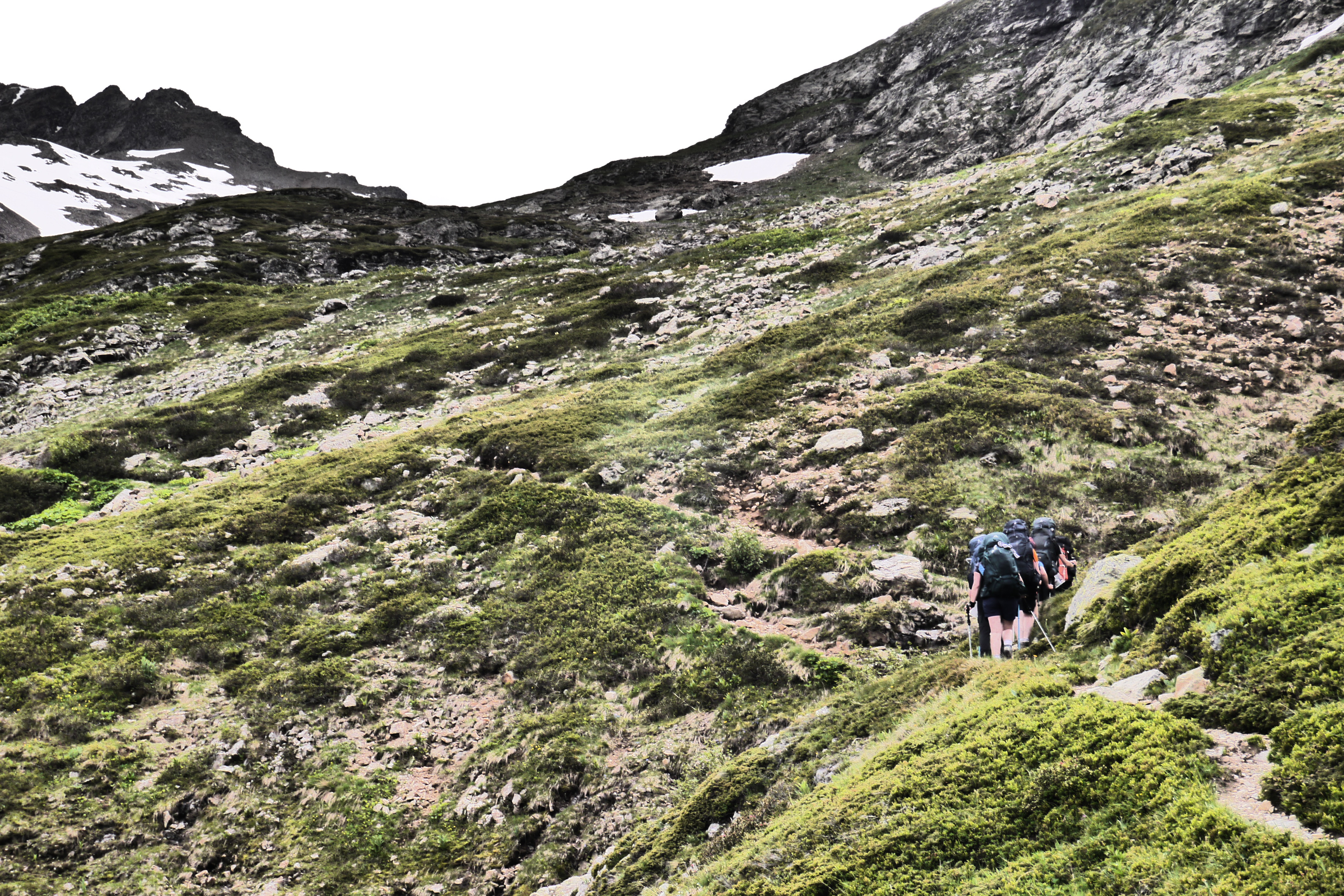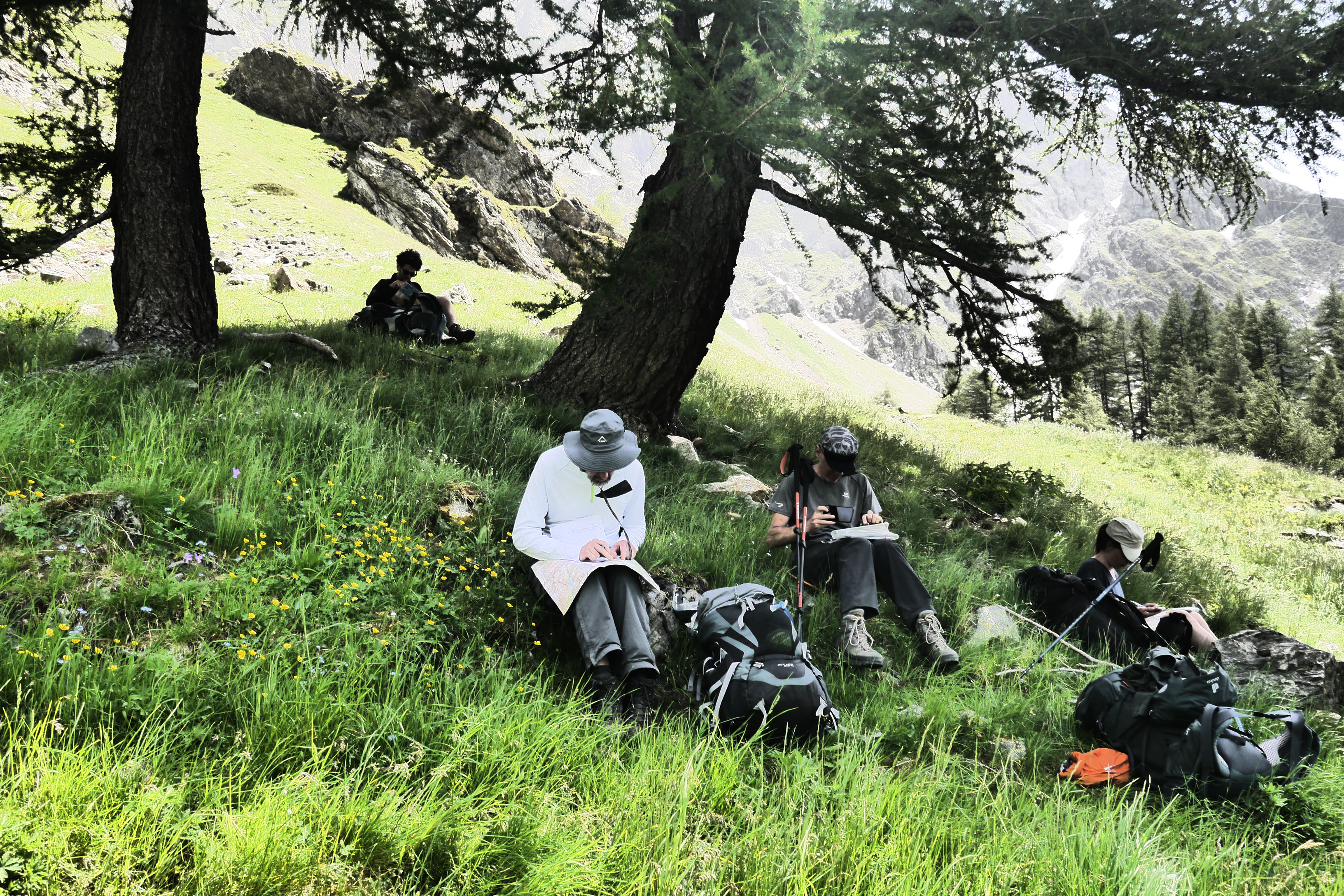 Joris neemt ondertussen de groep op sleeptouw en stelt wat later voor om te pauzeren in de schaduw. We lunchen er op ons gemak en bereiden ons voor op de warme flank die nog voor ons ligt. De groep babbelt naarstig over de voorbije avonturen of geplande hikes maar geniet ook duidelijk van het landschap en de bloemenpracht: van het alpenvergeetmijnietje tot gewone rolklaver, van de alpenroos tot bergzenegroen… bijna 90% van de determinatiebundel passeert de revue. We gaan zigzaggend door hoog gras en komen hogerop in een veld van bosbessen en rhododendrons. De beekjes klateren een koele massa water naar beneden en de groep gaat gestaag voort. We stoppen even om wat hielen te tapen en verfrissen ons door de pet in het water te steken. Er wordt lustig gesmeerd met zonnecrème want de zon brandt. Er staat gelukkig ook een briesje.
