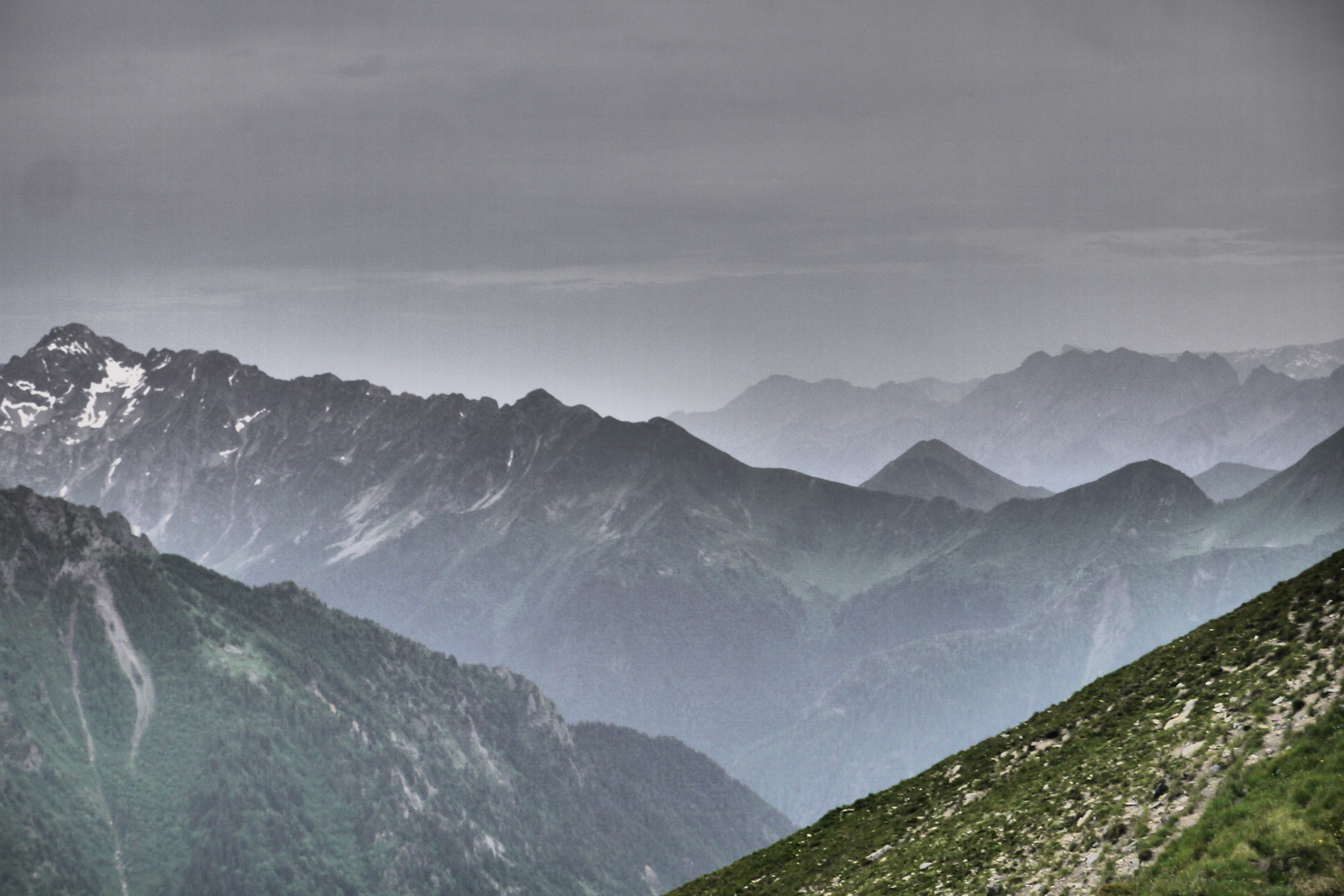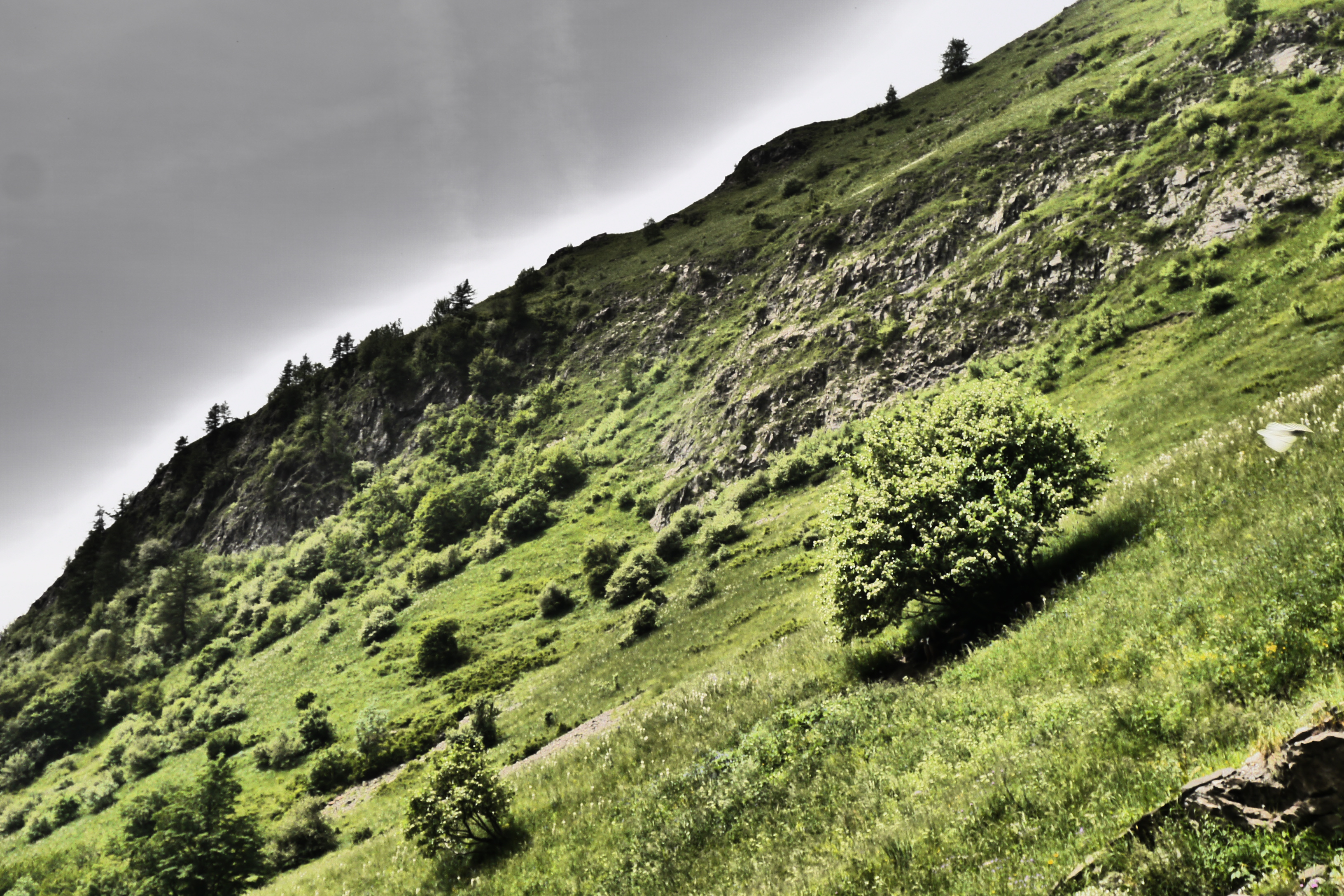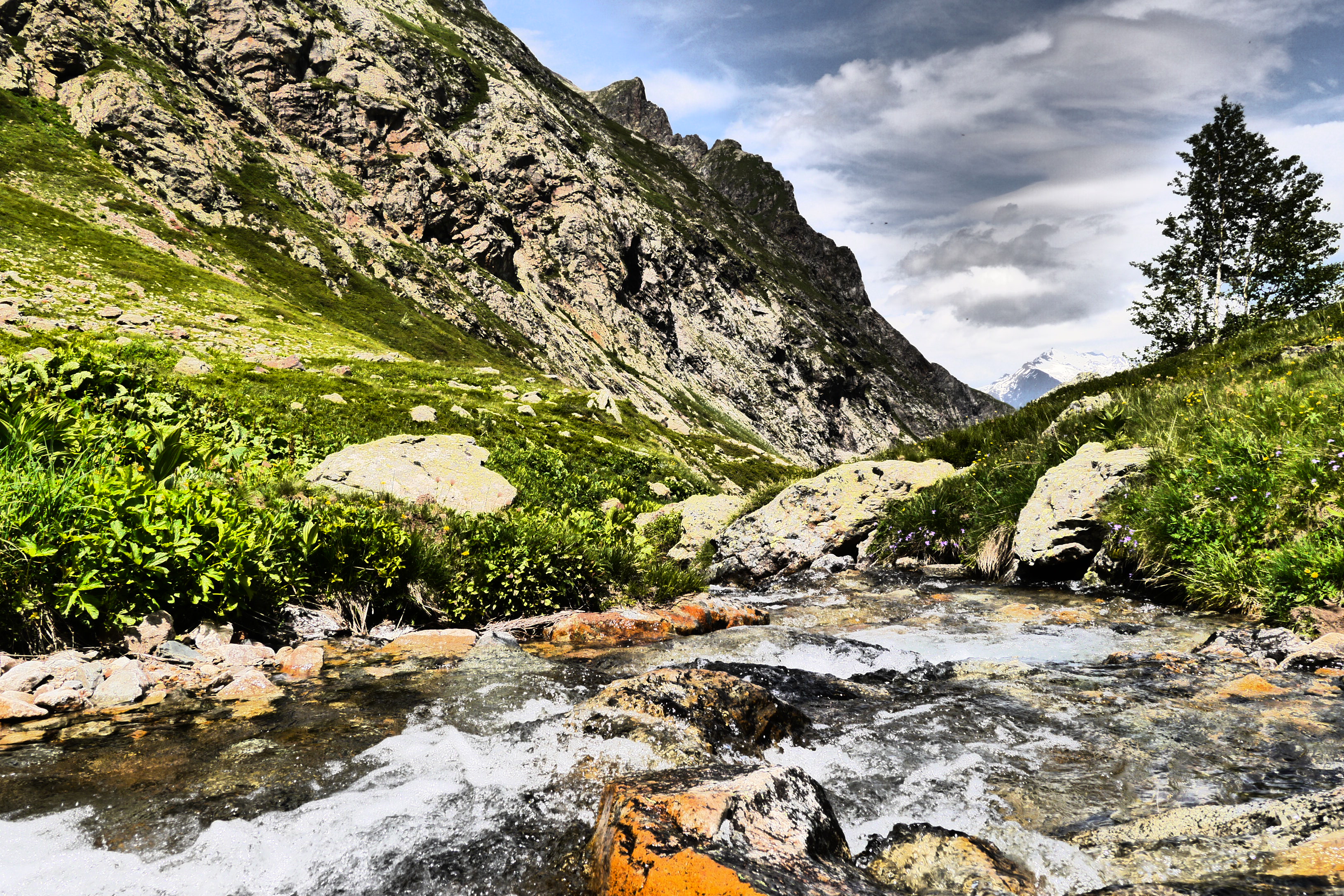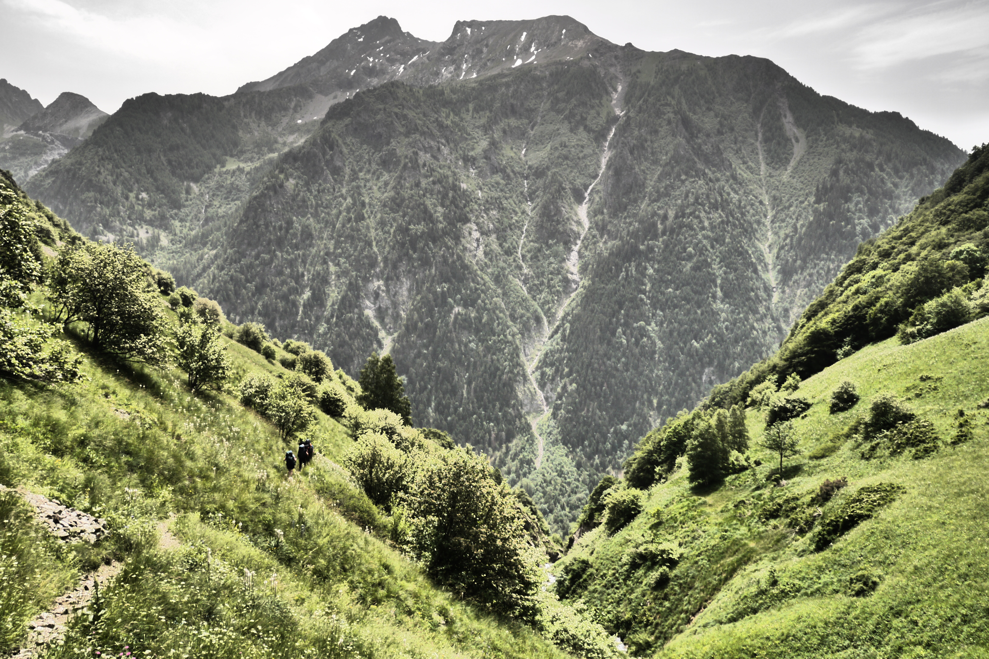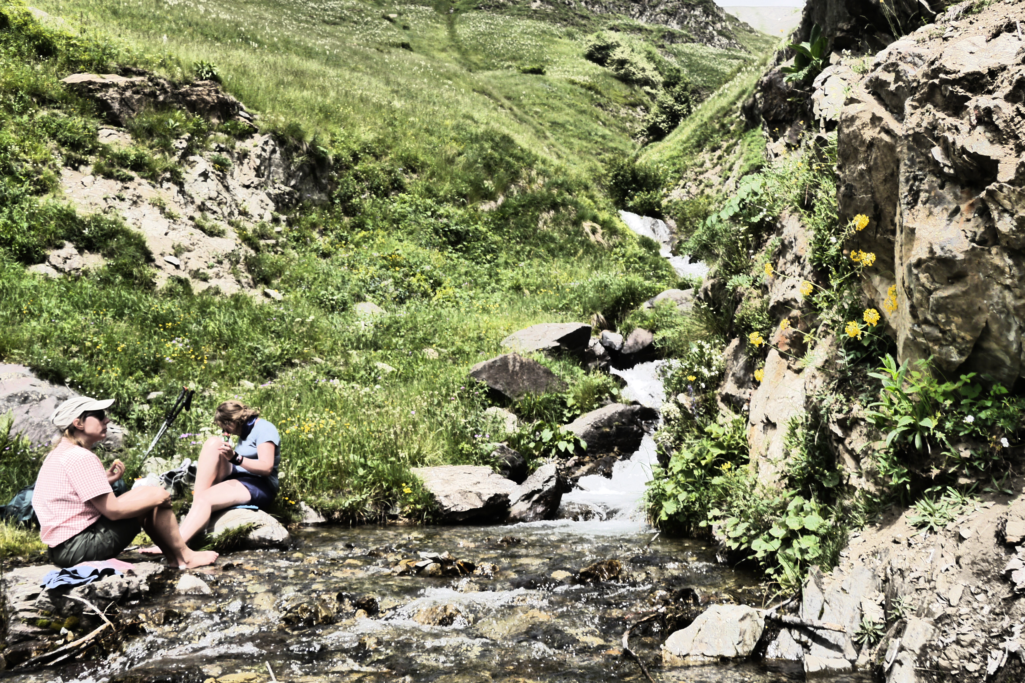 Joris neemt ondertussen de groep op sleeptouw en stelt wat later voor om te pauzeren in de schaduw. We lunchen er op ons gemak en bereiden ons voor op de warme flank die nog voor ons ligt. De groep babbelt naarstig over de voorbije avonturen of geplande hikes maar geniet ook duidelijk van het landschap en de bloemenpracht: van het alpenvergeetmijnietje tot gewone rolklaver, van de alpenroos tot bergzenegroen… bijna 90% van de determinatiebundel passeert de revue. We gaan zigzaggend door hoog gras en komen hogerop in een veld van bosbessen en rhododendrons. De beekjes klateren een koele massa water naar beneden en de groep gaat gestaag voort. We stoppen even om wat hielen te tapen en verfrissen ons door de pet in het water te steken. Er wordt lustig gesmeerd met zonnecrème want de zon brandt. Er staat gelukkig ook een briesje.