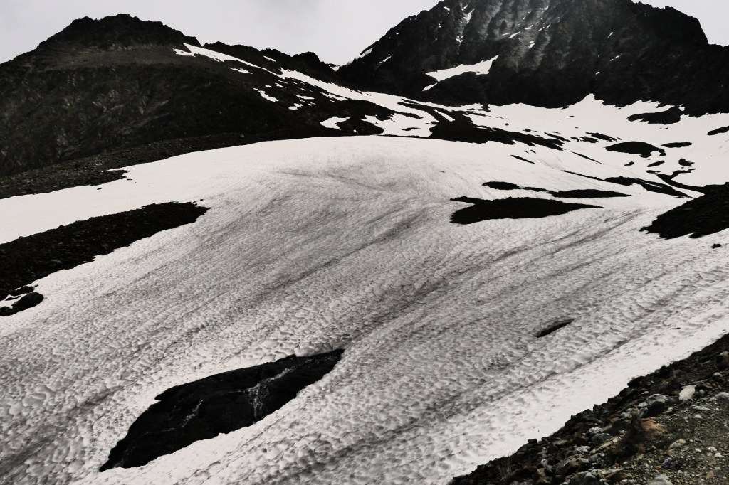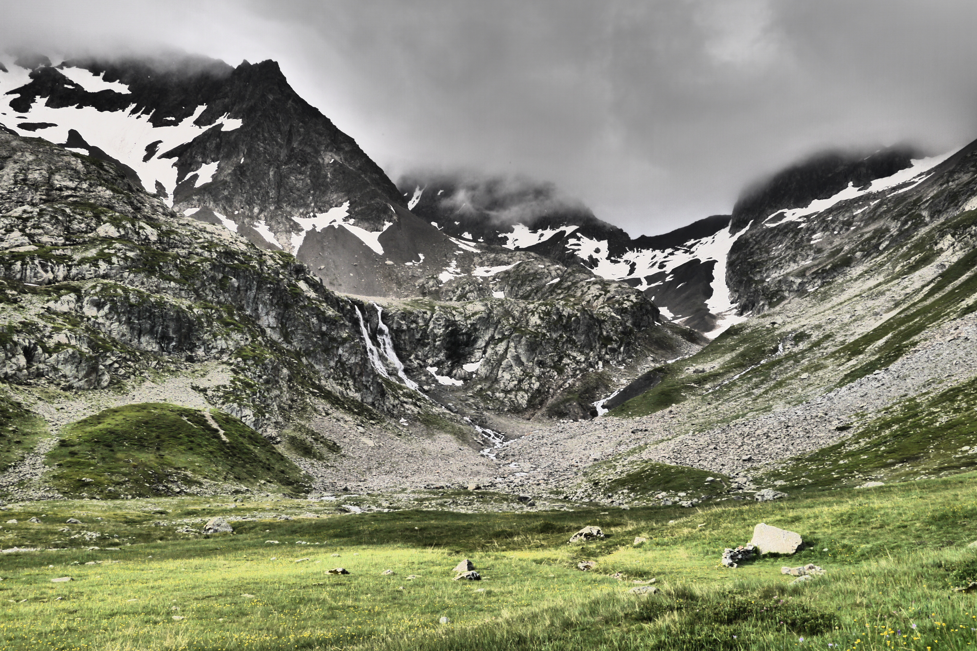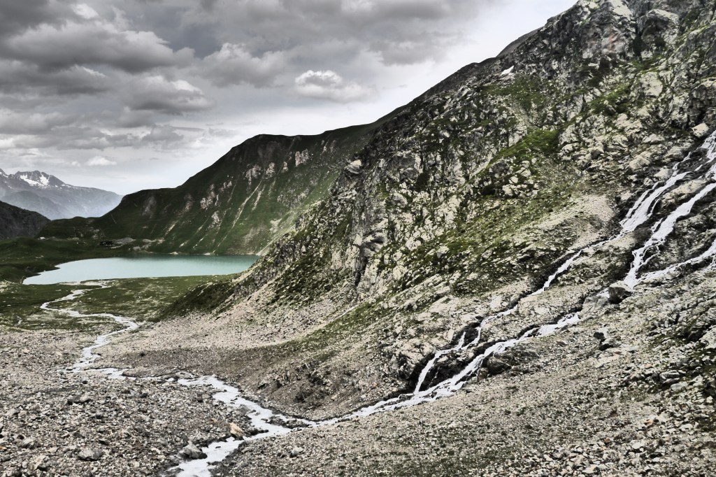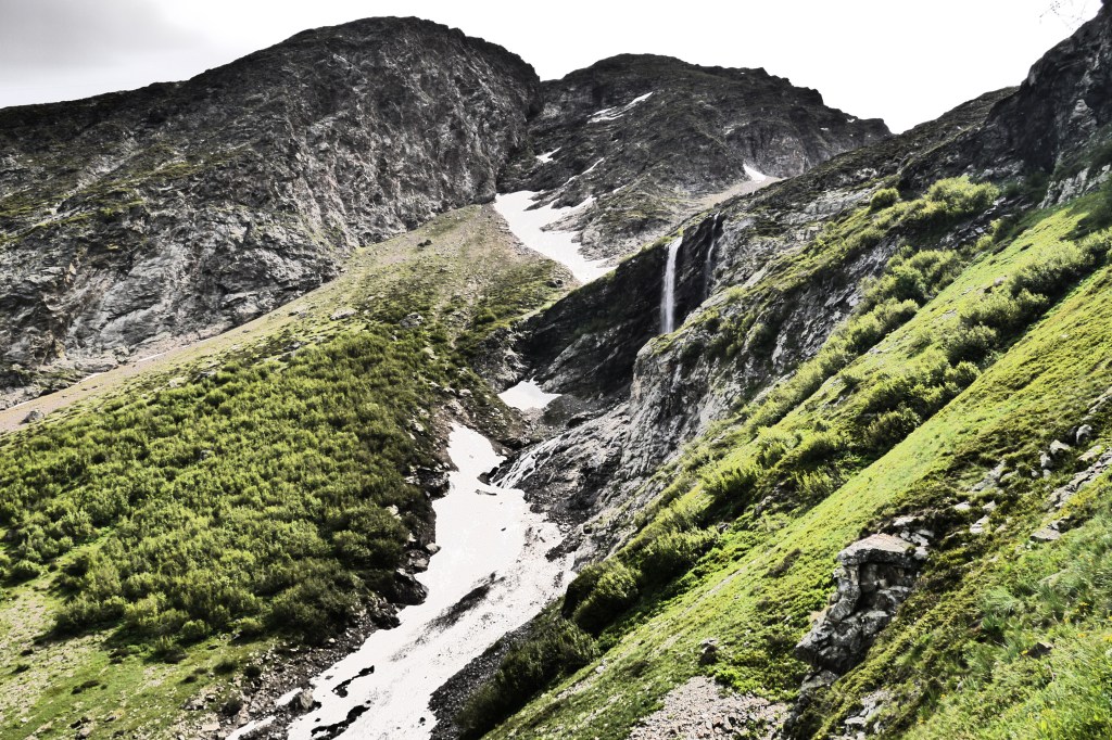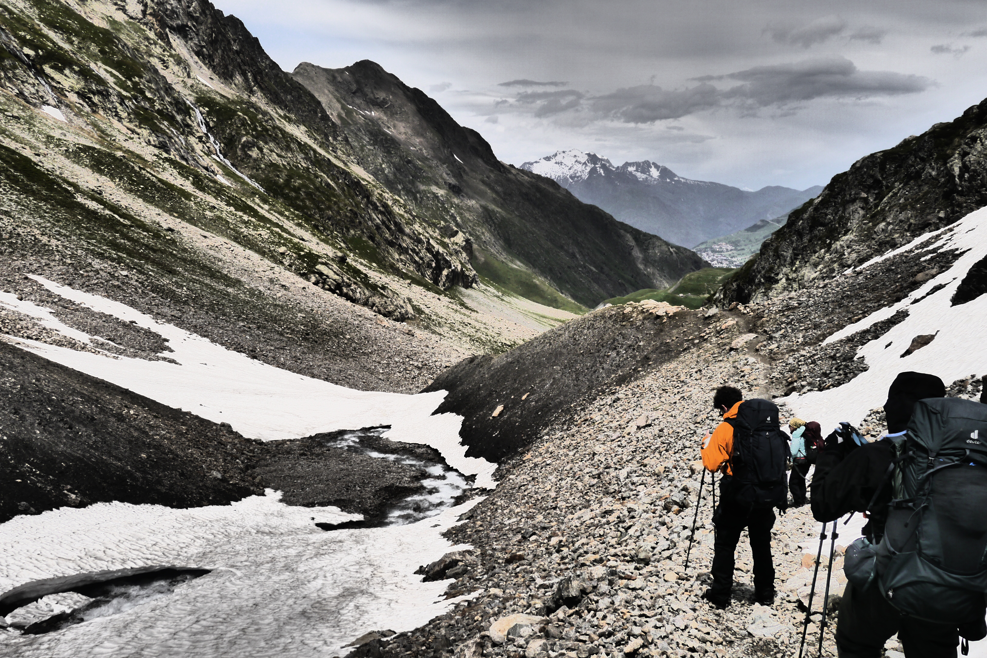 Als de wolken overkomen besluiten we dat het tijd is om te vertrekken. Joris vindt dat niet erg want hij heeft het echt koud. We dalen, na het aandoen van een regenbroek of lange broek, af in een spoor dat ik nog even maak in de sneeuw. Al snel krijg ik het warm. We vlotten goed maar plots maakt Astrid een val, gelukkig redt ze het makkelijk. Ze is enkel op haar poep gevallen en glijdt gelukkig niet verder. We dalen nu over een zachtere glooiing en pikken het pad op de morenen op. We geraken maar moeilijk over het naar beneden gutsende smeltwater en besluiten de weg van de minste weerstand te nemen in de afdaling. We verdoen heel wat tijd maar dat is nu zo erg niet want de zon komt erdoor. We dalen en dalen om dan uiteindelijk toch te moeten oversteken. Ik leg wat grotere stenen in de rivier om de oversteek te vergemakkelijken. We bevinden ons nog steeds aan de verkeerde kant want de rivier die we oversteken komt van een nieuwe waterval aan onze rechterzijde. We dalen tot op de grasweide aan het meer van Muzelle. We steken de rivier over en sommigen geven er niet meer om om natte voeten te hebben. We stappen vlijtig naar de Refuge de la Muzelle.