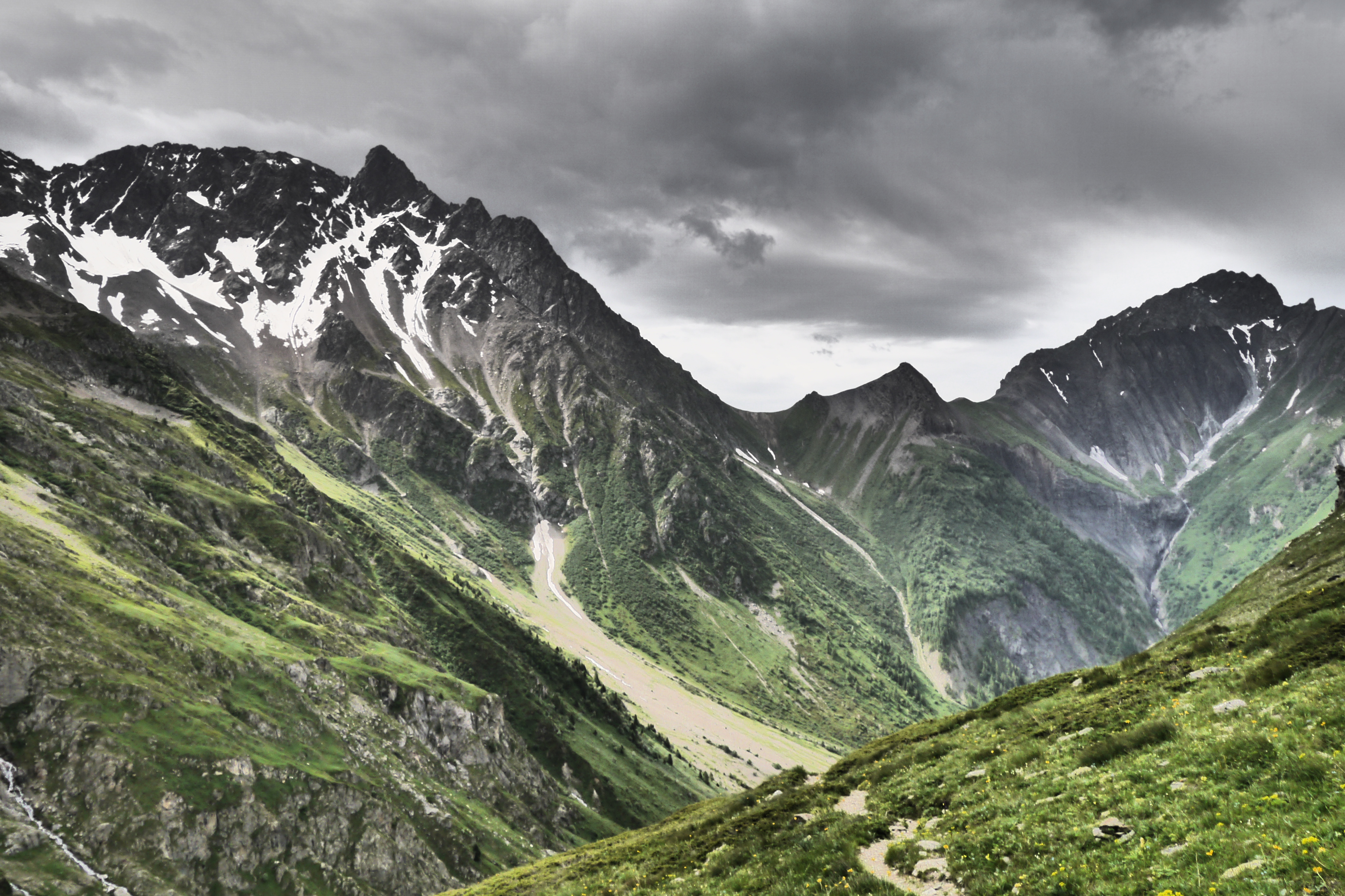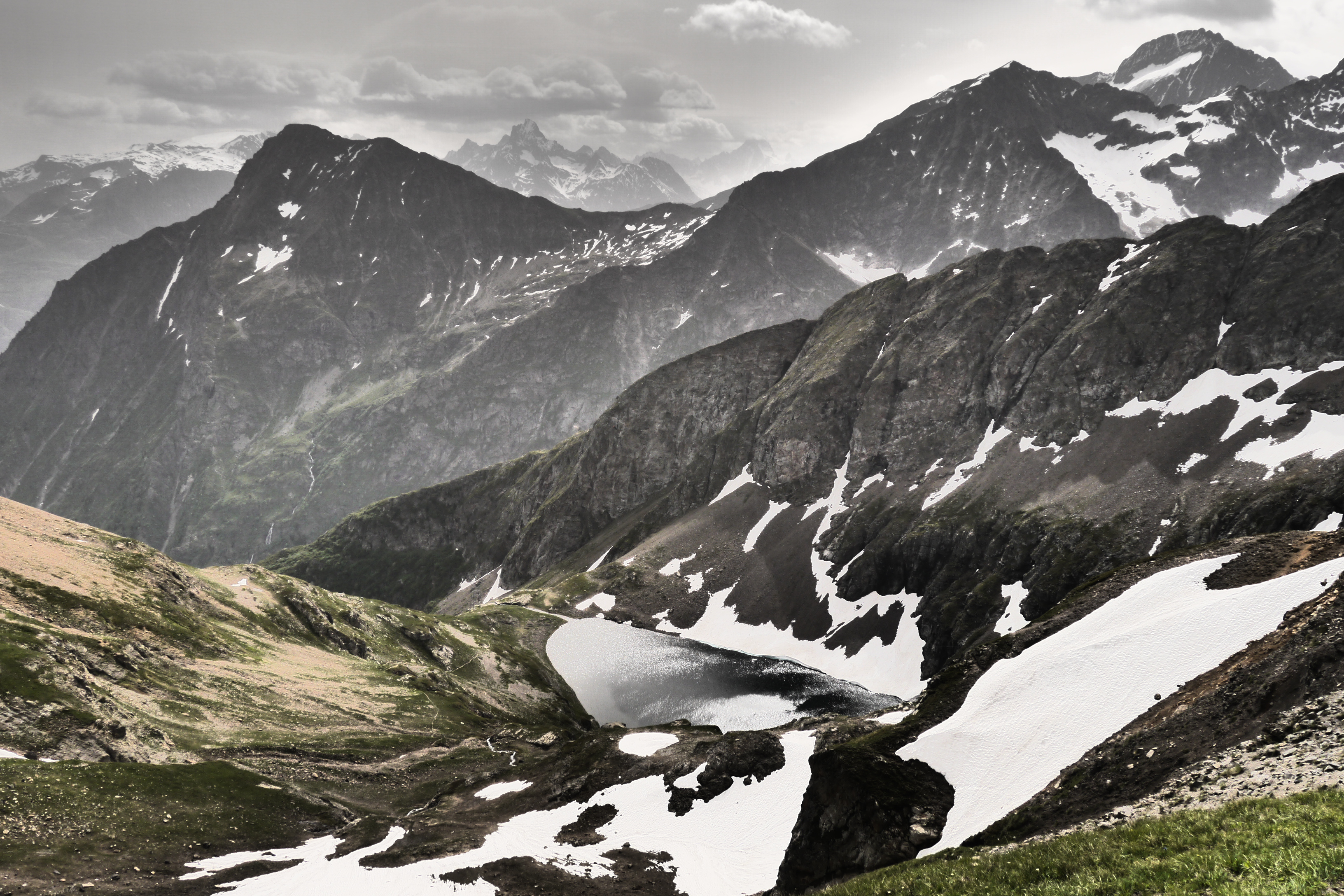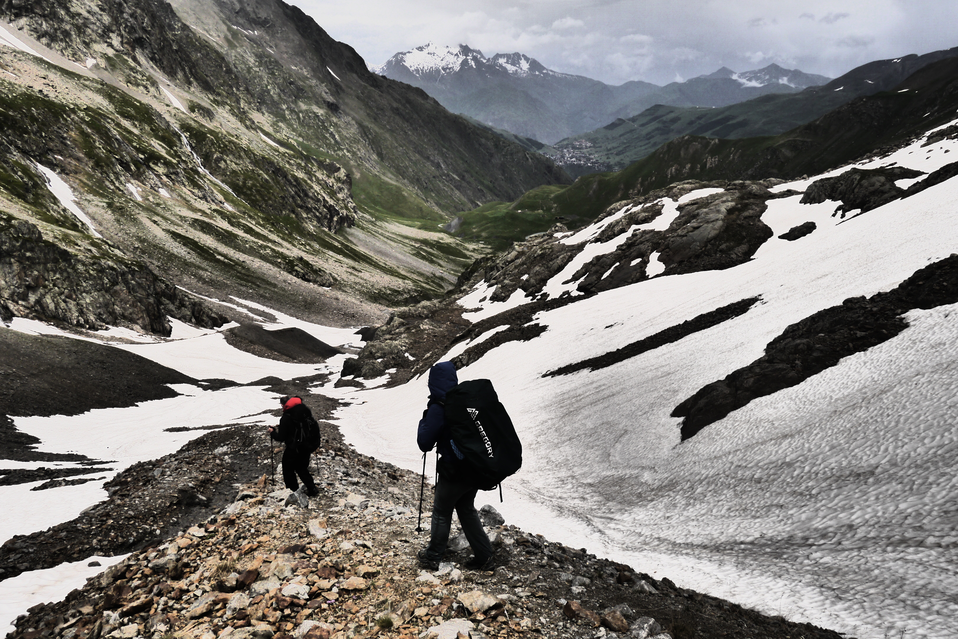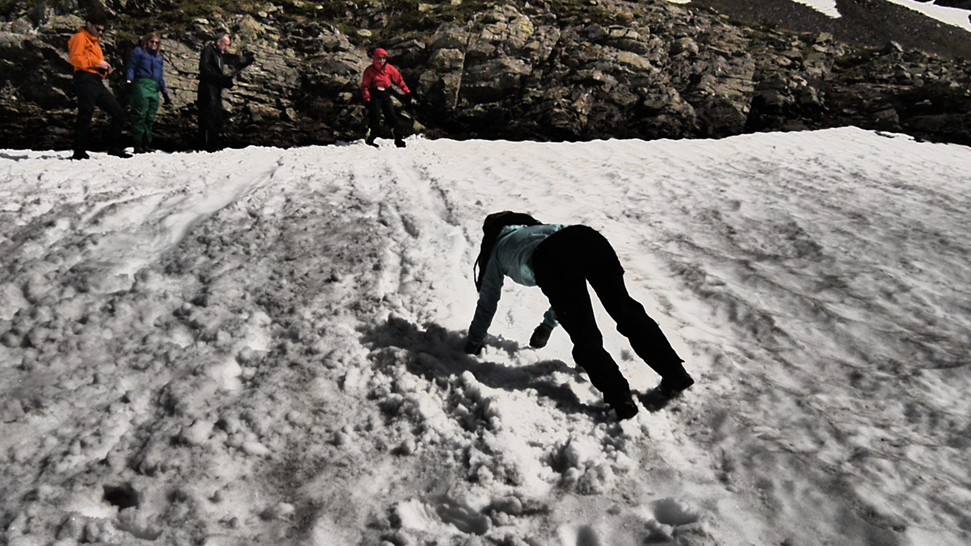 Als de wolken overkomen besluiten we dat het tijd is om te vertrekken. Joris vindt dat niet erg want hij heeft het echt koud. We dalen, na het aandoen van een regenbroek of lange broek, af in een spoor dat ik nog even maak in de sneeuw. Al snel krijg ik het warm. We vlotten goed maar plots maakt Astrid een val, gelukkig redt ze het makkelijk. Ze is enkel op haar poep gevallen en glijdt gelukkig niet verder. We dalen nu over een zachtere glooiing en pikken het pad op de morenen op. We geraken maar moeilijk over het naar beneden gutsende smeltwater en besluiten de weg van de minste weerstand te nemen in de afdaling. We verdoen heel wat tijd maar dat is nu zo erg niet want de zon komt erdoor. We dalen en dalen om dan uiteindelijk toch te moeten oversteken. Ik leg wat grotere stenen in de rivier om de oversteek te vergemakkelijken. We bevinden ons nog steeds aan de verkeerde kant want de rivier die we oversteken komt van een nieuwe waterval aan onze rechterzijde. We dalen tot op de grasweide aan het meer van Muzelle. We steken de rivier over en sommigen geven er niet meer om om natte voeten te hebben. We stappen vlijtig naar de Refuge de la Muzelle.