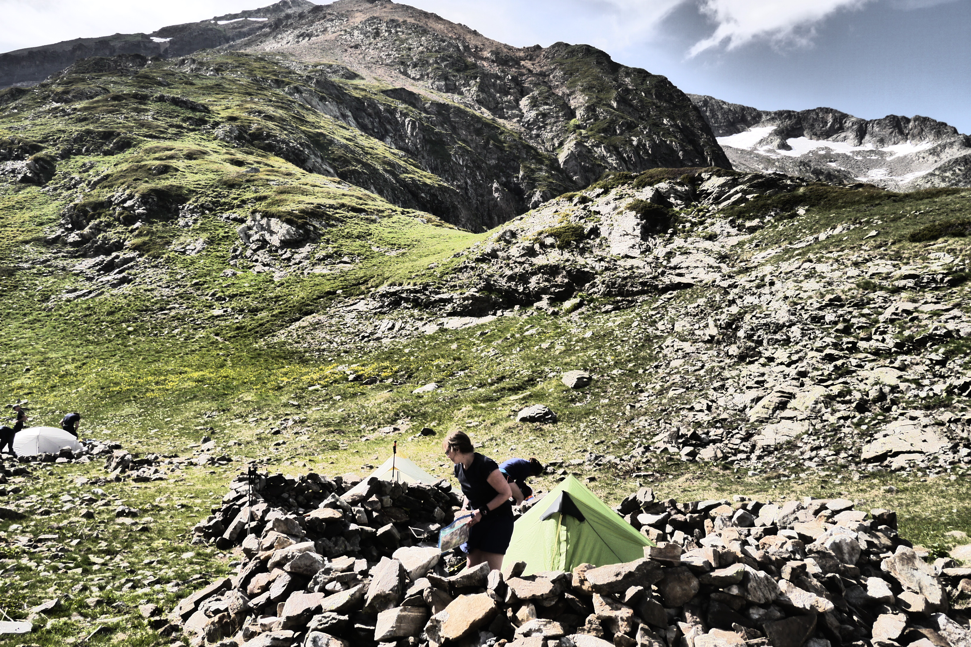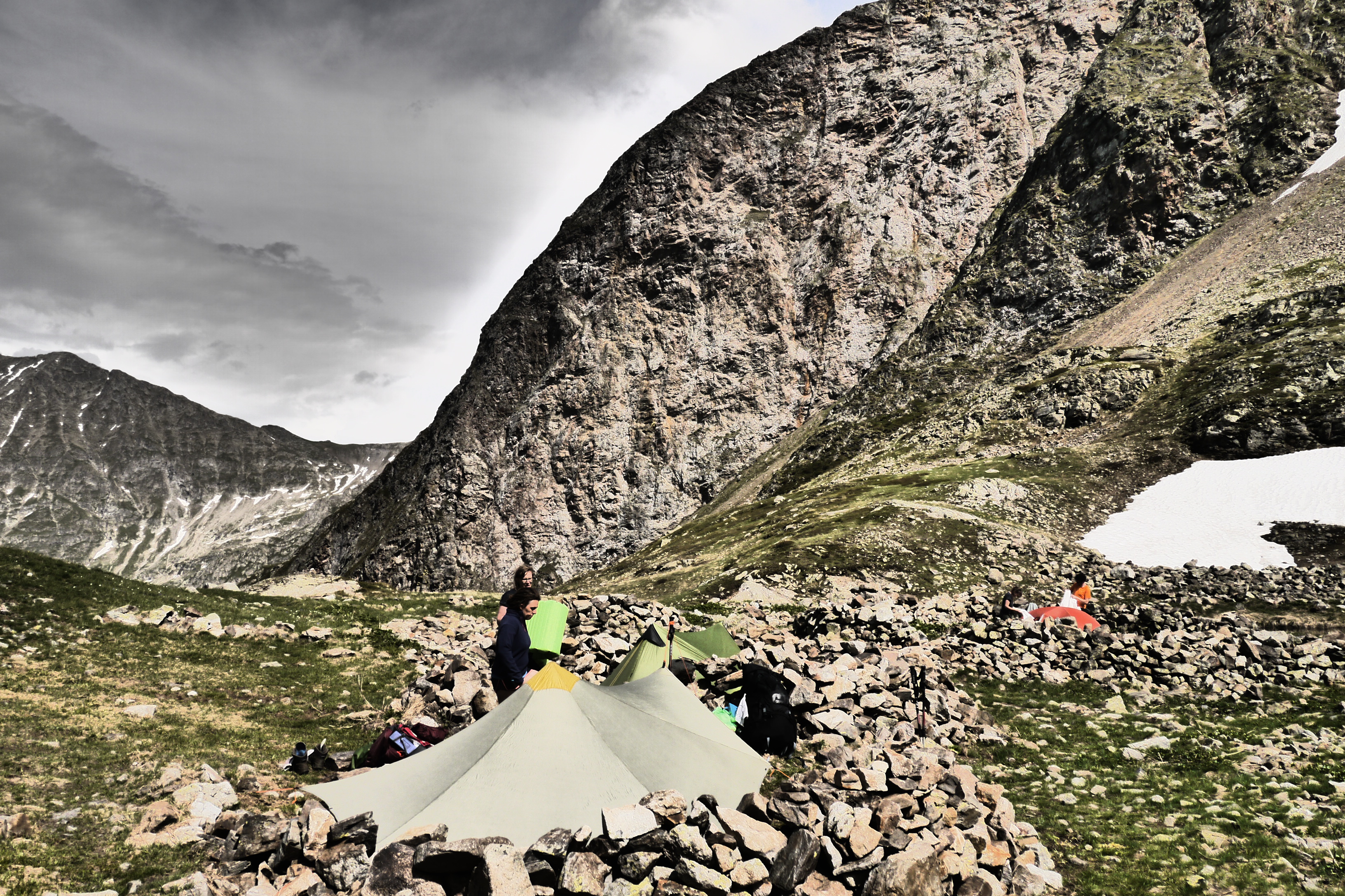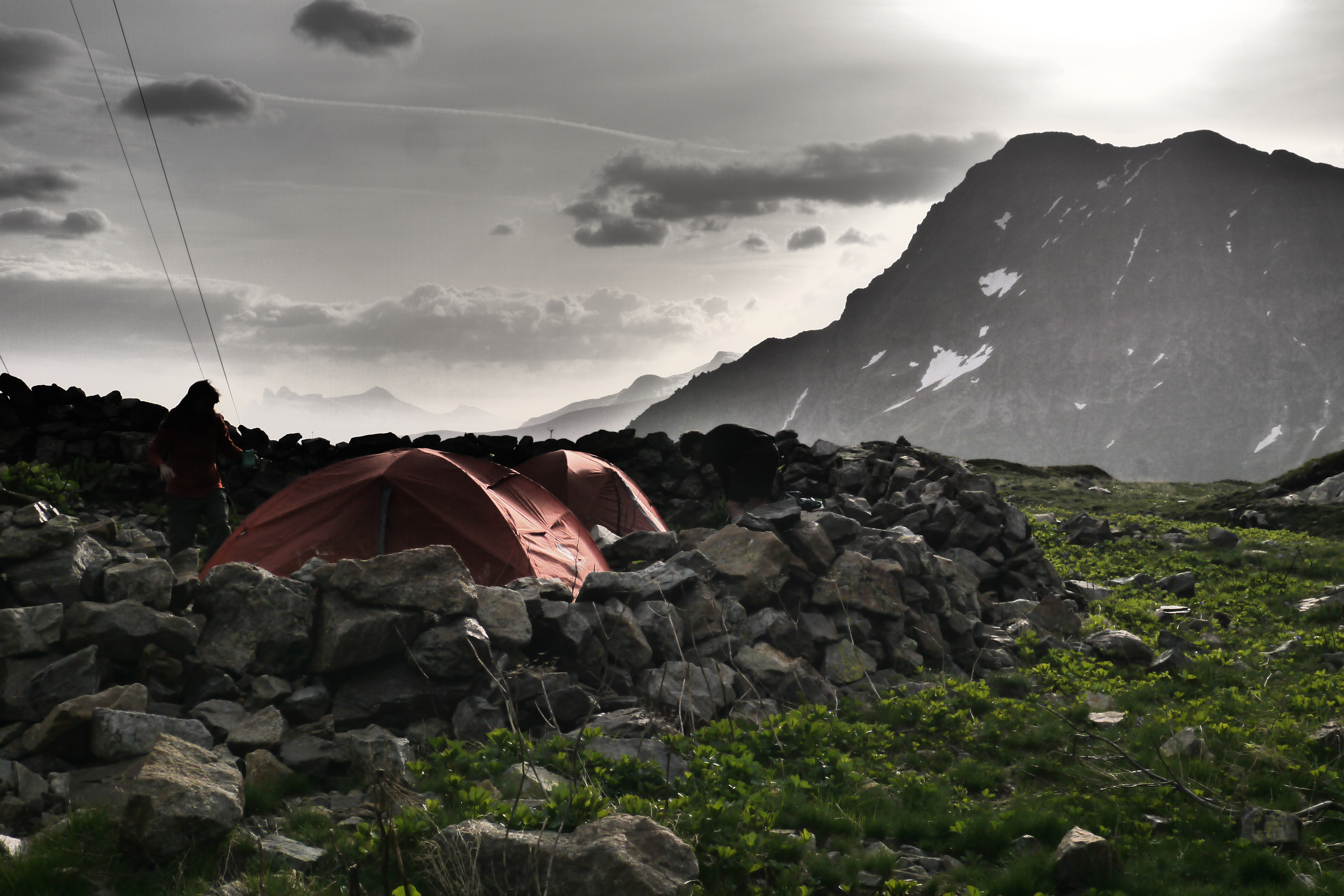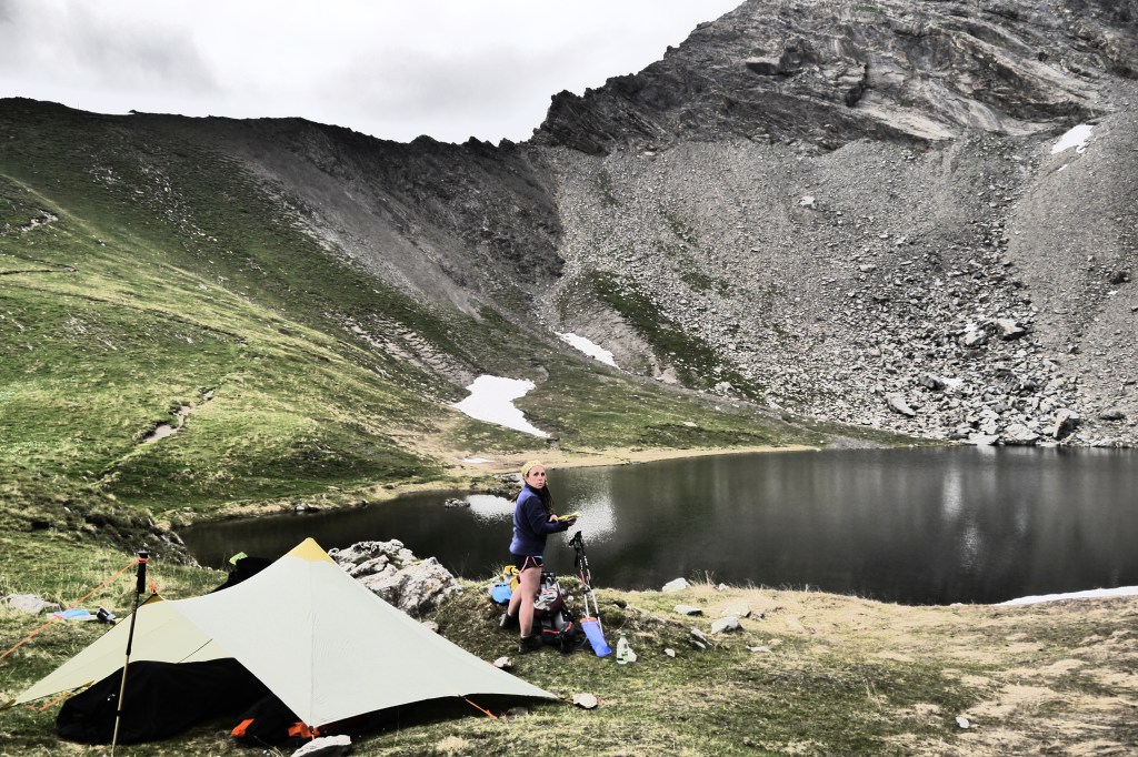 We zetten de bivak op en verfrissen ons aan de beek. We eten wat en genieten van de marmotten die her en der op de flanken ravotten. Na het filteren of koken van drinkwater trekken we nog even naar de col voor de zonsondergang. Het is een beetje een anticlimax want de wolken verstoren een prachtige zonsondergang. Als we afgedaald zijn kruipen we na een pittige dag onder de wol.