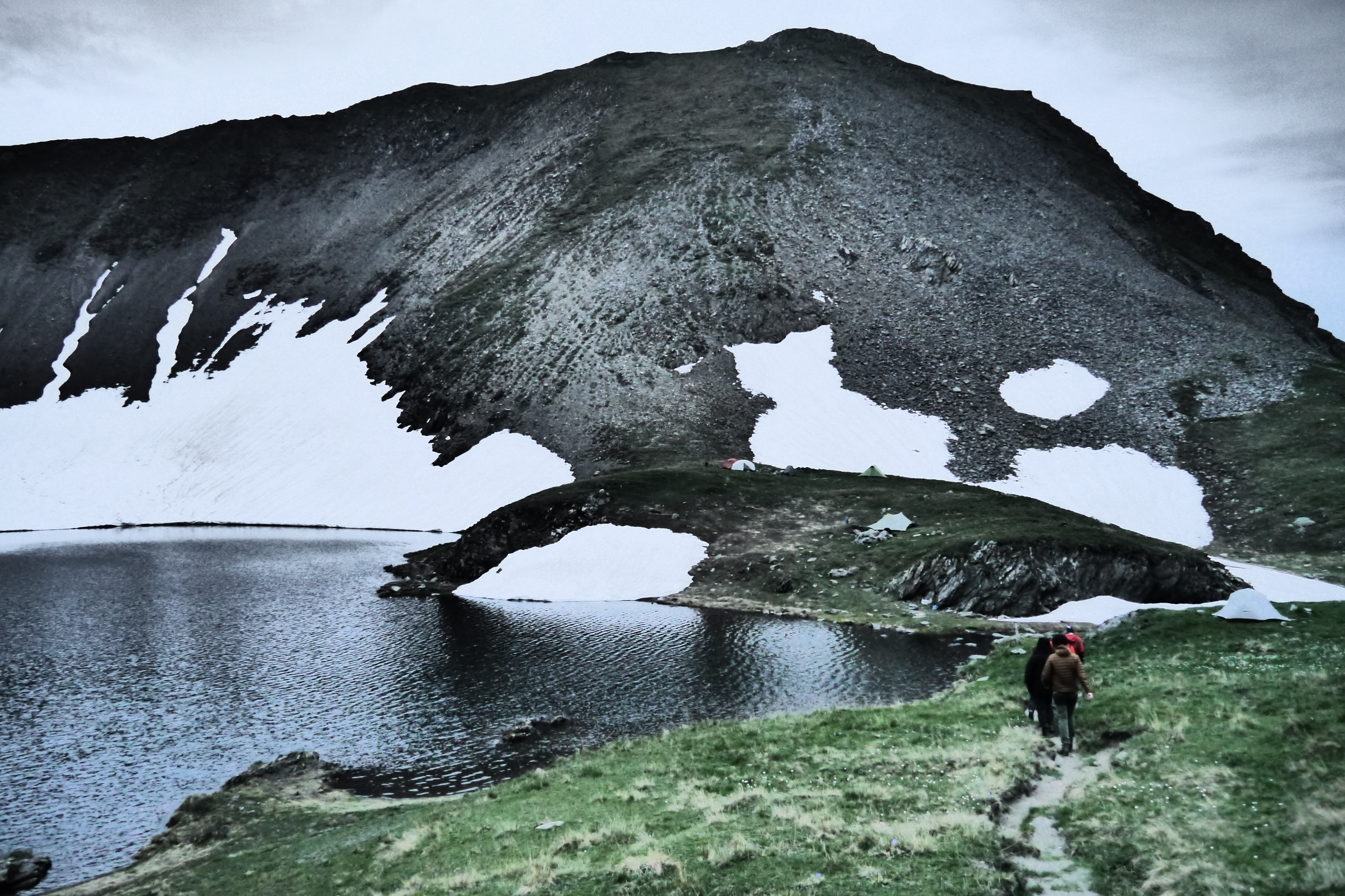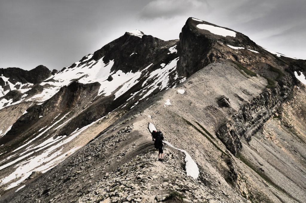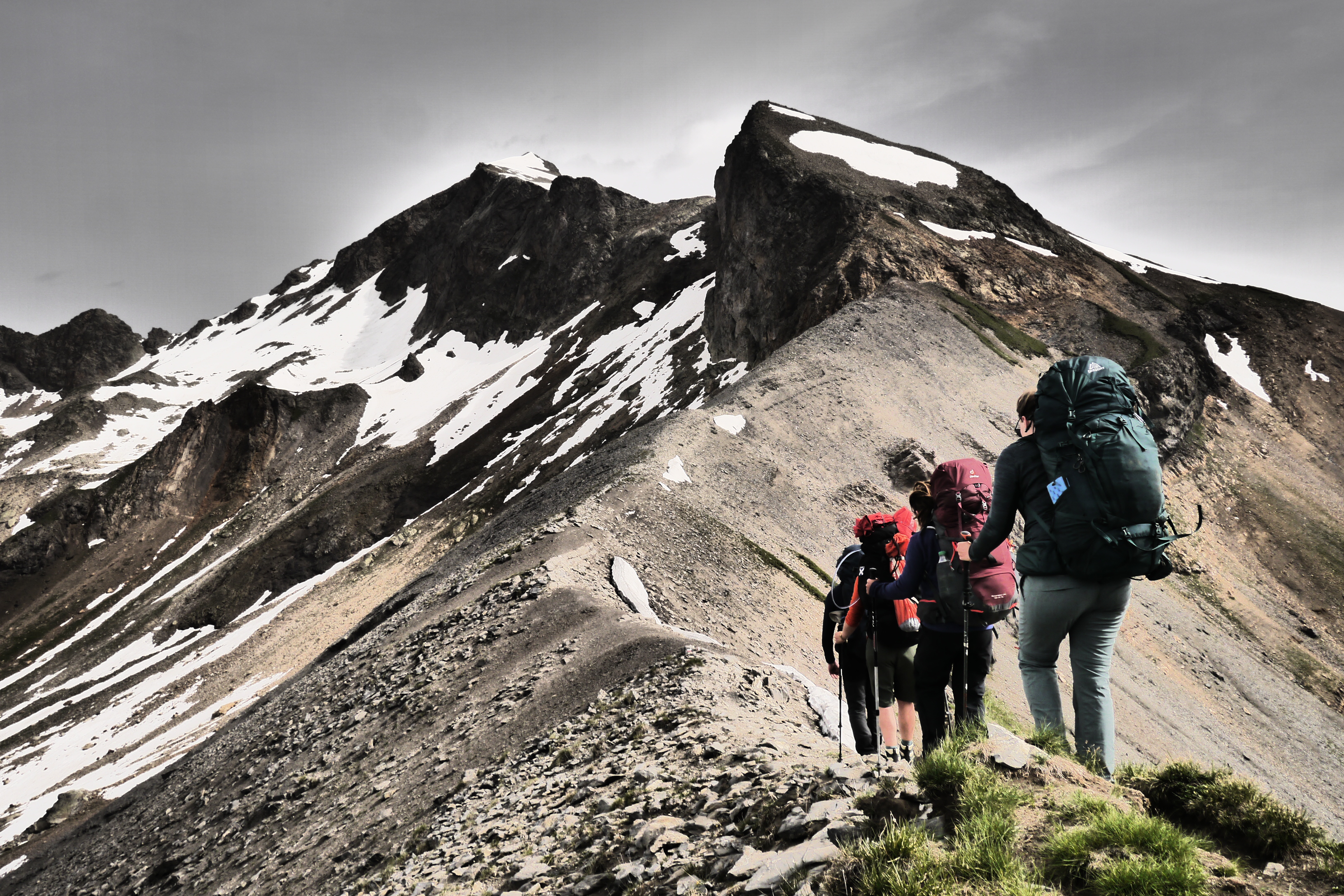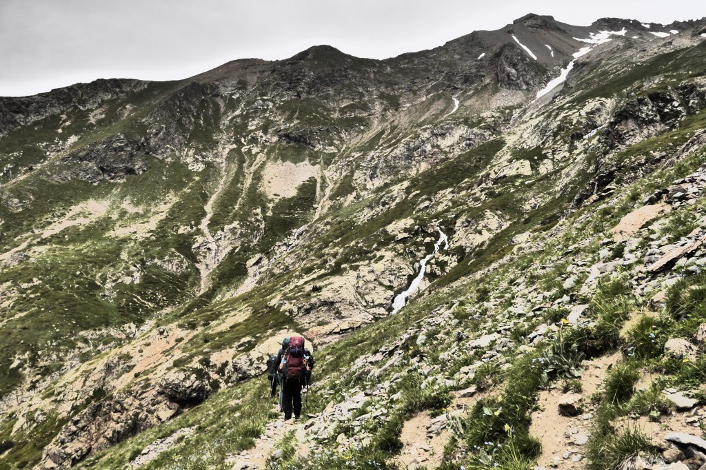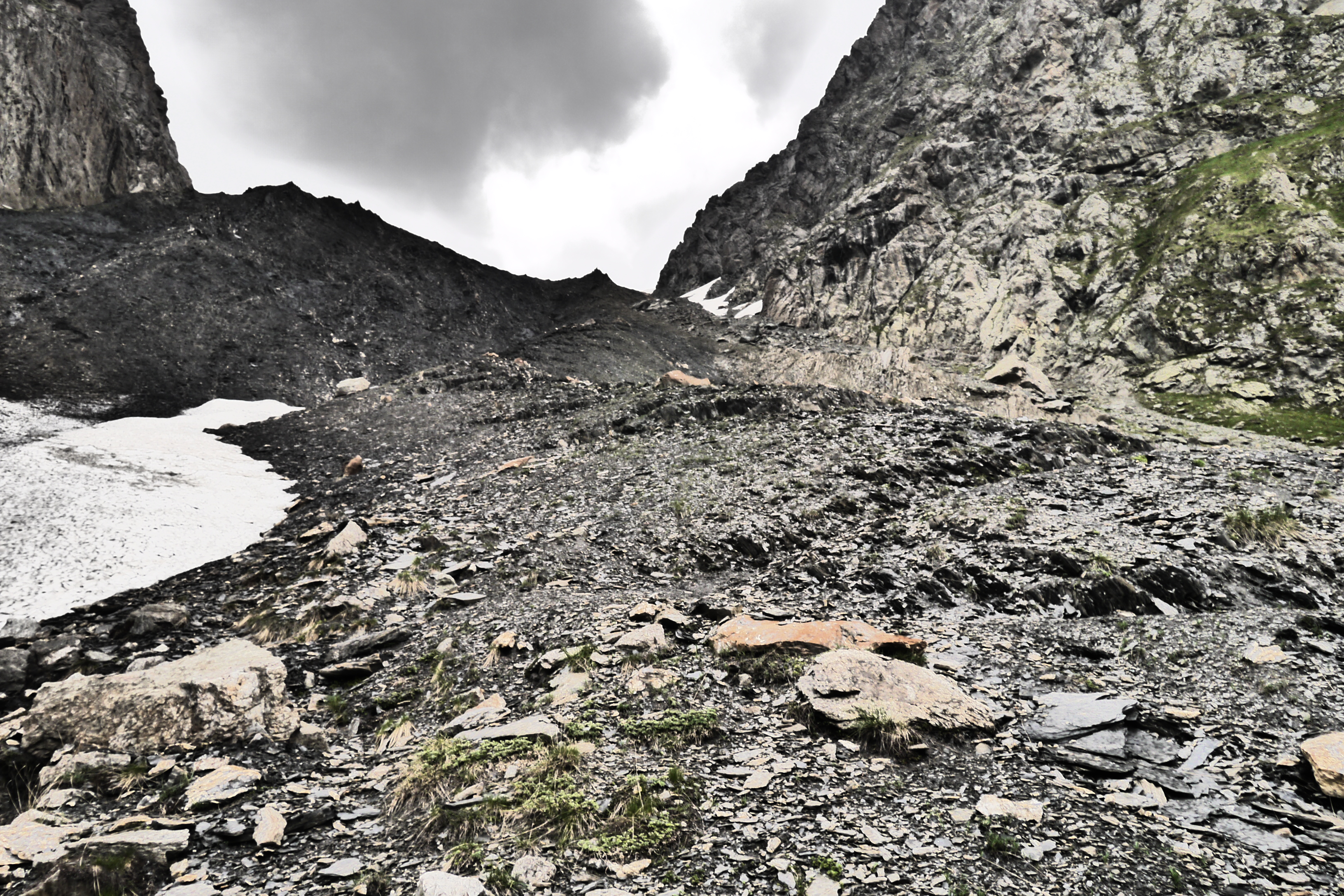 We zetten de bivak op en verfrissen ons aan de beek. We eten wat en genieten van de marmotten die her en der op de flanken ravotten. Na het filteren of koken van drinkwater trekken we nog even naar de col voor de zonsondergang. Het is een beetje een anticlimax want de wolken verstoren een prachtige zonsondergang. Als we afgedaald zijn kruipen we na een pittige dag onder de wol.