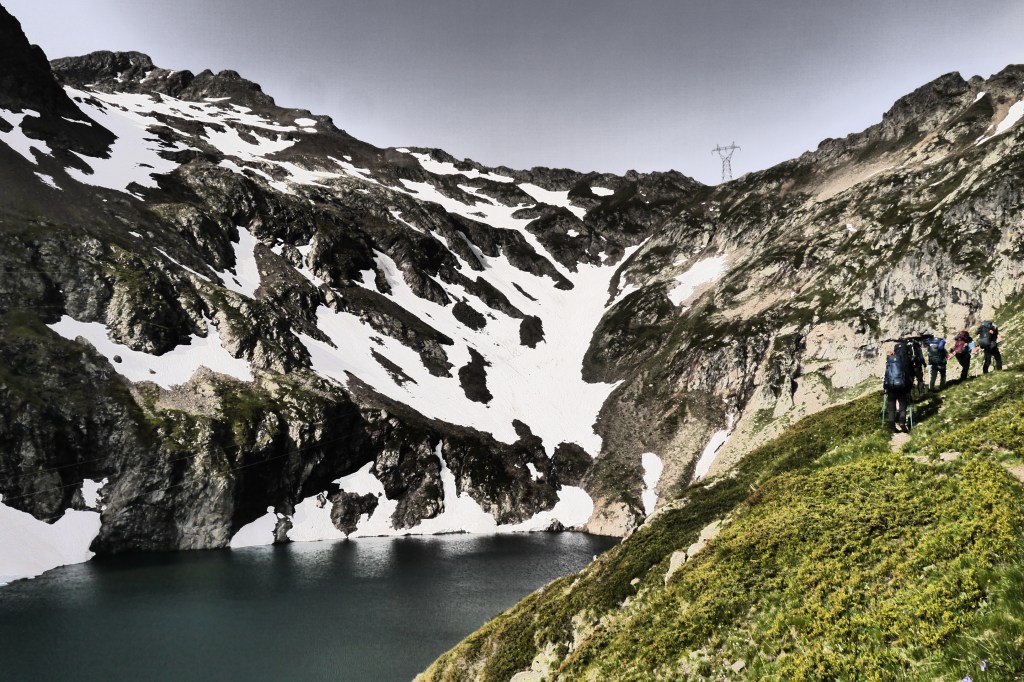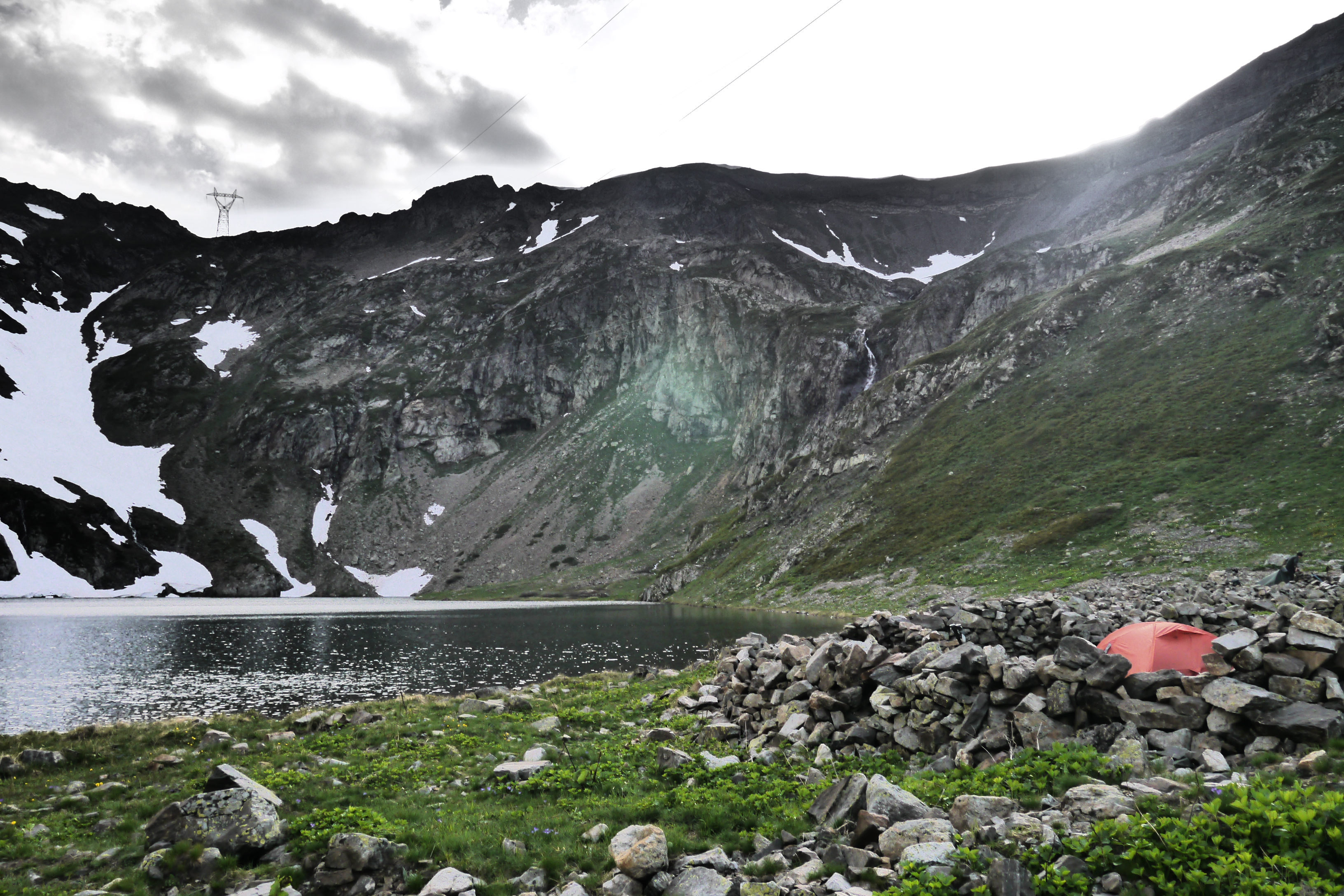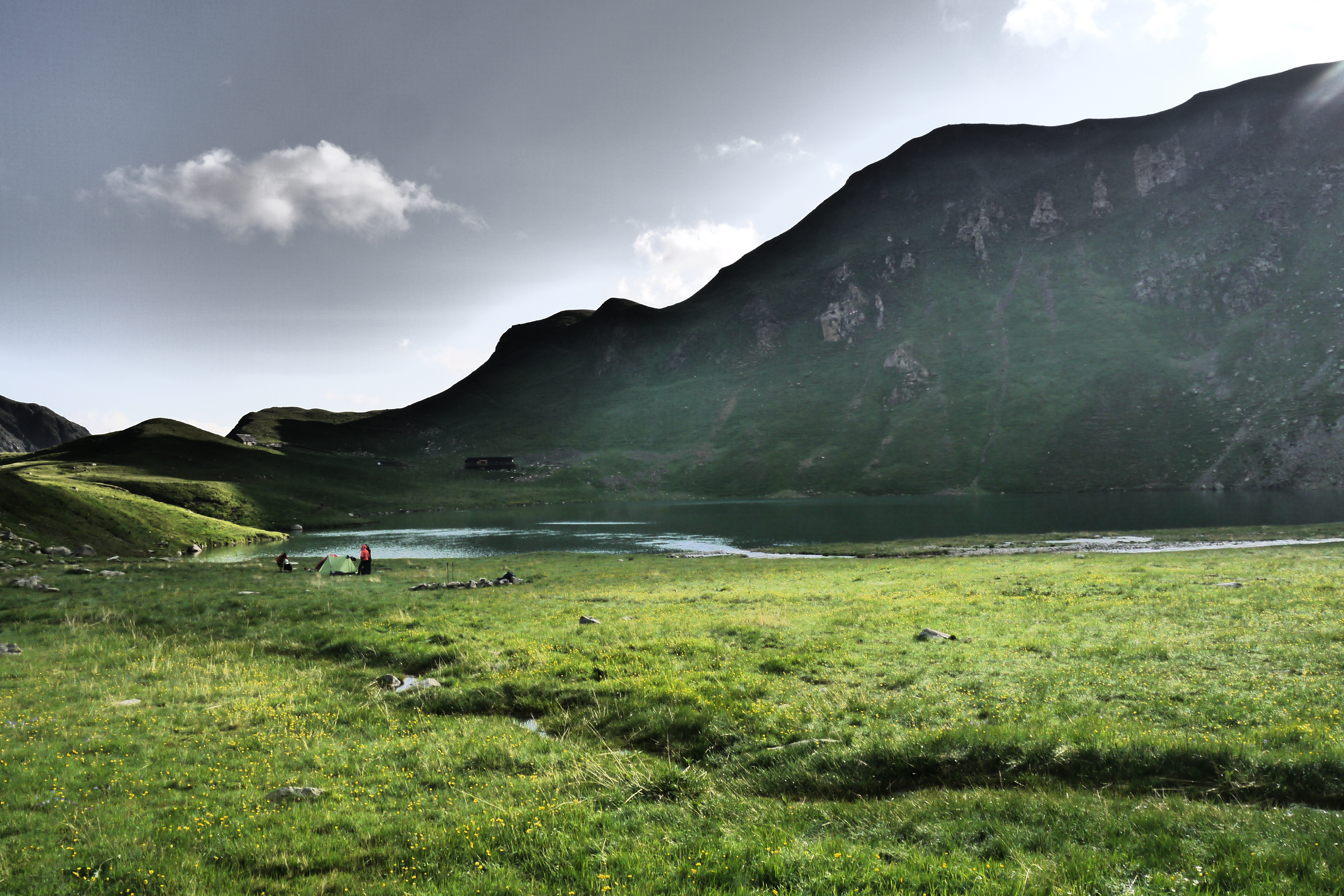 Terwijl we ons laven aan een cola, warme choco of biertje trekt het wolkendek weer toe. Na een zoveelste windvlaag en regenbui trekken we naar binnen. Na het regenweer besluiten we alsnog om niet in de hut te slapen en de tenten op te zetten. Zo gezegd zo gedaan. Maak ik toch geen rookie mistake zeker: we zetten onze tarp te dicht bij de oever van het meer. Als we onder de tarp zitten barst een hevige bui en bijhorend onweer los. Niet veel later loopt er een stroompje onder de tarp door. Shit, verzetten dus. Eva laat het niet aan haar hart komen en is super behulpzaam. Kristof is ook zo vriendelijk om in de regen te helpen om enkele zaken te verkassen naar een “droger” plekje. Onze tarp staat nu prima. We installeren wat materiaal en haasten ons naar de hut want om 19u wordt onze maaltijd geserveerd. Ik kom als laatste – zeiknat – toe en nog geen 10min. later zitten we al aan de soep en een glaasje rood. De lokale economie steunen én wat bijleren aan de groep over hoe je je gedraagt ten aanzien van de wirtenploeg. Het is voor sommigen de eerste keer in een berghut… We krijgen veel te eten en sluiten af met een dessertje en nog een laatste drankje. Tegen 21u15 besluiten we om toch maar naar de tent te gaan. Het onweer is gepasseerd en de rest van de nacht verloopt rustig. We dromen van onze laatste dag…
