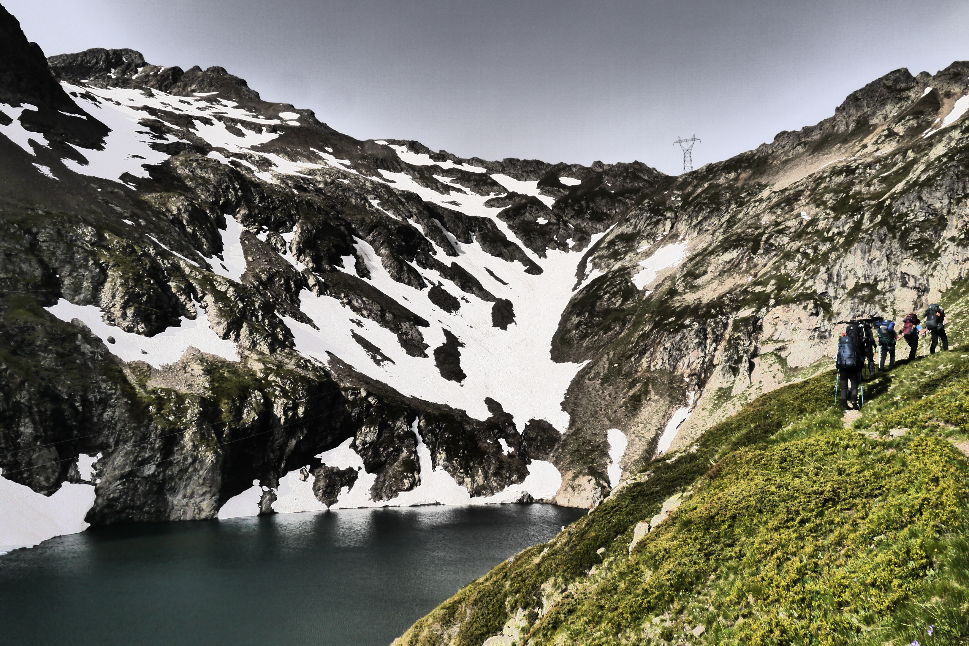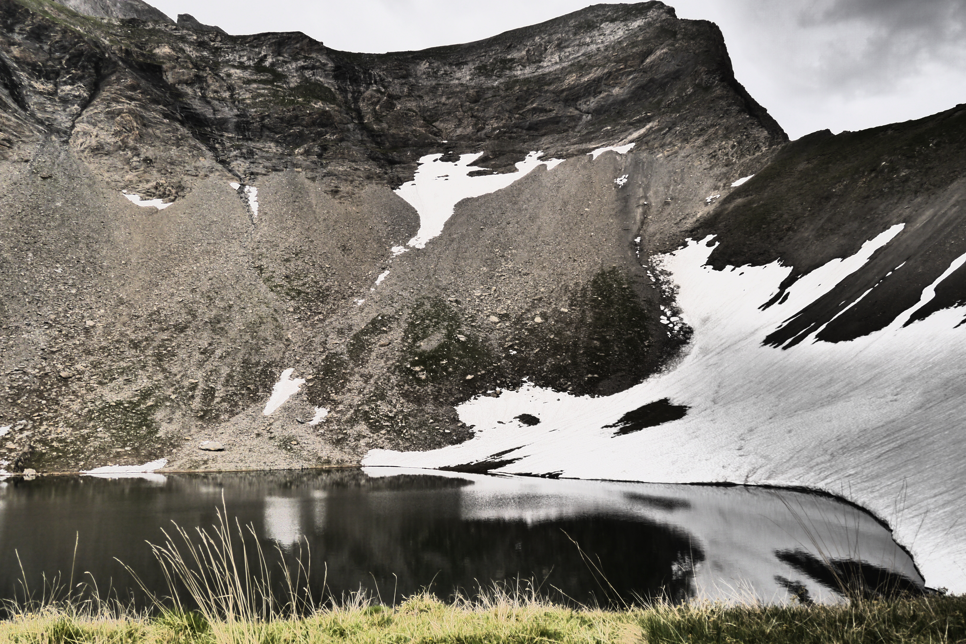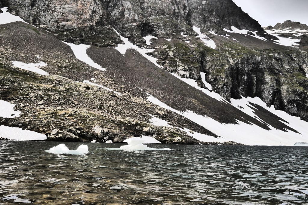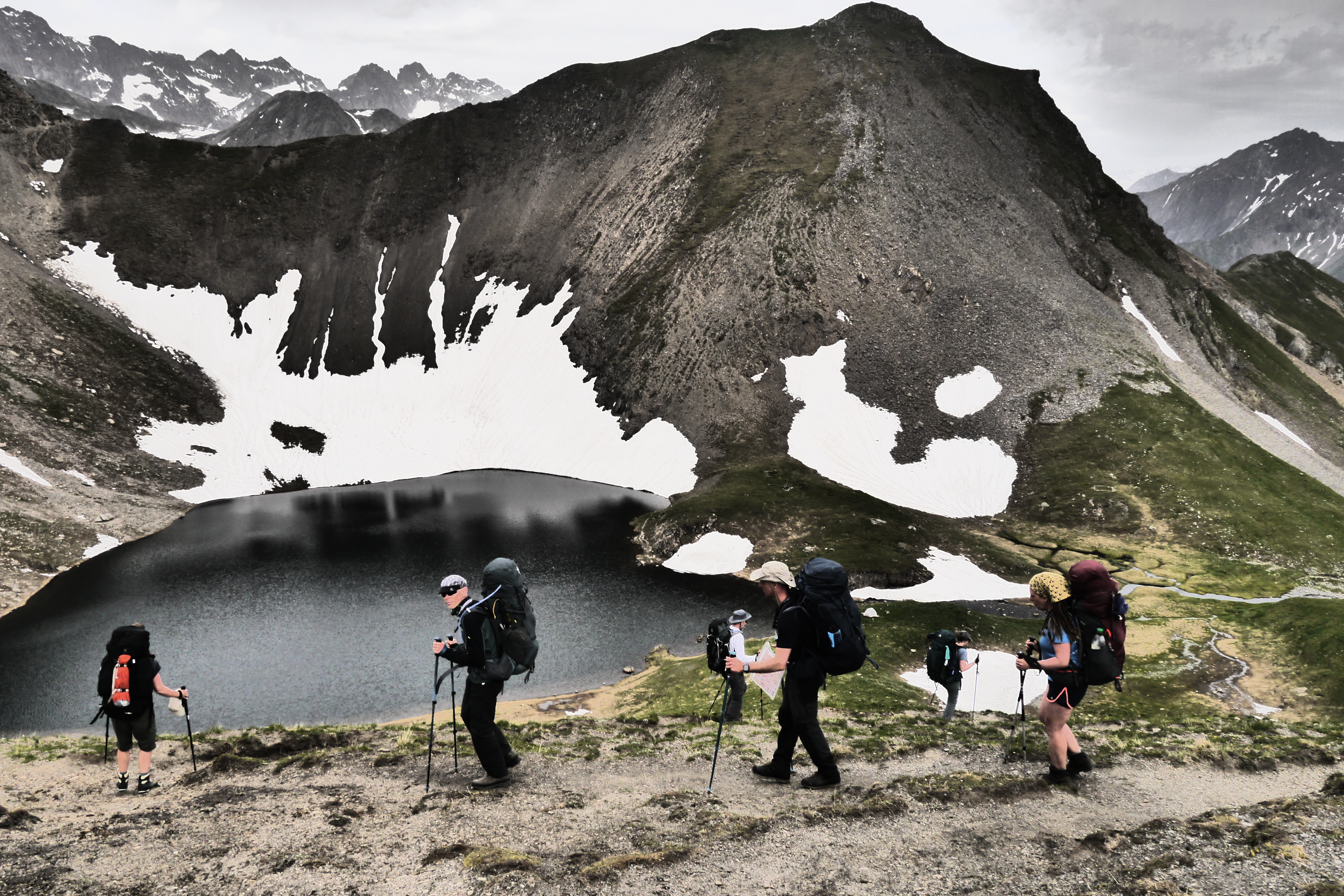 Ter hoogte van Lac Sec (1950m) pauzeren we uitgebreid. We steken de voetjes in het water om af te koelen, oriënteren met ons kompas en gaan na hoe moeilijk het kan zijn om op een Azimut (ingestelde kompasrichting) te lopen. We stijgen geleidelijk aan en komen dan aan de eerste sneeuwvelden. De flank ligt er gehavend bij en het pad is brokkelig. We stijgen terwijl de wind toeneemt. Het is aangenamer dan die hitte maar soms ook zelfs wat kil. We zigzaggen en plots staan we tevreden boven onze bivakplek aan Lac Plan Vianney (2260m). We installeren onze tentjes, tarptent en tarp. Als we klaar zijn breekt de zon door. Een sneeuwveld aan de overkant van de rivier ziet er verleidelijk uit om een valoefening in de sneeuw te organiseren. Met de besneeuwde col boven ons is er weinig overtuiging nodig om iedereen deel te laten nemen aan de valoefeningen om te leren remmen bij een val op een sneeuwflank. Het is verfrissend terwijl de zon verder brandt. Na de oefening gaan we wat koken en eten.