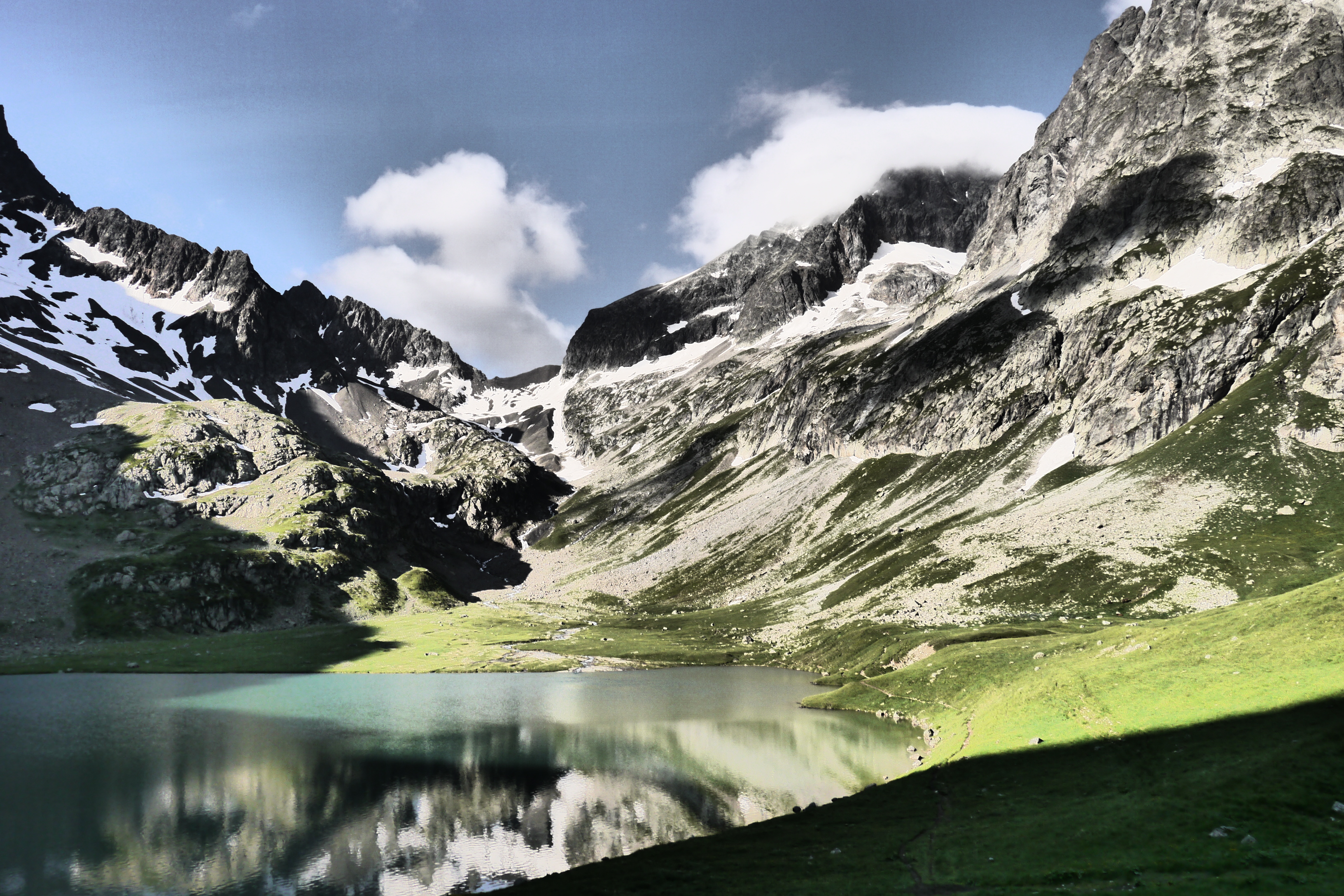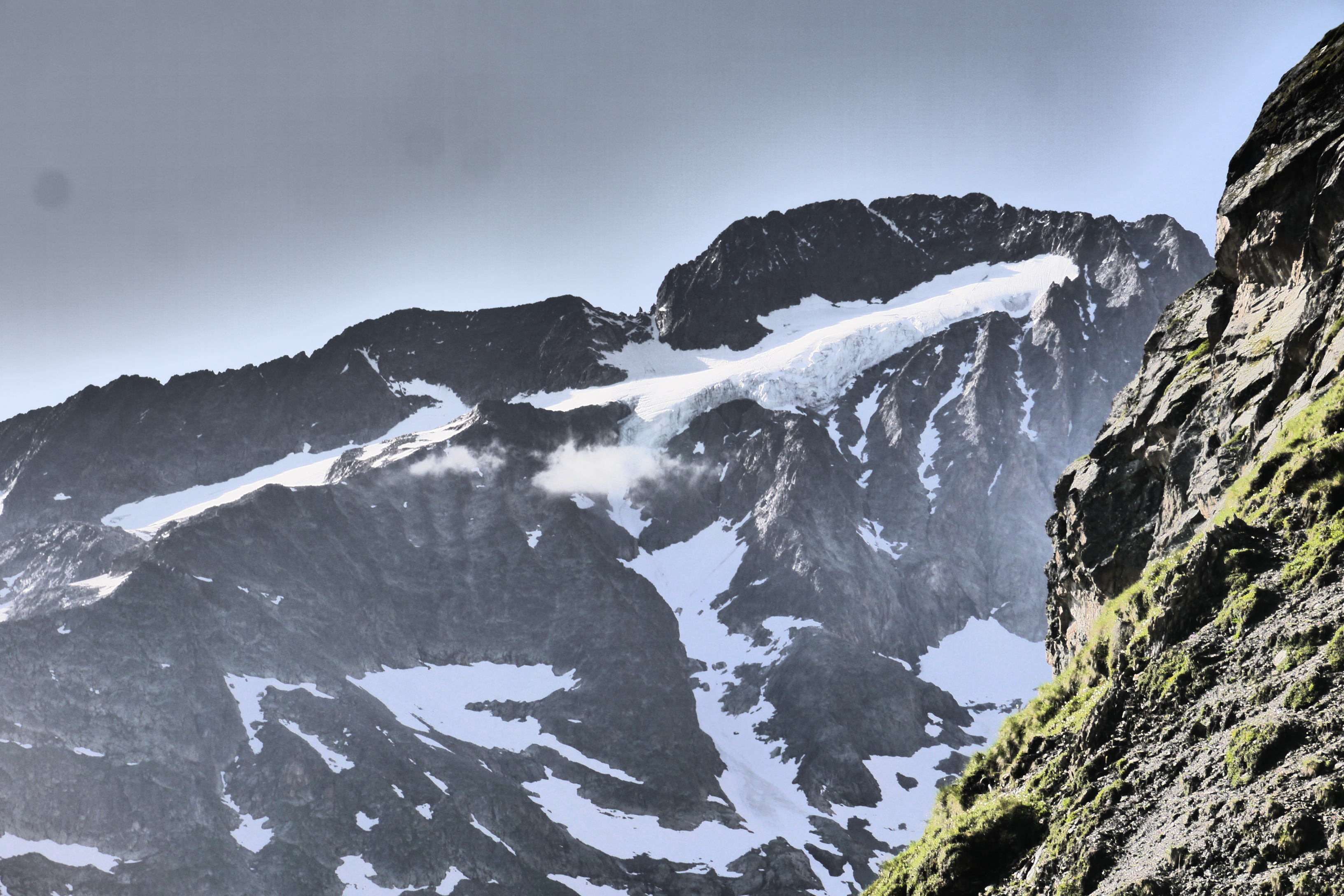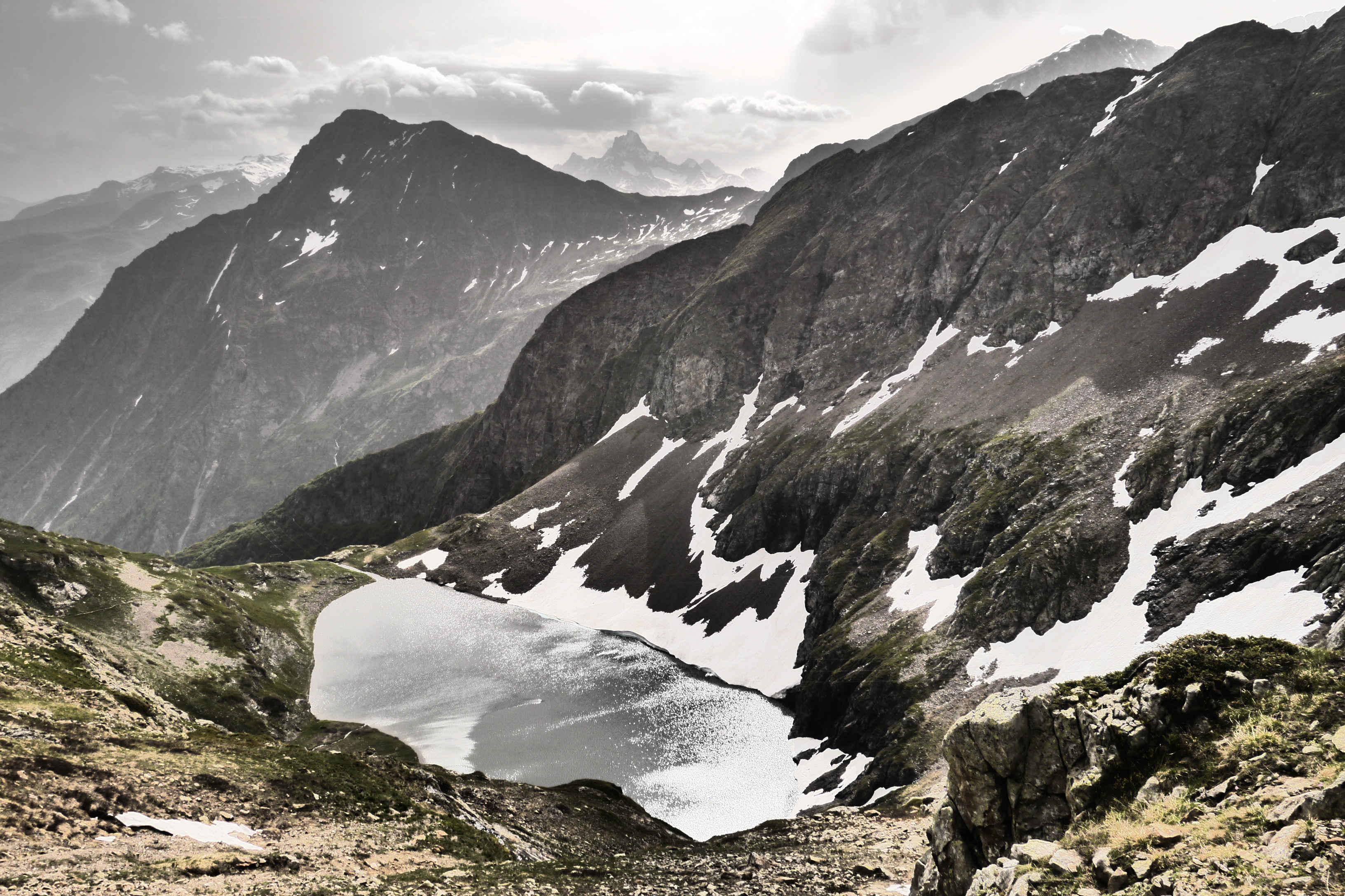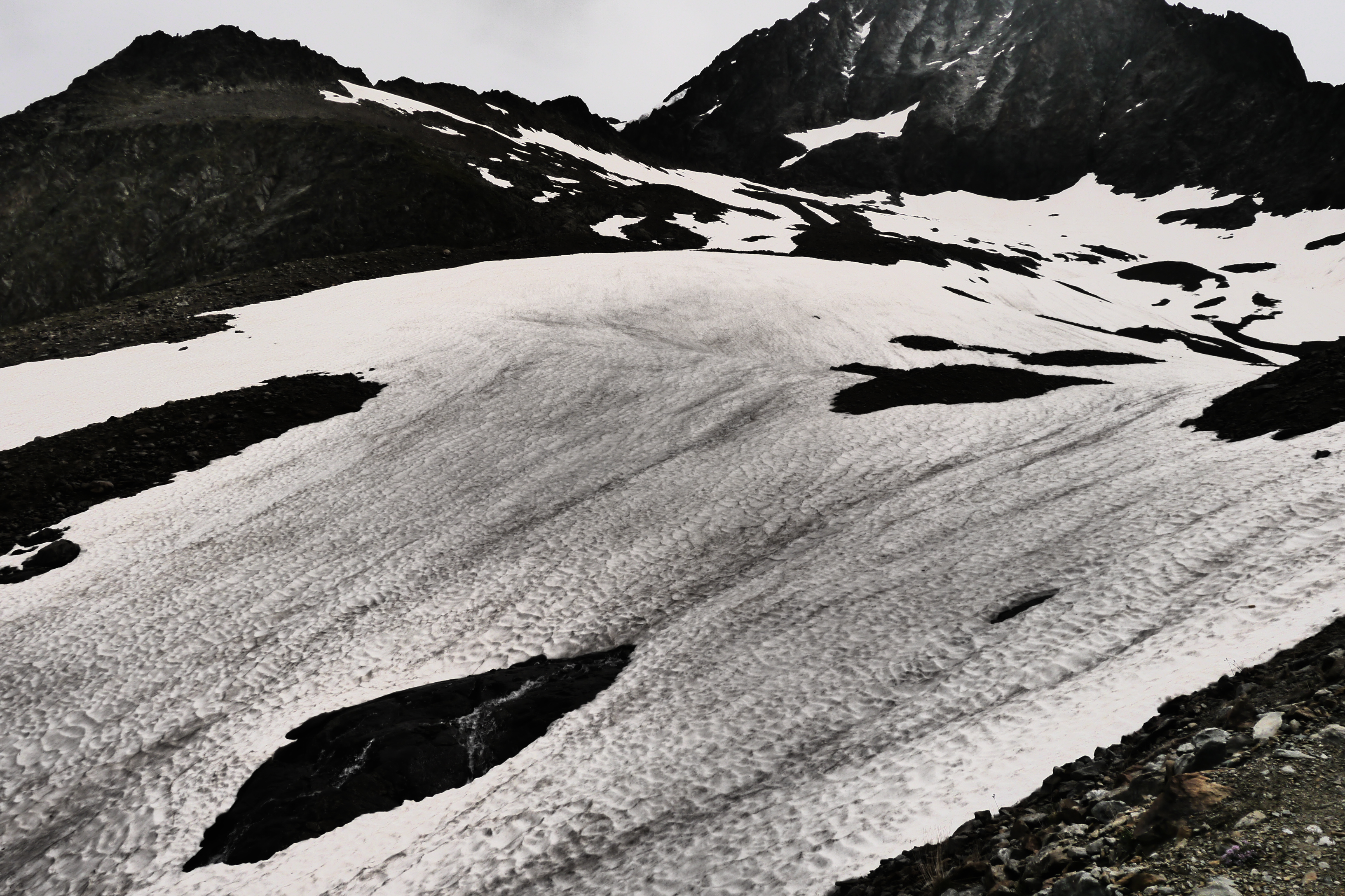 Her en der zijn er sneeuwpassages. Deze zullen afsmelten gedurende de zomer. Aan de col de la Muzelle zal dat zelden een probleem geven omdat door het smelten het pad eronder goed zichtbaar wordt. Op de passages van de kloven richting Lac Labarre zal het meer uitkijken zijn tot medio juli. De neeuwbruggen zullen fragieler worden en soms zal je van het pad af moeten gaan om vlot de passage te nemen. Een stukje touw kan je makkelijk helpen als je in groep of duo moet passeren. Ben je alleen dan is het een risicovolle gok en opletten geblazen. Wees bereid om terug te keren bij zware twijfel.