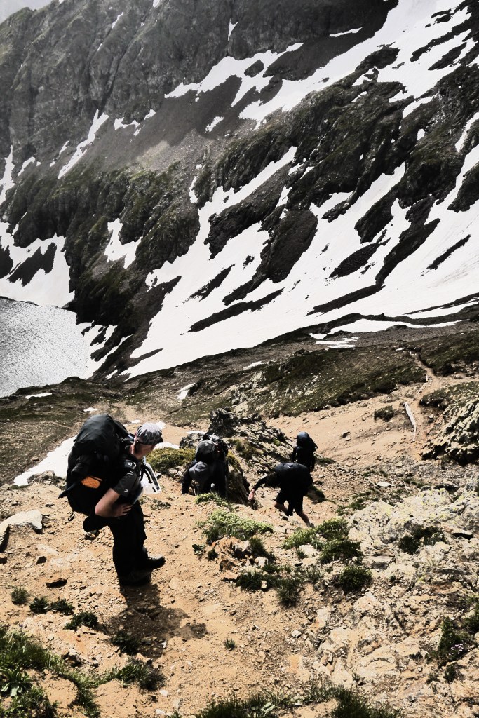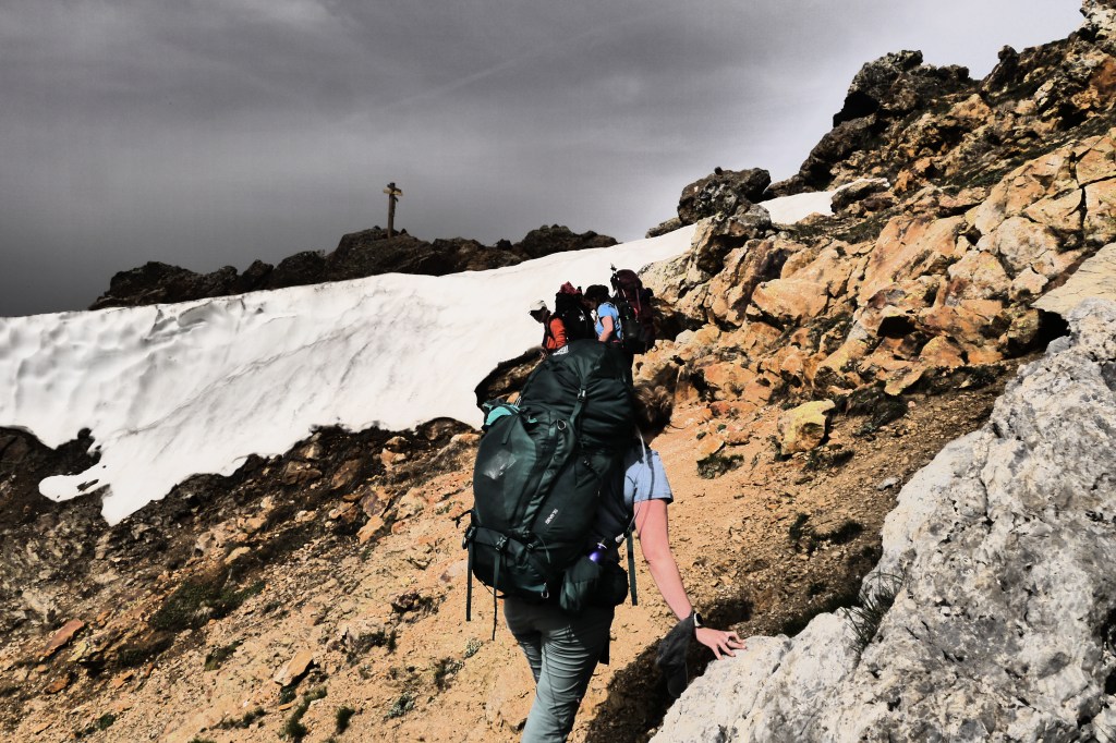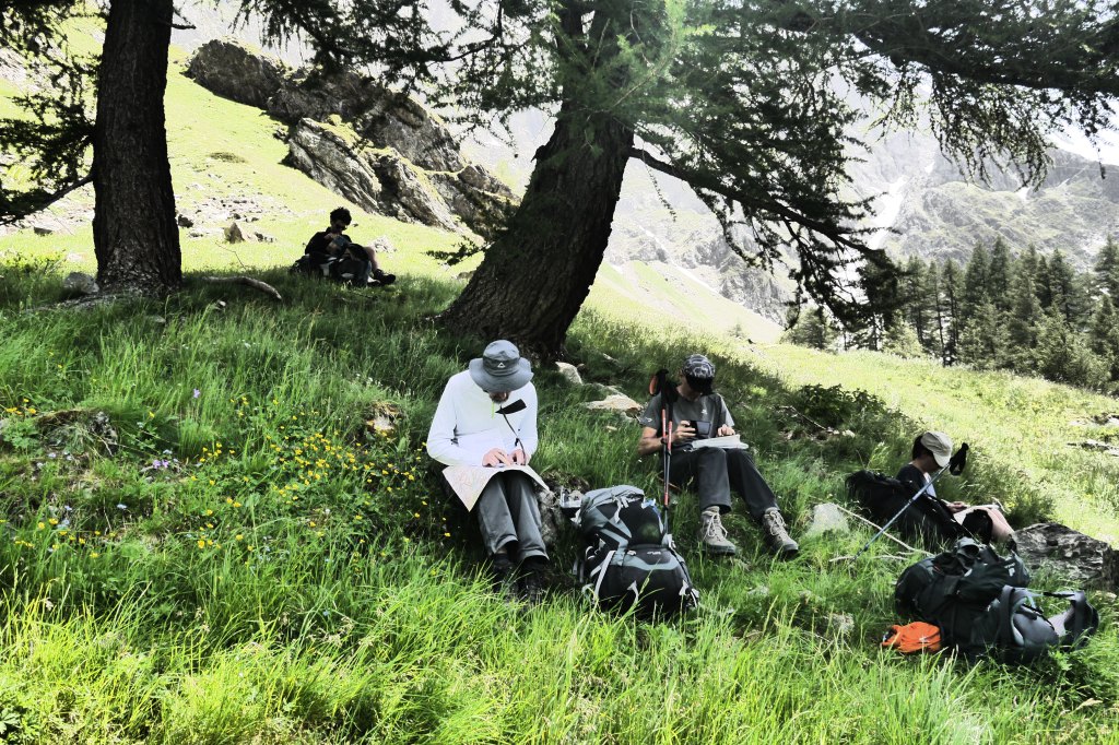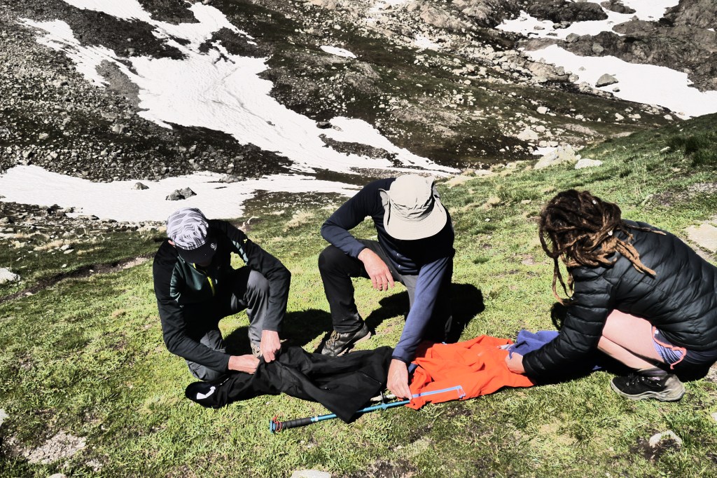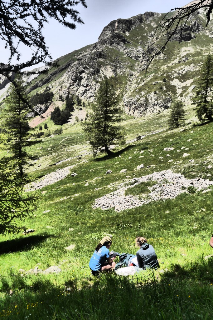 Astrid neemt de groep mee voor de namiddagetappe. We stappen door en klein lorkenbos en zijn onder de indruk van de grote en vele bosmieren. We stijgen vlotjes op een fijn pad om dan bovenop een rots met uitzicht een kruispeiling te oefenen. We bereiden ons voor op wat komt met een snackje. De vele kloven maken het nog vroeg in de zomer moeilijk omdat er dan sneeuw/ijs bijeengepakt zit. Dat kan veilig overgestoken worden met een touw, een broekje uit prusiktouw en een prusikknoop. Helaas is er weinig om de touwen aan vast te maken… dus we improviseren het beste alternatief. Het kost ons de nodige tijd voor 3 passages door kloven maar het gaat al bij al vlot. We stijgen nog een laatste stukje over een aangelegd pad om zo aan de Col de la Romeïoe (2435m) aan te komen. We trekken een groepsfoto en kijken naar het meertje onder ons om een goede bivakplek te spotten. Het is ondertussen 18u45.