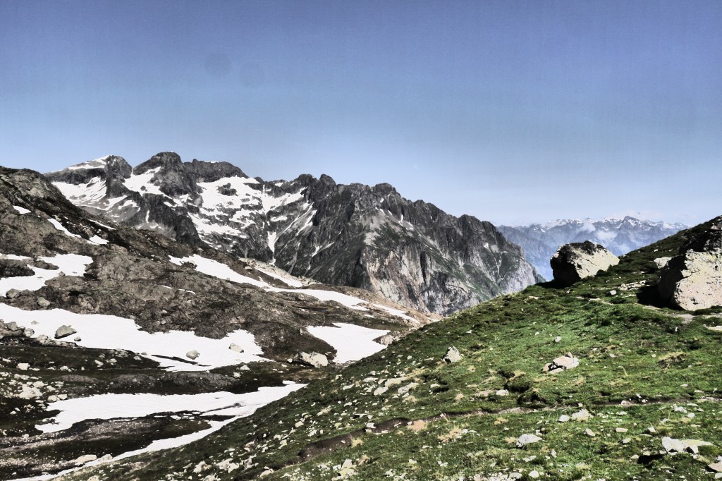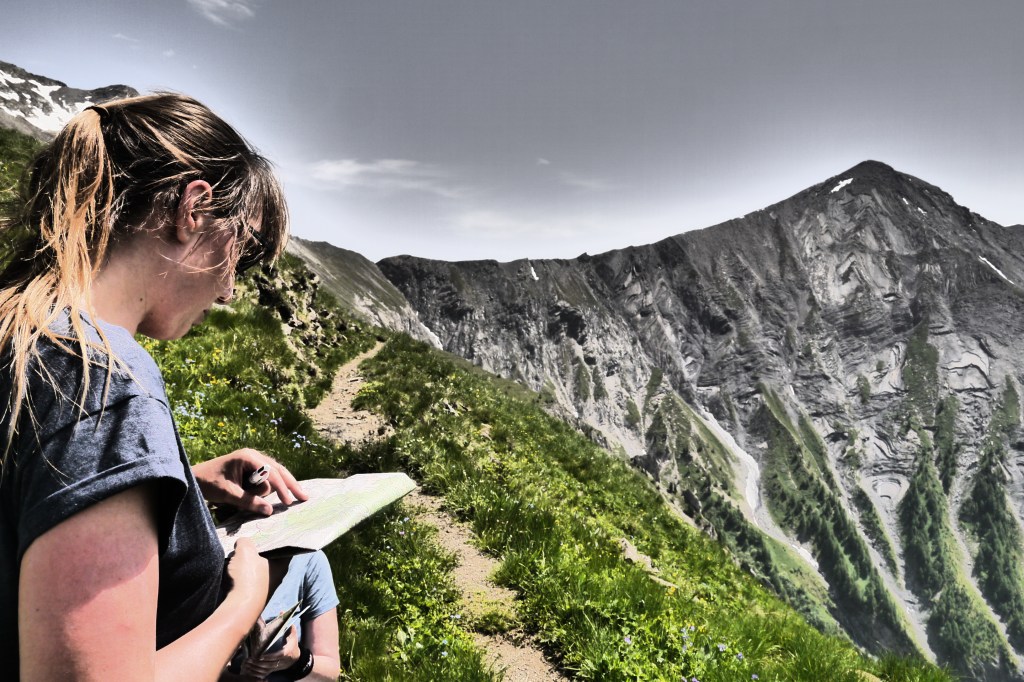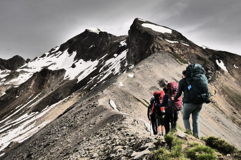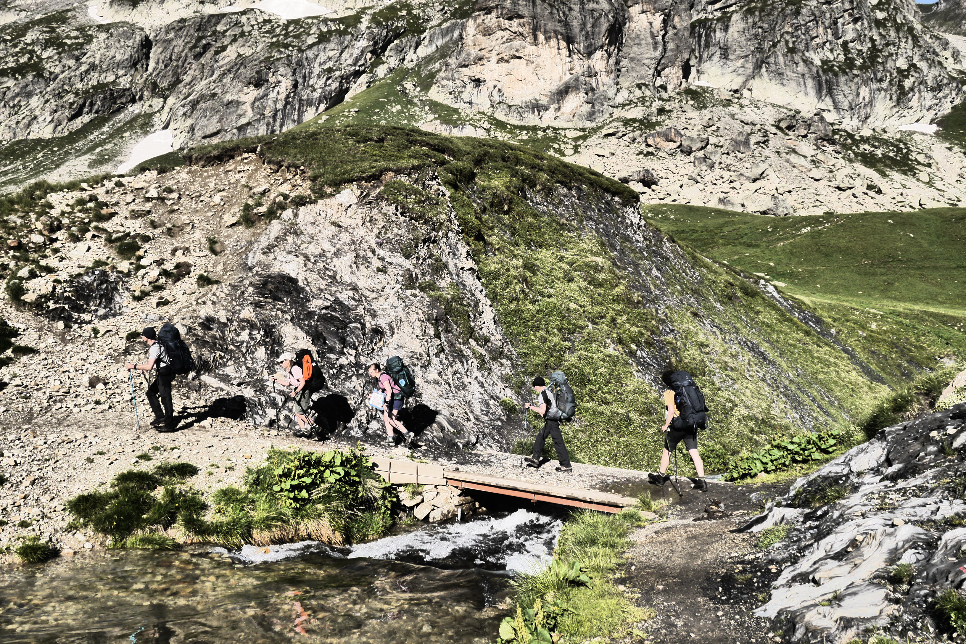 Astrid neemt de groep mee voor de namiddagetappe. We stappen door en klein lorkenbos en zijn onder de indruk van de grote en vele bosmieren. We stijgen vlotjes op een fijn pad om dan bovenop een rots met uitzicht een kruispeiling te oefenen. We bereiden ons voor op wat komt met een snackje. De vele kloven maken het nog vroeg in de zomer moeilijk omdat er dan sneeuw/ijs bijeengepakt zit. Dat kan veilig overgestoken worden met een touw, een broekje uit prusiktouw en een prusikknoop. Helaas is er weinig om de touwen aan vast te maken… dus we improviseren het beste alternatief. Het kost ons de nodige tijd voor 3 passages door kloven maar het gaat al bij al vlot. We stijgen nog een laatste stukje over een aangelegd pad om zo aan de Col de la Romeïoe (2435m) aan te komen. We trekken een groepsfoto en kijken naar het meertje onder ons om een goede bivakplek te spotten. Het is ondertussen 18u45.