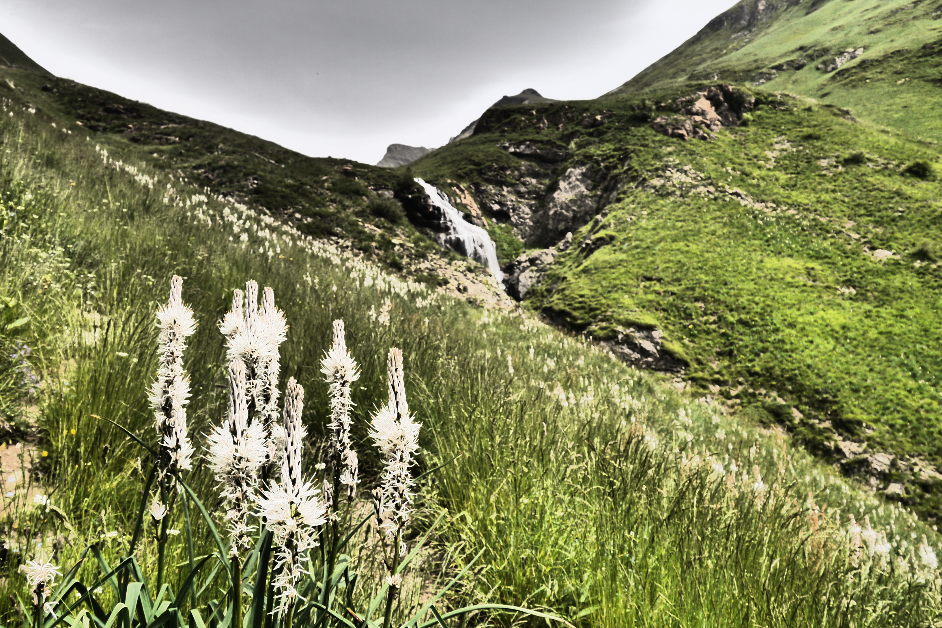 We rijden met de wagens naar La Danchère en vertrekken meteen om zoveel mogelijk in de koelte te wandelen. Helaas is het reeds vroeg in de ochtend vrij warm. Christophe neemt de kop en leidt de groep omhoog door het dorpje en naar het bos. We stijgen “dead slow” zodat iedereen rustig gewoon kan worden aan de rugzak en het stapritme van de groep. We wisselen af en toe en het vlot goed. We zijn rond 11u aan Lac Lauvitel (1520m) om er enkele staptechnische oefeningen te doen op grotere stenen. Ook is duidelijk dat we heel wat bloemen gaan zien. De determinatiebundel wordt bovengehaald en Astrid en Eva benoemen als snel de eerste bloemen. De groep beslist om nog wat verder te gaan alvorens te lunchen. We stappen langs de flank van Lac Lauvitel om een prachtige waterval over te steken. Gelukkig ligt er een brugje want anders zou het meteen een grote sprong in het diepe kunnen worden ;).