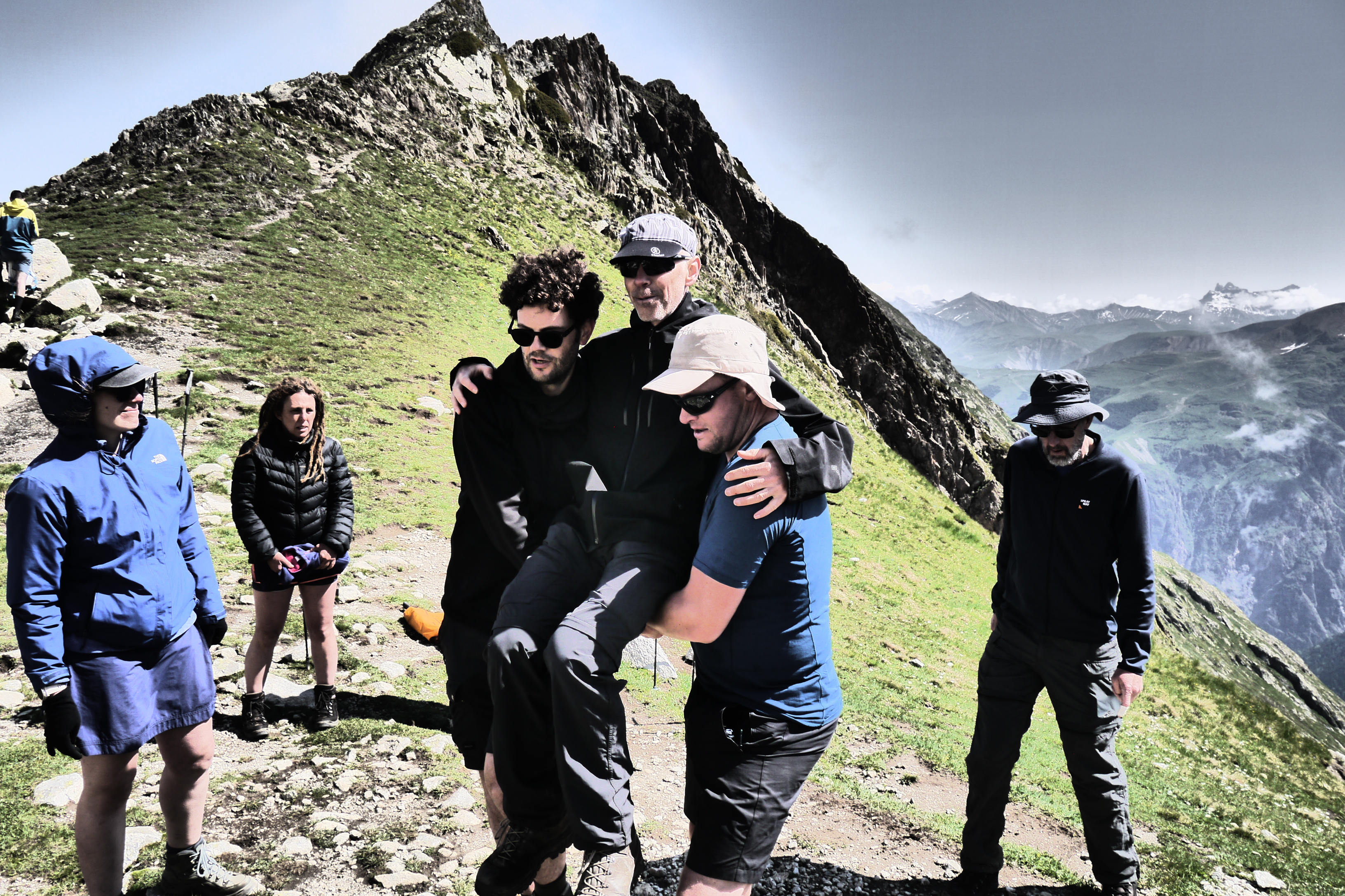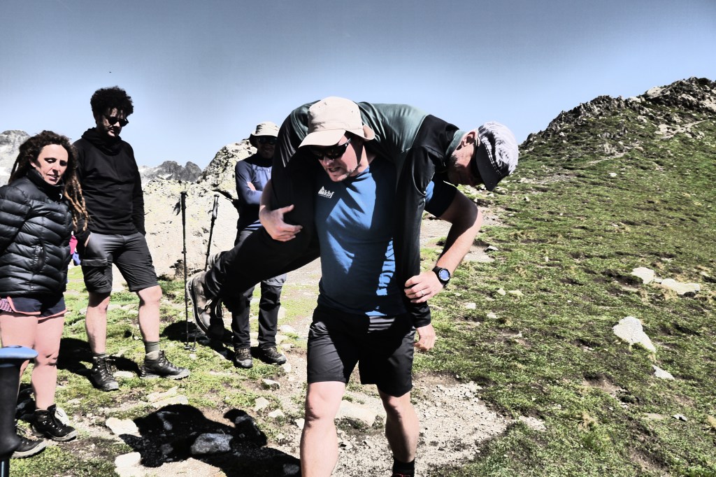 We maken nog een draagsysteem en testen enkele andere technieken om personen in nood te verplaatsen. Vervolgens testen we hoe een nooddeken het best gedragen kan worden in nood bij een slachtoffer. Joris is Chinese vrijwilliger en doet dat prima. Altijd leuk als je een jolige maar educatief respectvolle bende mee hebt. We dalen af en zien wat marmotten stoeien. We nemen een langere pauze voor de noodsimulatie. Steeds een spannend moment omdat de deelnemers daarmee veel inzicht krijgen in het realisme van een noodsituatie. Ze doen het prima en het siert hen dat ze deze oefening serieus nemen. De oefening neemt 25min. in beslag en doet sommigen zelfs emotioneel worden. Mooi toch dat mensen zoveel geven om hun naasten.