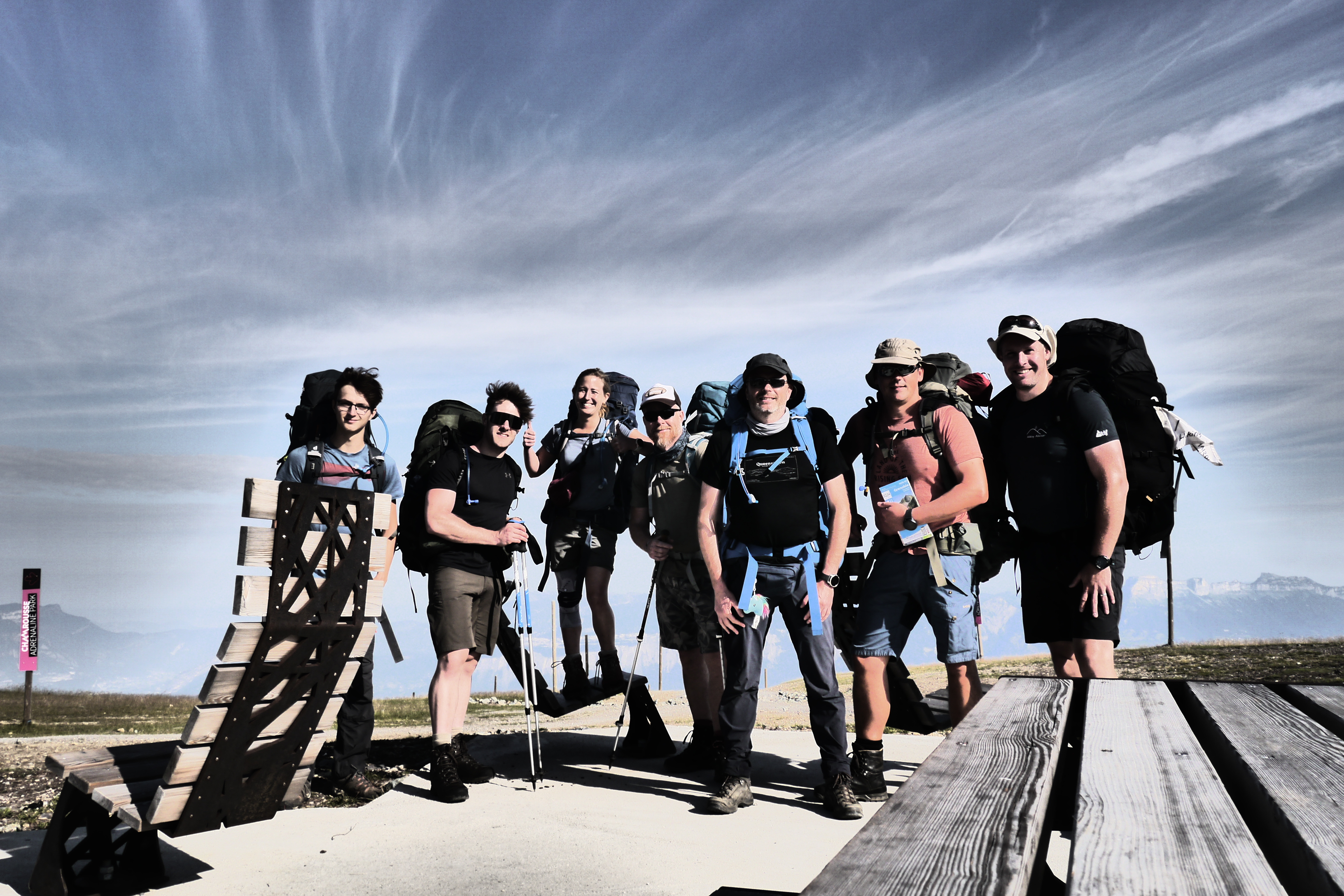We plakken nog wat duct tape want de schoenzool van Matti is nu helemaal los. Hij laat het niet aan zijn hart komen en daalt verder (vaak al huppelend) af. We lopen nu door een bos, ook wel le Dressoir genaamd. We gaan kijken bij de Cascade de Pissou en lunchen er. Stipt op tijd vertrekken we verder voor de laatste 150m afdalen. We wandelen La Martinette binnen en Thibaut merkt op dat we lang geen asfalt onder de voeten kregen. Het voelt inderdaad wat raar. Natuurlijk wordt er gekozen voor een terrasje. We hebben wel niet zoveel tijd want Jean (we mogen dat zeggen want hij is de lokale taxichauffeur die me nu al 2 jaar op rij komt oppikken) arriveert om 14u. Om 14u zitten we in de taxibus en raast Jean met ons door het landschap (soms letterlijk van de weg). We staan op 1u15 in Chamrousse (dat is 15min. minder dan de GPS oorsponkelijk aangaf!). We nemen de tijd voor een drankje en ook Gert vervoegt ons goedlachse gezelschap. We doen nog even de nabespreking en ik neem afscheid om huiswaarts te keren. Het was een fijne tocht met toch wel vele uitdagingen. Hopelijk lukt het een volgende keer zonder afvallers en gewonden… maar daar ga ik nog enkele nachtjes over slapen.
