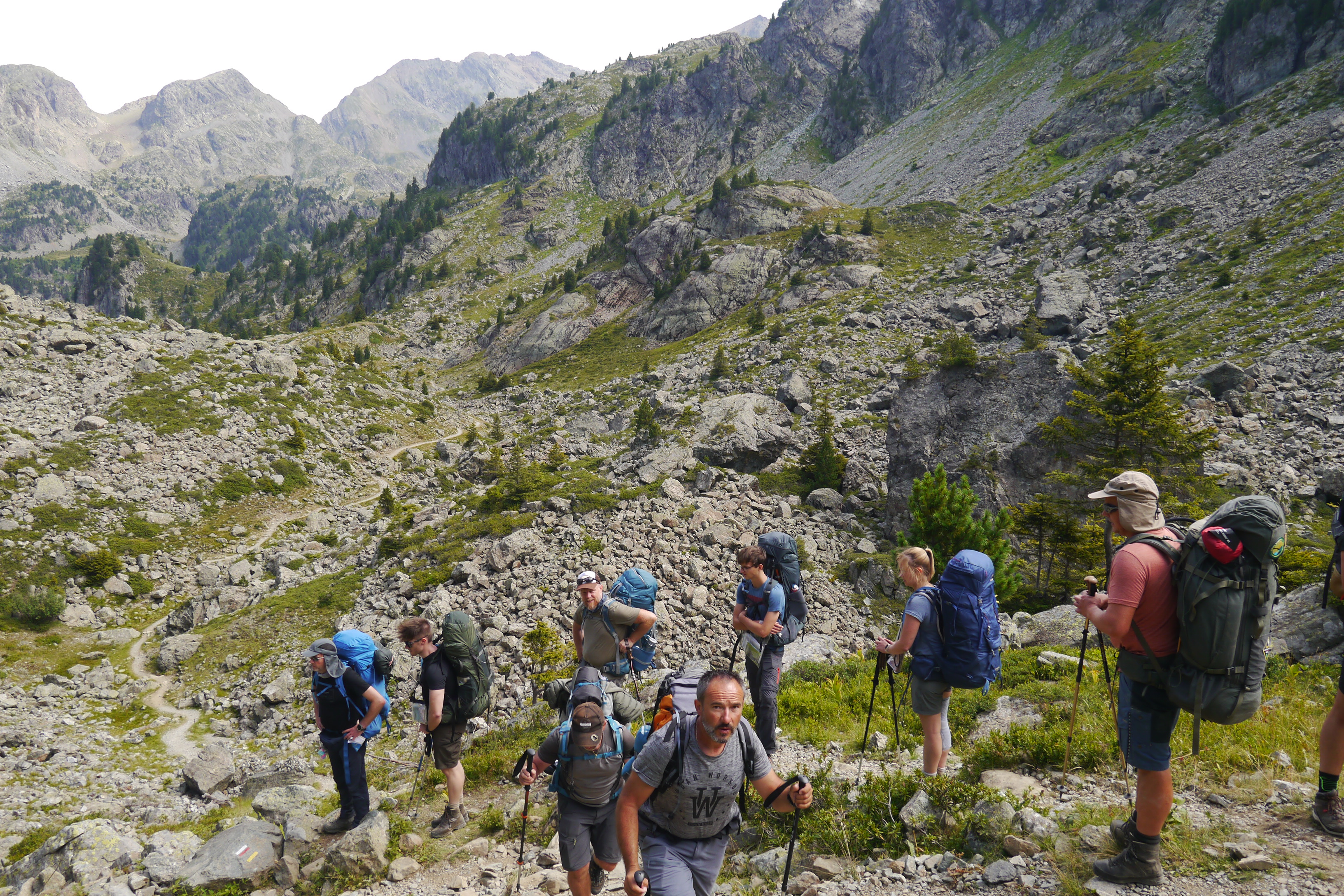Zoals steeds (het was al duidelijk op het voorbereidingsmoment tijdens het module 2-weekend in de Ardennen) heeft Gert steeds een grapje of excuus klaar als iets wat meer op een gok lijkt dan een beredeneerde argumentatie. Toch weet ook hij vlot de nodige herkenningspunten aan te duiden. Thibaut, zijn zoon van 18, is er wat vlugger mee weg maar die is zo diplomatisch om het er niet in te wrijven. We stappen wat verder en Nick slaat zijn voet om. Het terrein, ook al is er een duidelijk pad, is niet vergeeflijk. Hij is ongerust. Mits wat extra aandacht voor het zetten van de voeten gaat het om verder te gaan. Enkel bij specifieke bewegingen voelt hij nog wat pijn maar in globo lijkt het een kleine verrekking. We pauzeren aan de Lacs Robert en doen er ons te goed aan de eerste tussendoortjes van de trip. We doen er ook enkele oefeningen rond staptechnieken op losse rotsen en blokkenterrein. Gert neemt vervolgens het voortouw om ons naar een licht uitdagend pad te leiden. We lopen nu op de westelijke flank van het Belledonne massief. Het inwandelen is nu wat voorbij want daar komt alvast de eerste klim. We stijgen over een zigzaggend pad en laten al snel de grasflanken achter ons. Er wordt leutig gepraat. Matti is aan het verbranden en trekt zijn buff over zijn hoofd. Verhalen gaan over de tong, van de toekomst in Zwitserland van Sofie tot … ik was eens-verhalen. We passeren nog heel wat wandelaars. Het is een populair weekend omdat het een verlengd weekend is voor heel wat Fransen omwille van de 14e augustus. We zien helaas ook regelmatig de reddingshelikopter als reactie op ongevallen van wandelaars of klimmers. De helihaven is niet zo ver verwijderd (aan de andere kant van het Belledonnemassief) dus dat geeft wel een beeld van hoeveel er eigenlijk wel niet kan gebeuren op zo’n dag! We stappen even door op een normaal tempo voor gevorderden om te kijken hoe dat gaat. Niet iedereen vindt dit tempo even aangenaam blijkt wat later. Er wordt al eens gehuppeld door de ene en geblazen door de andere. Thibaut schuift uit en verwondt zijn hand een beetje. “’t Is nikske Yanick, dat is maar een kleinigheidje” zegt hij. Later die dag zullen we de wonde uitkuisen en er een niet inklevend verband op leggen. Infecties willen we niet hé.