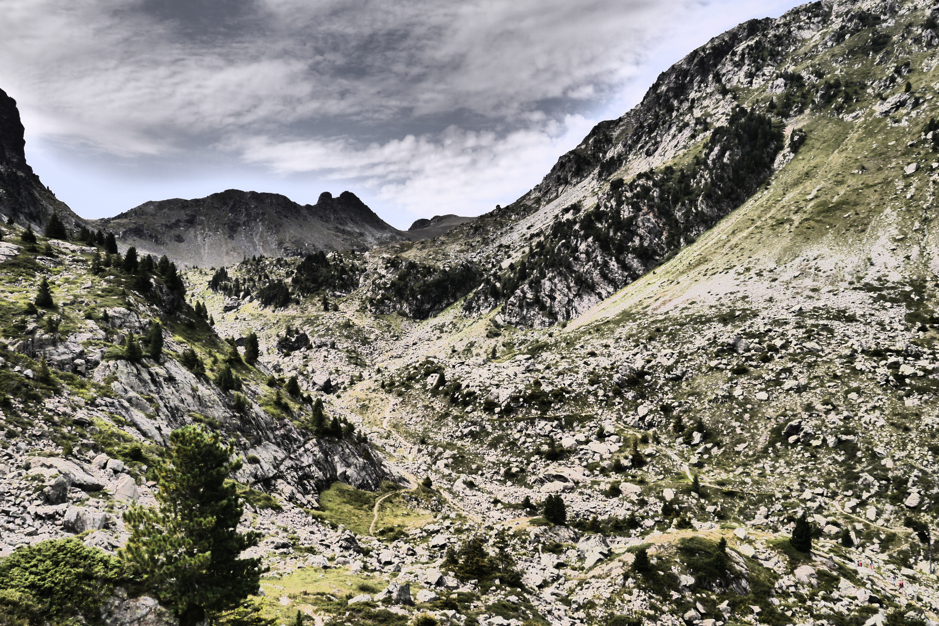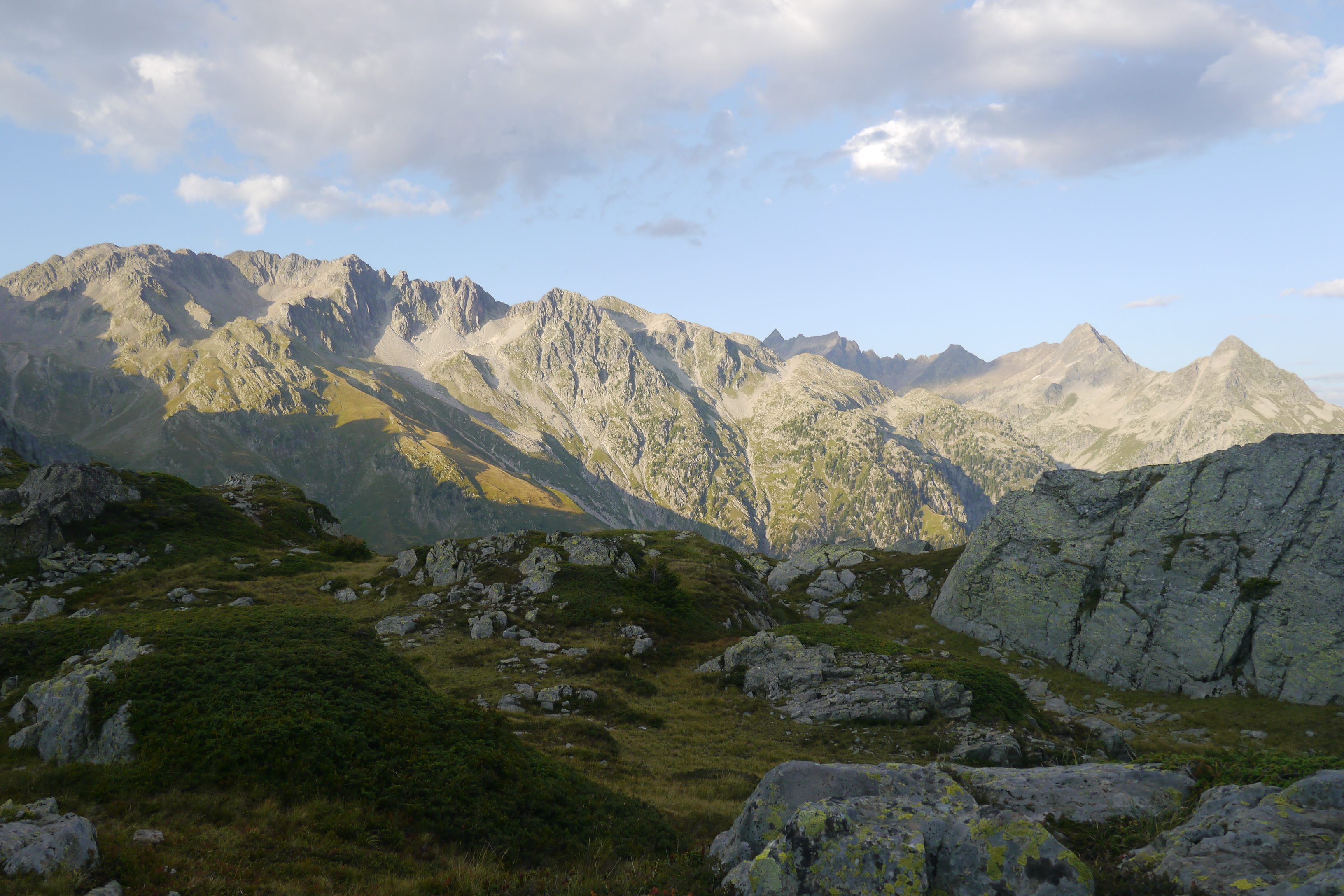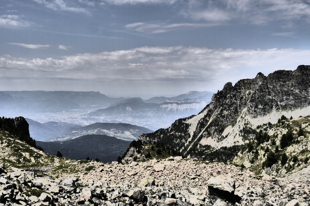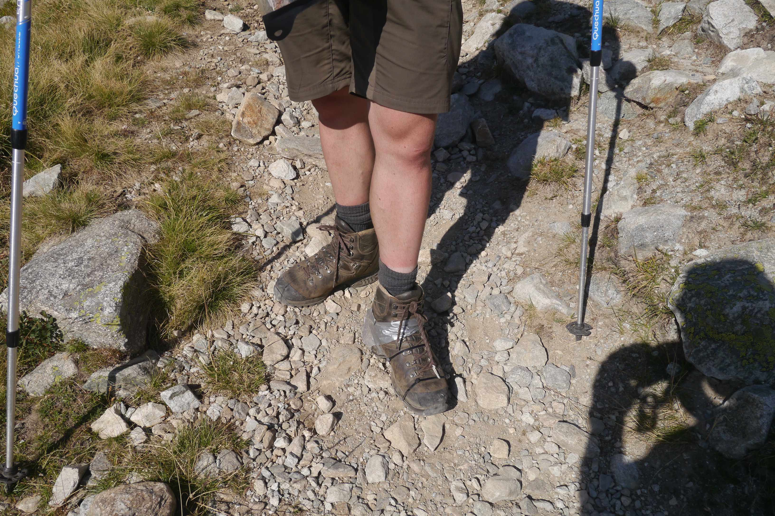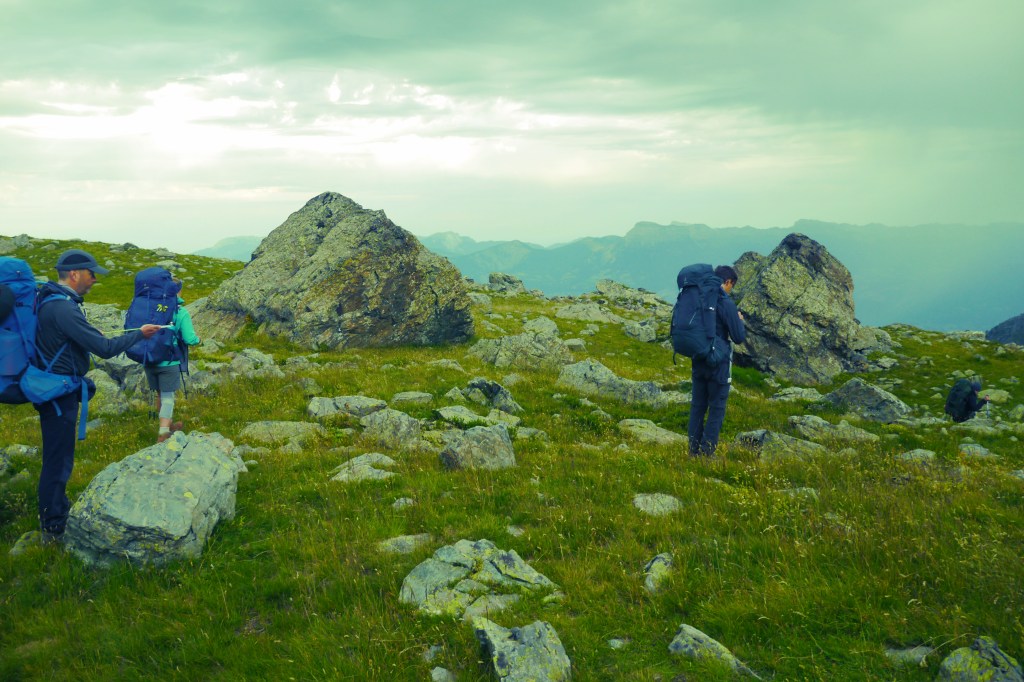 Sofie gaat voorop en leidt Matti, Thibaut en mezelf over de flanken onder de Pas du Pin via de GR 738 naar de crête du Cheval. We pauzeren even aan een beekje. Matti doet trainingstechnieken uit de doeken (zeer interessant – daar moet een workshop voor Hiking Advisor of KBF van komen volgens mij) en de voormiddag raast letterlijk voorbij. We pauzeren nog even voor een snackje aan de Daltonrots en beginnen aan een moeilijk blokkenterrein. Sofie doet dat goed en krijgt de nodige pointers van Thibaut of Matti als het even zoeken is naar de rood-witte markeringen van het GR-pad. Matti’s schoenzool begint te lossen… met enkele consolbandjes (tiewraps of kabelbinders) lossen we dat voorlopig op. Het blijkt te werken.
