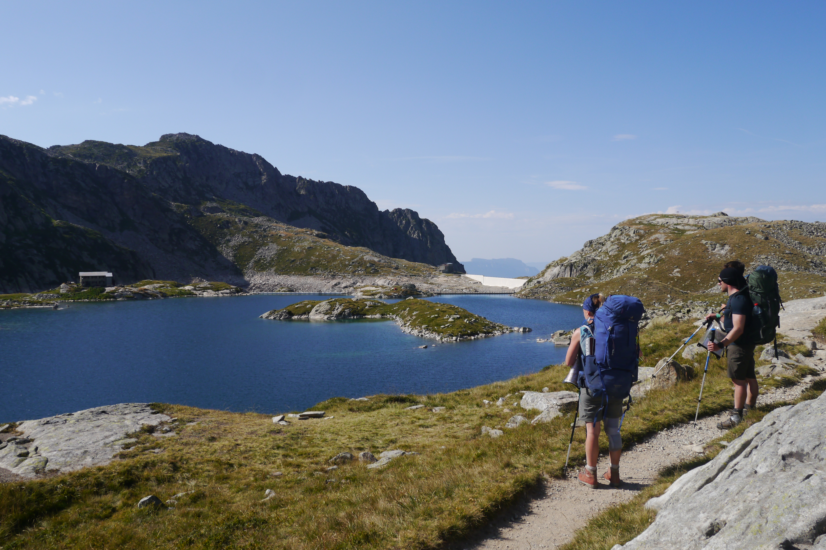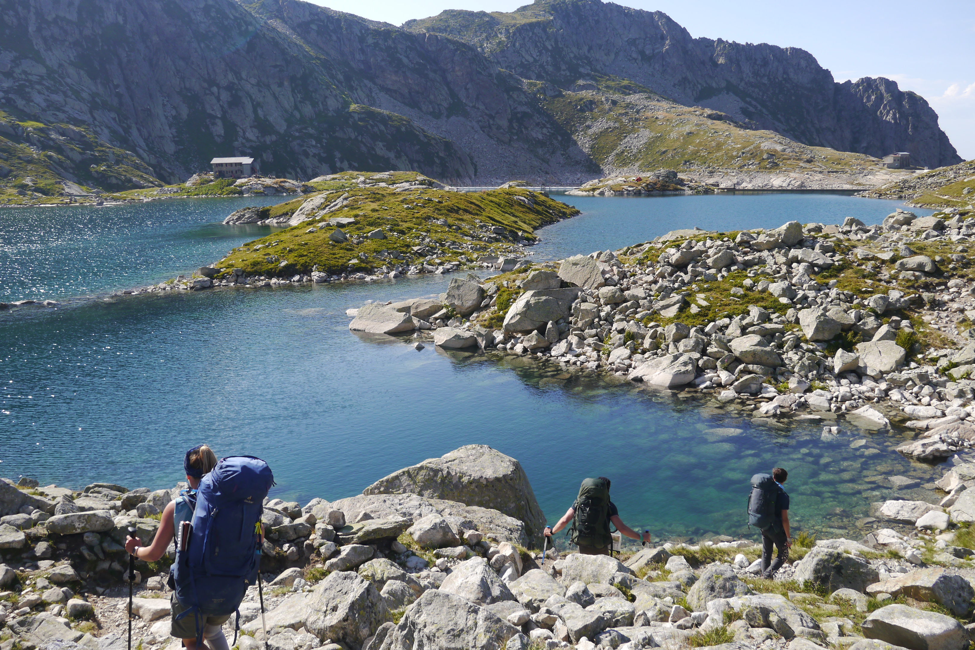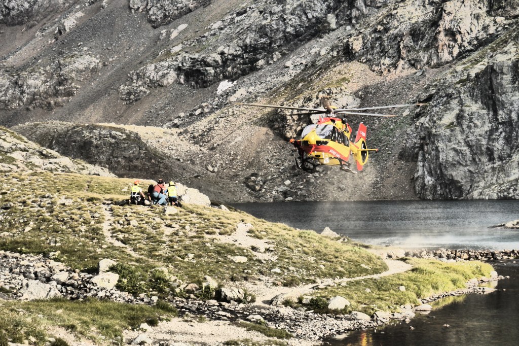 We komen aan bij het drukke en hete terras van de Refuge de La Pra. Alle tafels en parasolletjes zijn in gebruik. We vullen er onze waterzakken en drinkbussen en genieten ook van een cola of andere versnapering. Nog een uurtje klimmen en dan zijn we bij onze bivakplek. Luc neemt nu de kop en brengt ons vrij vlot door een moeilijker terrein. We moeten grote stappen zetten, af en toe onze handen gebruiken. We zijn bijna aan de col waar we Lac du Petit Doménon zien of Matti roept “Yanick, ik denk dat je snel moet komen”. Net achter de bocht is Luc gevallen. Hij heeft een stevige wonde aan het hoofd maar hij is gelukkig bij bewustzijn. Het is duidelijk dat dit niet op te lossen is met een plakkertje. De wonde is diep en ter grootte van een muntstuk. Helaas geven alle signalen aan dat we Luc moeten laten verzorgen door de nooddiensten. Nick, die ook een opleiding tot Wilderness First Aid volgde, staat me bij om Luc te onderzoeken en te ondersteunen terwijl de rest van de groep op een veilige plek op afstand wacht. Na een korte eerste controle van Luc contacteer ik de nooddiensten. Het is een noodsituatie die eigenlijk sterk overeenkomst met een later in de week geplande simulatie. We hadden het allemaal liever tot een simulatie beperkt. De helikopter arriveert met een ploeg en ze voeren de nodige controles uit bij Luc. Er wordt beslist om hem te evacueren naar een nabij gelegen medische post. Luc zijn rugzak geven we mee. Terwijl de indrukwekkende wieken water van het meer doen opwaaien neemt de helikopter vlot hoogte. Helaas voor Luc is het exit op dag 1.