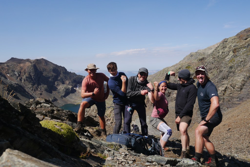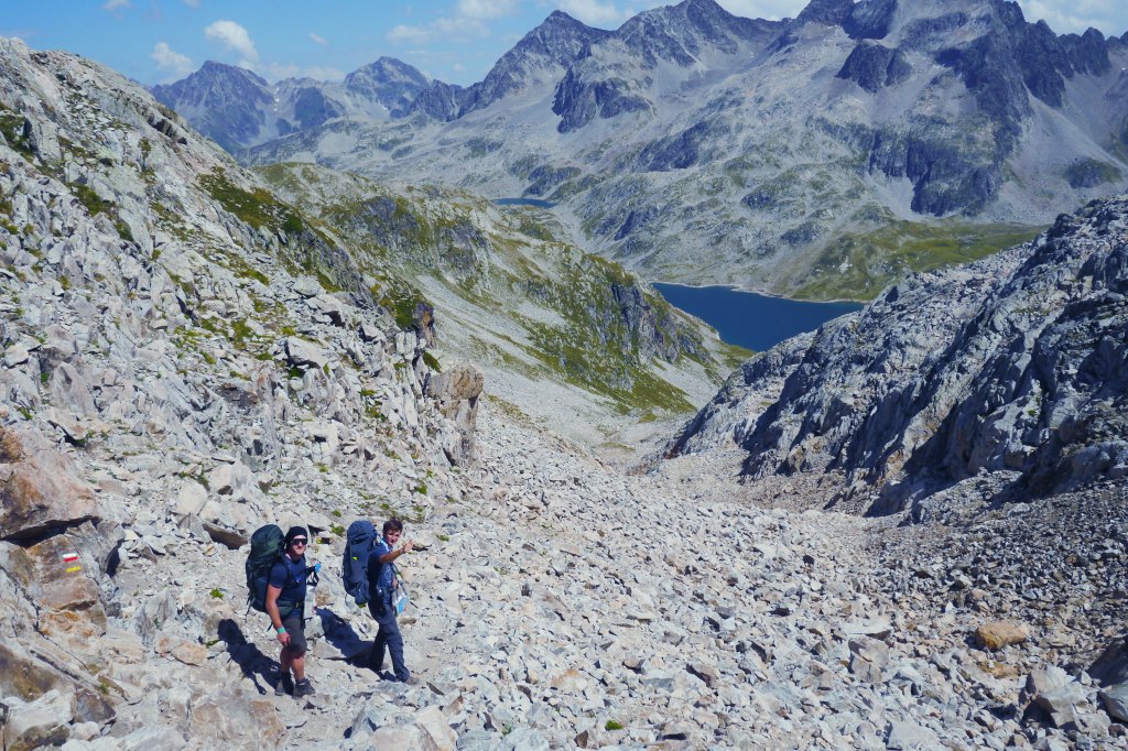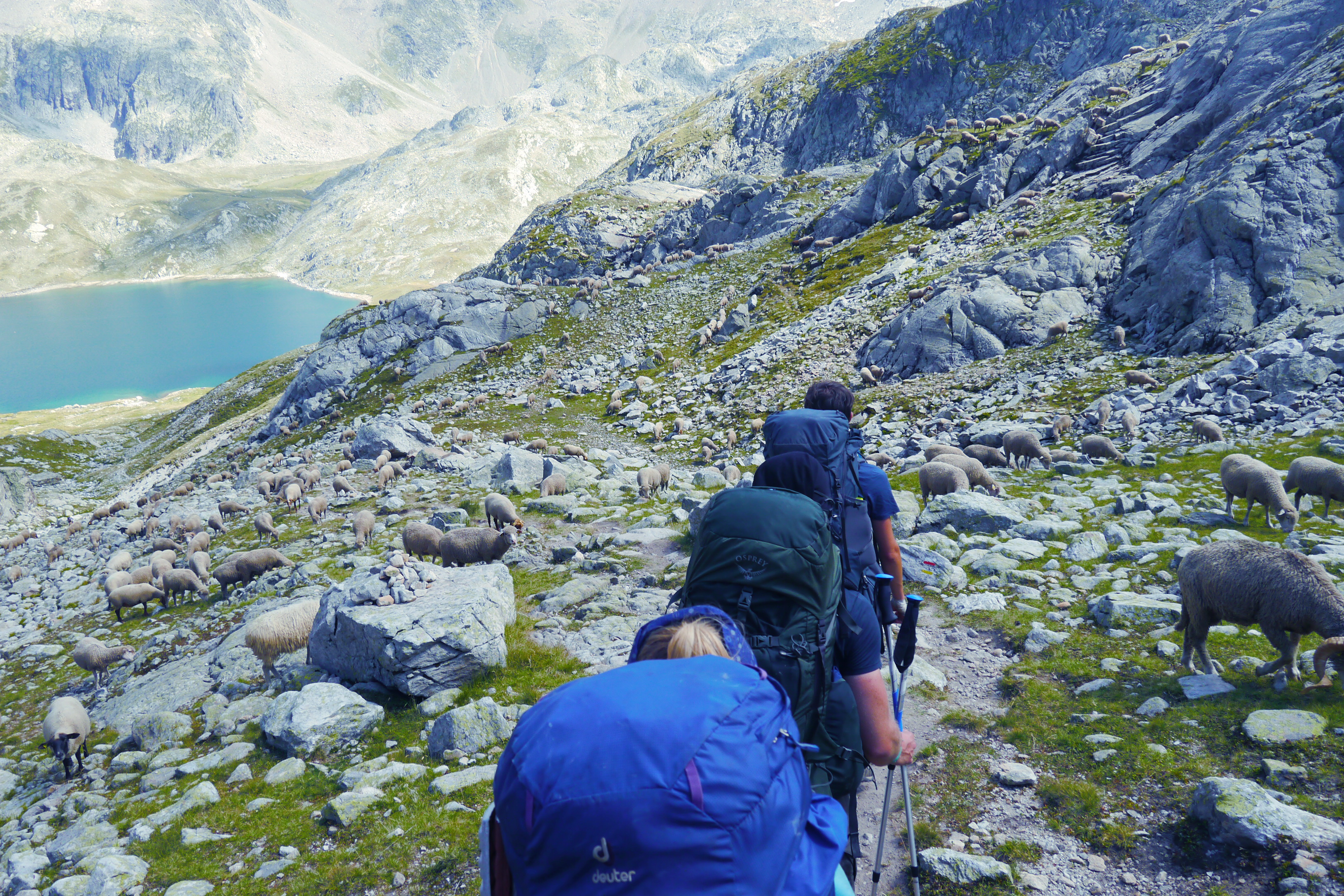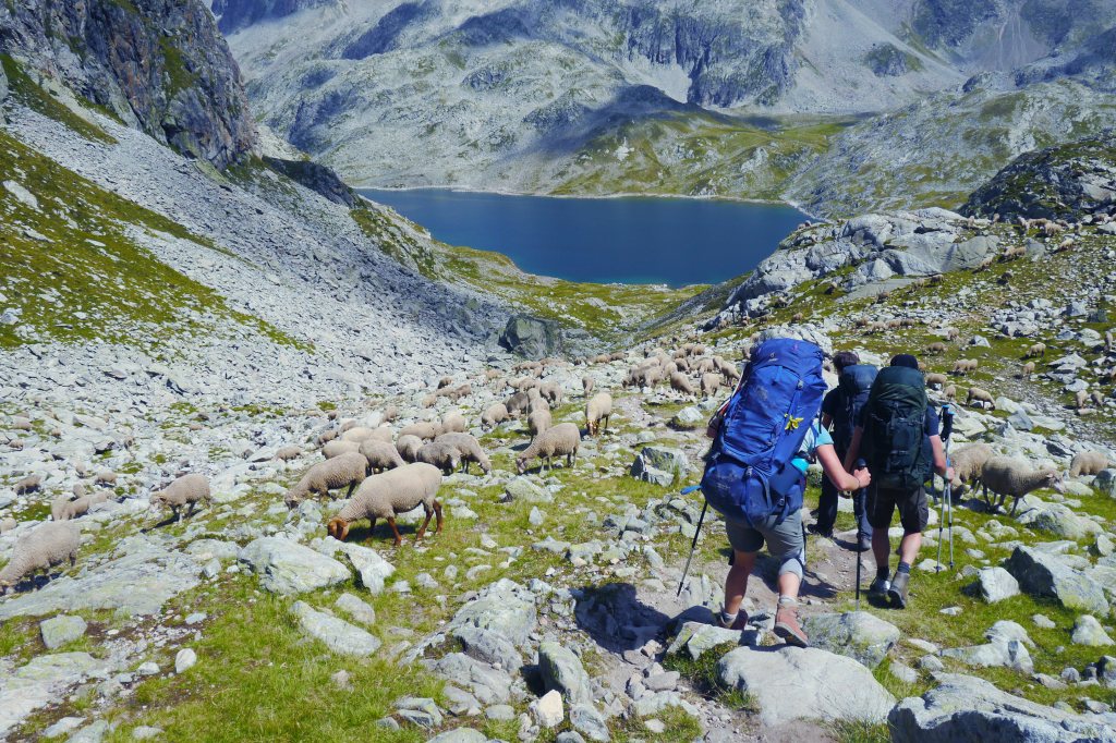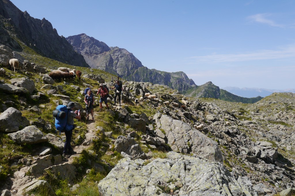 We ontmoeten halverwege de helling een Fransman die in Brussel woont en met zijn zoon (10) en dochter (13) op pad is voor hun eerste bivaktocht. Een aangenaam gesprek volgt en ik moet mijn kompanen inhalen voor ze aan de einder verdwijnen (in de realiteit: 50m en een grote rots). Ik huppel naar hen toe en we gaan samen in één trek door tot aan de col. Opnieuw graast er een jonge steenbok terwijl Sofie haar colfoto neemt. We maken er een groepsfoto van en lunchen in de warme zon. Matti’s schoenzool is ondertussen meer en meer los. Duct tape to the rescue! We dalen voorzicht af en als het wat vlakker wordt kunnen Matti en Thibaut naar beneden huppelen. Sofie en ik volgen op ons tempo. Plots staan de heren weer stil… schapen… maar waar is de Patou? We kunnen niet anders dan de kudde traag naderen en plots staat hij daar… de patou blaft. We wandelen zeer rustig, nauw aansluitend op elkaar, zonder enige bruuske beweging door de schapen. We laten hen de nodige tijd om aan de kant te gaaan. Net zoals één of andere mozes met een zee.