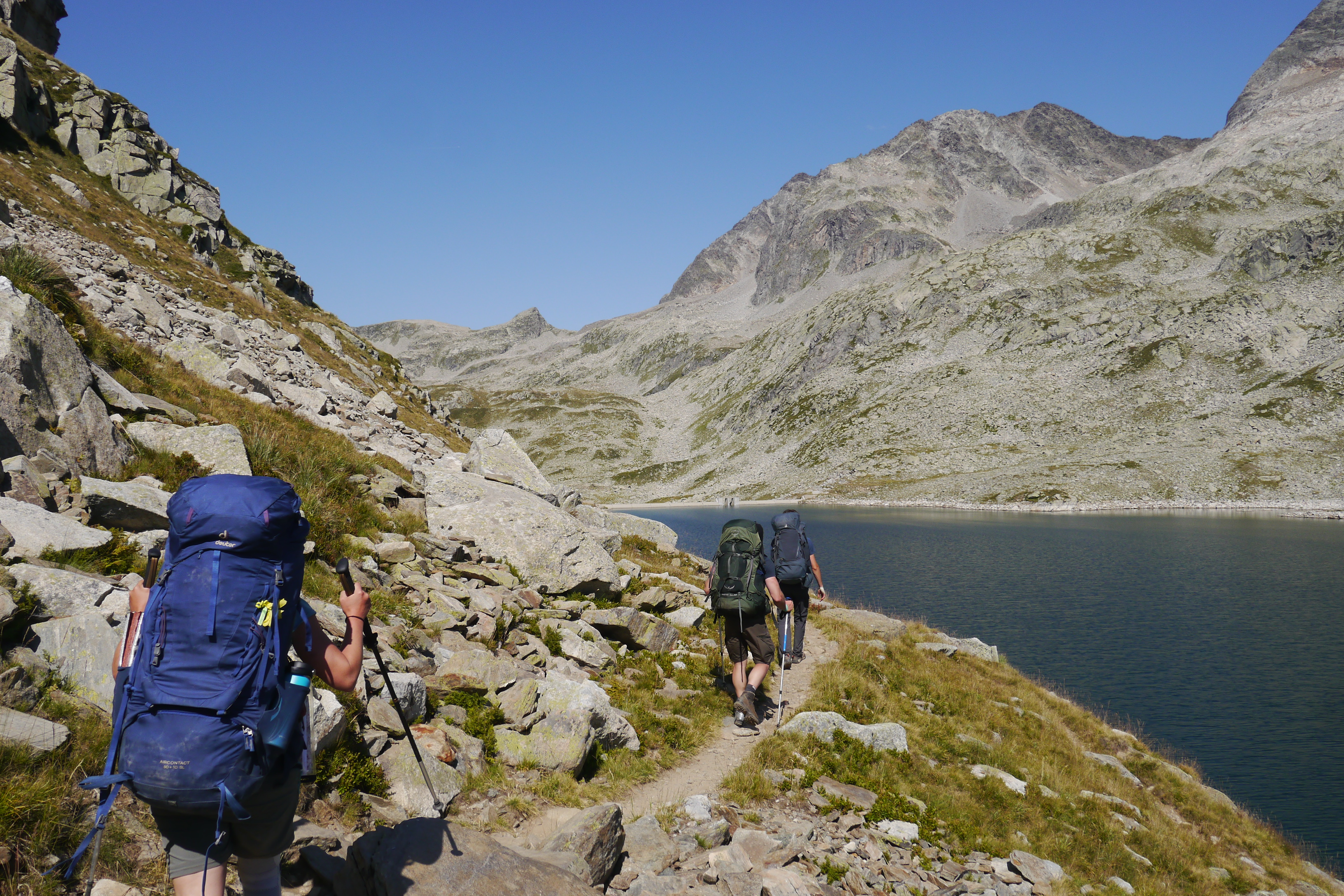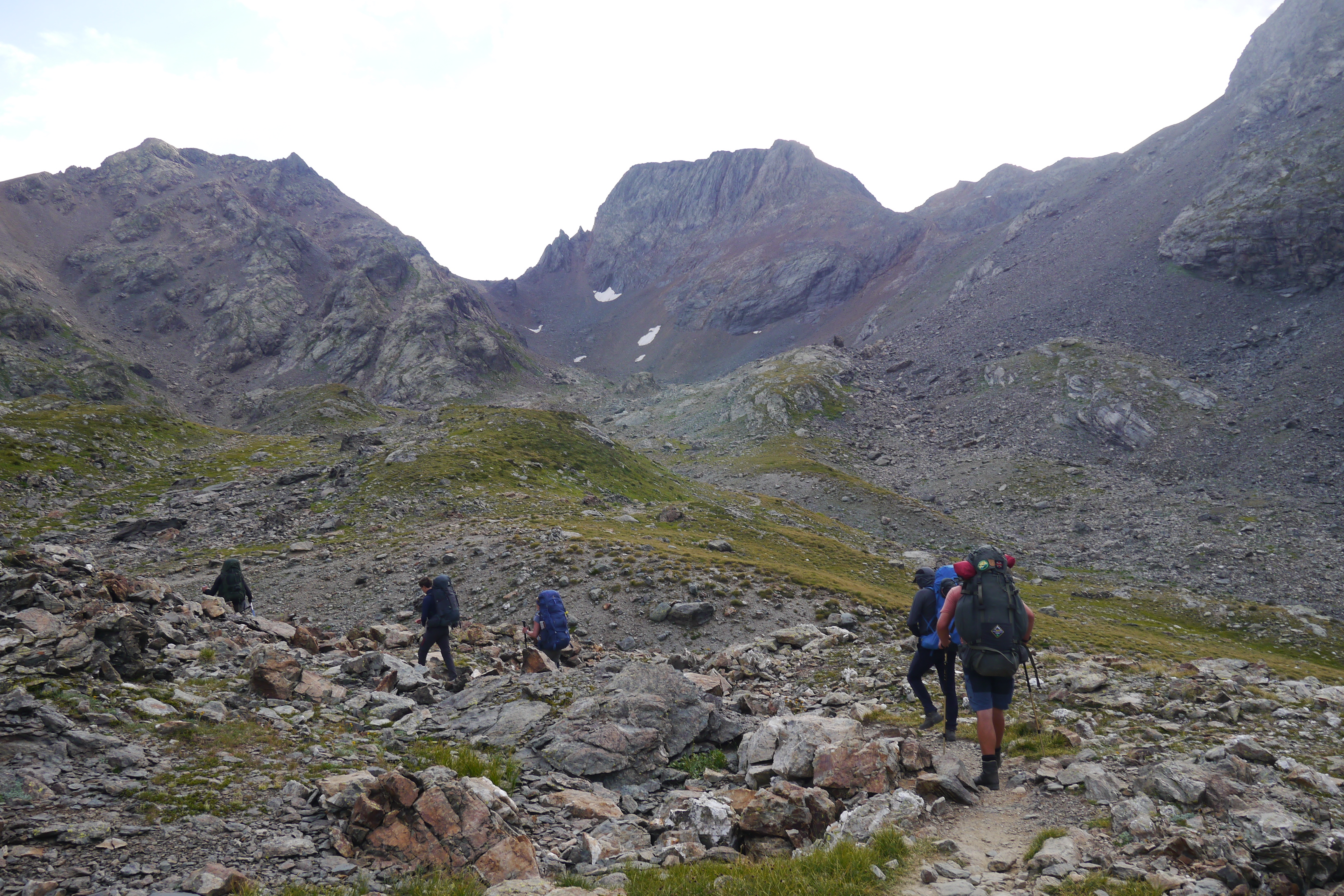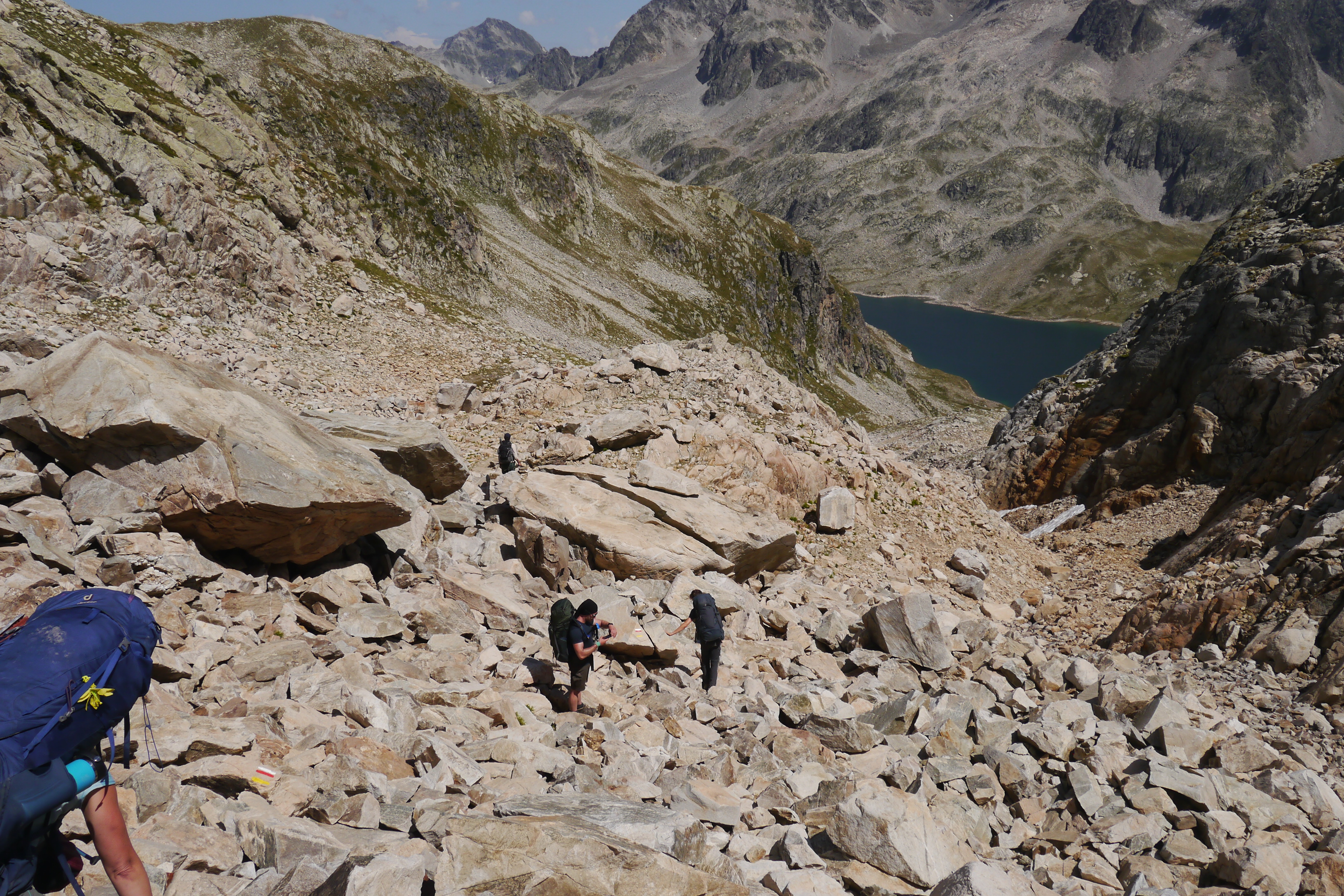 We ontmoeten halverwege de helling een Fransman die in Brussel woont en met zijn zoon (10) en dochter (13) op pad is voor hun eerste bivaktocht. Een aangenaam gesprek volgt en ik moet mijn kompanen inhalen voor ze aan de einder verdwijnen (in de realiteit: 50m en een grote rots). Ik huppel naar hen toe en we gaan samen in één trek door tot aan de col. Opnieuw graast er een jonge steenbok terwijl Sofie haar colfoto neemt. We maken er een groepsfoto van en lunchen in de warme zon. Matti’s schoenzool is ondertussen meer en meer los. Duct tape to the rescue! We dalen voorzicht af en als het wat vlakker wordt kunnen Matti en Thibaut naar beneden huppelen. Sofie en ik volgen op ons tempo. Plots staan de heren weer stil… schapen… maar waar is de Patou? We kunnen niet anders dan de kudde traag naderen en plots staat hij daar… de patou blaft. We wandelen zeer rustig, nauw aansluitend op elkaar, zonder enige bruuske beweging door de schapen. We laten hen de nodige tijd om aan de kant te gaaan. Net zoals één of andere mozes met een zee.