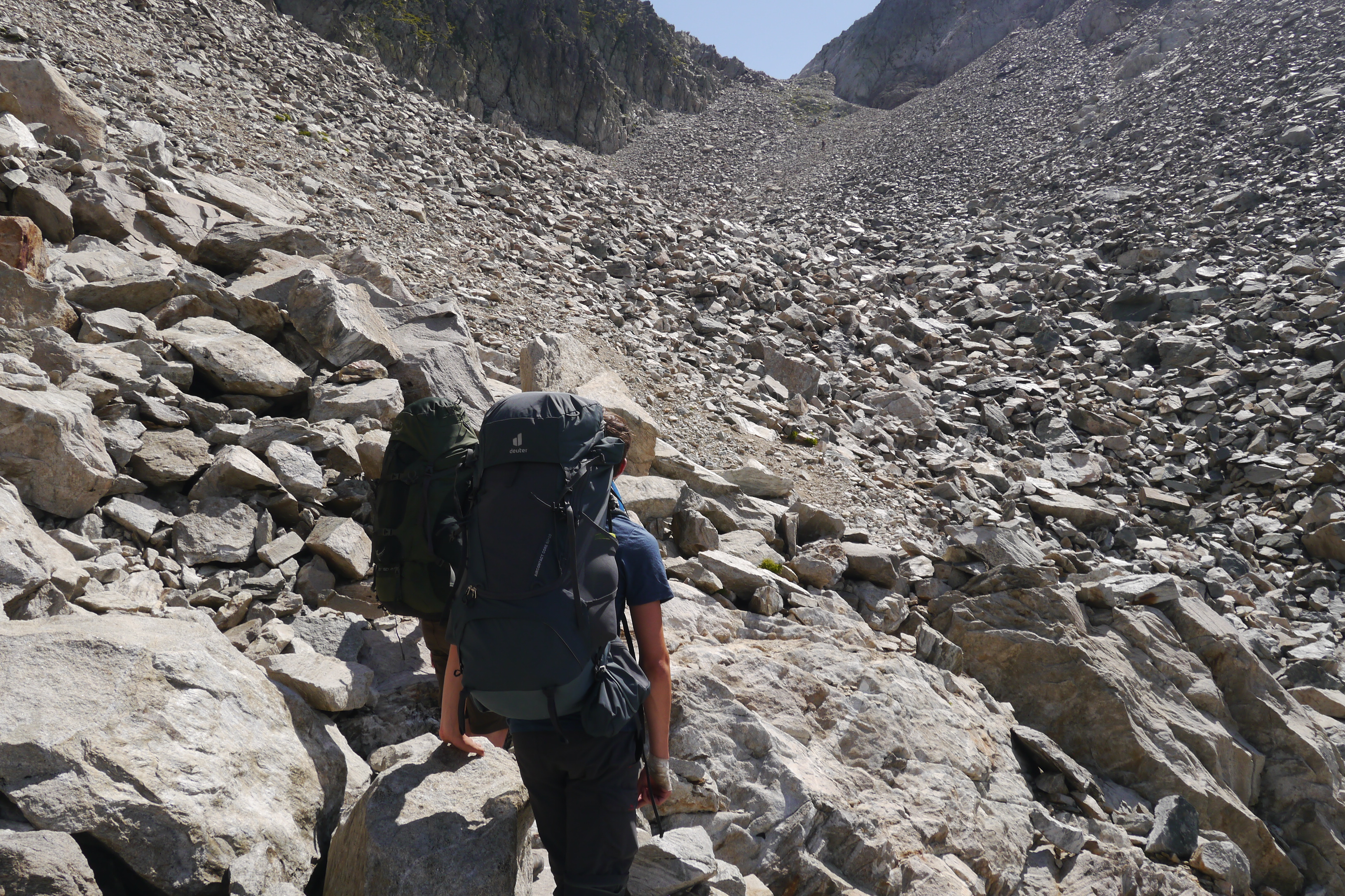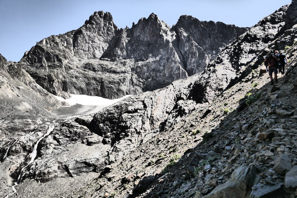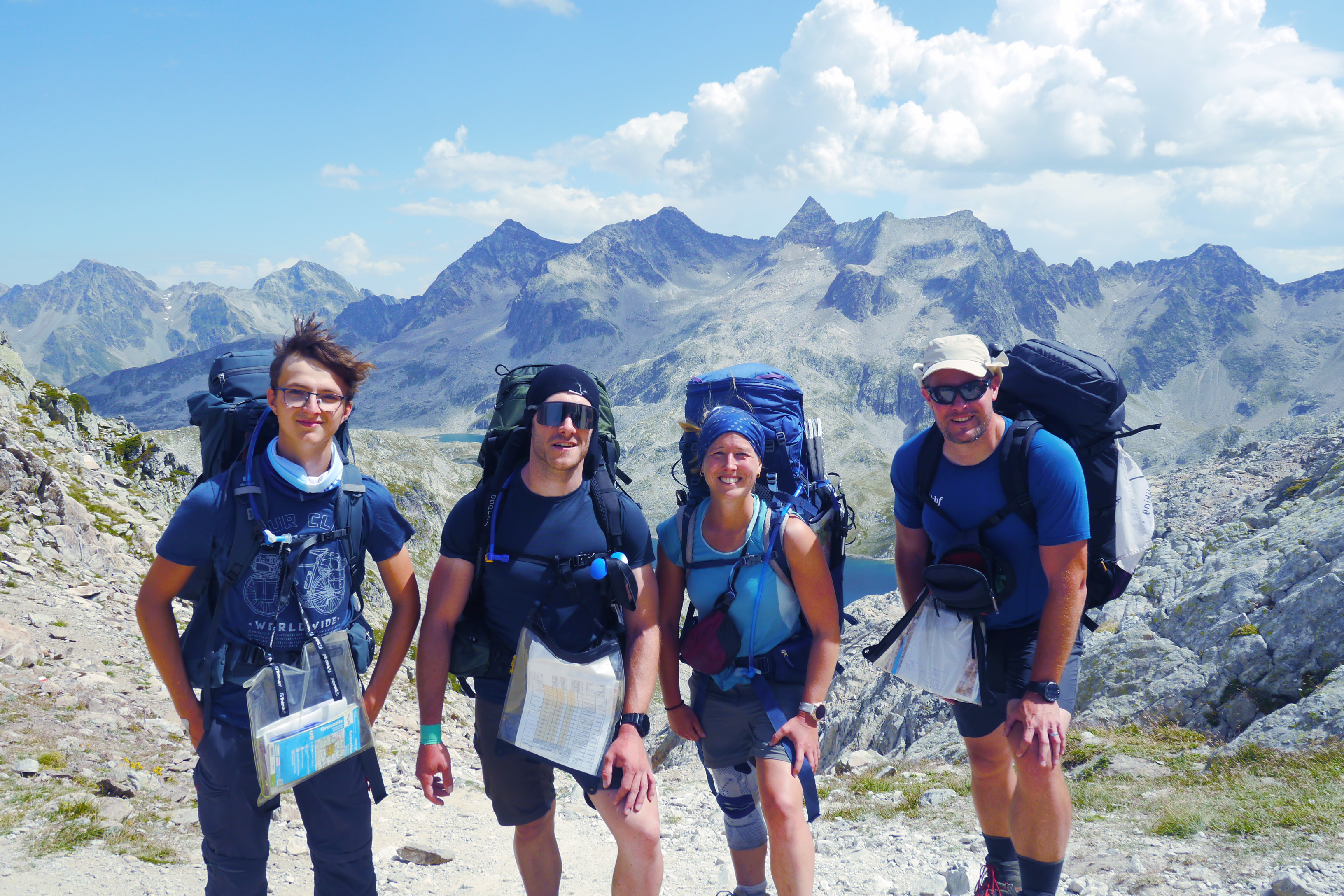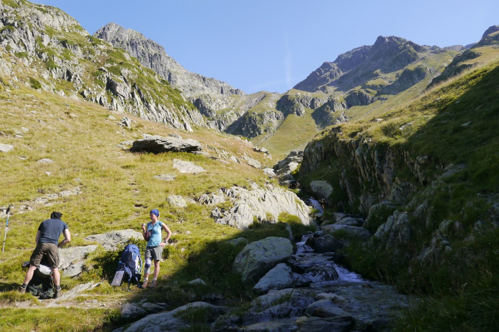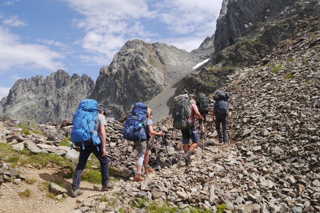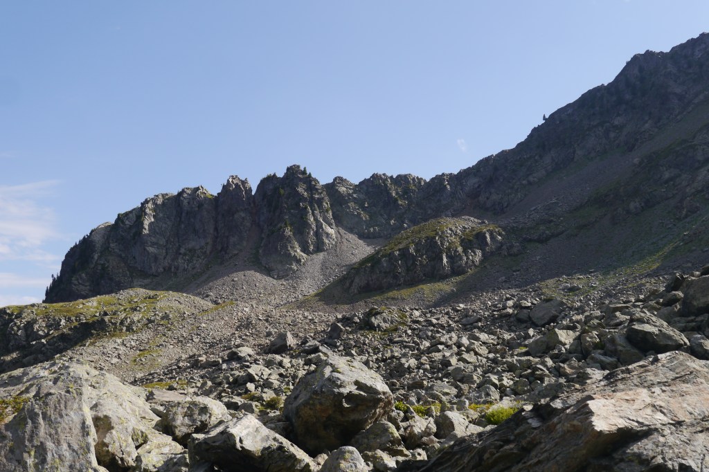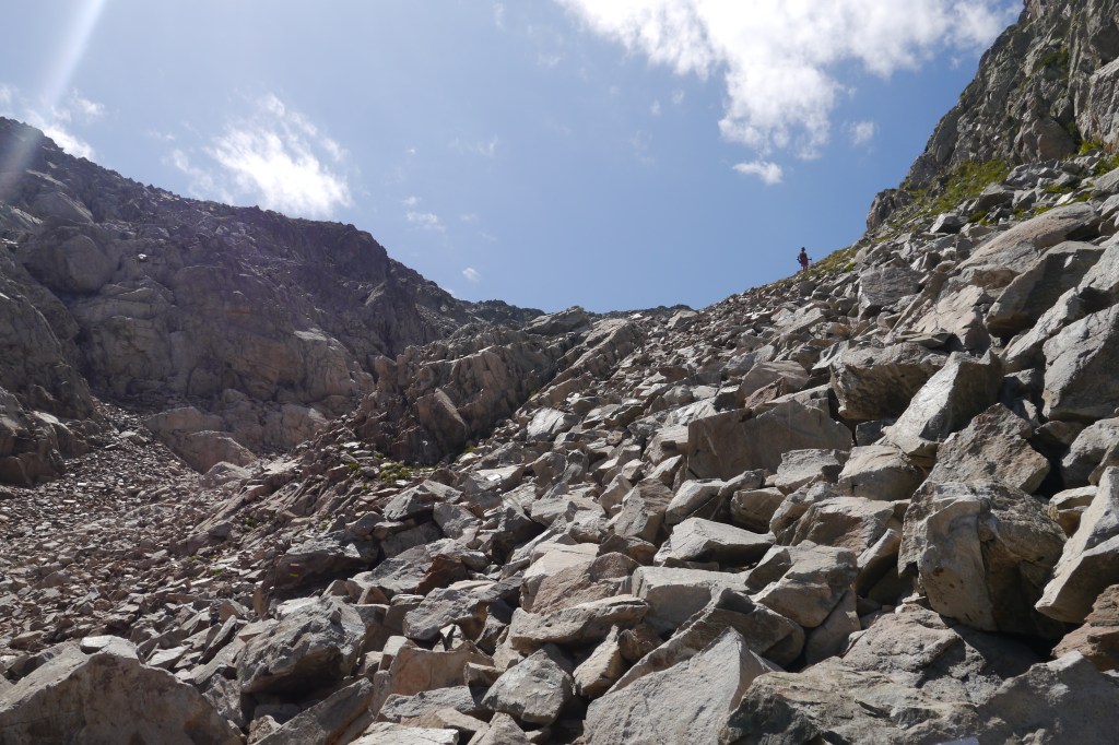 Als we wakker worden zijn we niet alleen. Naast de vele tentjes en tarps zijn ook enkele steenbokken rond de tenten aan het kijken naar wat wij met ons team aan het doen zijn op “hun” grasveldje. Rondvraag leert dat niet iedereen goed geslapen heeft maar goed, een nachtje doortrekken blijkt voor enkelen in de groep niet zo moeilijk leren we later. We maken samen een analyse van de route die we willen volgen. Matti loopt voorop en zorgt dat we vlot aan de voet van een puinhelling komen. Er is toch wel wat onzekerheid bij sommigen want die helling ziet er niet zo makkelijk uit. Door een korte briefing over valtechnieken, schuilen voor vallende stenen en een versnapering zijn we uitgerust als we aan de beklimming beginnen. We snijden een onderwerp aan waarover we met meerderen makkelijk kunnen babbelen en plots komt iemand tot de vaststelling dat we al 2/3e van de route omhoog gedaan hebben. “Die helling ziet er erger uit dan ze is” zegt Sofie. Matti, die we toch als onze topatleet mogen beschouwen, weet het tempo aangenaam te houden. Hij houdt een trage maar continue tred aan waardoor alles vlot gaat voor iedereen. Als er even gestopt wordt om met enkele andere Vlamingen te babbelen blijken dat Annelies en Jan te zijn, beiden geëngageerd binnen Hiking Advisor achter de schermen. Ze zijn de GR738 van de Belledonne in de andere richting (Noord naar Zuid) aan het volgen. Ze moeten nog één dag en dan zijn ze klaar. We nemen afscheid en gaan verder onder een brandende zon. Het is smeren en nog eens smeren.