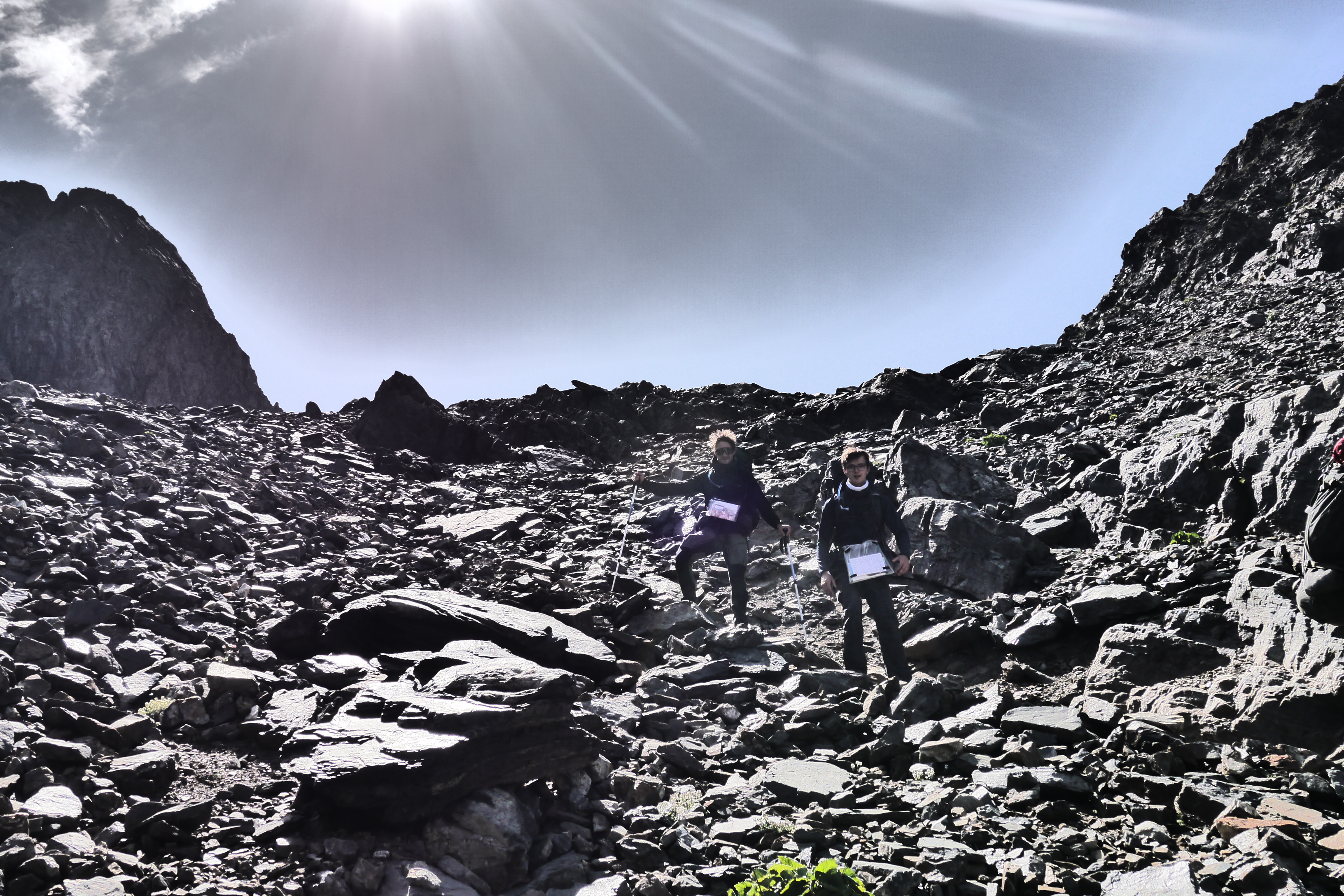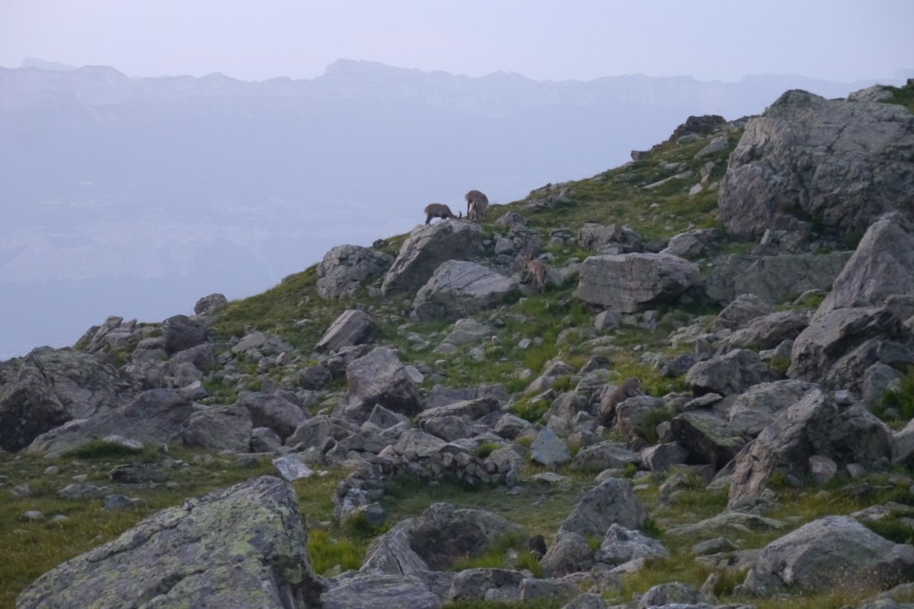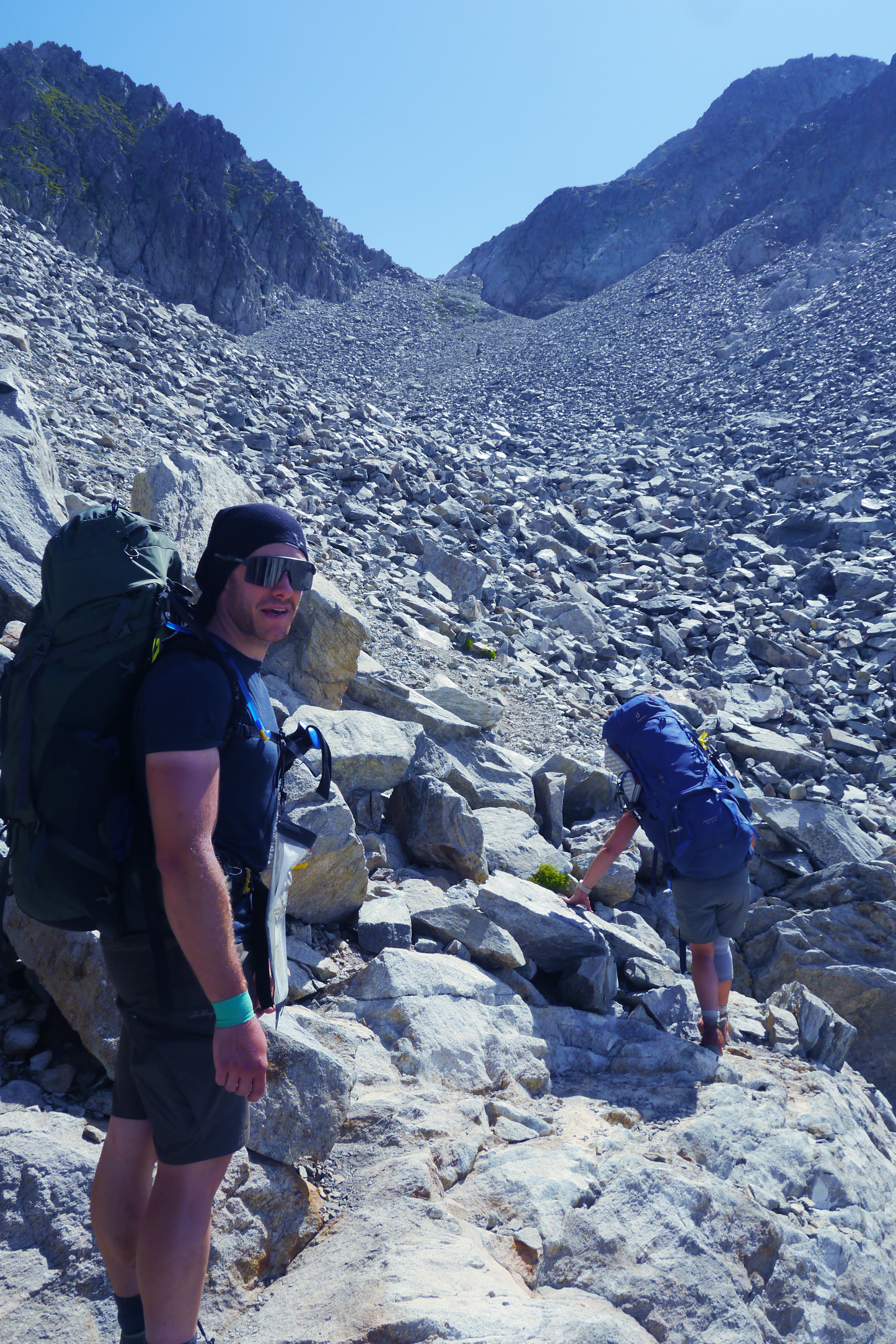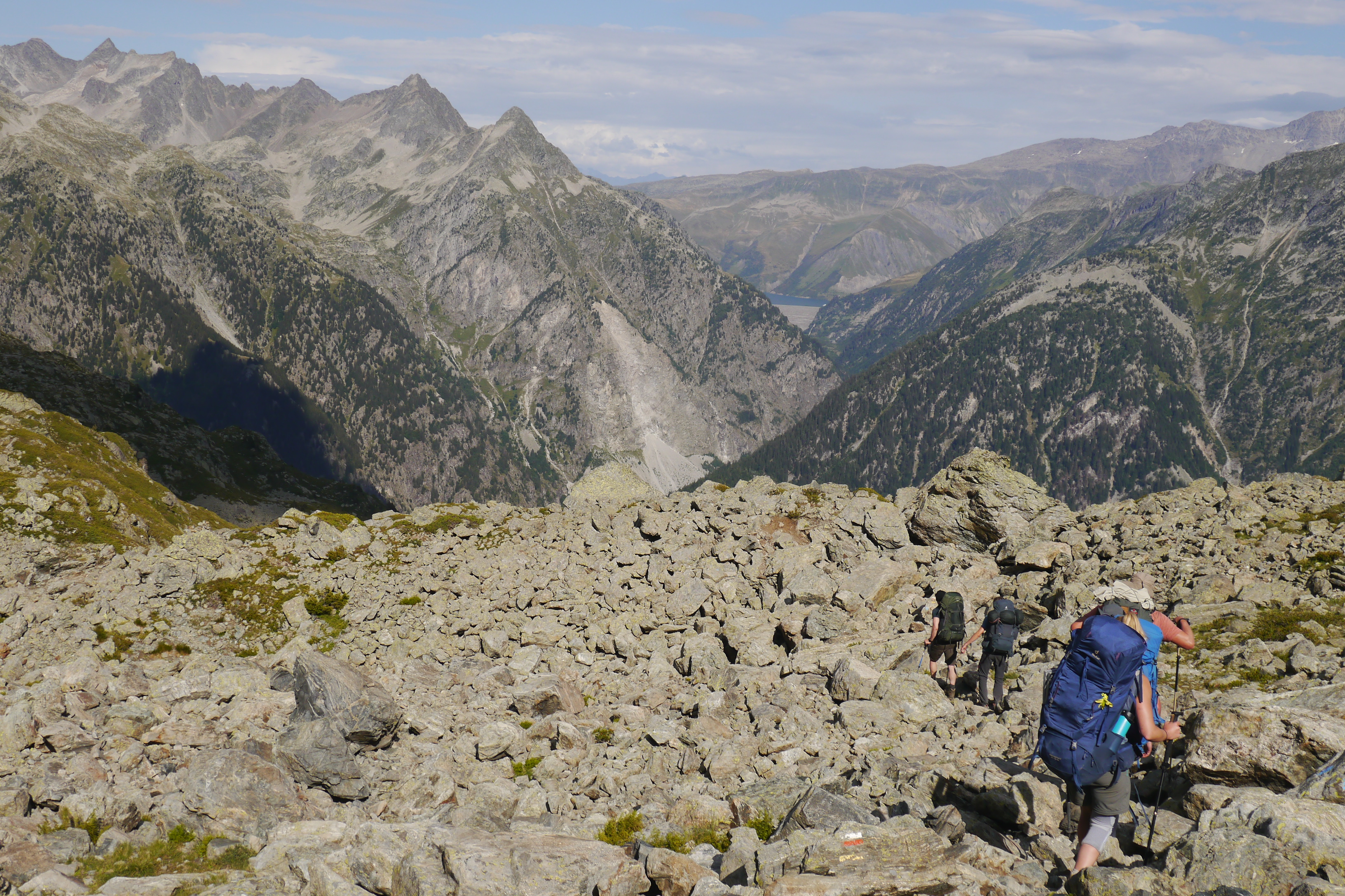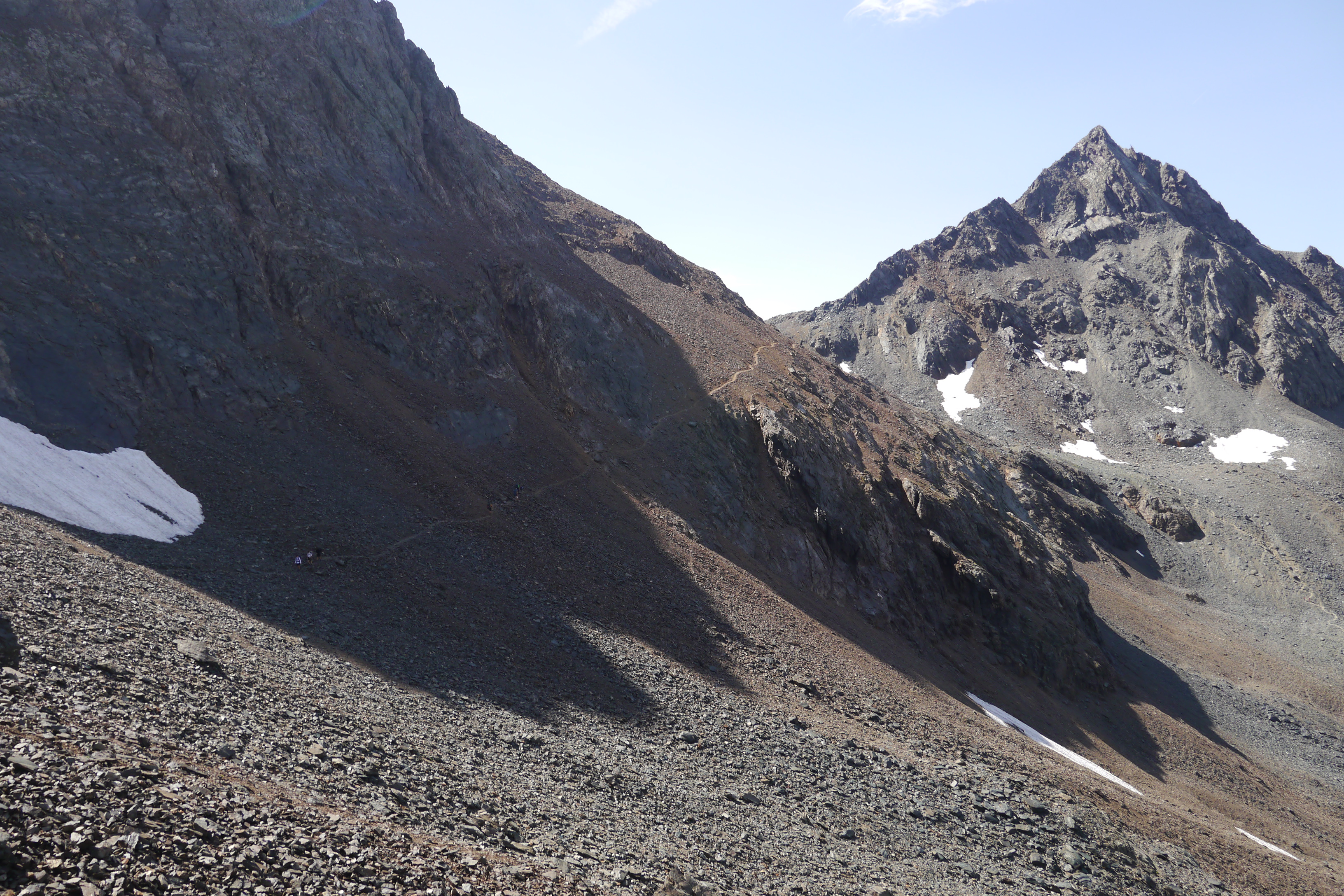 Als we wakker worden zijn we niet alleen. Naast de vele tentjes en tarps zijn ook enkele steenbokken rond de tenten aan het kijken naar wat wij met ons team aan het doen zijn op “hun” grasveldje. Rondvraag leert dat niet iedereen goed geslapen heeft maar goed, een nachtje doortrekken blijkt voor enkelen in de groep niet zo moeilijk leren we later. We maken samen een analyse van de route die we willen volgen. Matti loopt voorop en zorgt dat we vlot aan de voet van een puinhelling komen. Er is toch wel wat onzekerheid bij sommigen want die helling ziet er niet zo makkelijk uit. Door een korte briefing over valtechnieken, schuilen voor vallende stenen en een versnapering zijn we uitgerust als we aan de beklimming beginnen. We snijden een onderwerp aan waarover we met meerderen makkelijk kunnen babbelen en plots komt iemand tot de vaststelling dat we al 2/3e van de route omhoog gedaan hebben. “Die helling ziet er erger uit dan ze is” zegt Sofie. Matti, die we toch als onze topatleet mogen beschouwen, weet het tempo aangenaam te houden. Hij houdt een trage maar continue tred aan waardoor alles vlot gaat voor iedereen. Als er even gestopt wordt om met enkele andere Vlamingen te babbelen blijken dat Annelies en Jan te zijn, beiden geëngageerd binnen Hiking Advisor achter de schermen. Ze zijn de GR738 van de Belledonne in de andere richting (Noord naar Zuid) aan het volgen. Ze moeten nog één dag en dan zijn ze klaar. We nemen afscheid en gaan verder onder een brandende zon. Het is smeren en nog eens smeren.