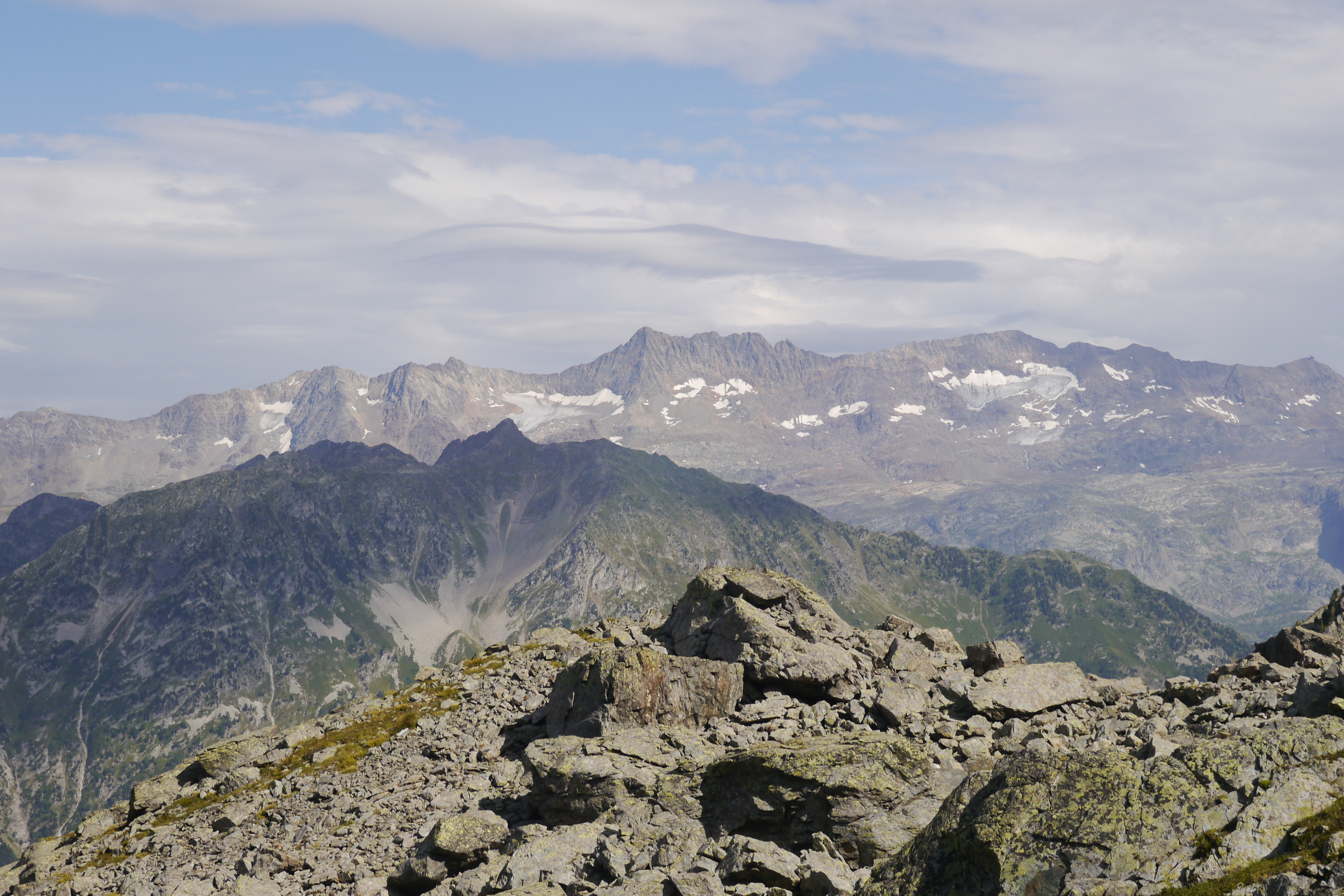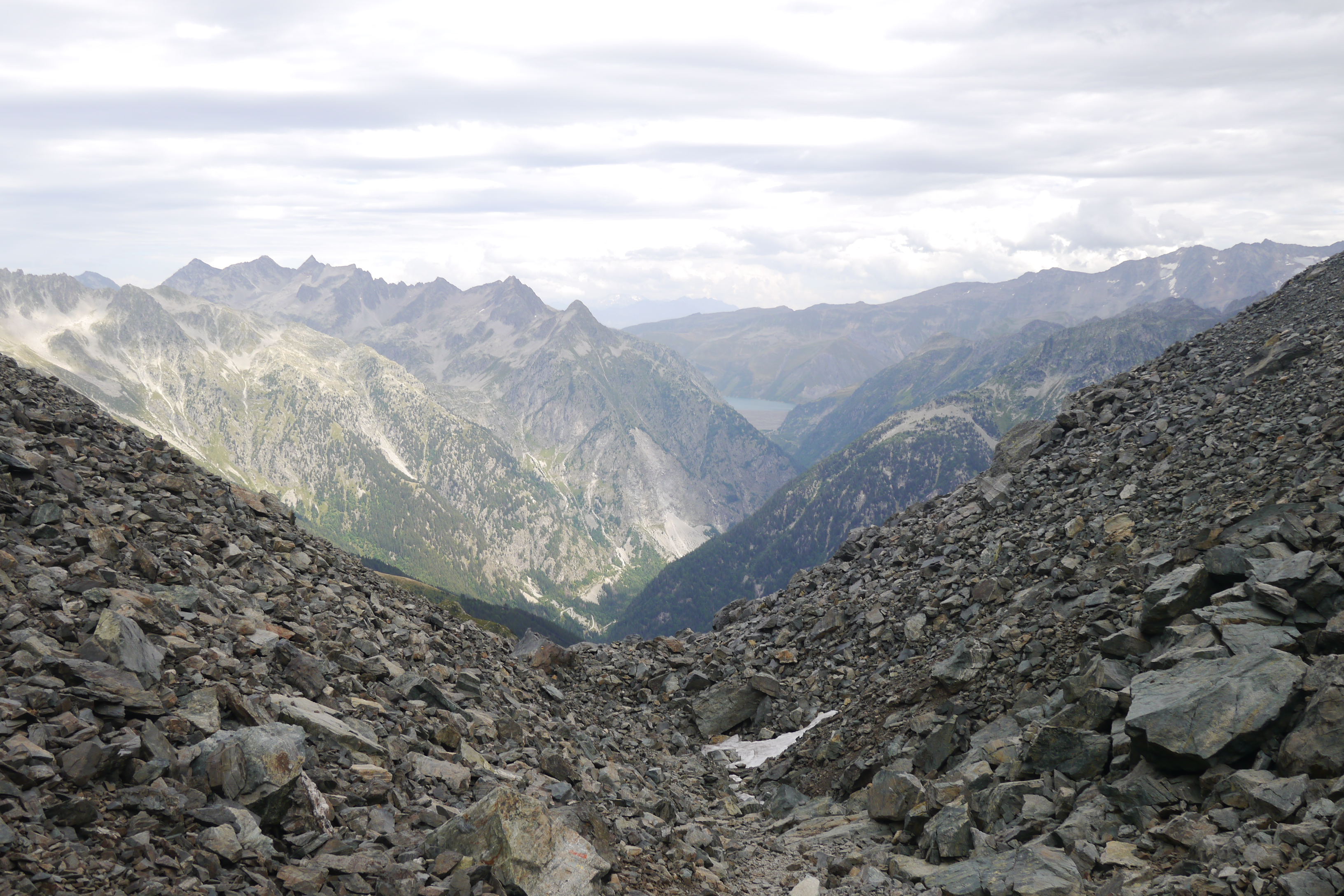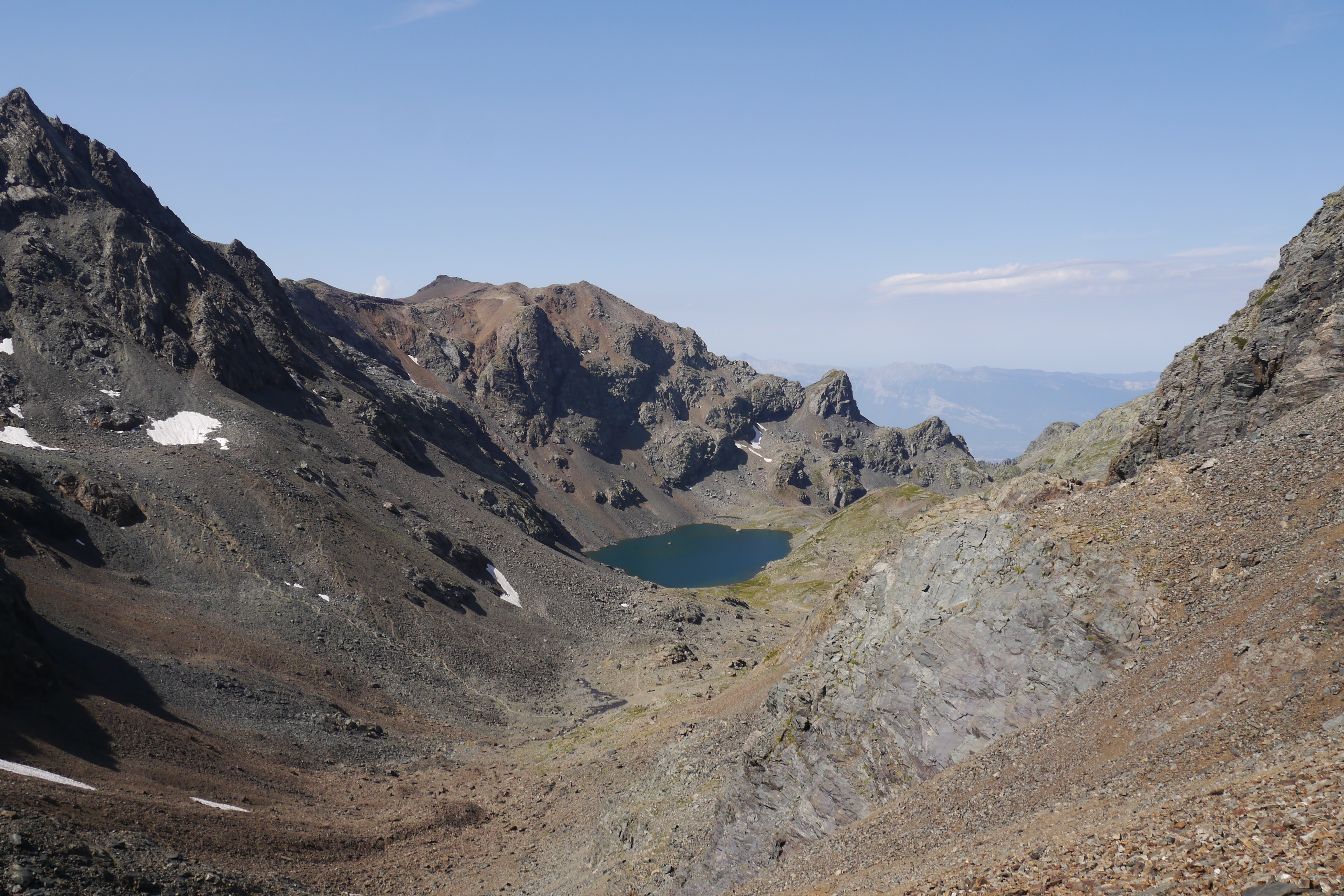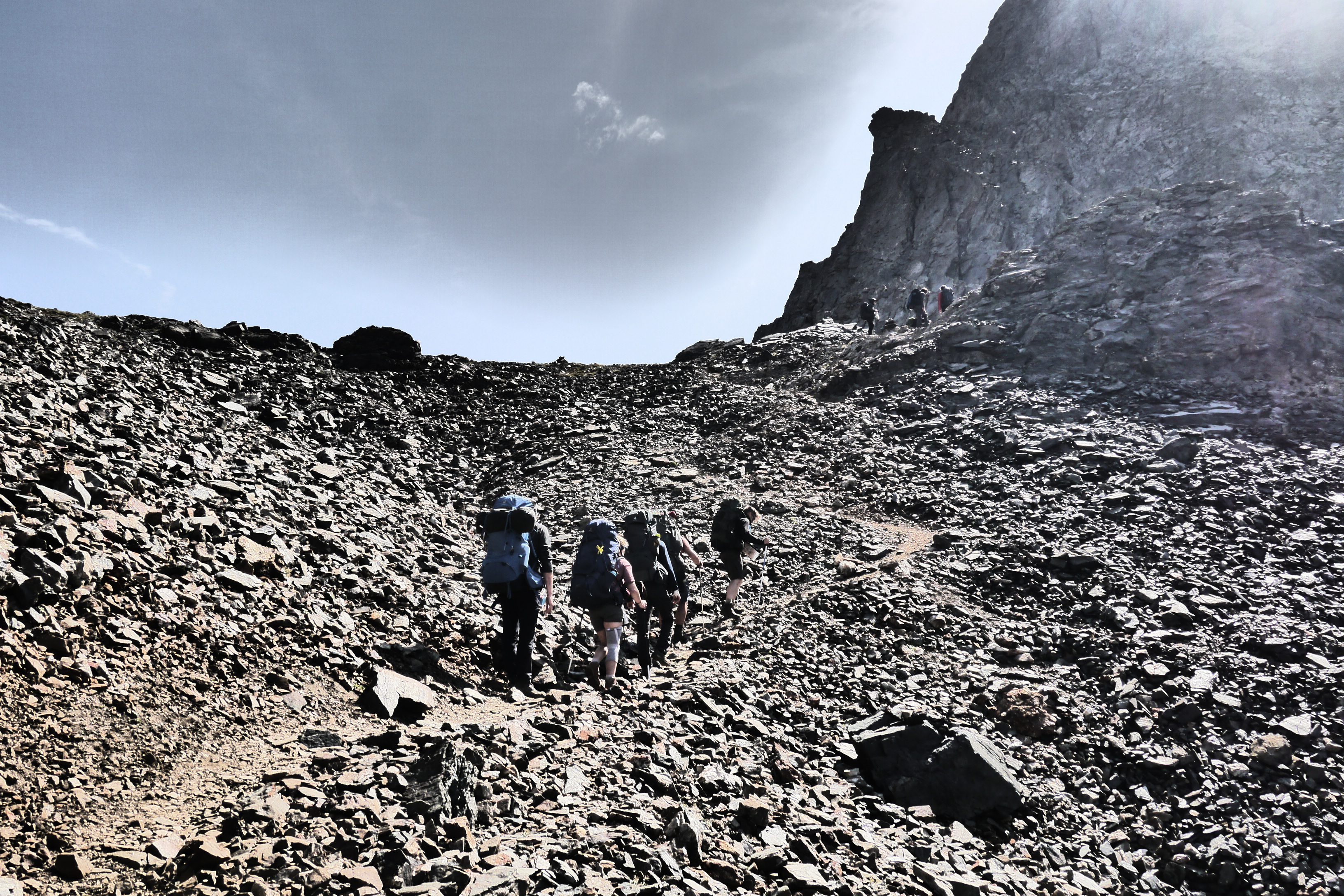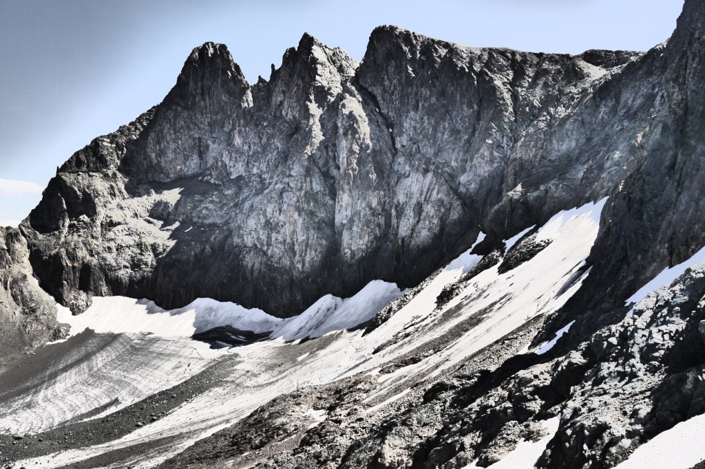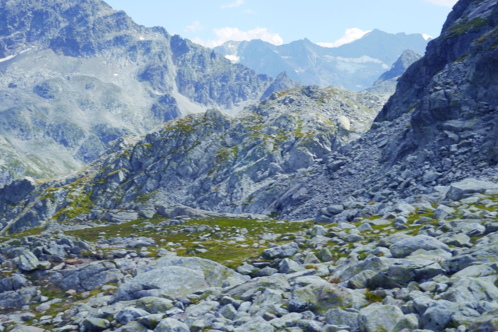 Als we wakker worden zijn we niet alleen. Naast de vele tentjes en tarps zijn ook enkele steenbokken rond de tenten aan het kijken naar wat wij met ons team aan het doen zijn op “hun” grasveldje. Rondvraag leert dat niet iedereen goed geslapen heeft maar goed, een nachtje doortrekken blijkt voor enkelen in de groep niet zo moeilijk leren we later. We maken samen een analyse van de route die we willen volgen. Matti loopt voorop en zorgt dat we vlot aan de voet van een puinhelling komen. Er is toch wel wat onzekerheid bij sommigen want die helling ziet er niet zo makkelijk uit. Door een korte briefing over valtechnieken, schuilen voor vallende stenen en een versnapering zijn we uitgerust als we aan de beklimming beginnen. We snijden een onderwerp aan waarover we met meerderen makkelijk kunnen babbelen en plots komt iemand tot de vaststelling dat we al 2/3e van de route omhoog gedaan hebben. “Die helling ziet er erger uit dan ze is” zegt Sofie. Matti, die we toch als onze topatleet mogen beschouwen, weet het tempo aangenaam te houden. Hij houdt een trage maar continue tred aan waardoor alles vlot gaat voor iedereen. Als er even gestopt wordt om met enkele andere Vlamingen te babbelen blijken dat Annelies en Jan te zijn, beiden geëngageerd binnen Hiking Advisor achter de schermen. Ze zijn de GR738 van de Belledonne in de andere richting (Noord naar Zuid) aan het volgen. Ze moeten nog één dag en dan zijn ze klaar. We nemen afscheid en gaan verder onder een brandende zon. Het is smeren en nog eens smeren.