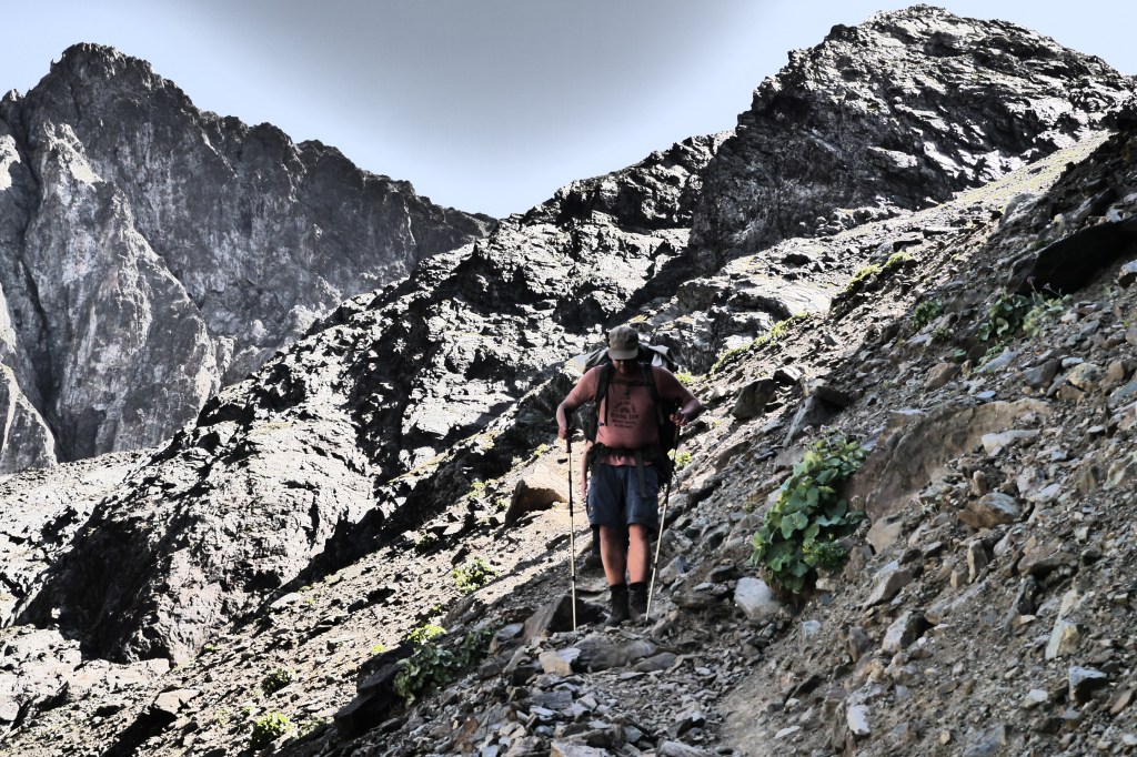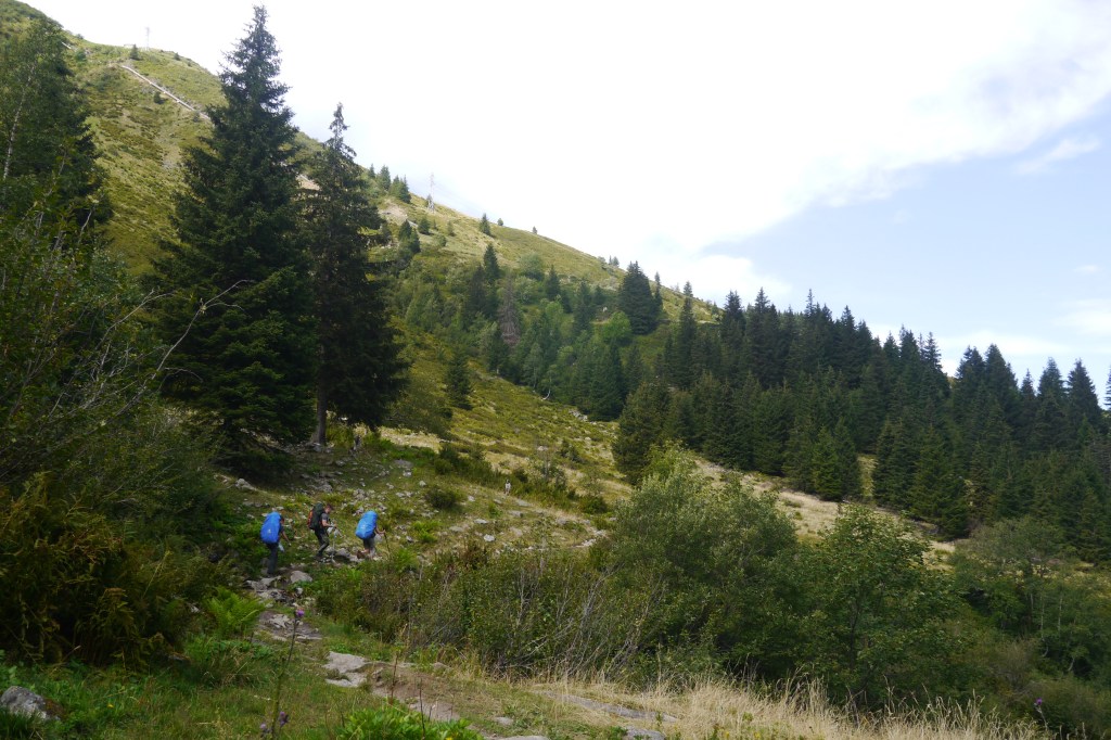Ik word wakker en merk dat Sofie rustig ligt te knorren langs me. Ik wil rustig opruimen en haal mijn materiaal onder de tarp uit. Terwijl ik iedereen wat later wil wekken en polsen hoe de nacht was regent het plots. Een goede bui maakt heel wat van mijn materiaal nat. Ik kruip terug onder de tarp en ruim op en ontbijt. Sofie ruimt ook op en ontbijt wat later na de bui. Ook Matti en Thibaut zijn klaar voor vertrek. Opnieuw wordt er een record gevestigd. Na “de meeste afvallers ooit”, “het meest eten tijdens een tocht (Matti)”, “het meest naar de WC gaan (ik noem geen naam ;))” slaagt Sofie erin om het record te breden om consequent niet op tijd klaar te zijn… Ach, we zijn het al gewoon. Chillax man zegt een stemmetje bij alle heren in het hoofd. Niet veel later zijn we toch op pad en het gaat vlot. We dalen zonder veel moeite 600m en houden een korte pauze. Onderweg komen de wilde verhalen uit de studententijd van de 3 senioren boven. Thibaut denkt er het zijne van… hij begint binnenkort aan zijn studie TEW in Antwerpen. Maar eerst nog even duiken met de rest van het gezin in Egypte… Genieten dat hij kan, hij is zich niet helemaal bewust dat hij met zijn gat in de boter gevallen is denk ik.