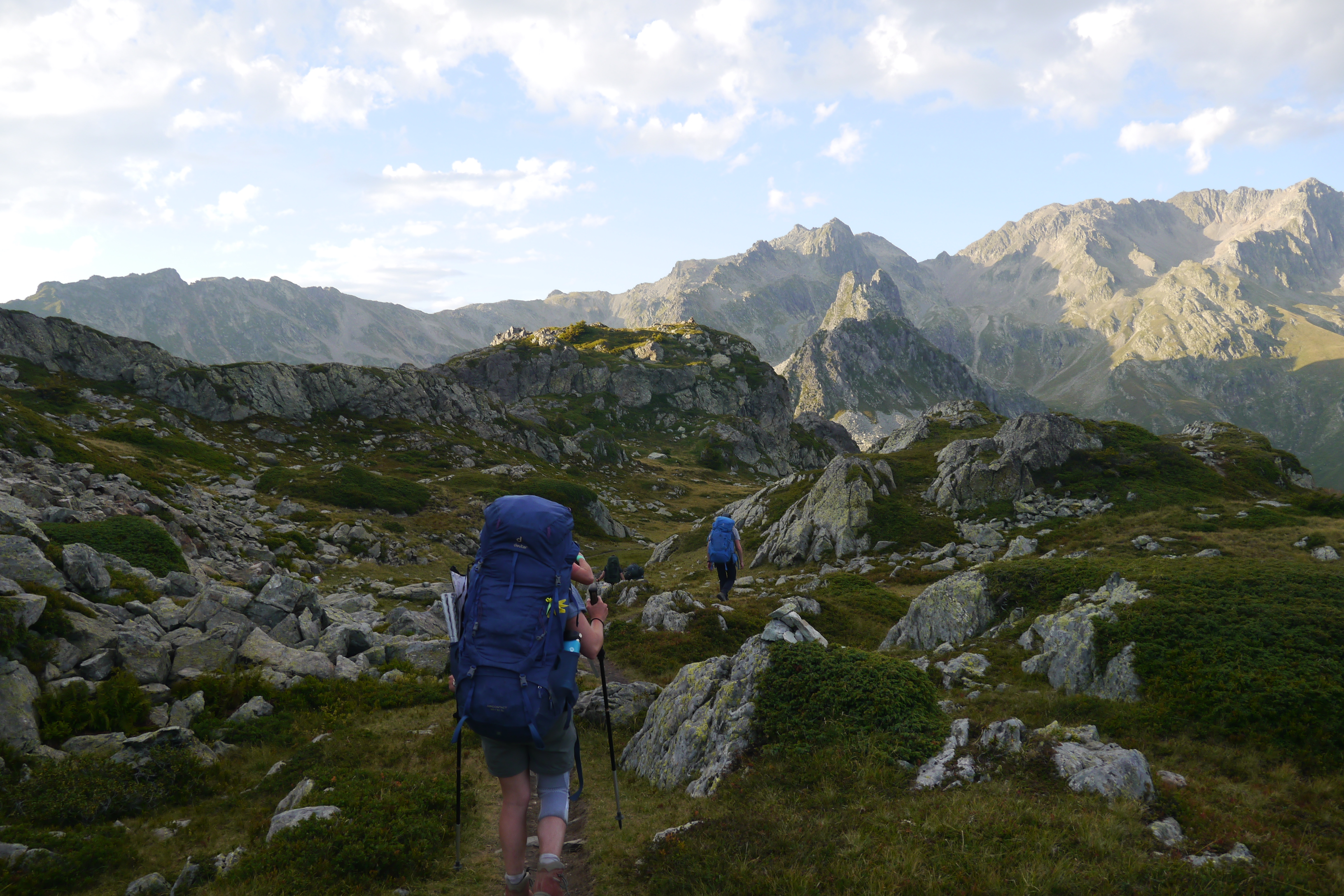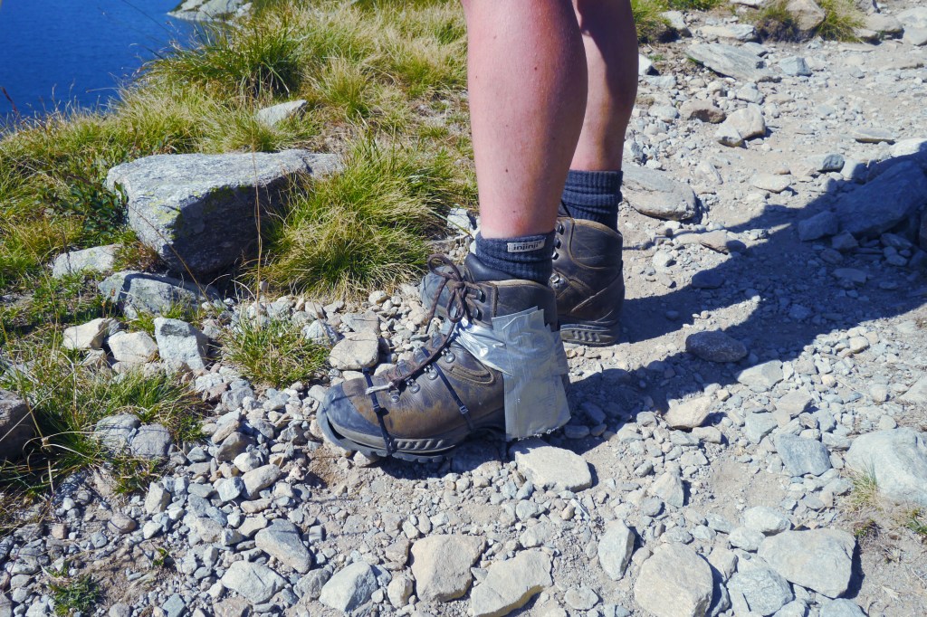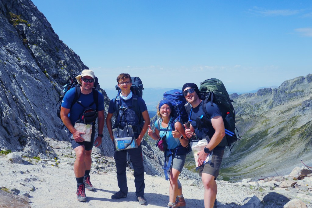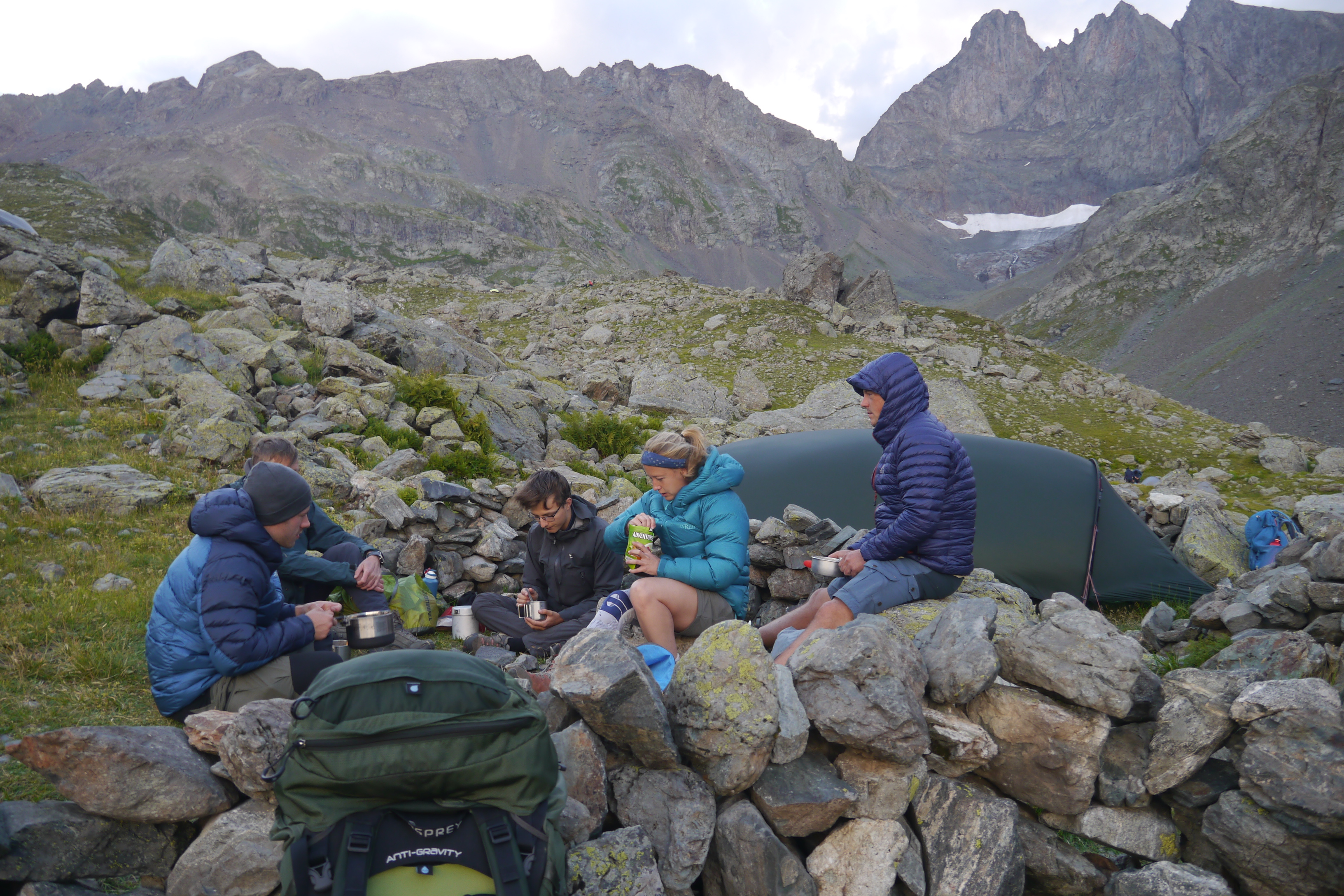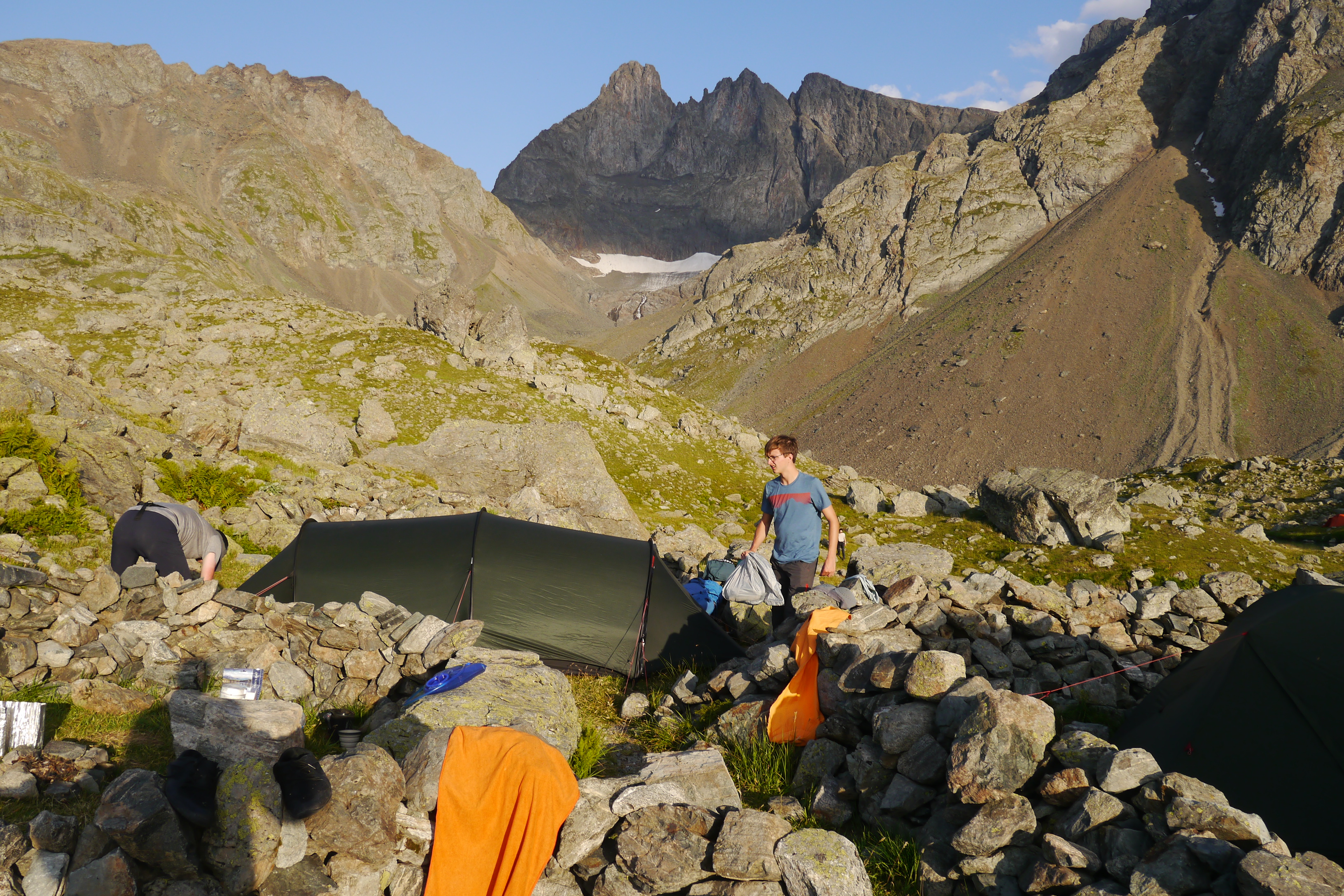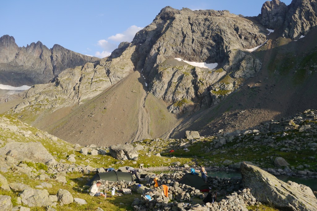 We gaan verder afdalen en dat zint Nick niet. Dit is niet zijn terrein. Helaas blijkt dit ook als hij plots kop voorop vooruit valt. Gelukkig valt hij niet op zijn hoofd maar helaas kwetst hij zijn pols en onderarm. We pauzeren even en Matti zet een verstevigende kineseotape. We gaan rustig verder maar het is nog lang want het pad gaat over blokkenvelden, door alpenweides en een variatie van de twee. Het tempo daalt drastisch maar gelukkig hebben we lang licht. Als we aankomen rond 20u is duidelijk dat Nick twijfelt over de komende dagen. Er staat een steile helling op het programma. We bespreken even zijn opties en hij belt even met het thuisfront. Hij beslist om er een nachtje over te slapen. In mijn ogen de beste optie. We zuiveren water en zetten de tentjes op. Ik slaap onder de blote hemel en geniet al van de sterren terwijl ik mijn maaltijd kook terwijl de nacht valt. Opnieuw zien we Matti zonder mooite menig kcal binnenspelen en terwijl nog aangeven “ik heb echt nog honger”. Thibaut was het laatste uurtje hangry maar slaagde erin om dat goed te verbergen. Iedereen is blij met het eten en de desserts. Er wordt een massagetrein opgestart maar ik heb nog water te koken… ik hou namelijk niet zo van dat met chloordruppels gezuiverde water. Niet veel later kruip ik ook onder de wol. Het wordt een goede nacht want er is amper wind. Ideaal om cowboystyle onder de blote hemel te slapen.
