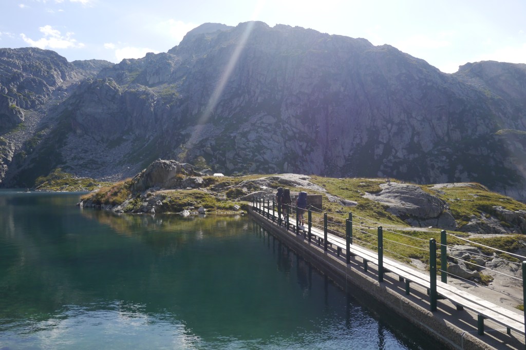 Als we beneden aankomen doen we meteen een noodsimulatie. Thibaut doet het als de besten: gestructureerd, vlot en gefaseerd. Matti en Sofie hebben reeds wat ervaring met nooddiensten in stedelijke context maar beseffen pas later dat ze in de bergen de enige optie zijn voor hun (in dit geval gesimuleerde) slachtoffer. En dat vergt vlotheid! Als wat later in de oefening plots de naam van het slachtoffer gevraagd wordt… dan gaat alles ineens sneller. We debriefen na de simulatie en wandelen op een vlot tempo langs de meren van Massif D’Allevard, ook wel gekend als les Sept Laux. Het is nog een eindje tot aan de refuge des Sept Laux ou Jacqueline Mathieu. We installeren ons in de zon en zoals zo vaak bij een langere pauze doe ik mijn schoenen en sokken uit. Ik bestel op blote voeten wat drankjes en de lokale tarte de myrtilles. We smullen ervan en kijken hoe een legercompagnie met zware bepakking en lange broeken langs de meren trekt… dat moet warm zijn! We ruimen op, vullen de waterzakken aan en trekken naar onze bivakplek wat verderop. We installeren ons op een eilandje tussen de stuwen van het meer. We hopen opnieuw op een sterrenhemel deze nacht en zetten dus geen tenten op maar leggen alles klaar om onder de blote hemel te liggen.