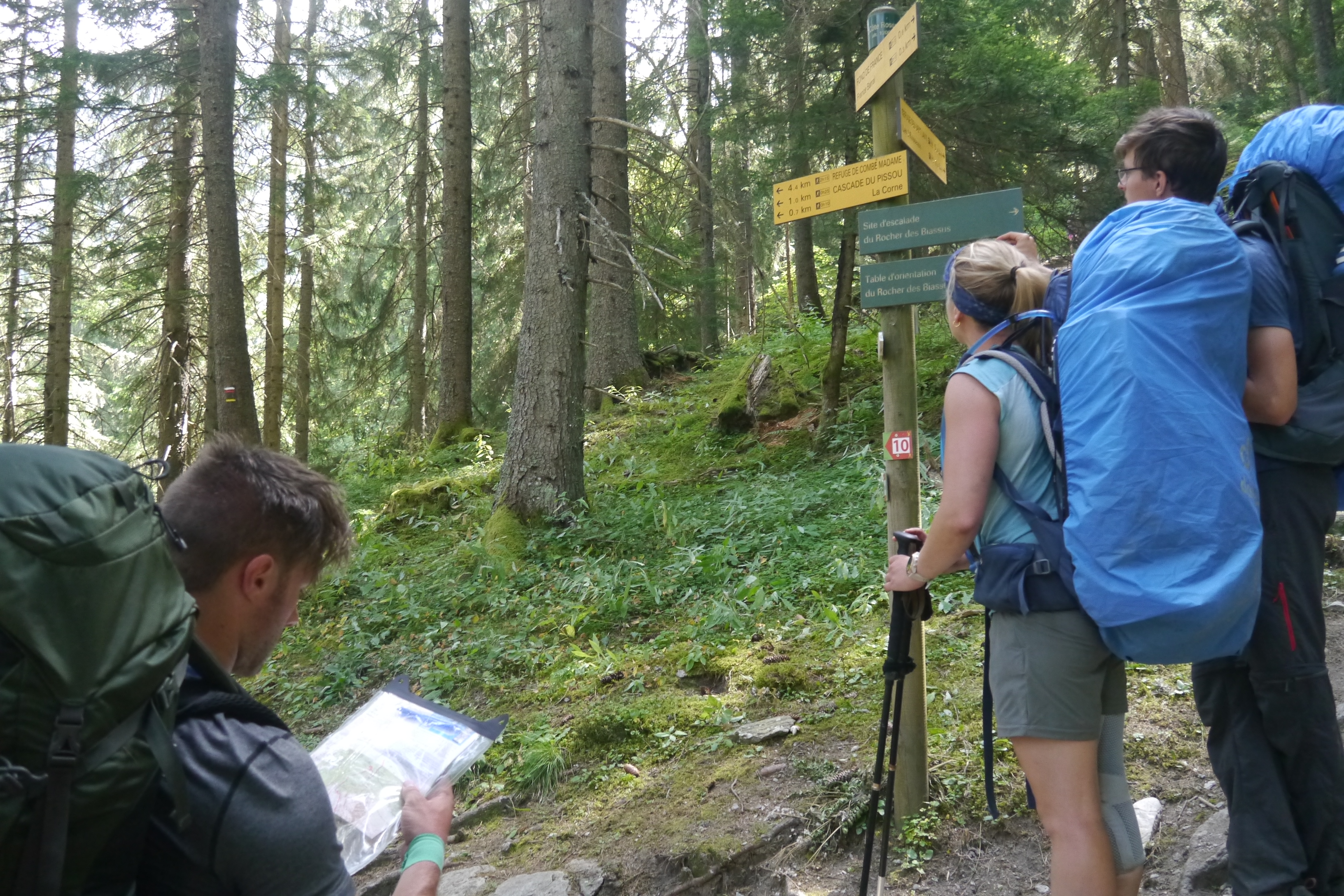 Om iedereen de meerwaarde van markante punten en azimut (kompas ingesteld op specifieke graden om je marsrichting aan te houden) te laten ervaren mag iedereen starten met de info uit het eigen marsplan. Matti merkt al snel op dat hij gewoon de afgrond zou inlopen als hij dat secuur zou volgen. Thibaut, Sofie en Gert zitten wel in de goede richting. We dalen verder en het tempo gaat omhoog. We komen op een kruising en beginnen nu aan de klim naar de Refuge Jean Collet op 1942m hoogte. Terwijl de watervoorraden aangevuld worden koop ik nog even een twix en informeer naar het weer bij de wirt. “Il fait beau, tous les jours” is de reactie. Ze heeft het wel nagevraagd, of ze deed toch alsof ;). Ik kijk toe terwijl de groep een kruispeiling uitvoert. Het is een beetje sadistisch als ik soms vraag “ben je zeker van dat punt” om hen aan het twijfelen te brengen. Maar goed, iedereen heeft de techniek beet en dat is wat telt. Opnieuw gaan we omhoog en opnieuw zorgt Thibaut voor een prima tempo in de categorie dead slow. Zo geraken we vlot op grotere hoogte en al snel komen we schapen tegen… Oei, mogen we daar wel door? Natuurlijk maar dicht aansluitend op een rustig tempo zodat de schapen ruimte krijgen om aan de kant te gaan. We stijgen tot aan de Col de la Mine de Fer op 2400m hoogte. We nuttigen de lunch en als het even kan mag iedereen een UTM-locatie bepalen.