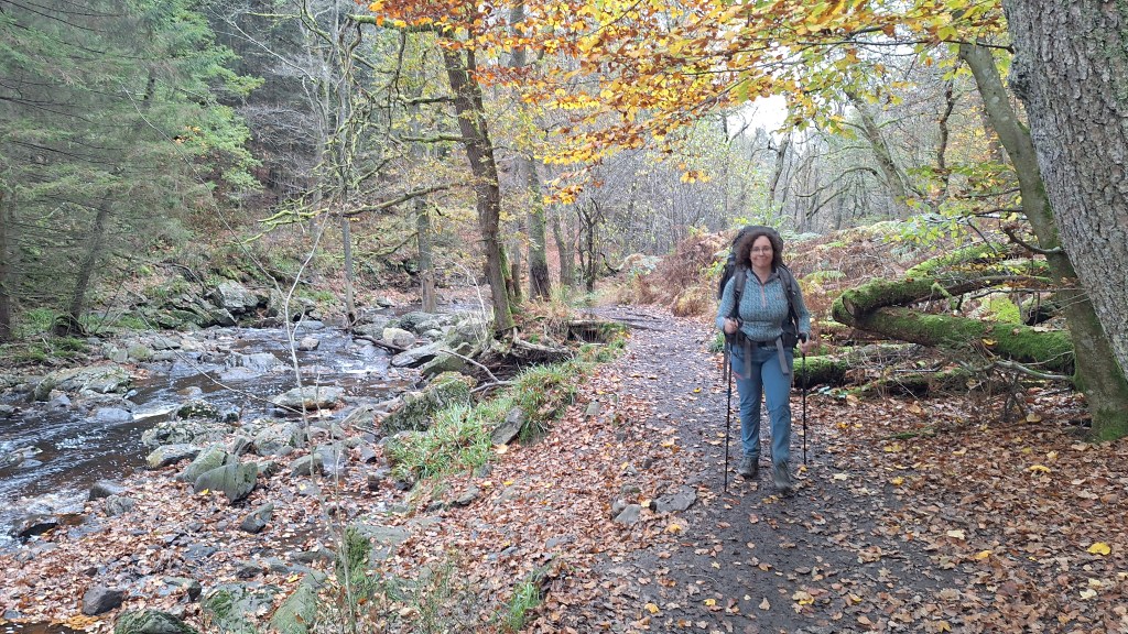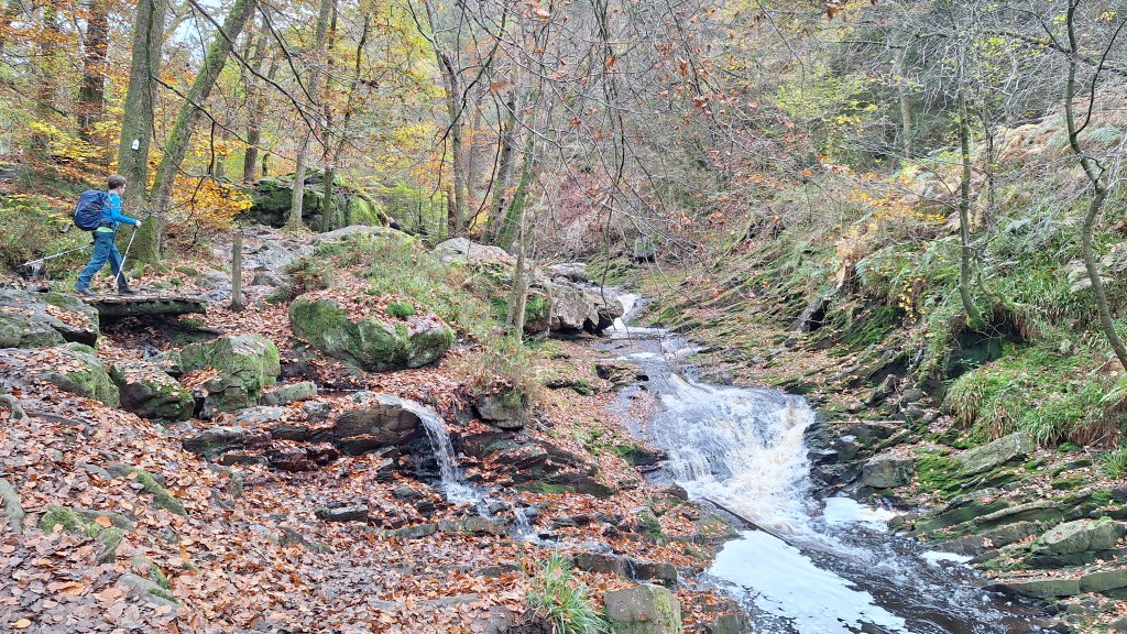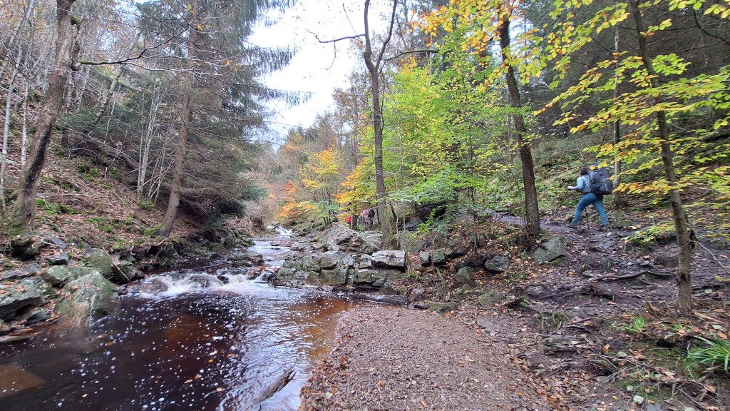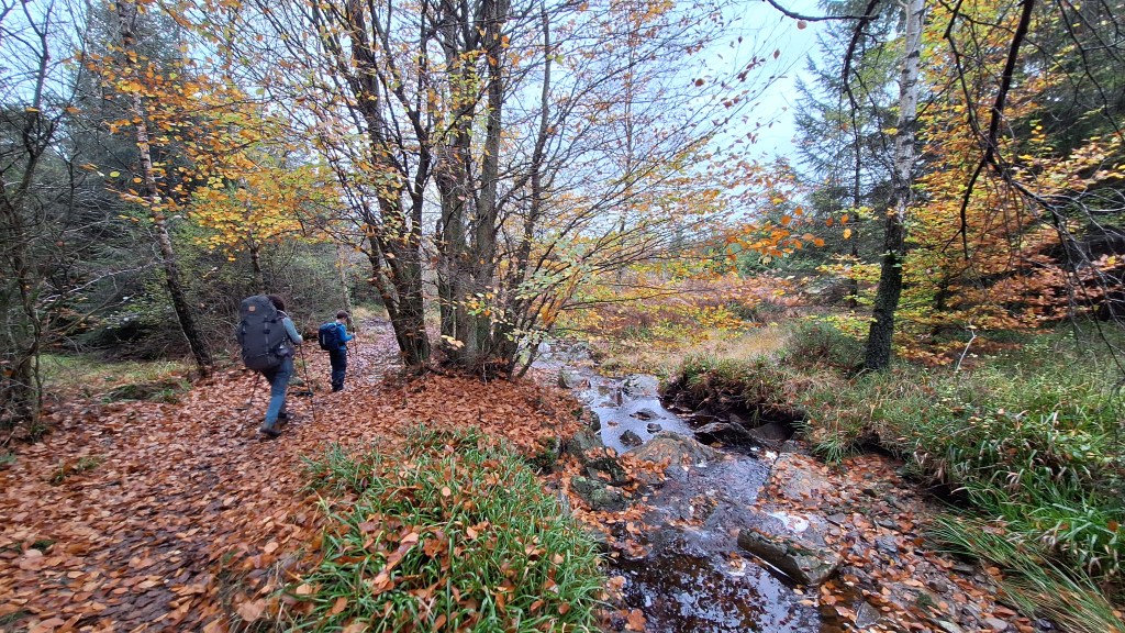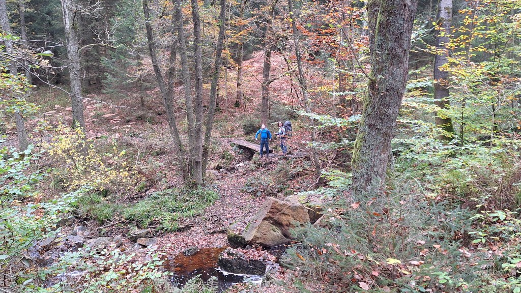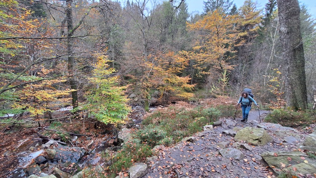 Nabij Wihonfagne slaan we af in westelijke richting om dan meteen terug in noordoostelijke richting een breed pad op te pikken. Het zijn modderige paadjes maar hey, dat zijn de venen hé. Er staat langs een breed pad een hutje met afdak en een fijne geïmproviseerde bank die wij benutten voor onze vroege lunch. Als we aan het opruimen zijn komt er een vader met zoon bij zitten om te picknicken. Gezelligheid is troef maar wij gaan toch maar rustig verder. Het brede pad gaat via een smalle doorsteek terug op in La Vécquée. We zoeken een afslag in zuidoostelijke richting maar dat blijkt privéterrein. We gaan dus nog eventjes verder om dan af te slaan via Les Mousseux aan de Ruisseau de Herbôfaye waar er een prachtig hutje staat, waarschijnlijk privé-eigendom. Nu volgen we de beek in zuidwestelijke richting tot ze overgaat in de Hoëgne. We misten een afslag waardoor we een kleine 500m te ver uitkomen. De rivier oversteken zou misschien wel lukken maar de kans op natte voeten of erger is groot. We besluiten toch maar even terug te keren en zien dan een smal pad naar de beek gaan. Met lichte hoop op een brugje komen we er snel achter dat het springen zal worden. We kijken wat hogerop de beek en zien dat we daar over enkele stenen kunnen stappen om de oversteek te wagen. Dat verloopt veel vlotter dan gedacht. We trekken nu verder over een smal langs de beek slingerend paadje. Zeer mooi met her en der een stroomversnelling en vallende goudgele of oranje bladeren van de bomen.
