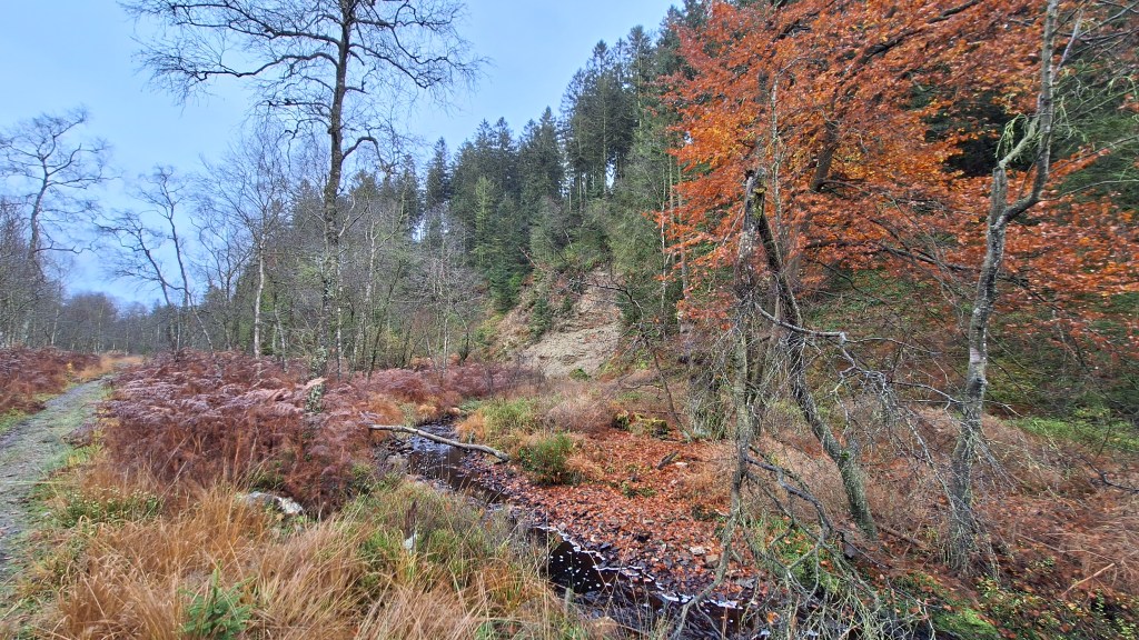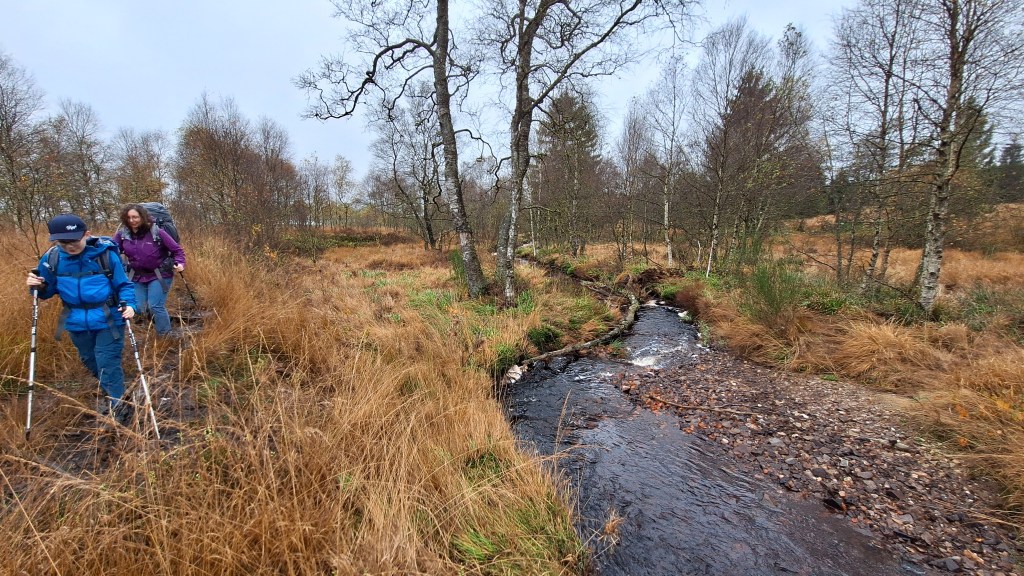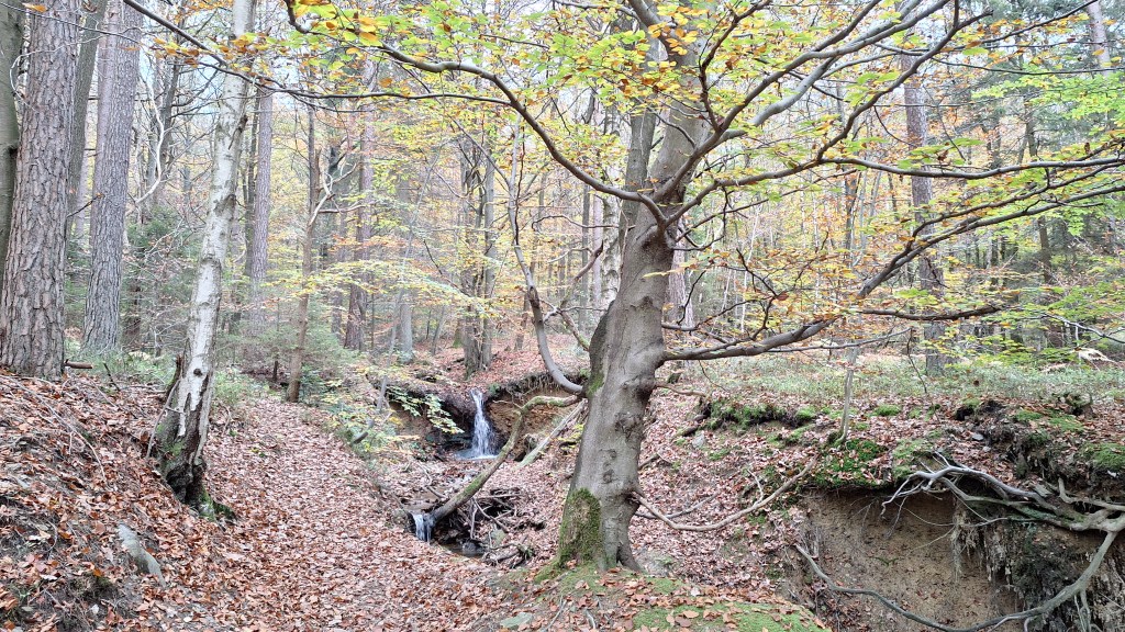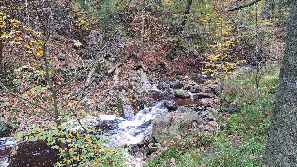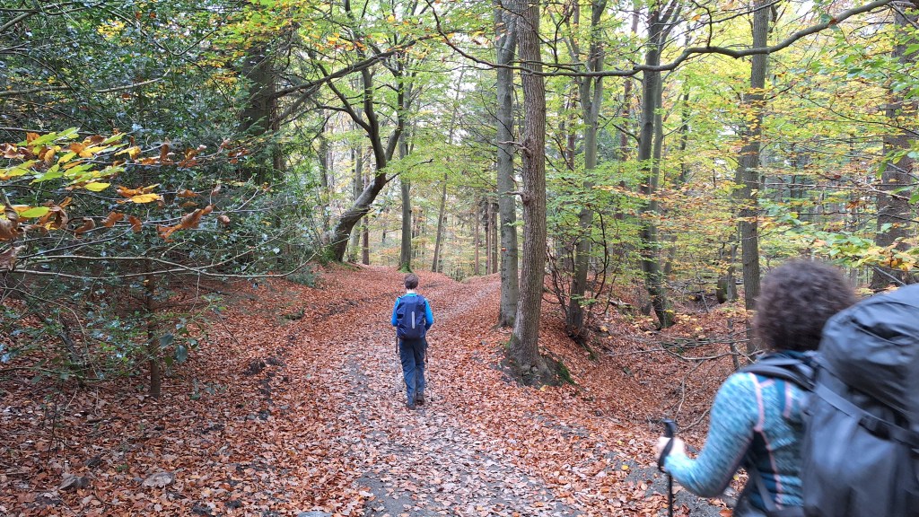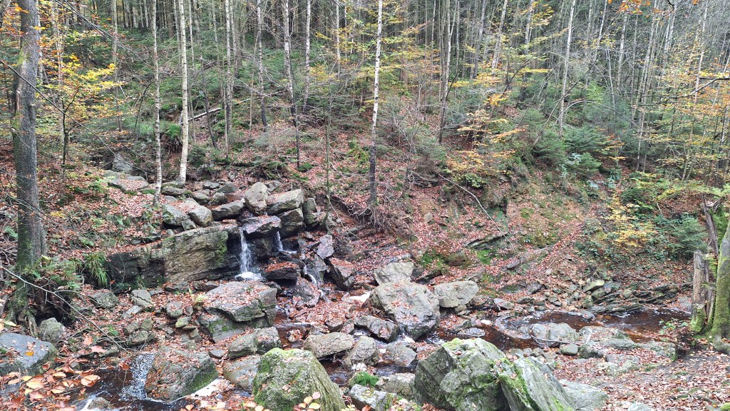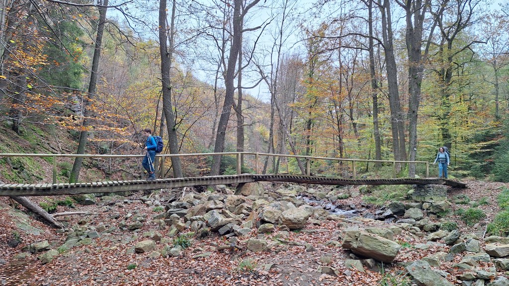 Nabij Wihonfagne slaan we af in westelijke richting om dan meteen terug in noordoostelijke richting een breed pad op te pikken. Het zijn modderige paadjes maar hey, dat zijn de venen hé. Er staat langs een breed pad een hutje met afdak en een fijne geïmproviseerde bank die wij benutten voor onze vroege lunch. Als we aan het opruimen zijn komt er een vader met zoon bij zitten om te picknicken. Gezelligheid is troef maar wij gaan toch maar rustig verder. Het brede pad gaat via een smalle doorsteek terug op in La Vécquée. We zoeken een afslag in zuidoostelijke richting maar dat blijkt privéterrein. We gaan dus nog eventjes verder om dan af te slaan via Les Mousseux aan de Ruisseau de Herbôfaye waar er een prachtig hutje staat, waarschijnlijk privé-eigendom. Nu volgen we de beek in zuidwestelijke richting tot ze overgaat in de Hoëgne. We misten een afslag waardoor we een kleine 500m te ver uitkomen. De rivier oversteken zou misschien wel lukken maar de kans op natte voeten of erger is groot. We besluiten toch maar even terug te keren en zien dan een smal pad naar de beek gaan. Met lichte hoop op een brugje komen we er snel achter dat het springen zal worden. We kijken wat hogerop de beek en zien dat we daar over enkele stenen kunnen stappen om de oversteek te wagen. Dat verloopt veel vlotter dan gedacht. We trekken nu verder over een smal langs de beek slingerend paadje. Zeer mooi met her en der een stroomversnelling en vallende goudgele of oranje bladeren van de bomen.
