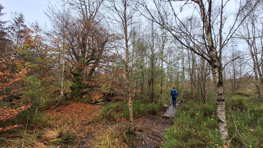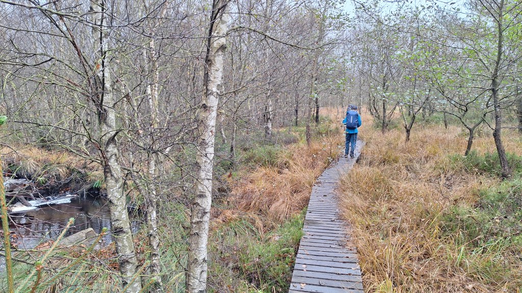 We kunnen met een brugje de Poleur oversteken en wandelen tot aan een hutje voor nog een korte pauze. We eten er een tussendoortje. Louis is het eventjes wat beu omdat het miezert en de rugzak op zijn schouders toch wel begint te storen. Het is dan ook alweer eventjes geleden dat hij een rugzak op had tijdens het wandelen. Trainen jongen, trainen… dat komt wel weer goed en met die te vrolijke noot gaan we verder. We duiken nu de Venen in via Fagne de la Poleur waar het ene vlonderpaadje na het andere volgt. We naderen nu de Baraque Michel en dat is eraan te merken: veel meer volk. Als we er iets willen drinken worden er ook meteen een dame blanche en coupe bresilienne mee besteld. Het smaakt blijkbaar en na een welverdiende pauze gaan we op pad voor een laatste uurtje wandelen.