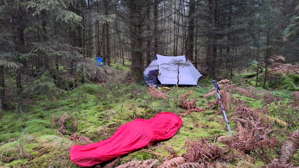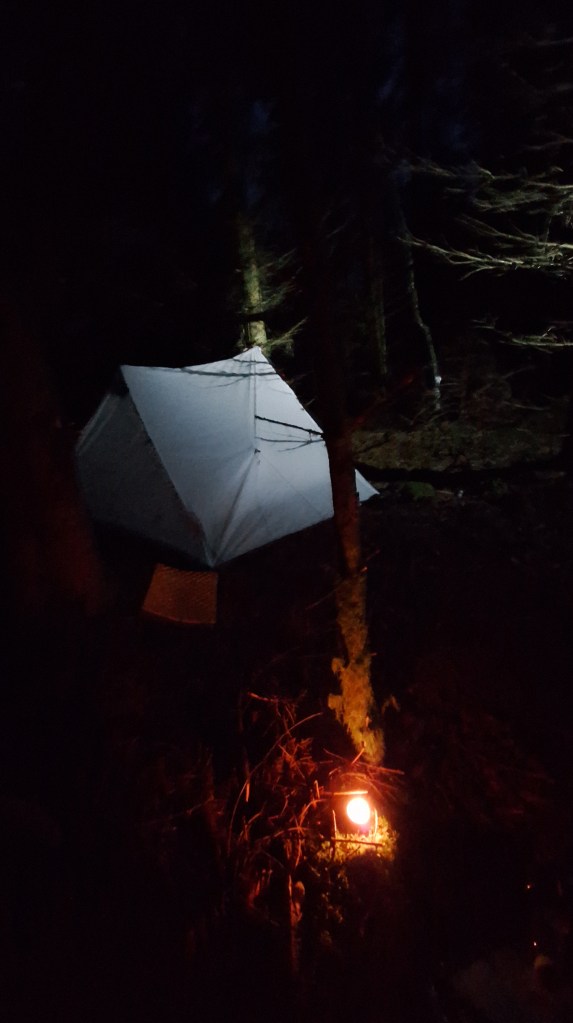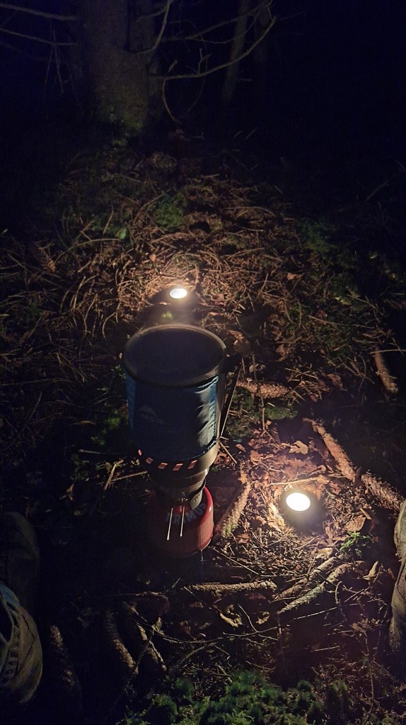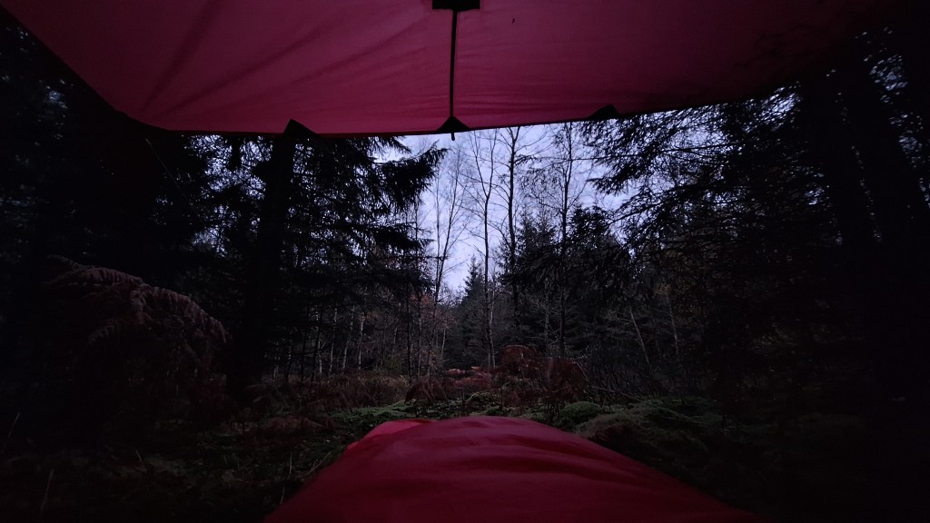 We trekken via een aangelegd pad door de venen van Herbôfaye en slaan na een kleine anderhalve kilometer af naar Noû Gotte om dan niet veel verder een smal padje door de bossen op te pikken. Het is langs de Statte dat het modderige pad slingert. De schemer valt dus we zoeken een bivakplekje. Het gaat vlot om de tarptent en de bivakzak te installeren voor de nacht. Theelichtjes zorgen voor wat licht en gezelligheid. We eten wat en niet veel na het donker worden kruipen we onder de wol. Allez, slaapzacht zeggen om 20u, het heeft wat hé.
