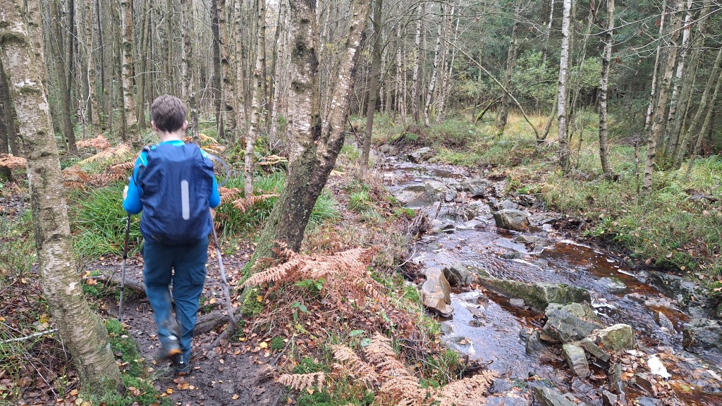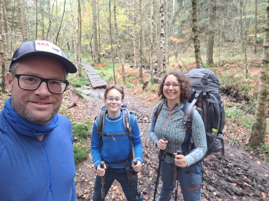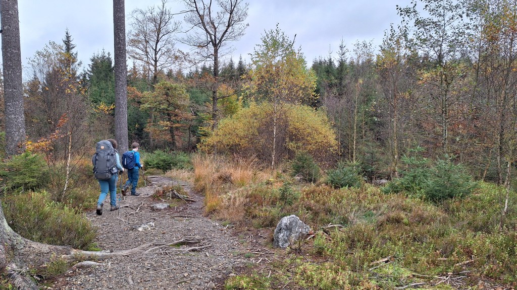 Louis heeft ondertussen een heel verhaal afgestoken over een projectje waarbij we een wagen gaan nabouwen: moet elektrisch aangestuurd worden, geen vitessen maar wel gas kunnen geven en kunnen remmen, afwerking in de stijl van een Porsche… en lichtjes onderaan de wagen. Moet niet per se op de openbare weg kunnen rijden maar is wel nice to have… Ja wadde: dat wordt plannen komende periode om alle materiaal bijeen te sprokkelen. Wel leuk zo’n creatieve geest mee op pad hebben. We doorkruisen ondertussen Solwaster en het vat is wat af bij Louis: zijn voeten doen wat pijn, de rugzak begint zwaar te worden op zijn schouders… We pauzeren nog eventjes en dalen niet veel later via Fagnou Gros Pierre af naar Belleheid. Hier is het druk. “Natuurlijk” denk je dan, “dat is de meest bezochte wandeling naast een rivier in de Hoge Venen…” Ja, dat is zo maar het blijft wel mooi en dus volgen wij het mooie pad langs de Hoëgne. Helaas slingert het pad vaak en maakt het Louis niet echt blijer. De inspanningen van de voorbije dag en voormiddag beginnen te wegen. Wat lekkers, in de vorm van Maltezers, gaat goed naar binnen. We doen nog een laatste effortke en komen zo uiteindelijk aan onze startplek. Louis is blij als hij zich in de wagen mag zetten. Cynthia ook. Het heeft ons deugd gedaan. Zelfs Louis kan er vrede mee nemen dat het wel de moeite was om er nog eens op uit te trekken. Meestal vergt dat meer avontuur, steiler terrein of meer gametijd… maar dat viel nu allemaal heel goed mee. Hij content, wij content.