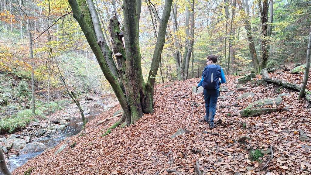 De nacht verloopt rustig, of voor mij toch. Cynthia en Louis wisselen ’s nachts nog even van slaapzak: de ene had het te warm, de andere te koud… Om 8u kruipen we uit de slaapzakken, ruimen op en ontbijten wat. We gaan opnieuw op pad en Louis is goedgehumeurd. Ah ja, hij heeft een half uurtje kunnen gamen. Ideaal om de dag te starten volgens een 11-jarige. Het paadje is prachtig: wisselend van open plekken tot naaldwoud over herfsttaferelen in loofwoud… en zo gaat de hele voormiddag eigenlijk verder. We komen nu op een meer bewandeld pad langs de Statte en passeren de Grand Pierrier de la Statte, de bekende Cascade des Nuttons om dan over te steken aan de Rochers de Bilisse.