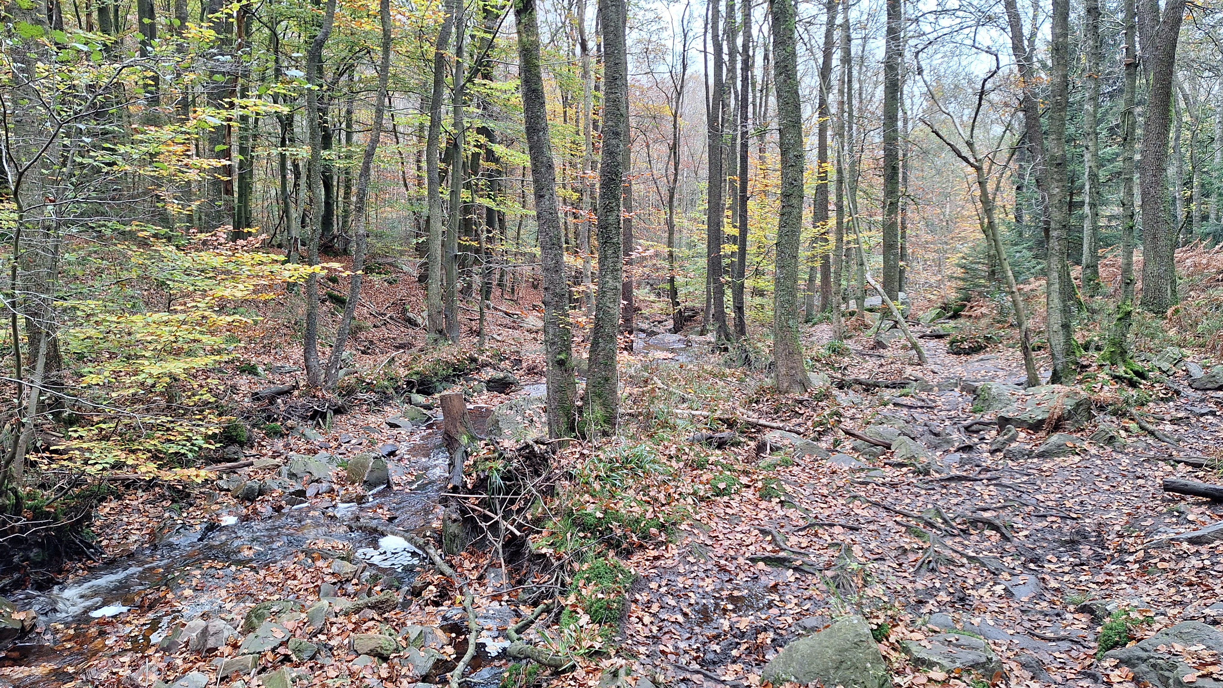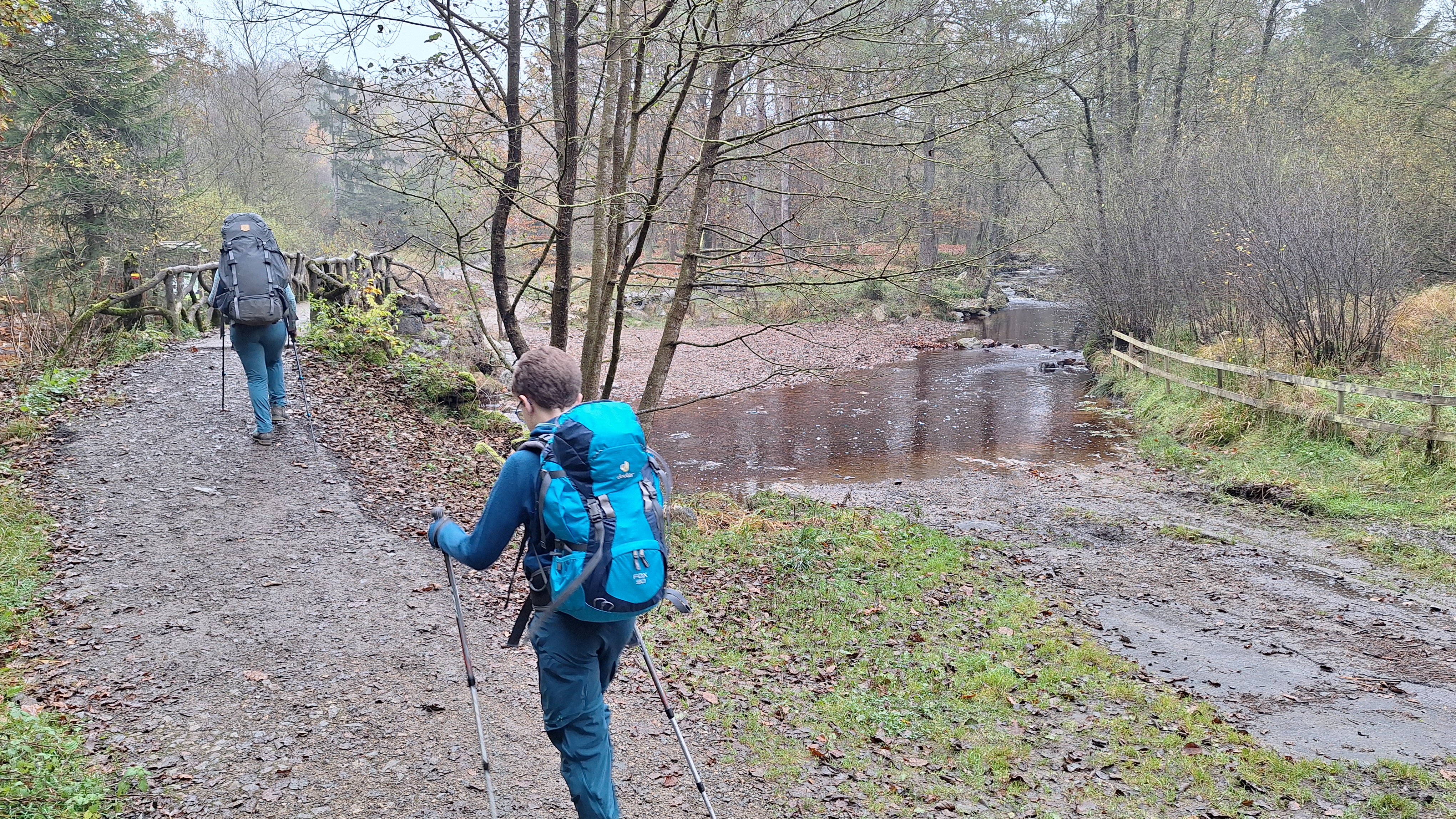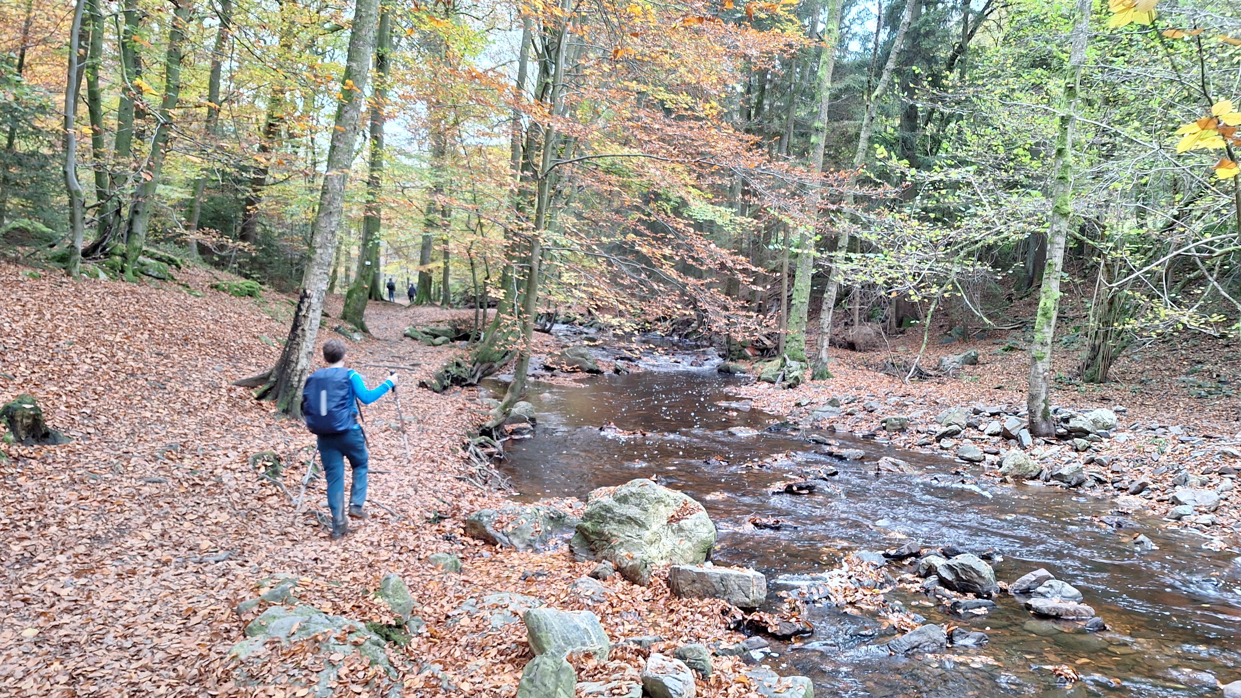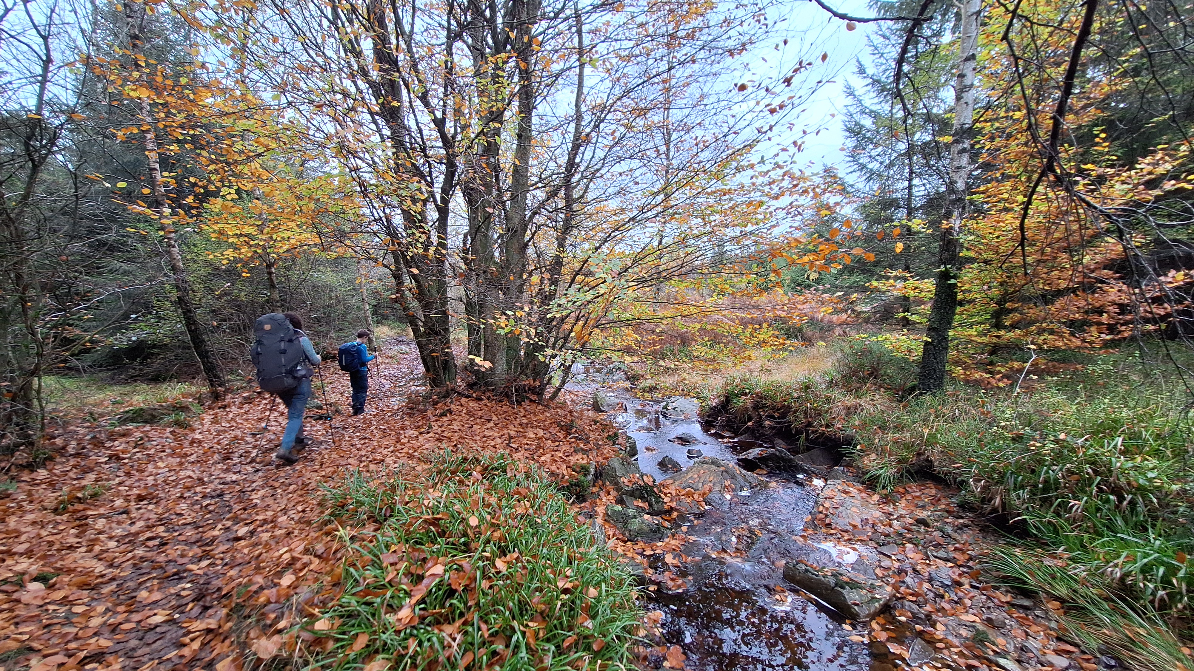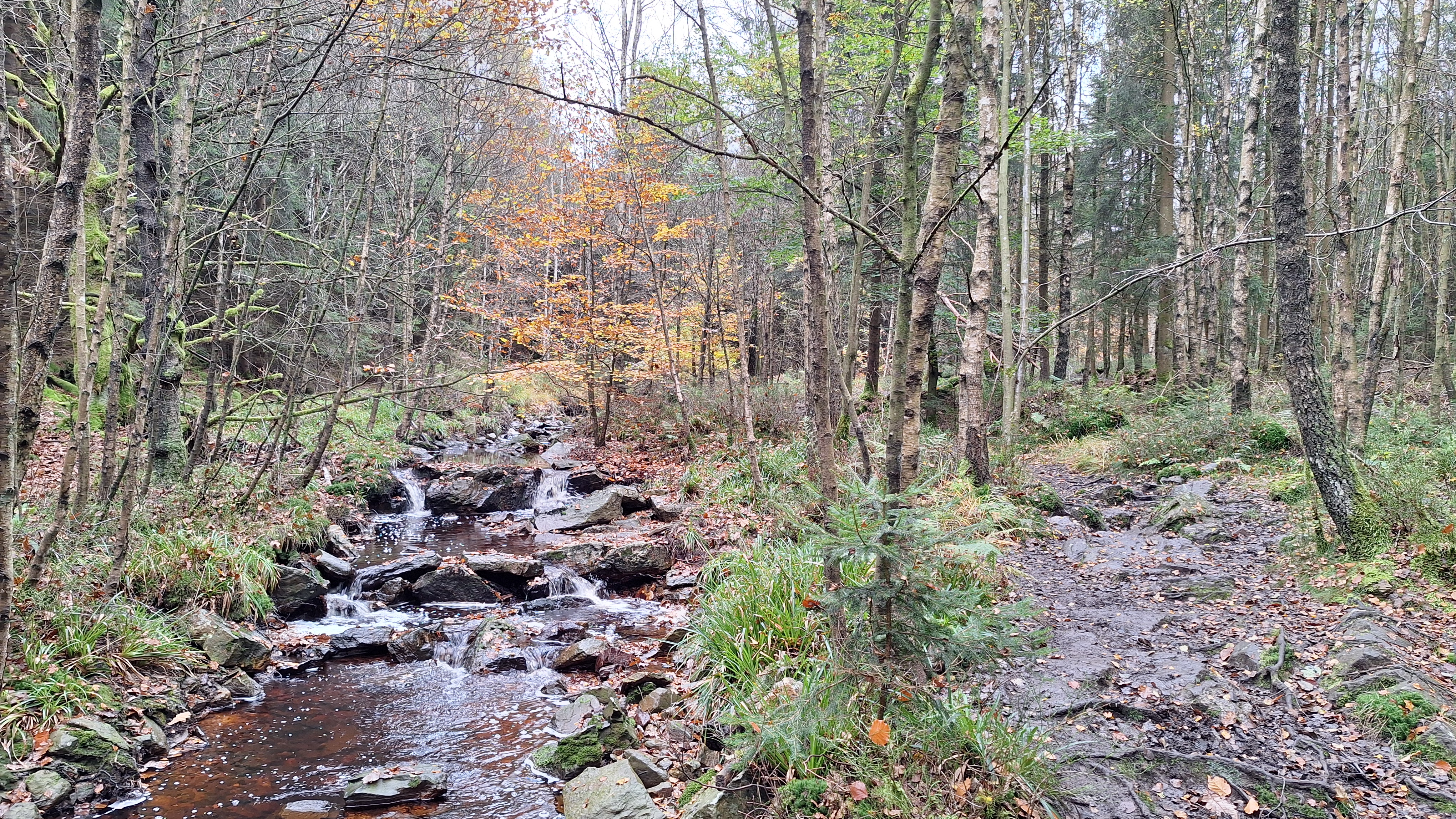 Nabij Wihonfagne slaan we af in westelijke richting om dan meteen terug in noordoostelijke richting een breed pad op te pikken. Het zijn modderige paadjes maar hey, dat zijn de venen hé. Er staat langs een breed pad een hutje met afdak en een fijne geïmproviseerde bank die wij benutten voor onze vroege lunch. Als we aan het opruimen zijn komt er een vader met zoon bij zitten om te picknicken. Gezelligheid is troef maar wij gaan toch maar rustig verder. Het brede pad gaat via een smalle doorsteek terug op in La Vécquée. We zoeken een afslag in zuidoostelijke richting maar dat blijkt privéterrein. We gaan dus nog eventjes verder om dan af te slaan via Les Mousseux aan de Ruisseau de Herbôfaye waar er een prachtig hutje staat, waarschijnlijk privé-eigendom. Nu volgen we de beek in zuidwestelijke richting tot ze overgaat in de Hoëgne. We misten een afslag waardoor we een kleine 500m te ver uitkomen. De rivier oversteken zou misschien wel lukken maar de kans op natte voeten of erger is groot. We besluiten toch maar even terug te keren en zien dan een smal pad naar de beek gaan. Met lichte hoop op een brugje komen we er snel achter dat het springen zal worden. We kijken wat hogerop de beek en zien dat we daar over enkele stenen kunnen stappen om de oversteek te wagen. Dat verloopt veel vlotter dan gedacht. We trekken nu verder over een smal langs de beek slingerend paadje. Zeer mooi met her en der een stroomversnelling en vallende goudgele of oranje bladeren van de bomen.