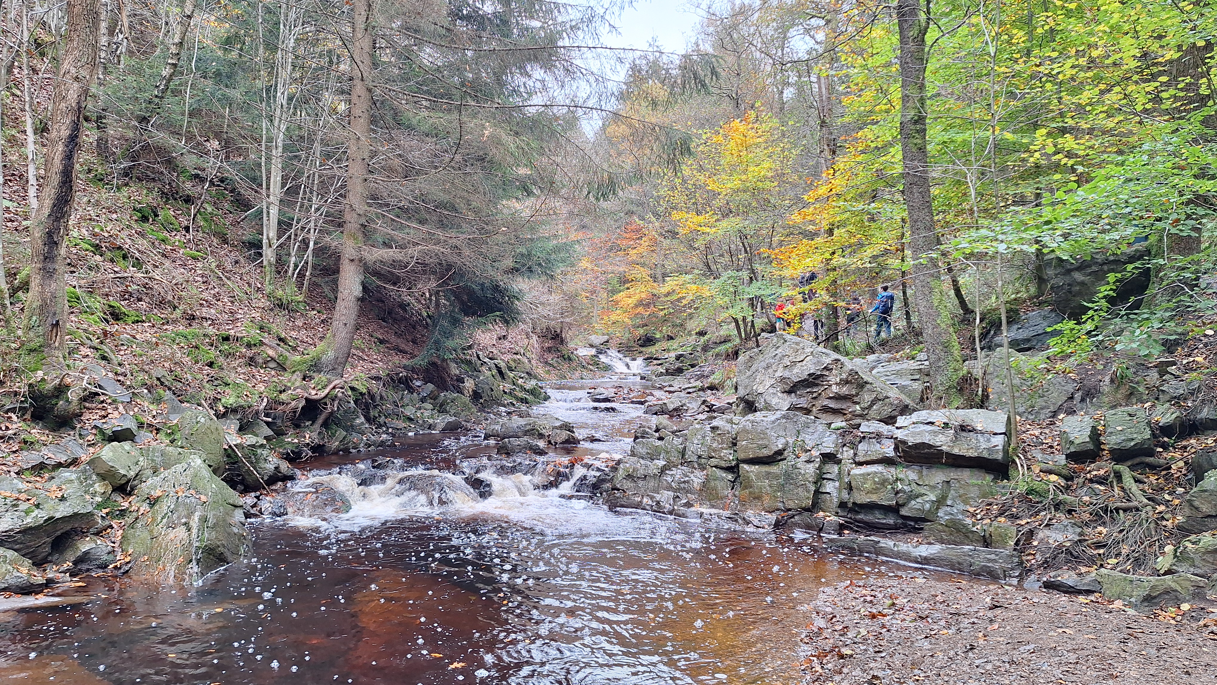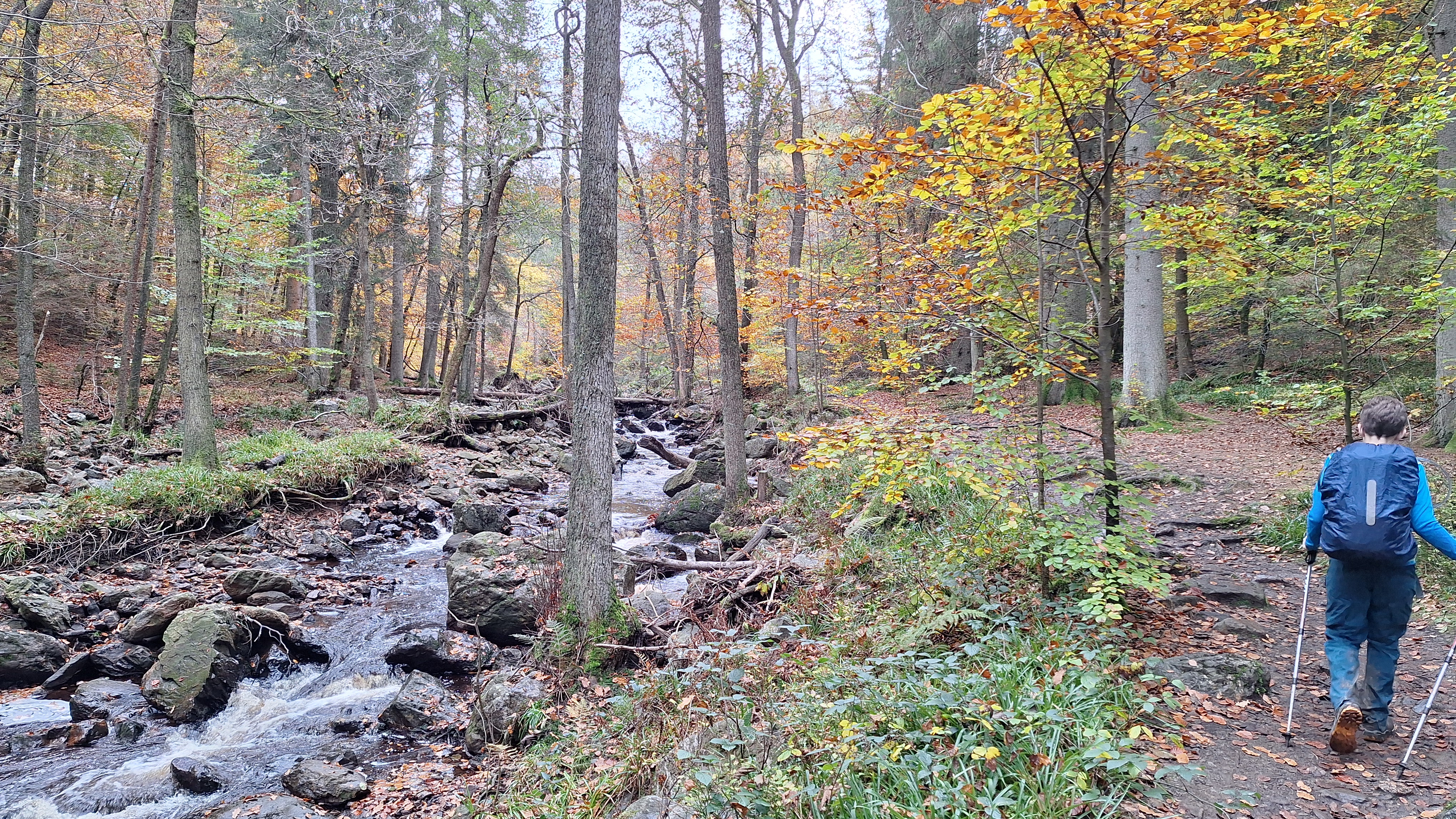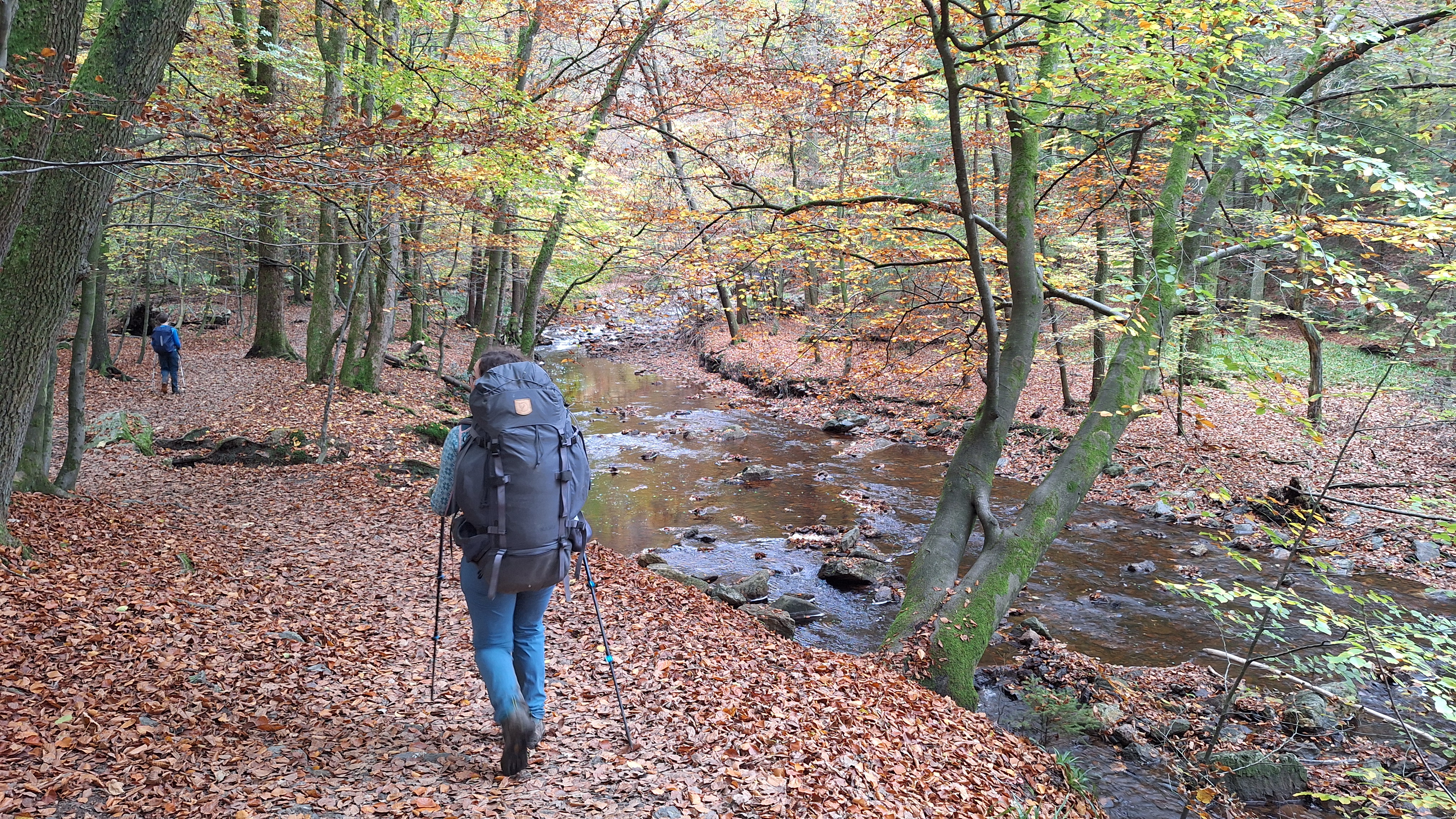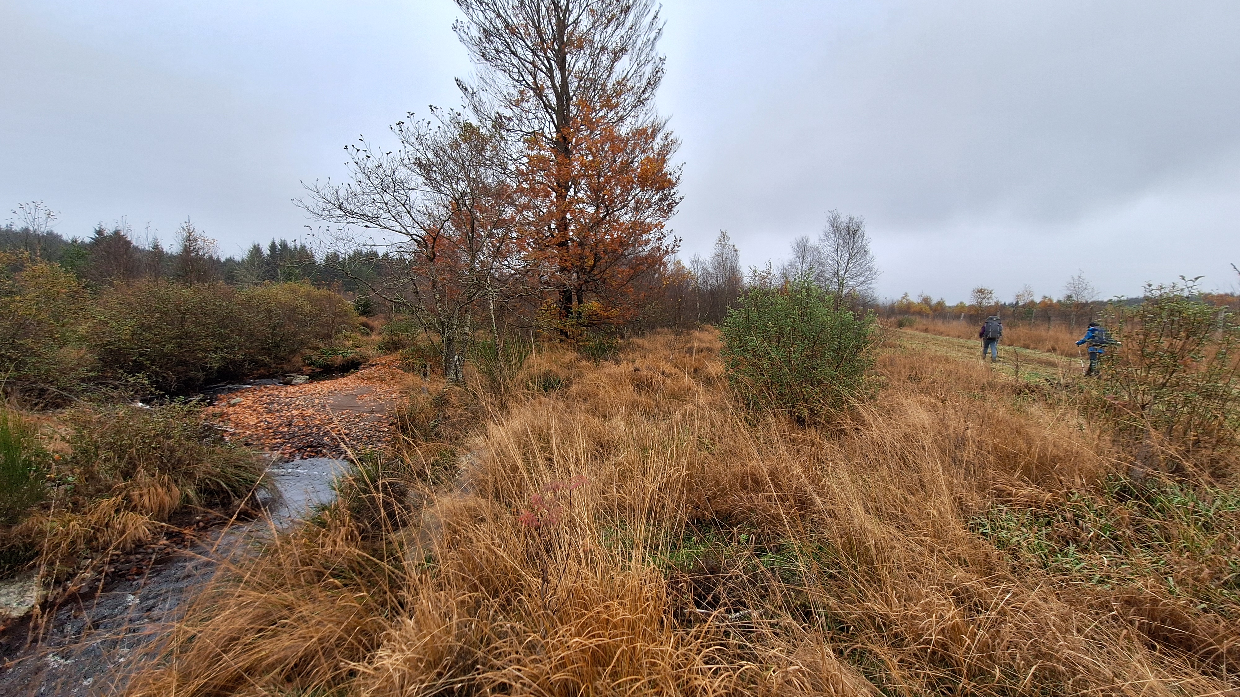Nabij Wihonfagne slaan we af in westelijke richting om dan meteen terug in noordoostelijke richting een breed pad op te pikken. Het zijn modderige paadjes maar hey, dat zijn de venen hé. Er staat langs een breed pad een hutje met afdak en een fijne geïmproviseerde bank die wij benutten voor onze vroege lunch. Als we aan het opruimen zijn komt er een vader met zoon bij zitten om te picknicken. Gezelligheid is troef maar wij gaan toch maar rustig verder. Het brede pad gaat via een smalle doorsteek terug op in La Vécquée. We zoeken een afslag in zuidoostelijke richting maar dat blijkt privéterrein. We gaan dus nog eventjes verder om dan af te slaan via Les Mousseux aan de Ruisseau de Herbôfaye waar er een prachtig hutje staat, waarschijnlijk privé-eigendom. Nu volgen we de beek in zuidwestelijke richting tot ze overgaat in de Hoëgne. We misten een afslag waardoor we een kleine 500m te ver uitkomen. De rivier oversteken zou misschien wel lukken maar de kans op natte voeten of erger is groot. We besluiten toch maar even terug te keren en zien dan een smal pad naar de beek gaan. Met lichte hoop op een brugje komen we er snel achter dat het springen zal worden. We kijken wat hogerop de beek en zien dat we daar over enkele stenen kunnen stappen om de oversteek te wagen. Dat verloopt veel vlotter dan gedacht. We trekken nu verder over een smal langs de beek slingerend paadje. Zeer mooi met her en der een stroomversnelling en vallende goudgele of oranje bladeren van de bomen.