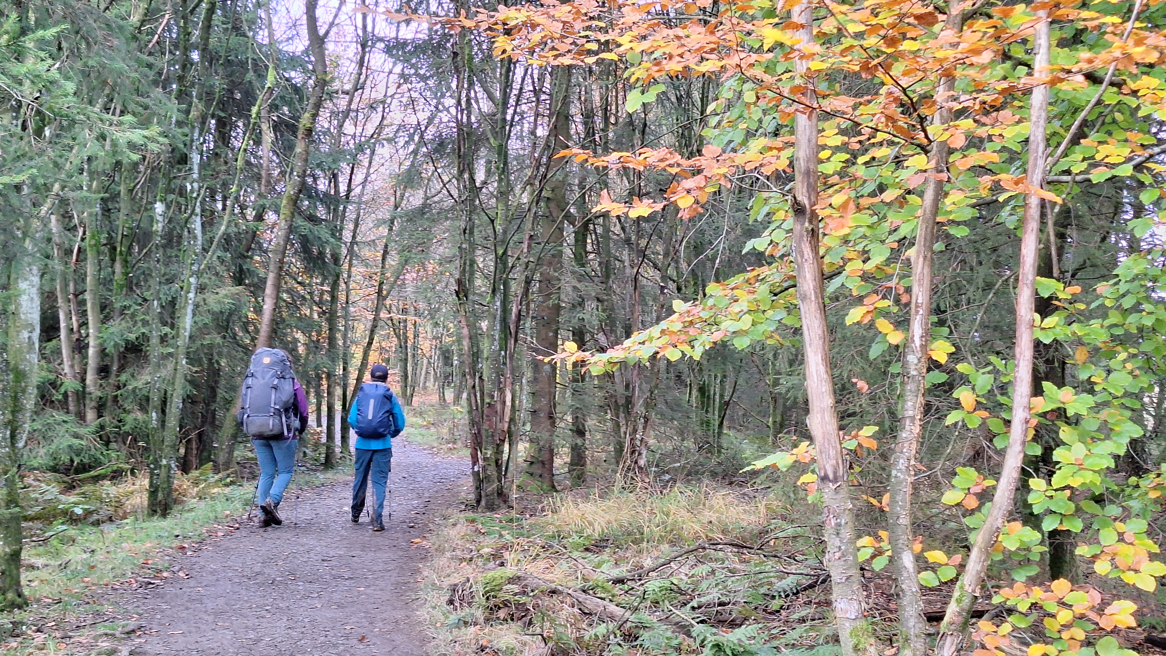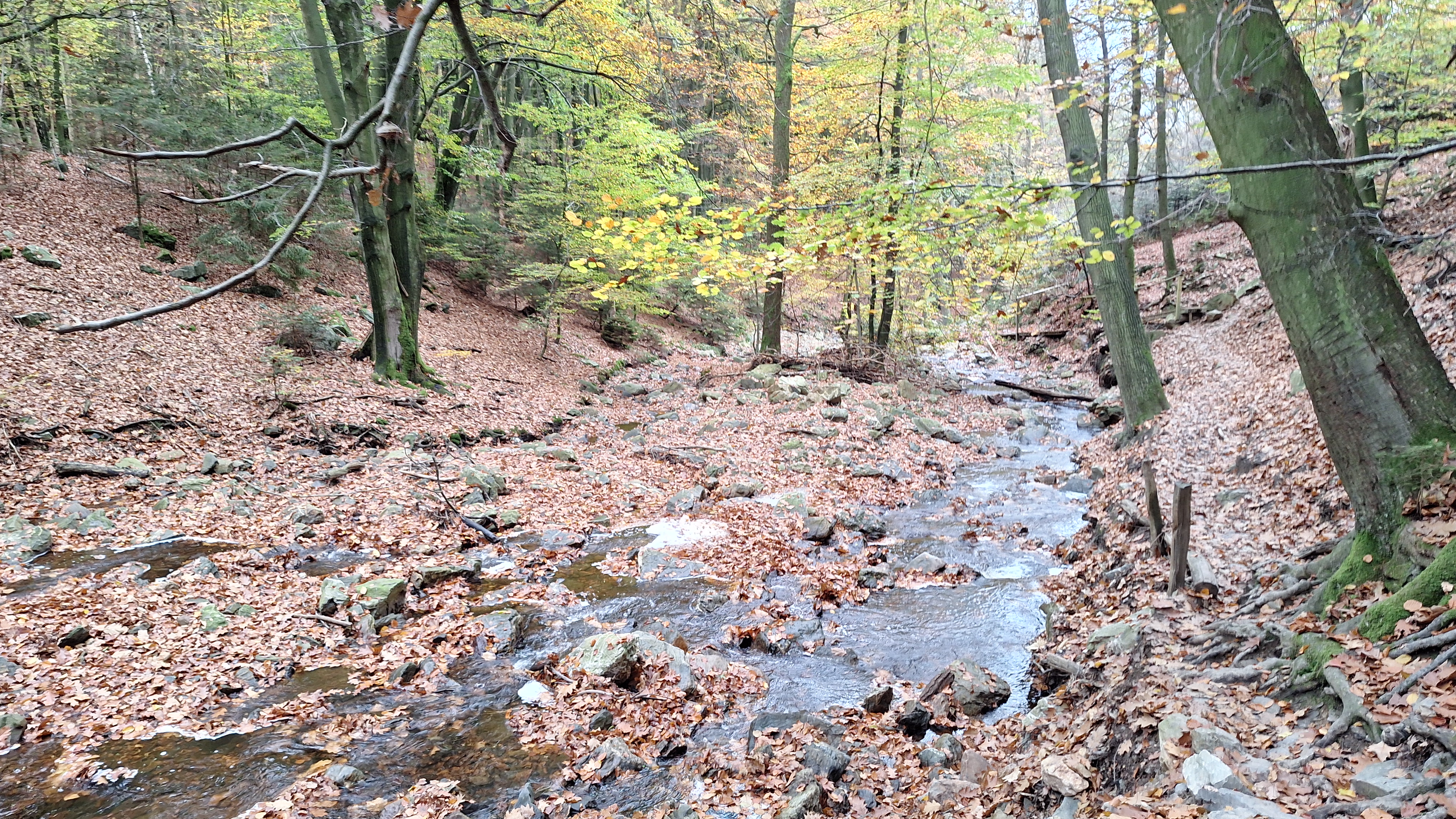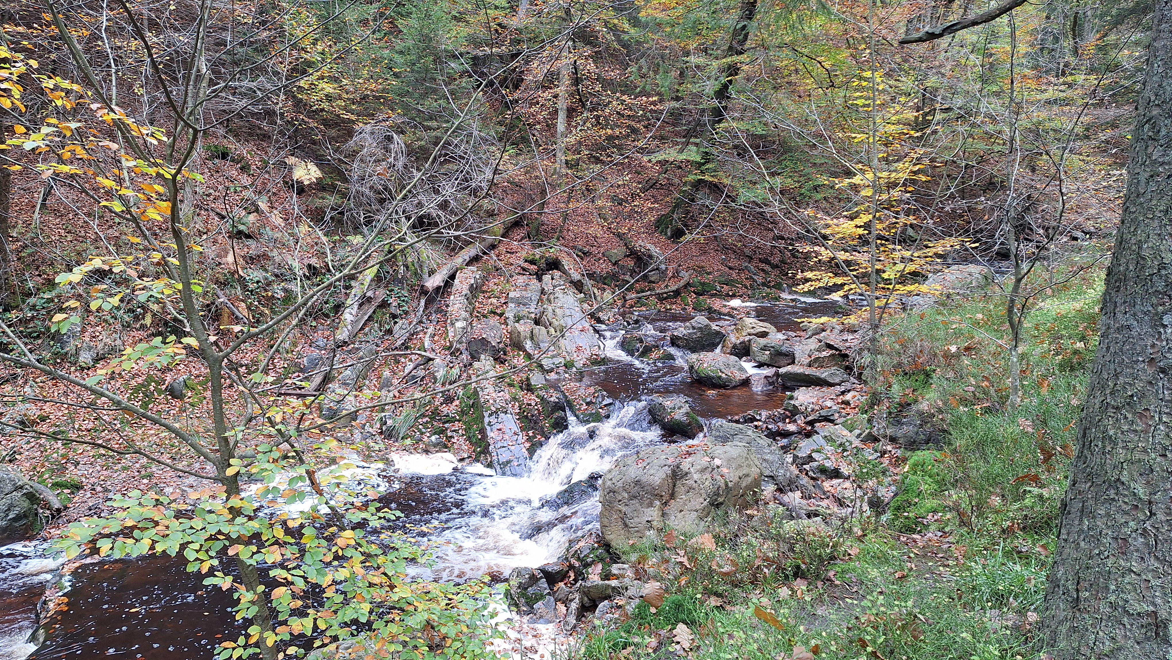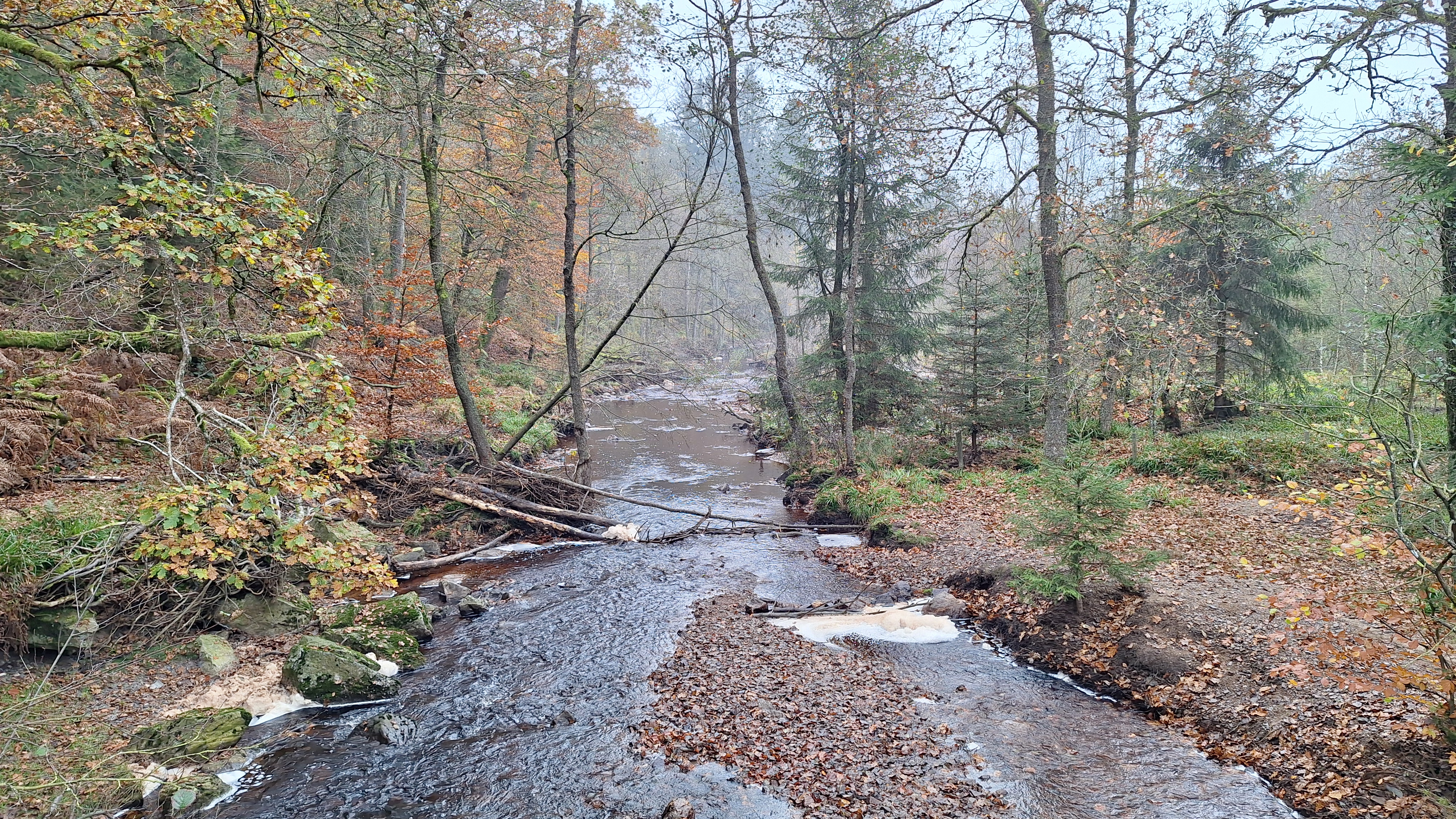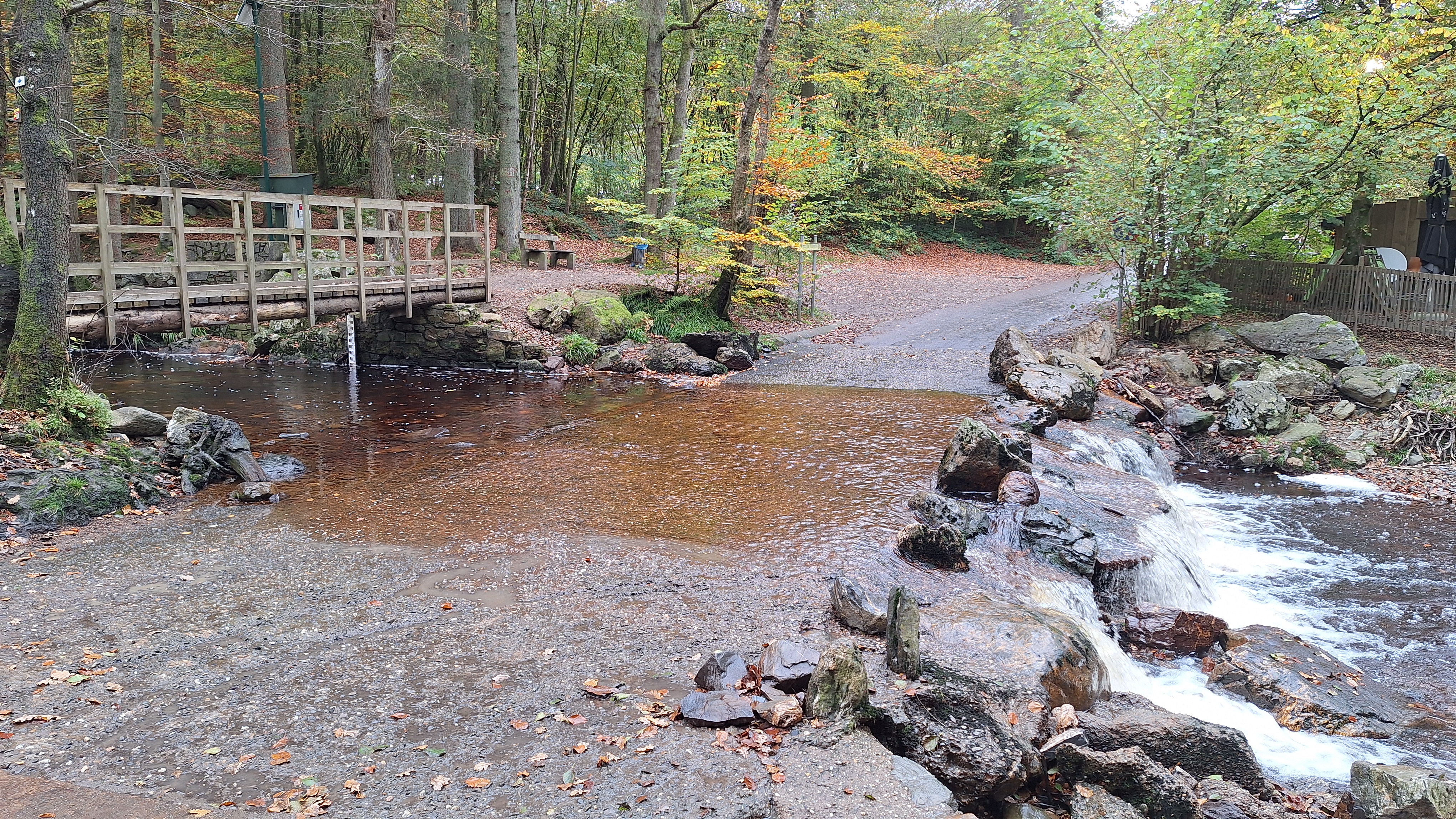 Nabij Wihonfagne slaan we af in westelijke richting om dan meteen terug in noordoostelijke richting een breed pad op te pikken. Het zijn modderige paadjes maar hey, dat zijn de venen hé. Er staat langs een breed pad een hutje met afdak en een fijne geïmproviseerde bank die wij benutten voor onze vroege lunch. Als we aan het opruimen zijn komt er een vader met zoon bij zitten om te picknicken. Gezelligheid is troef maar wij gaan toch maar rustig verder. Het brede pad gaat via een smalle doorsteek terug op in La Vécquée. We zoeken een afslag in zuidoostelijke richting maar dat blijkt privéterrein. We gaan dus nog eventjes verder om dan af te slaan via Les Mousseux aan de Ruisseau de Herbôfaye waar er een prachtig hutje staat, waarschijnlijk privé-eigendom. Nu volgen we de beek in zuidwestelijke richting tot ze overgaat in de Hoëgne. We misten een afslag waardoor we een kleine 500m te ver uitkomen. De rivier oversteken zou misschien wel lukken maar de kans op natte voeten of erger is groot. We besluiten toch maar even terug te keren en zien dan een smal pad naar de beek gaan. Met lichte hoop op een brugje komen we er snel achter dat het springen zal worden. We kijken wat hogerop de beek en zien dat we daar over enkele stenen kunnen stappen om de oversteek te wagen. Dat verloopt veel vlotter dan gedacht. We trekken nu verder over een smal langs de beek slingerend paadje. Zeer mooi met her en der een stroomversnelling en vallende goudgele of oranje bladeren van de bomen.
