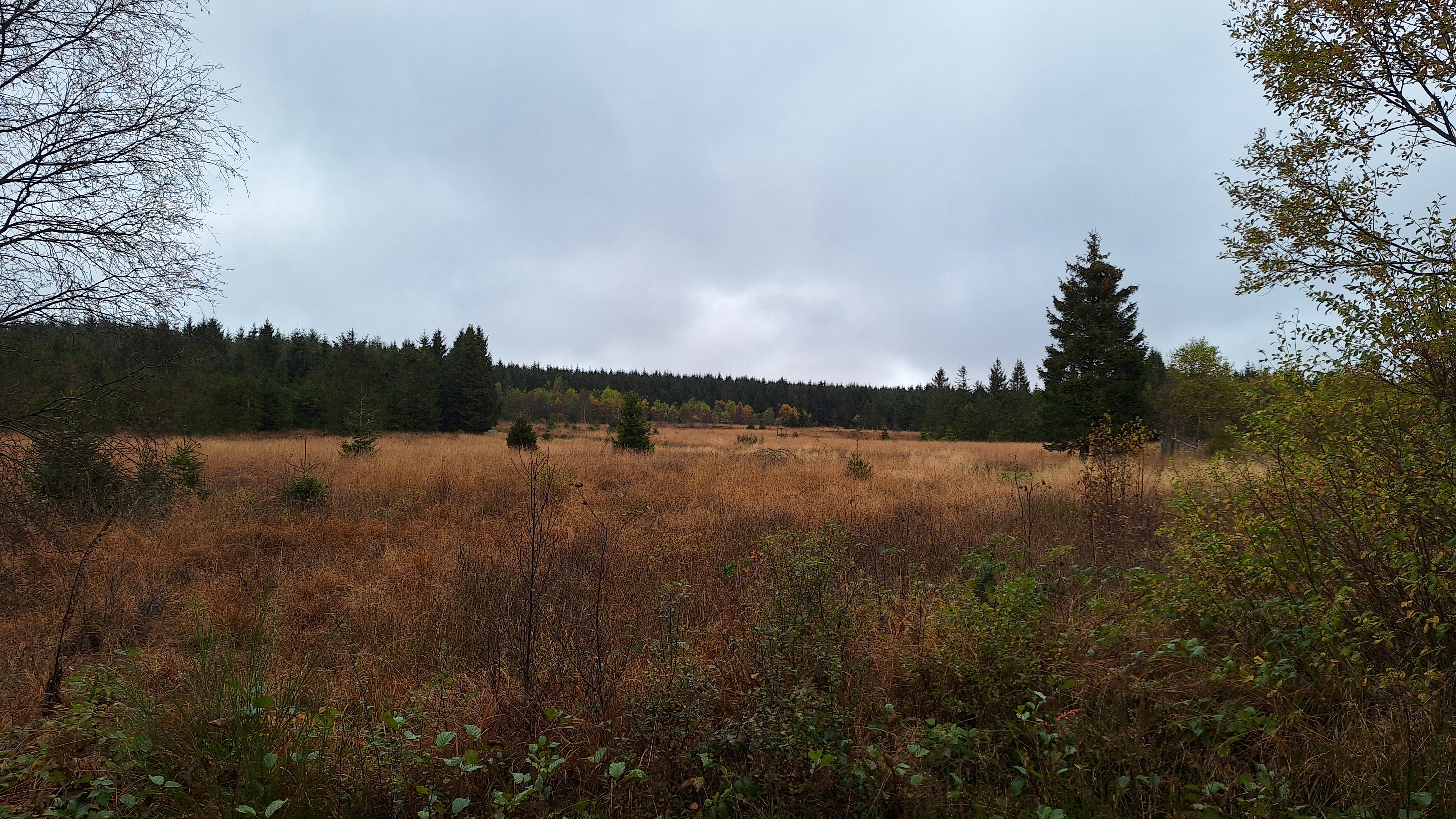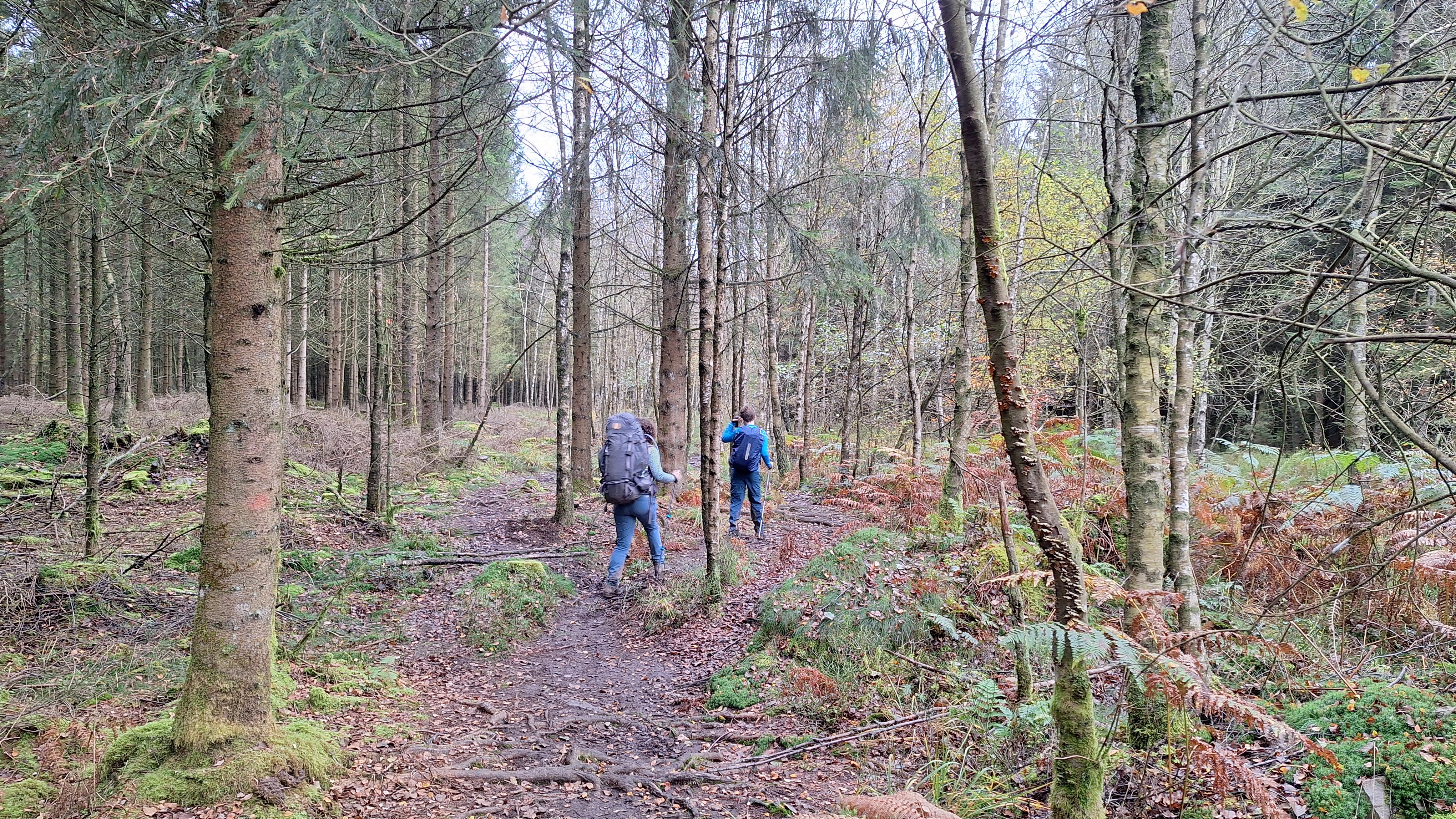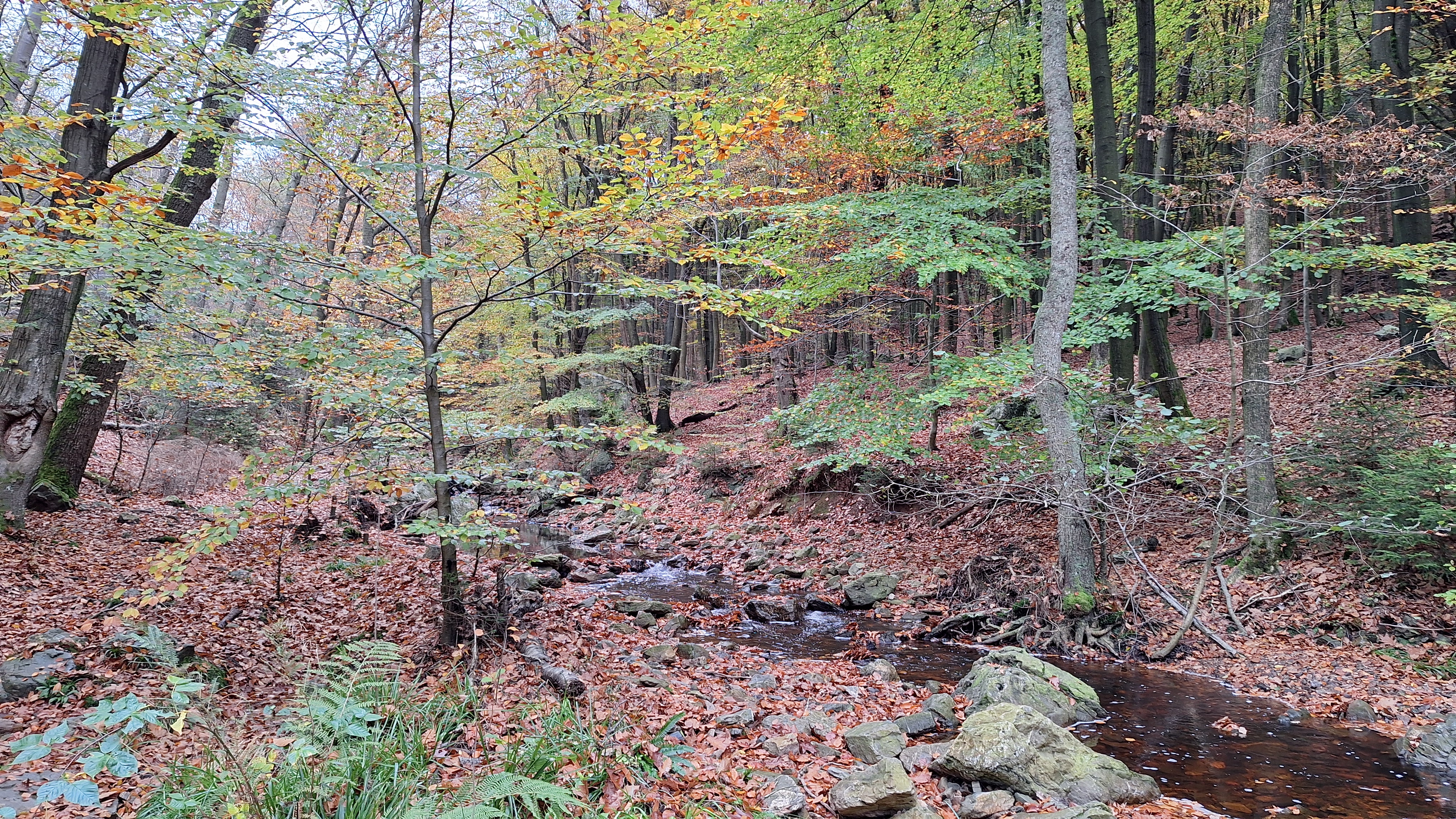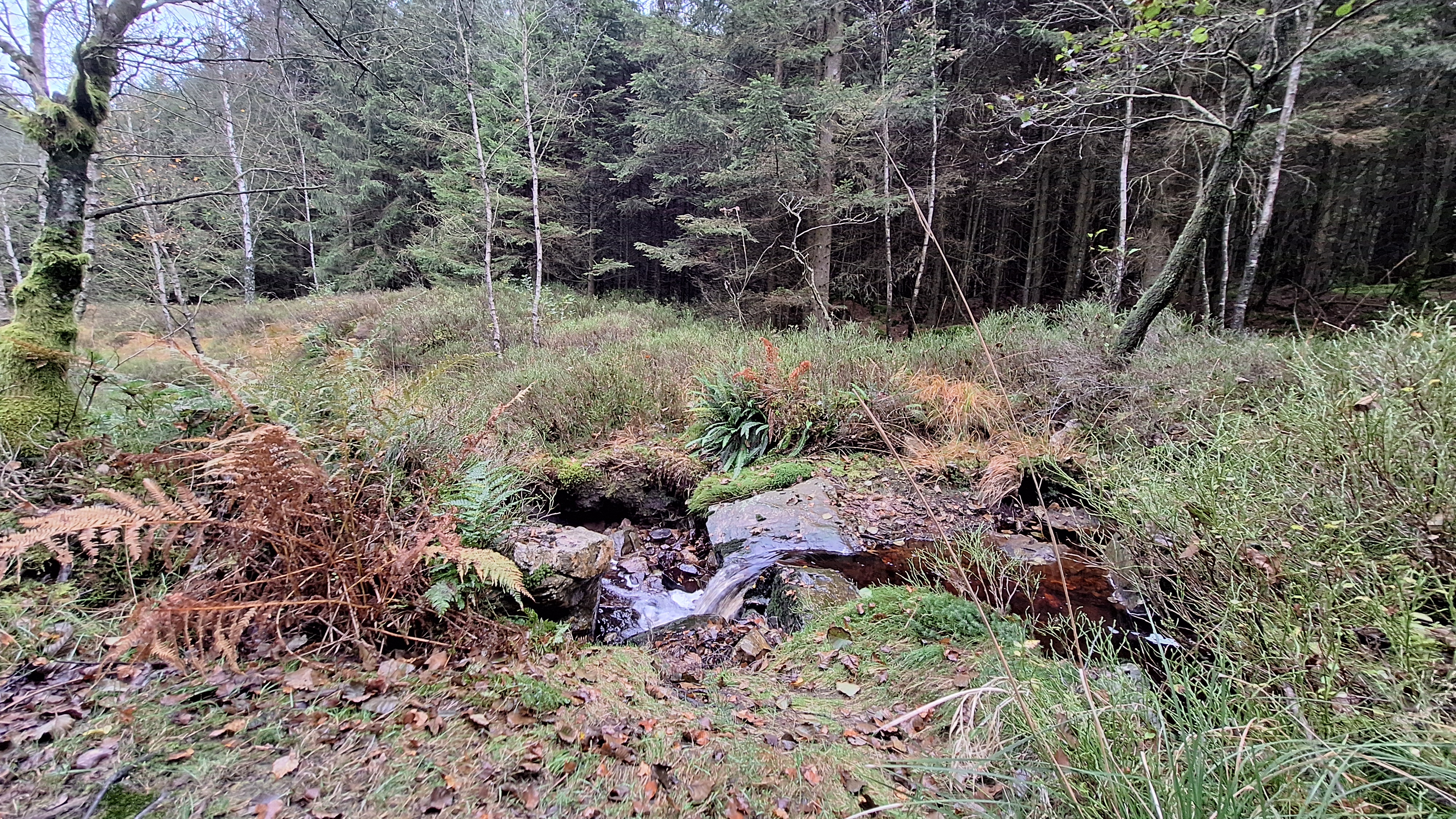 Nabij Wihonfagne slaan we af in westelijke richting om dan meteen terug in noordoostelijke richting een breed pad op te pikken. Het zijn modderige paadjes maar hey, dat zijn de venen hé. Er staat langs een breed pad een hutje met afdak en een fijne geïmproviseerde bank die wij benutten voor onze vroege lunch. Als we aan het opruimen zijn komt er een vader met zoon bij zitten om te picknicken. Gezelligheid is troef maar wij gaan toch maar rustig verder. Het brede pad gaat via een smalle doorsteek terug op in La Vécquée. We zoeken een afslag in zuidoostelijke richting maar dat blijkt privéterrein. We gaan dus nog eventjes verder om dan af te slaan via Les Mousseux aan de Ruisseau de Herbôfaye waar er een prachtig hutje staat, waarschijnlijk privé-eigendom. Nu volgen we de beek in zuidwestelijke richting tot ze overgaat in de Hoëgne. We misten een afslag waardoor we een kleine 500m te ver uitkomen. De rivier oversteken zou misschien wel lukken maar de kans op natte voeten of erger is groot. We besluiten toch maar even terug te keren en zien dan een smal pad naar de beek gaan. Met lichte hoop op een brugje komen we er snel achter dat het springen zal worden. We kijken wat hogerop de beek en zien dat we daar over enkele stenen kunnen stappen om de oversteek te wagen. Dat verloopt veel vlotter dan gedacht. We trekken nu verder over een smal langs de beek slingerend paadje. Zeer mooi met her en der een stroomversnelling en vallende goudgele of oranje bladeren van de bomen.
